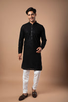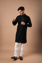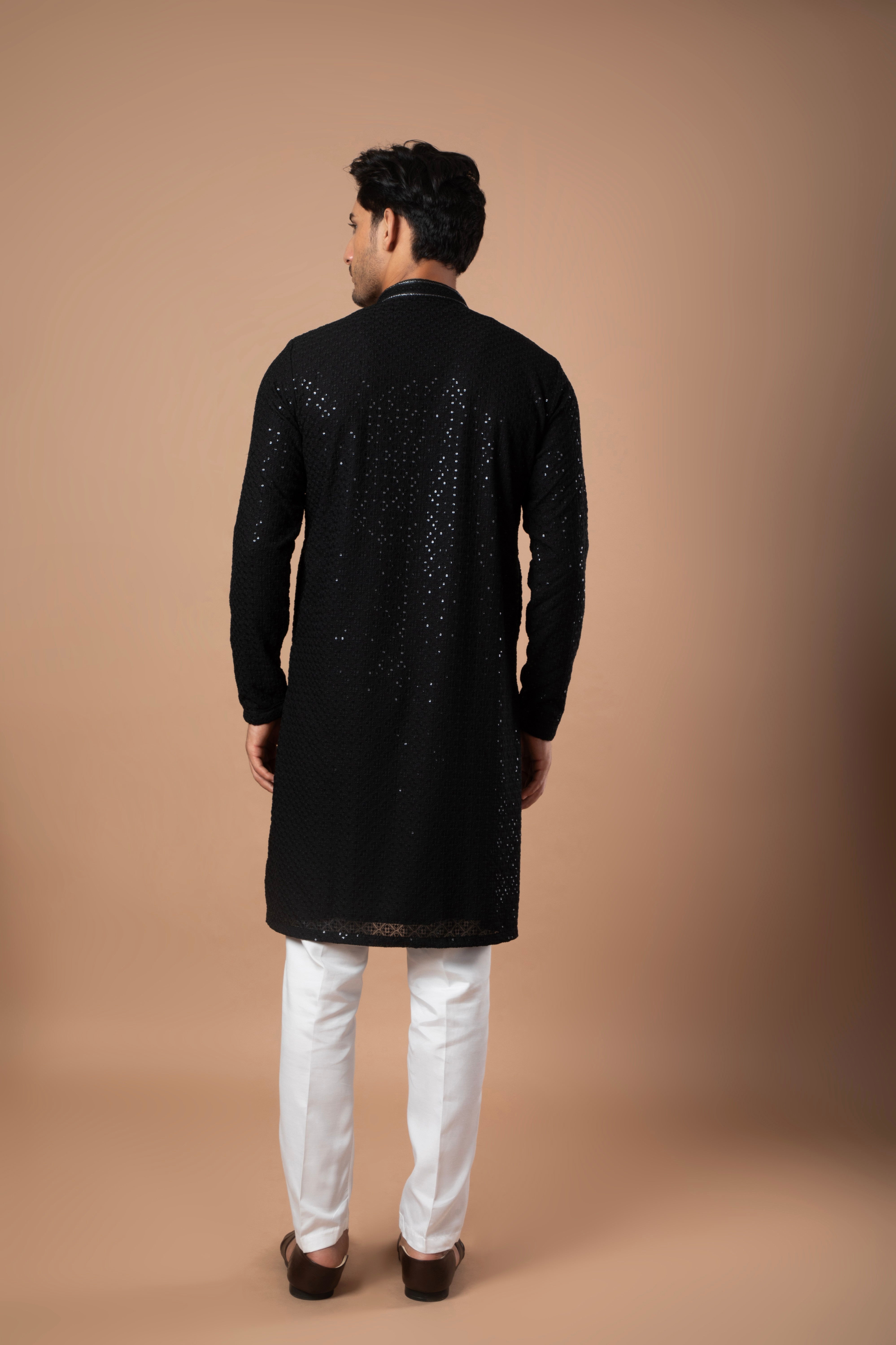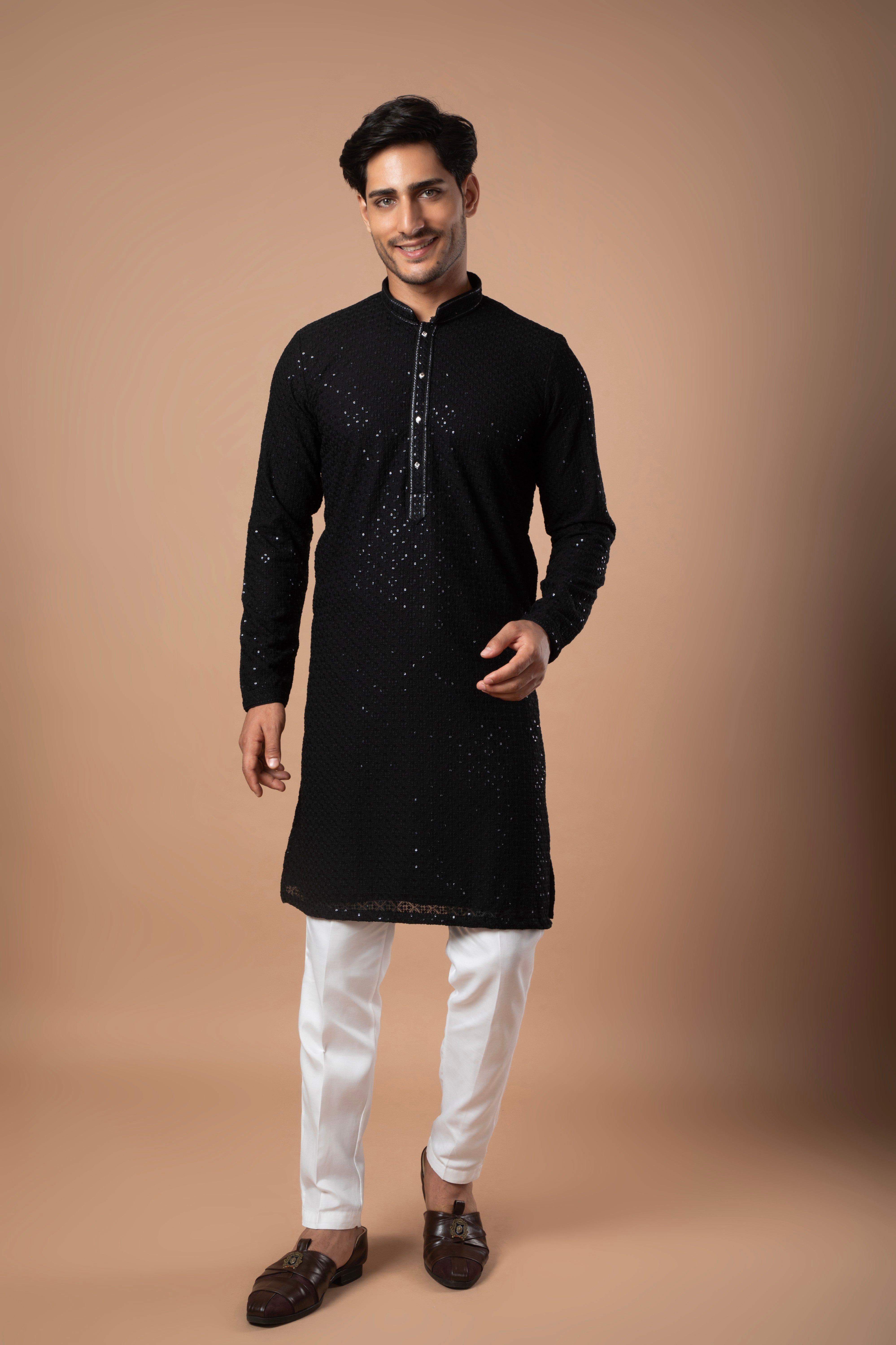 A classic black kurta featuring intricate embroidery highlighted with sequins that lend a refined shimmer. The mandarin collar and straight-cut design make it a timeless pick for festive evenings, receptions, or cocktail celebrations. Style with cream or black trousers for a timeless look.