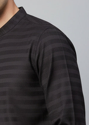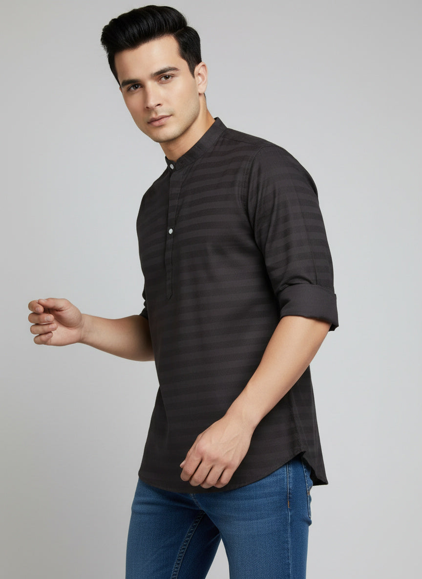 This black striped short kurta brings a sleek and modern vibe to everyday wear. Featuring subtle horizontal stripes, a mandarin collar, and a minimal half button placket, it delivers a clean and sharp look. The roll-up sleeves add practicality and comfort, making it a versatile choice for casual outings, office Fridays, or evening meet-ups. Pair it effortlessly with jeans, chinos, or trousers for a stylish and polished appearance.