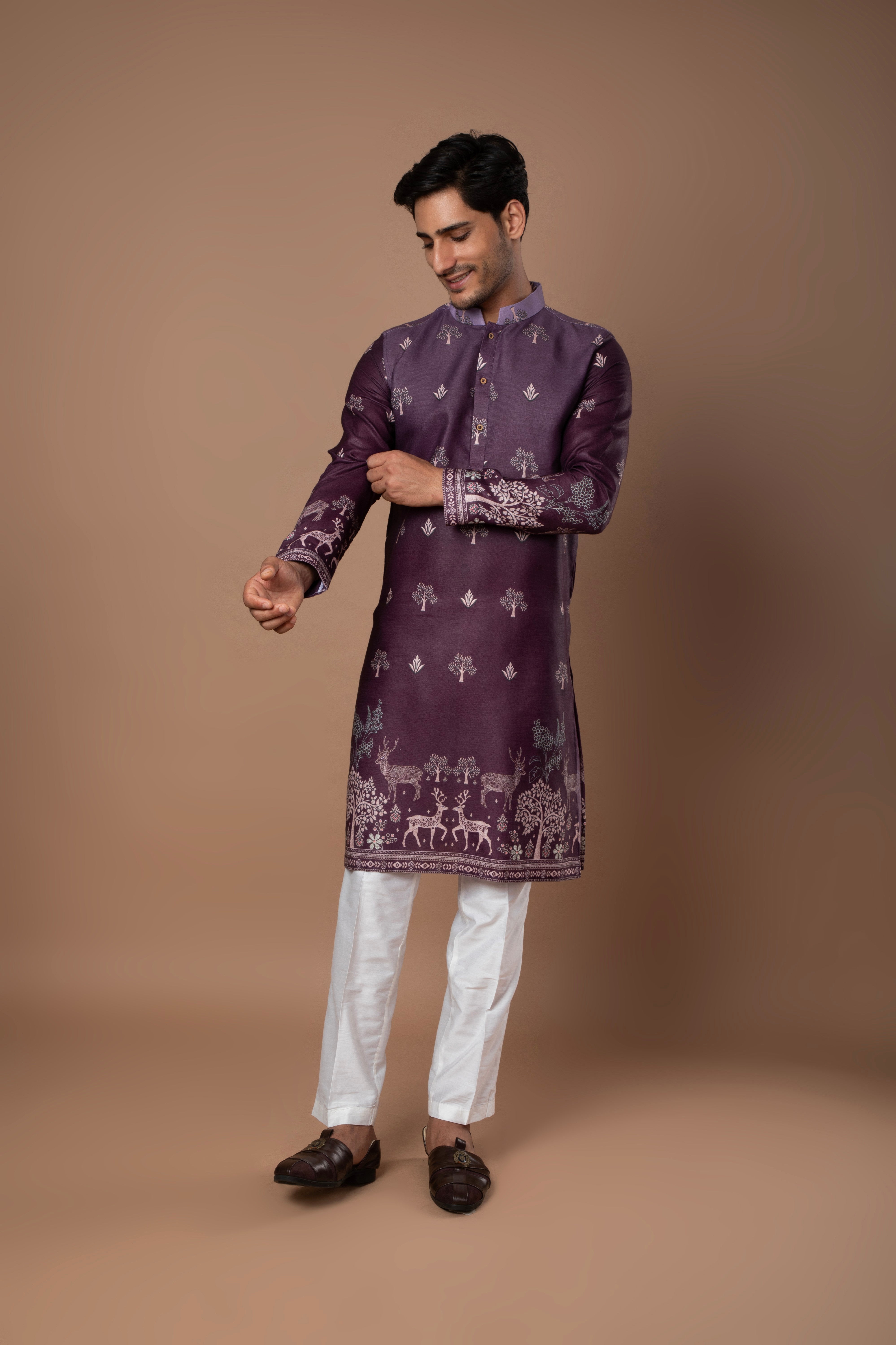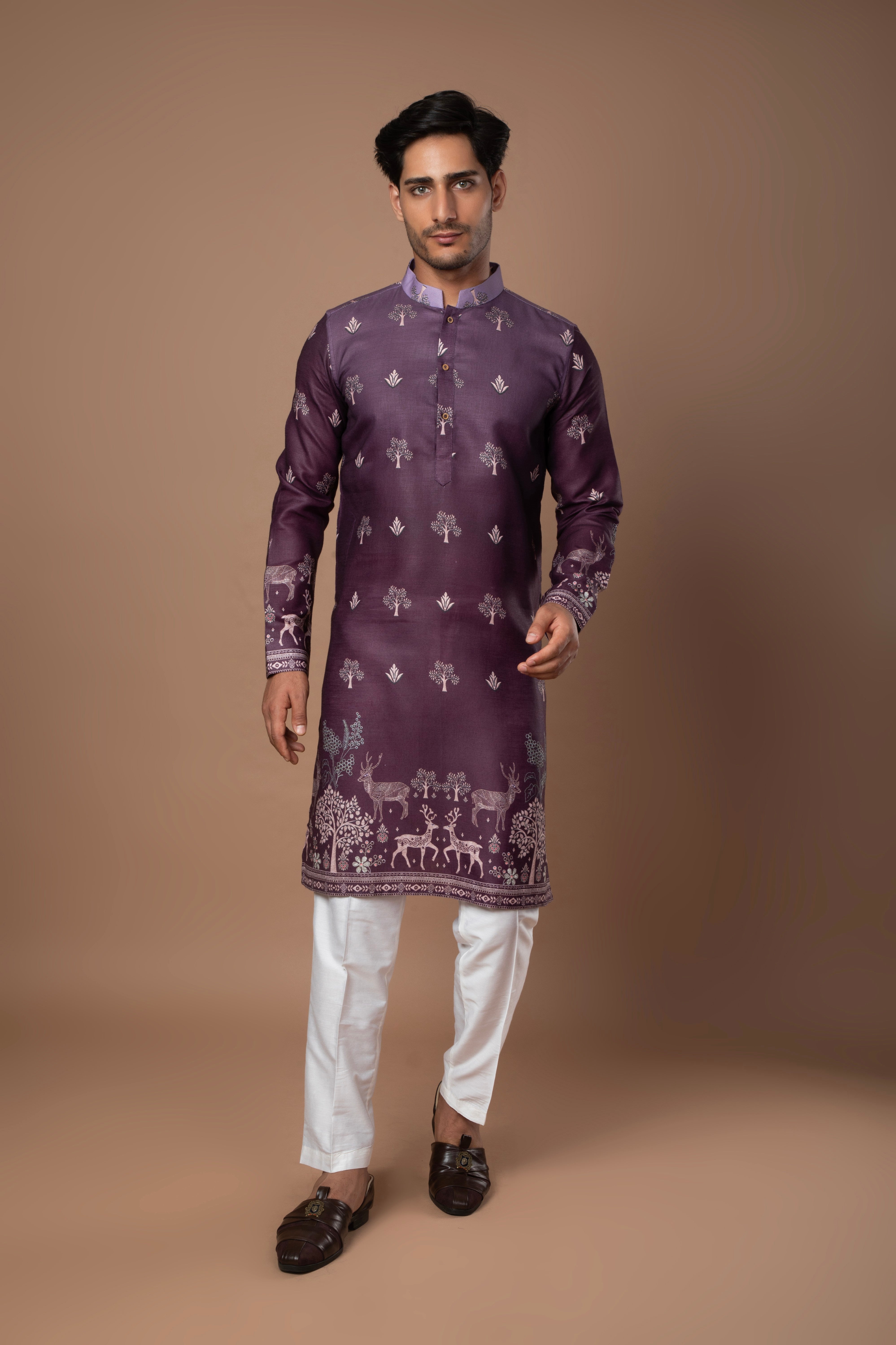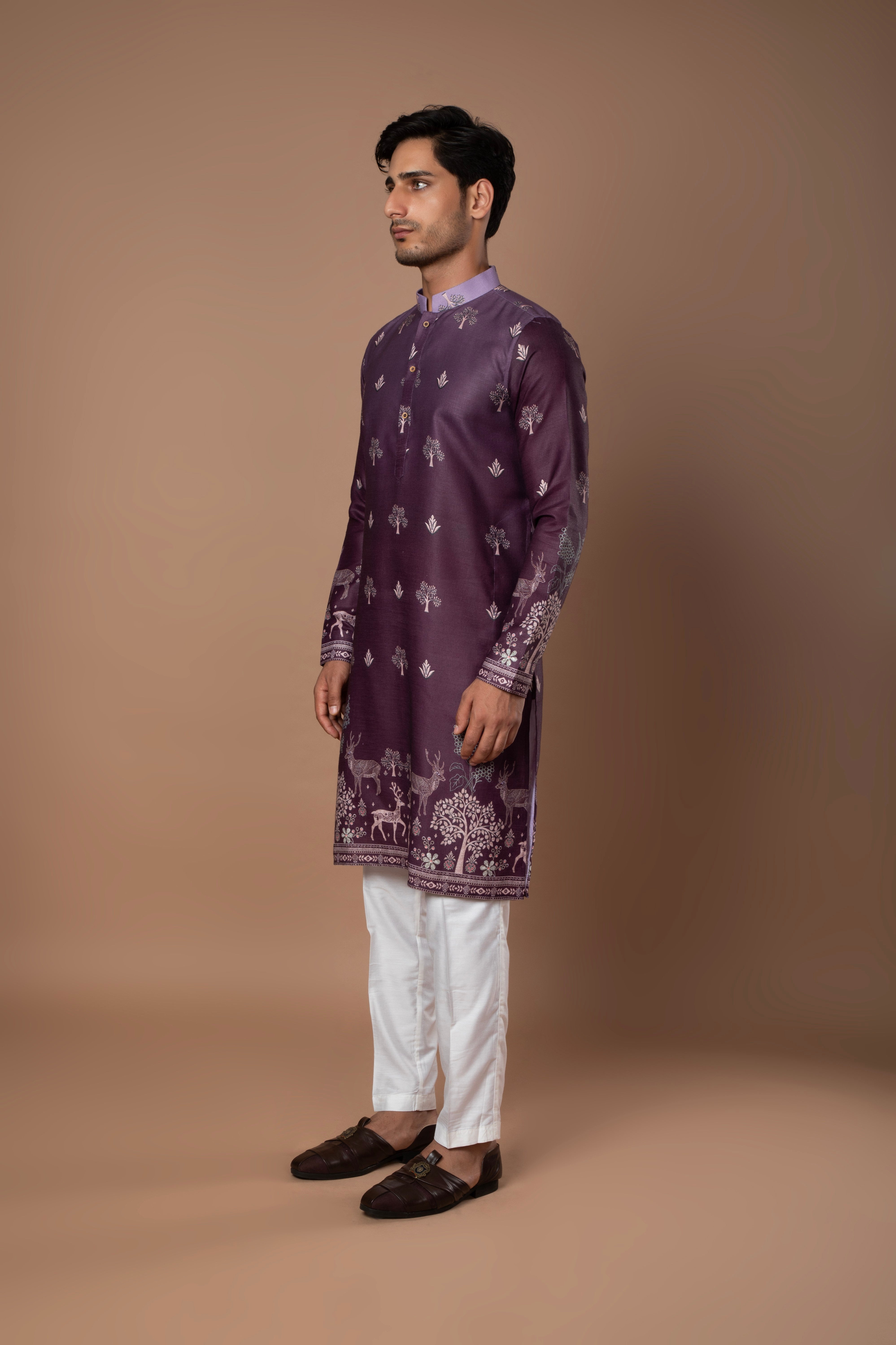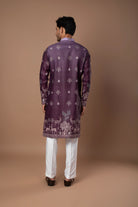 A graceful dark lavender kurta featuring subtle printed motifs and refined border detailing along the hem and sleeves. The soft color and intricate design make it a perfect pick for festive and daytime occasions.