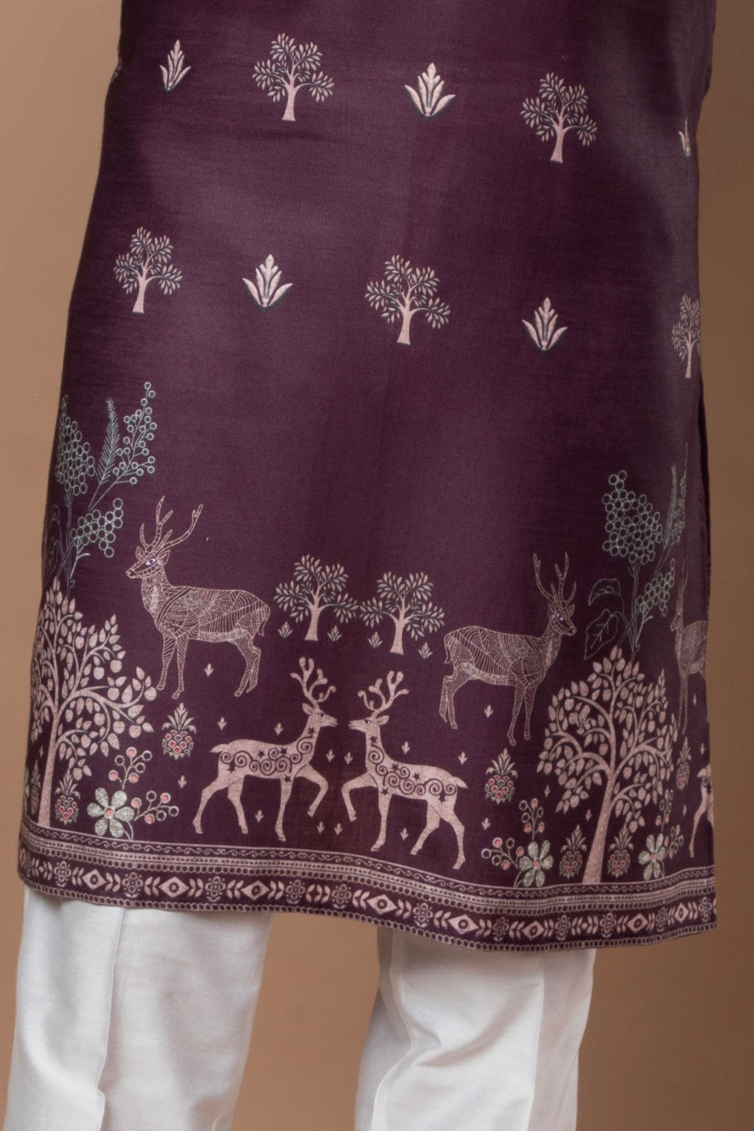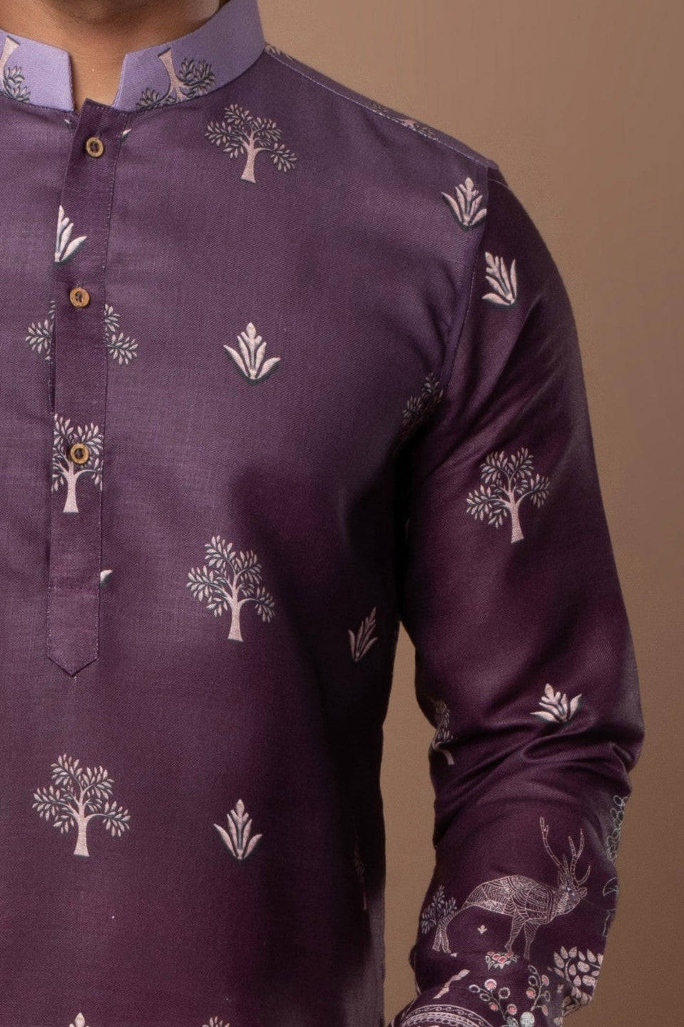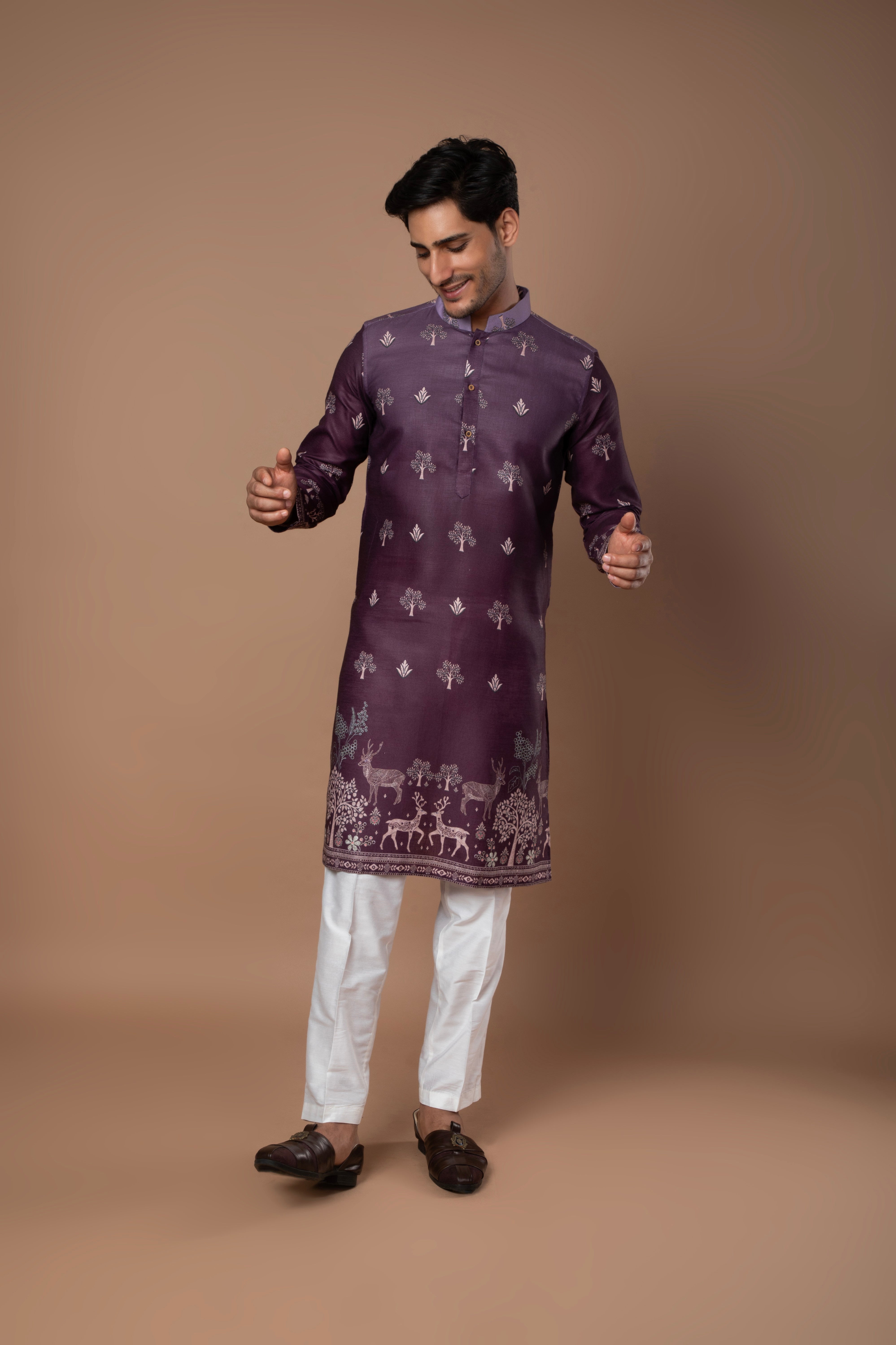 A graceful dark lavender kurta featuring subtle printed motifs and refined border detailing along the hem and sleeves. The soft color and intricate design make it a perfect pick for festive and daytime occasions.