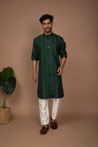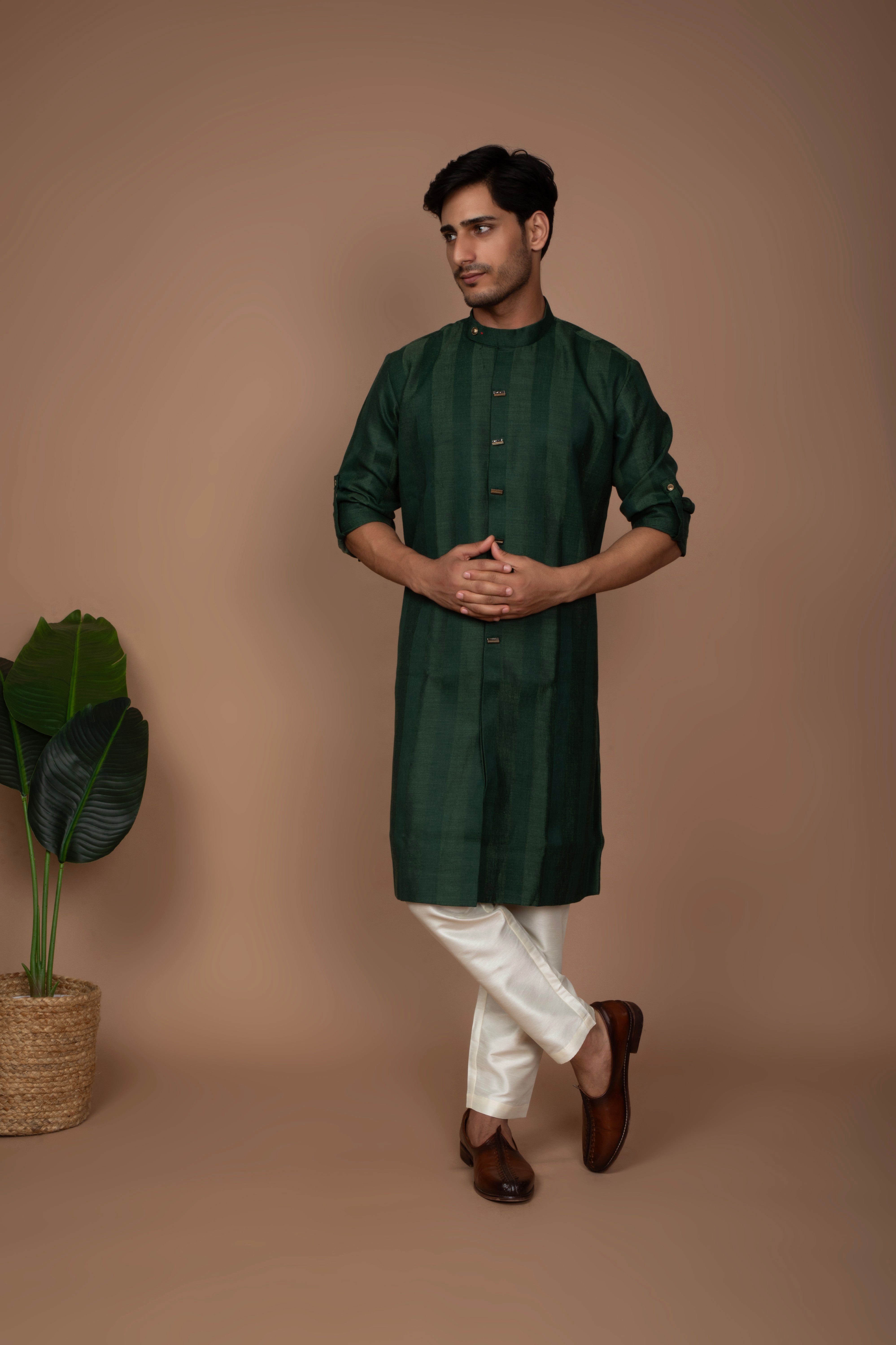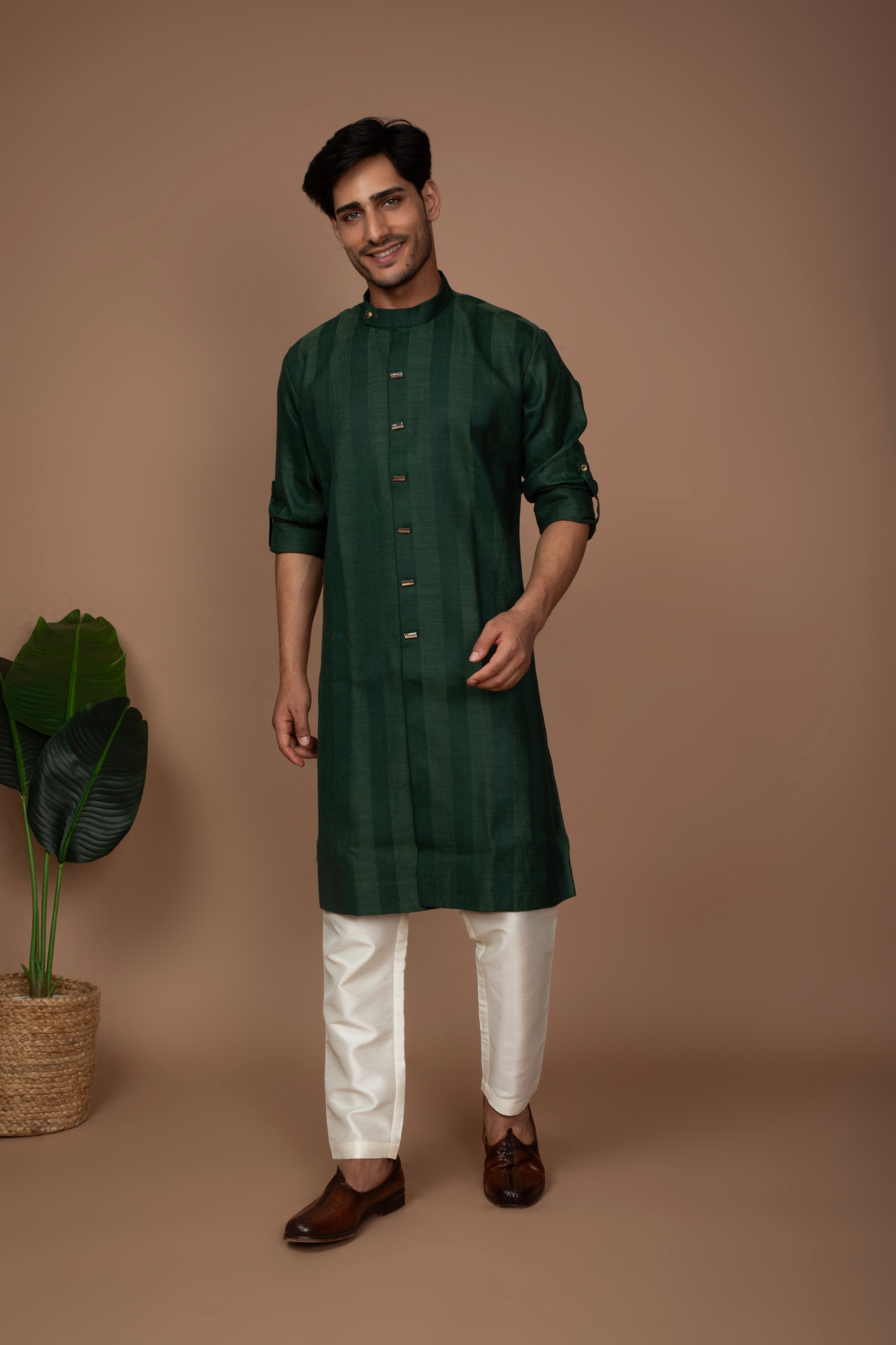 Step out in sophisticated style with this Emerald Green Kurta Set. The rich fabric features a subtle vertical stripe weave, offering a slimming and elegant texture. It includes a sleek Mandarin collar and a functional front open button placket, adorned with golden buttons that provide a subtle, artisanal contrast. Paired perfectly with crisp cream-colored trousers, this ensemble provides effortless traditional style, making it ideal for any festive or celebratory occasion.