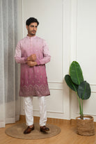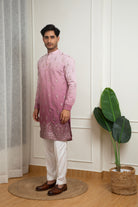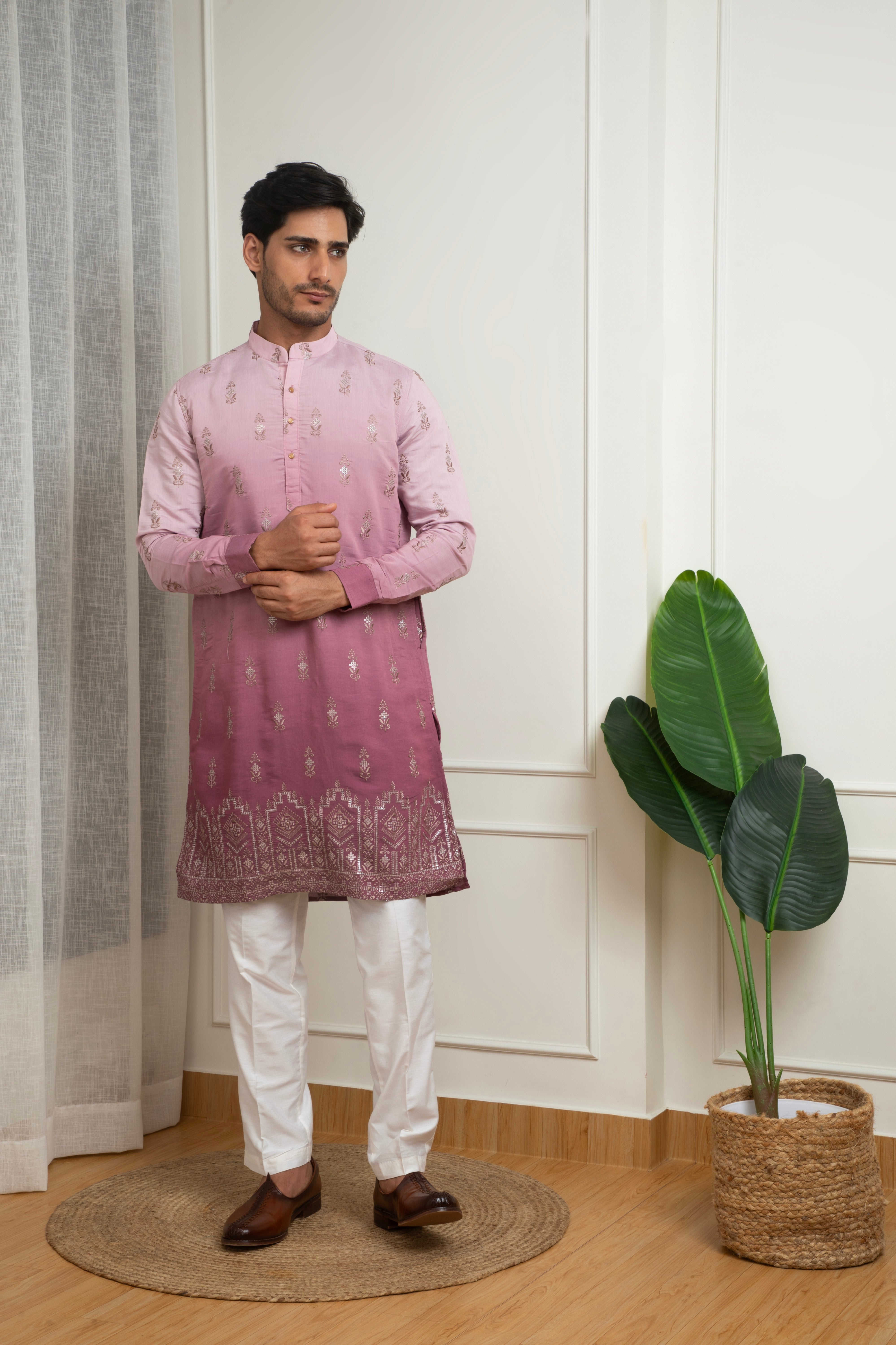 Introducing the Lilac Ombre Kurta, a deeply romantic piece that transitions beautifully from a soft mauve to a rich, deep burgundy. This Kurta features delicate silver-toned embroidery scattered across the body, intensifying into a stunning, ornate border at the hem. Paired perfectly with classic white bottoms, this set is designed for sophisticated evening wear.