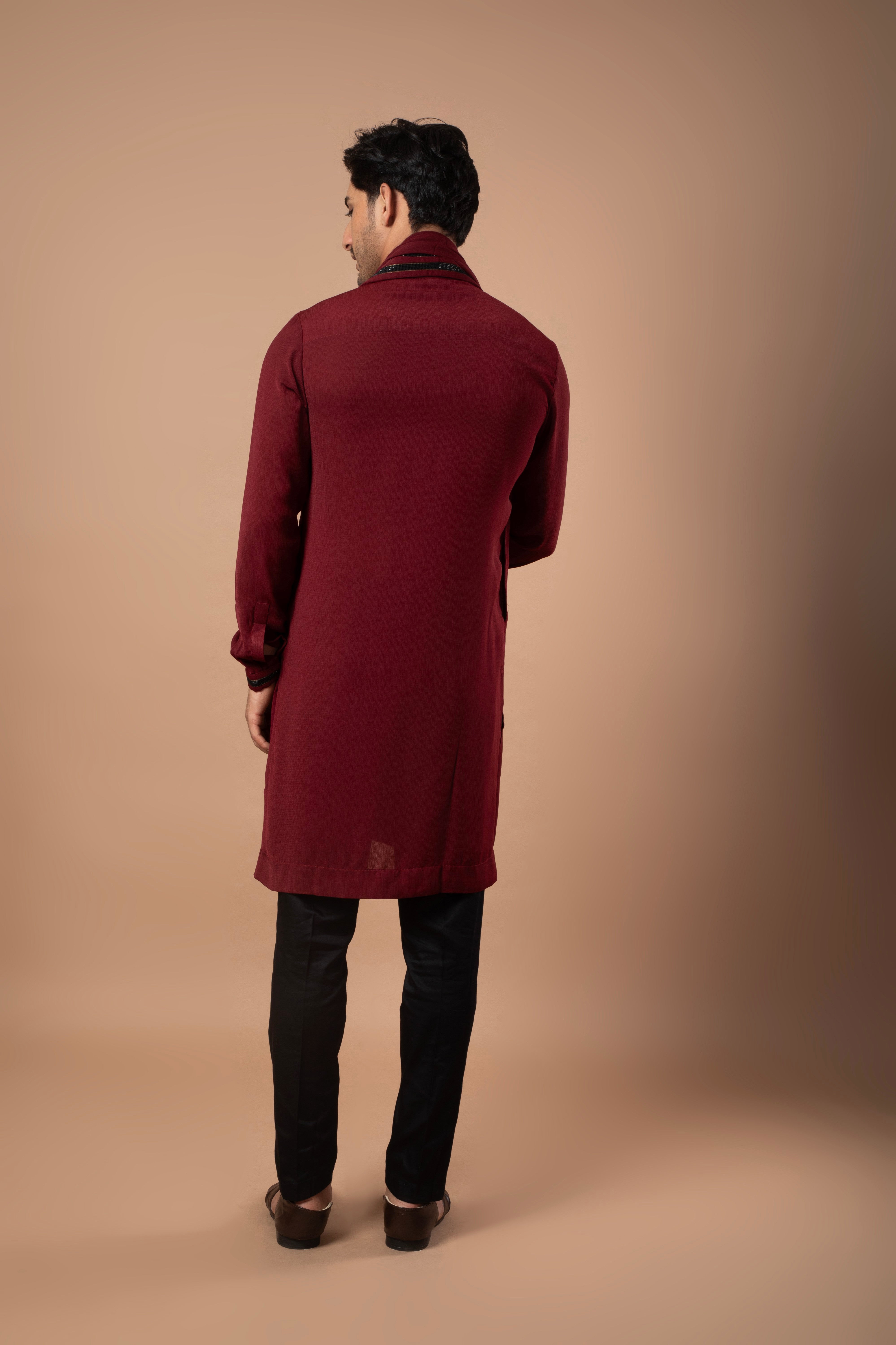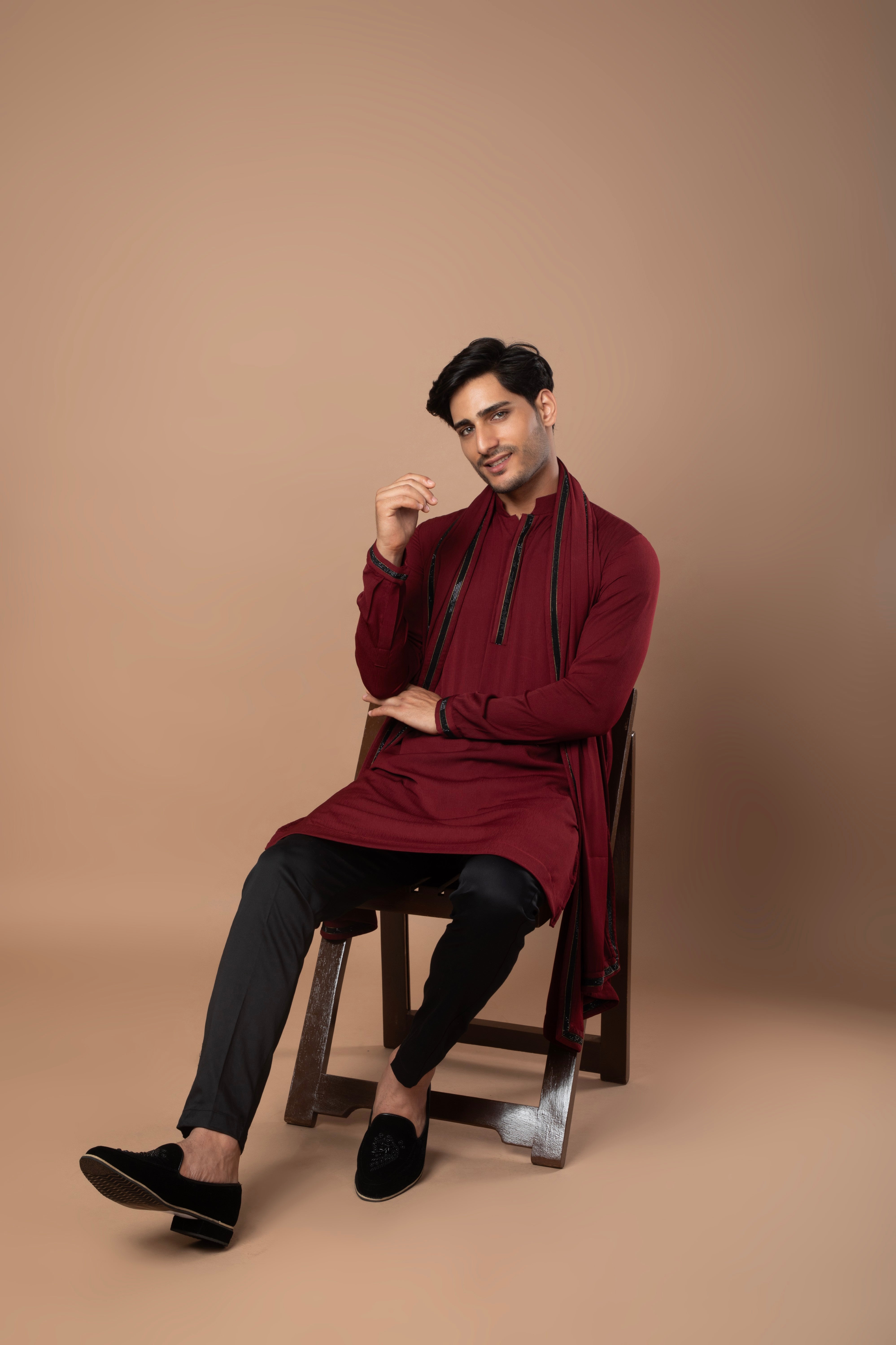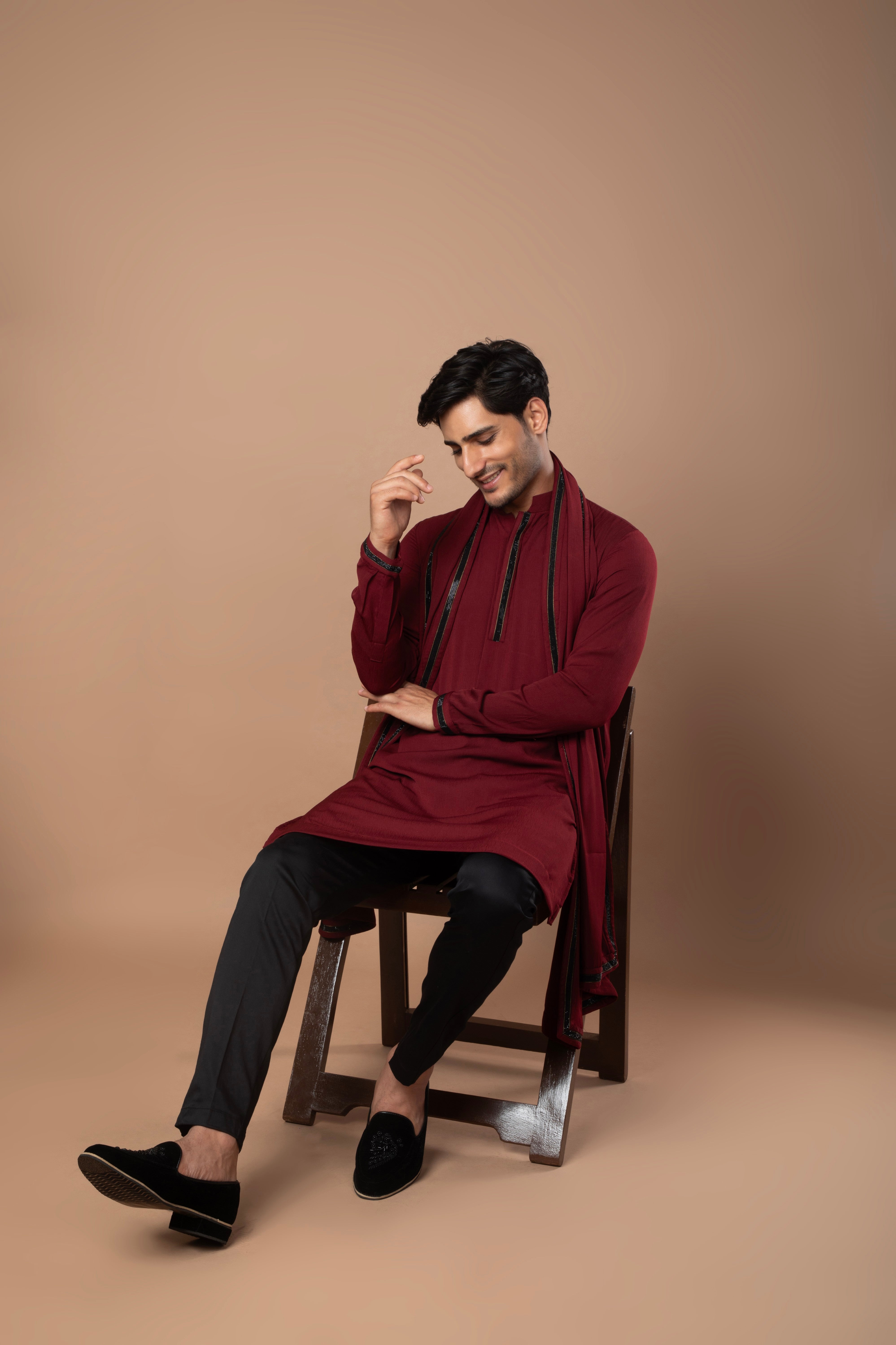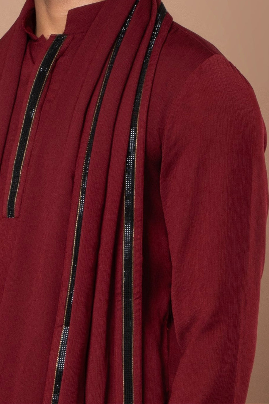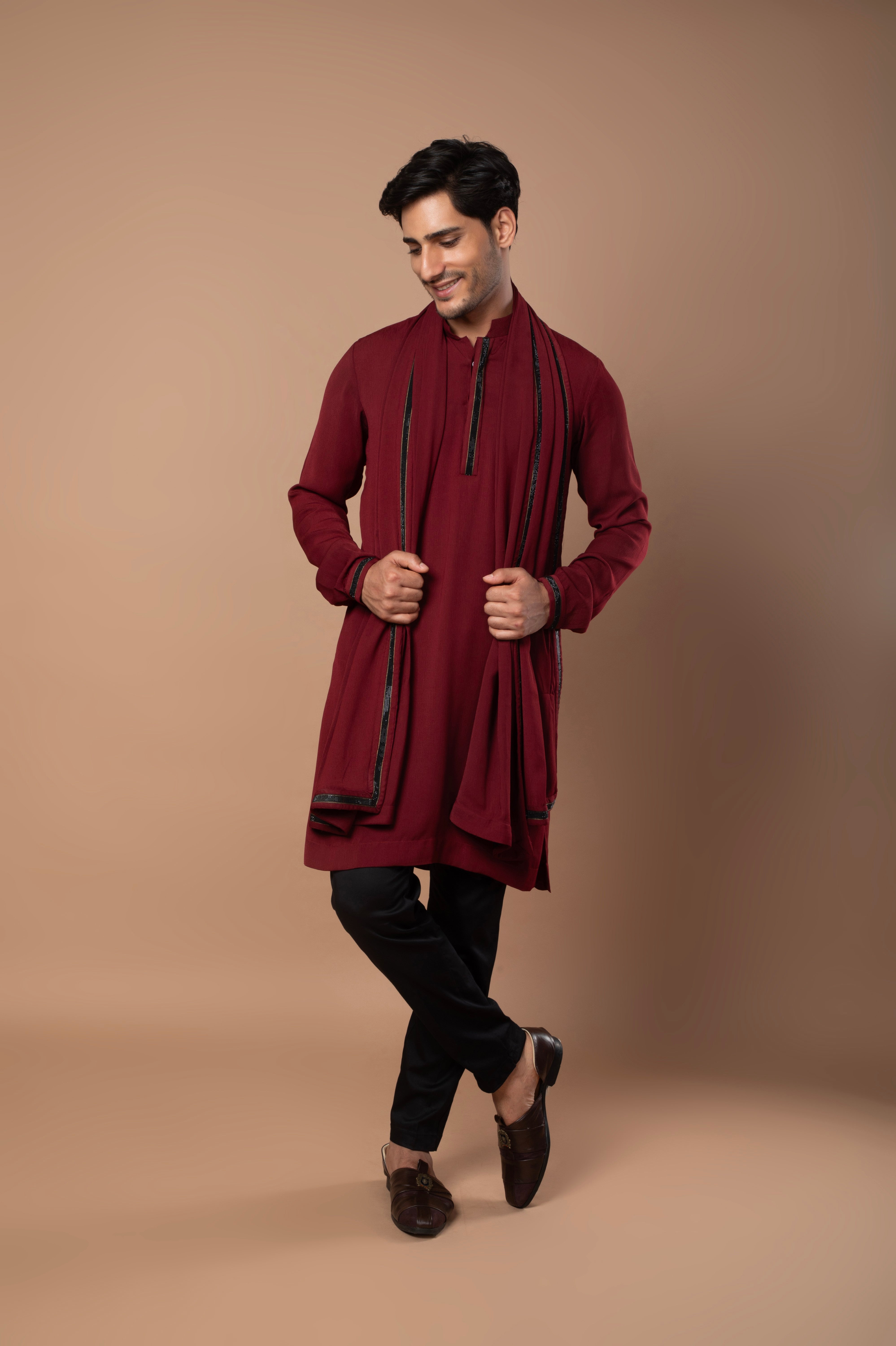 A refined maroon kurta paired with a matching dupatta, both accented with subtle embellished borders along the neck and sleeves. The mandarin collar and sleek cut make it perfect for festive occasions and family celebrations. Pair it with black trousers for a balanced, elegant look. Ideal for sangeet nights, weddings, baarats and festive gatherings where you can dance and enjoy with comfort and style.
