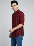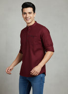 This stylish maroon short kurta brings a smart, modern twist to everyday ethnic wear. Designed with a mandarin collar, button placket, roll-up sleeves, and a practical chest pocket, it offers both comfort and effortless sophistication. Its rich maroon tone makes it perfect for casual outings, festive days, office ethnic wear, or weekend get-togethers. Pair it easily with jeans, chinos, or cotton trousers for a versatile look.