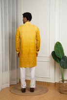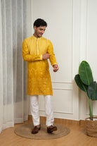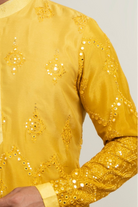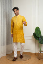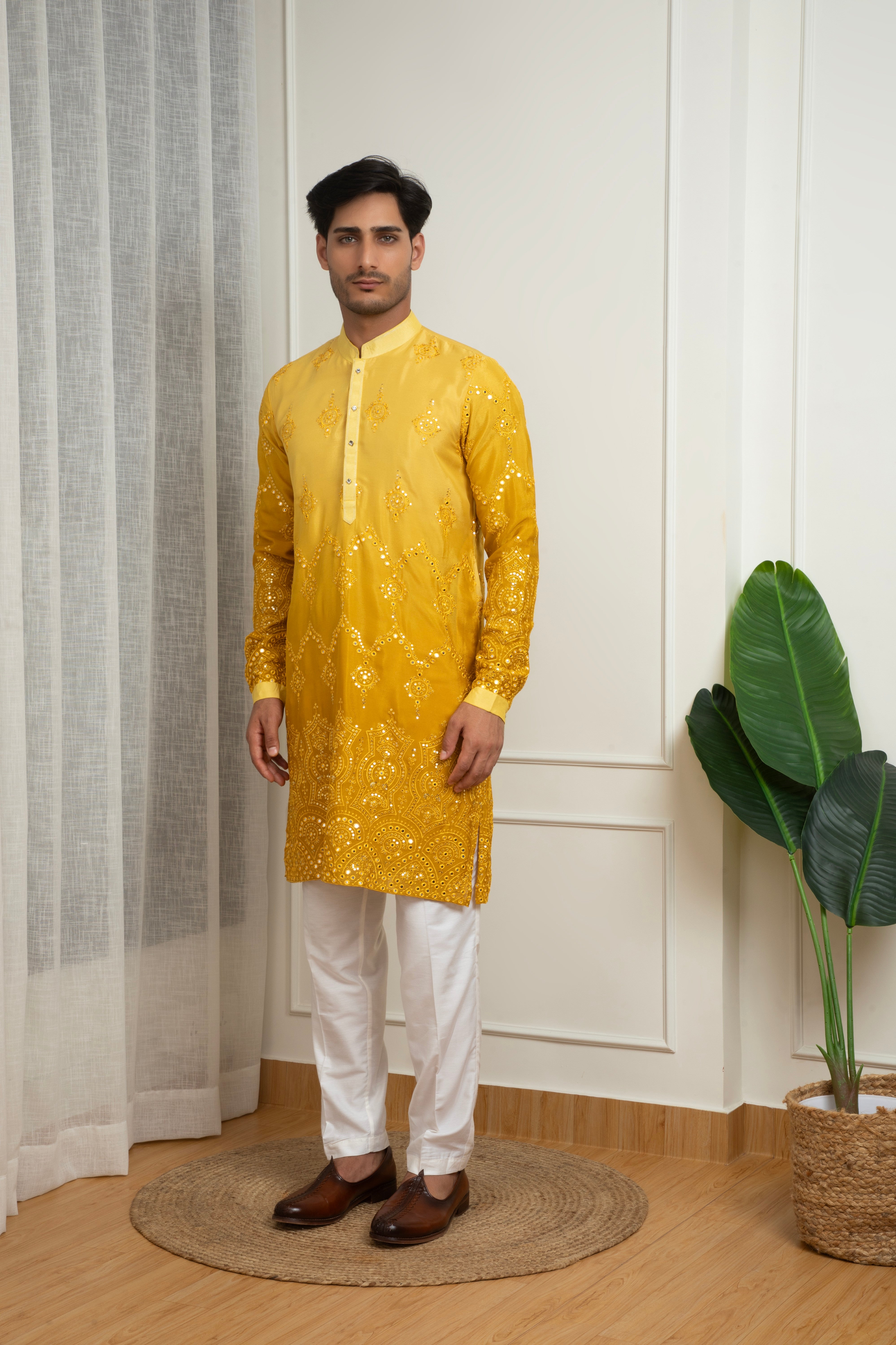 Radiate confidence and charm in this sunshine yellow kurta featuring detailed embroidery and sparkling mirror embellishments. Its refined craftsmanship and elegant silhouette make it a perfect choice for haldi functions, festive events, and traditional gatherings. Pair it with white bottoms and classic brown shoes to complete a graceful ethnic ensemble.