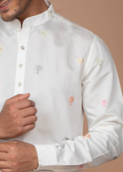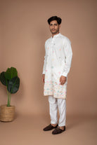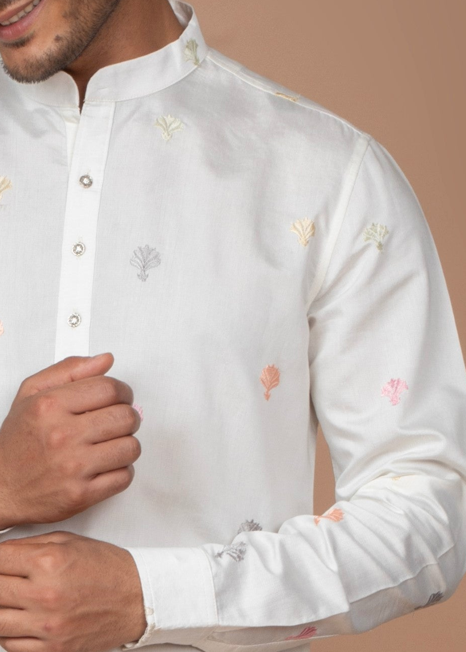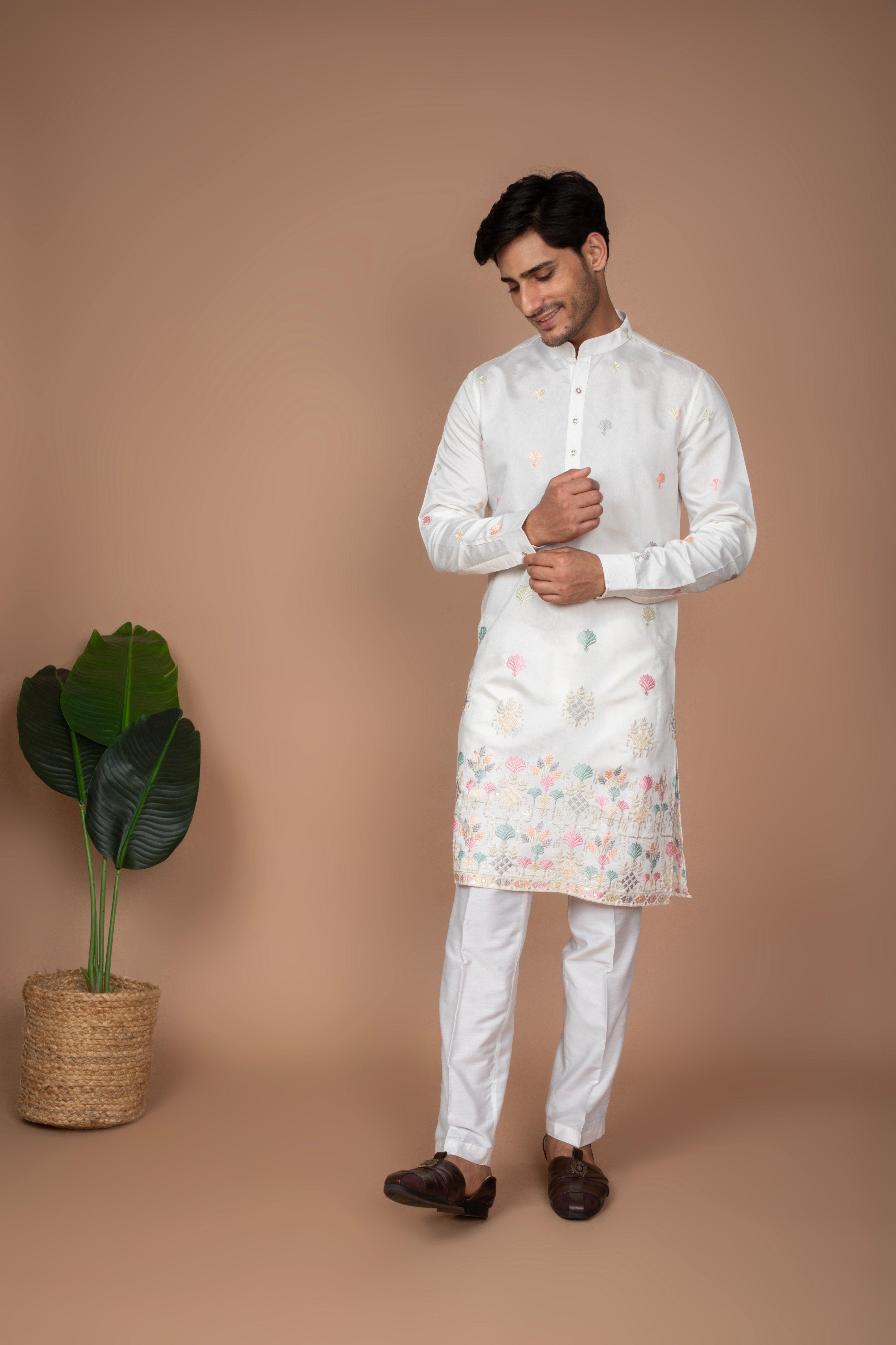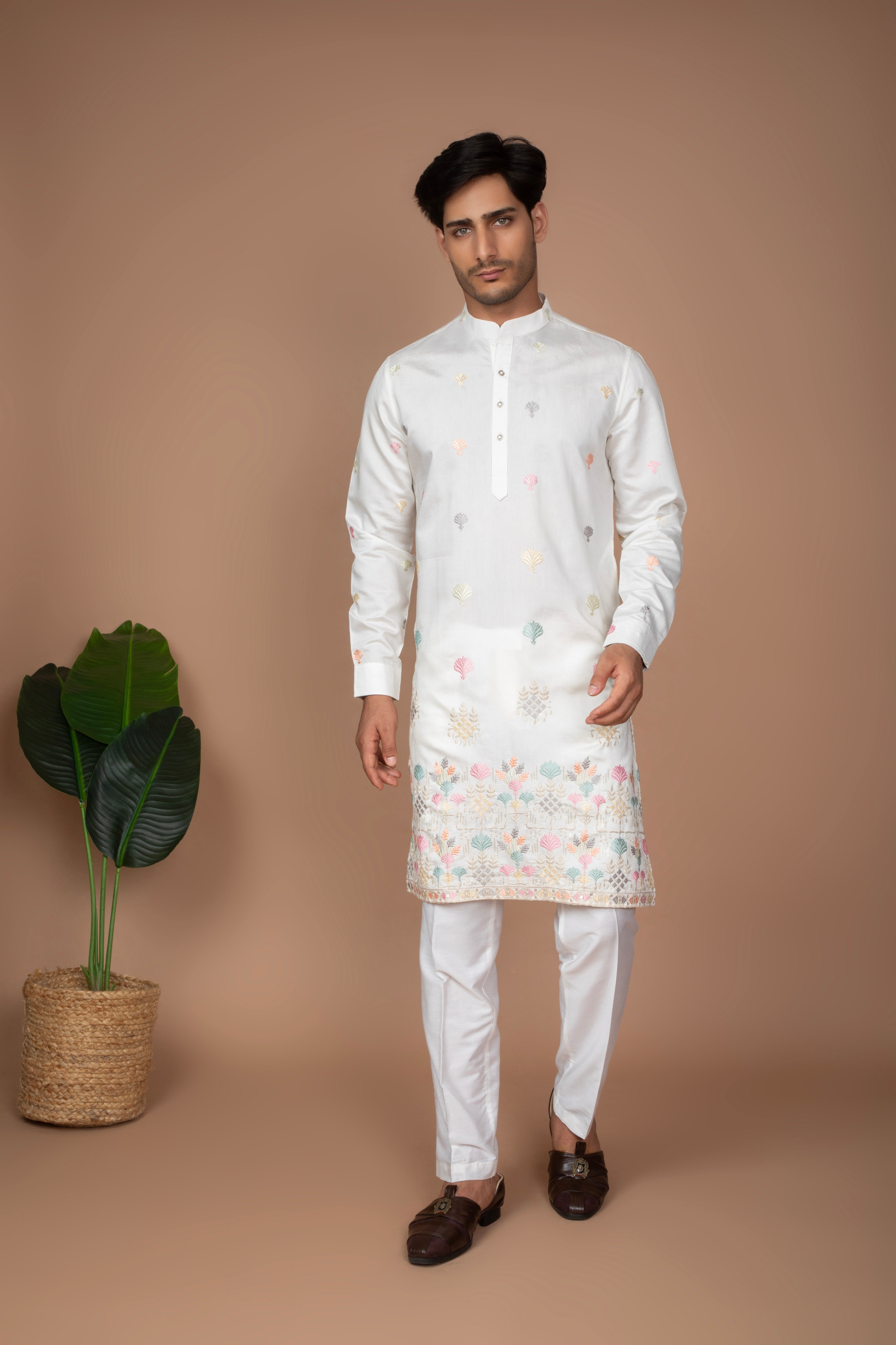 This elegant off-white kurta features intricate multi-color floral thread embroidery spread across the upper body and beautifully detailed at the border. The vibrant yet subtle embroidered motifs add character and charm without overpowering the minimal base, making it ideal for festive functions, daytime celebrations, and cultural gatherings. Paired with white trousers, this set delivers a refined, premium, and effortlessly stylish ethnic look.