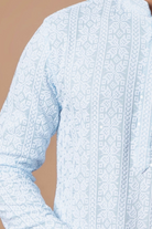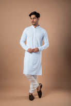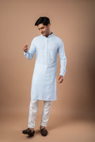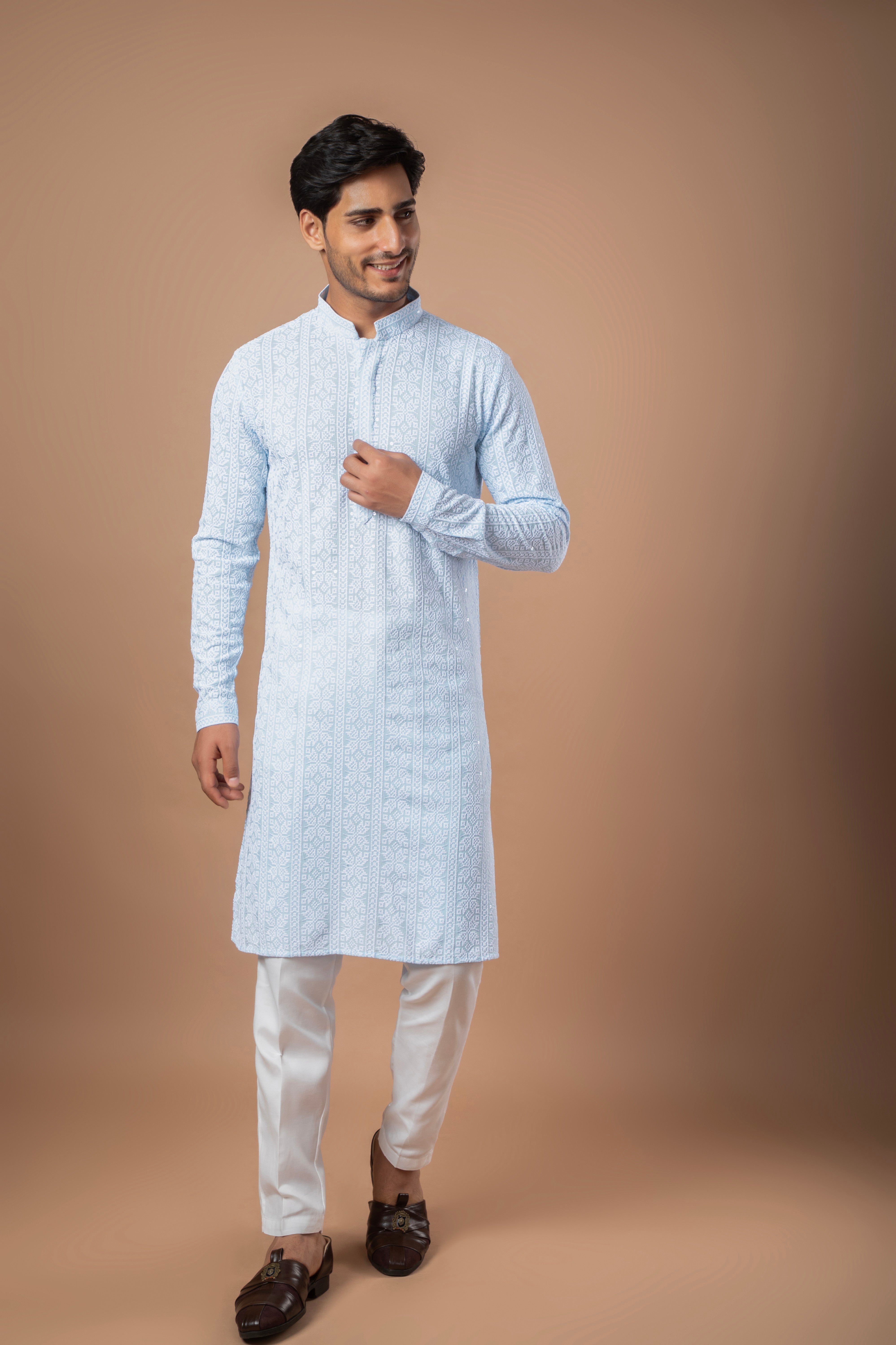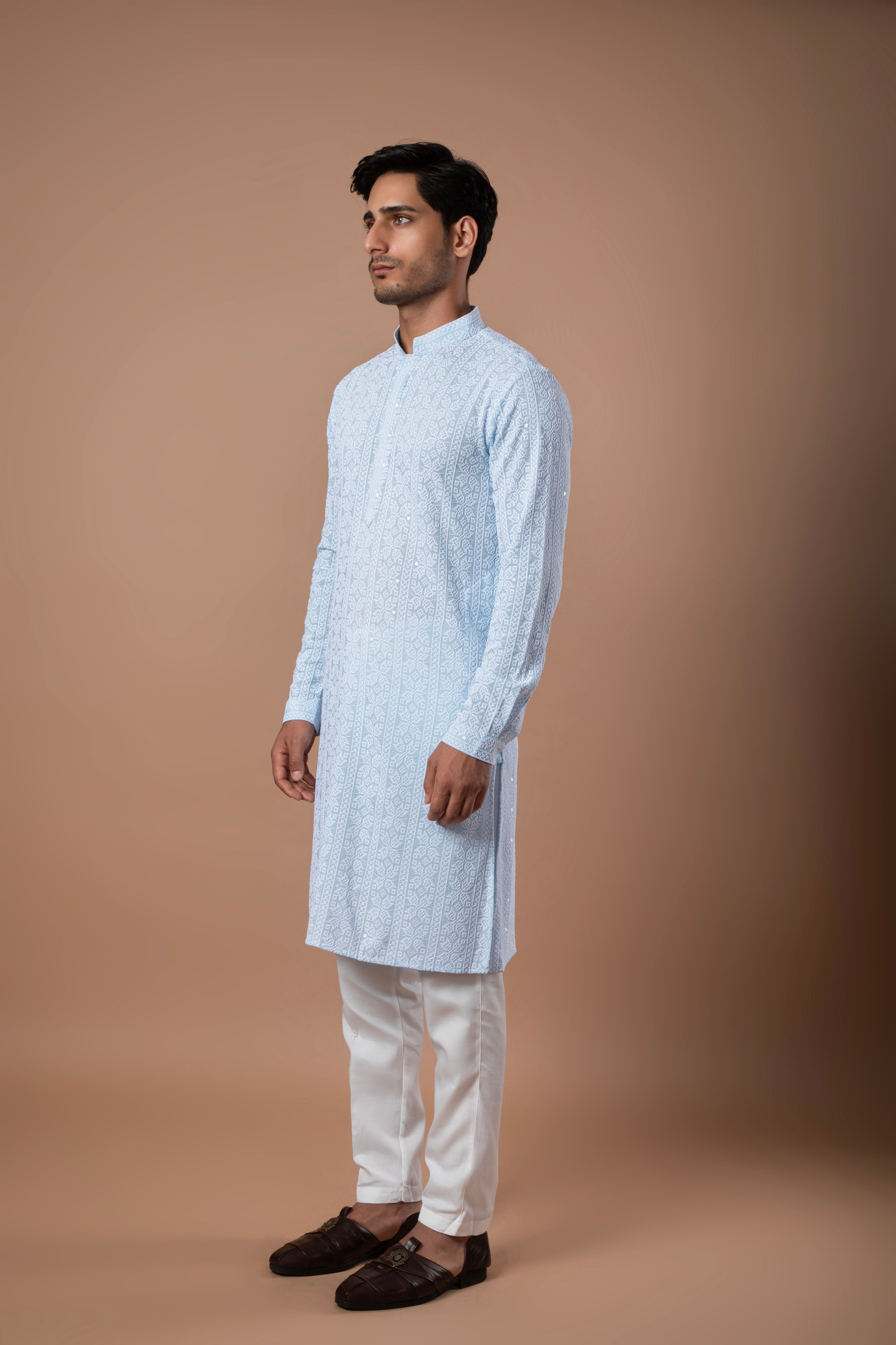 A refined sky blue kurta showcasing intricate geometric embroidery highlighted with delicate sequin work. Featuring a mandarin collar and full sleeves, it is perfect for festive gatherings, family occasions, or daytime celebrations.
