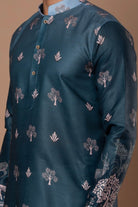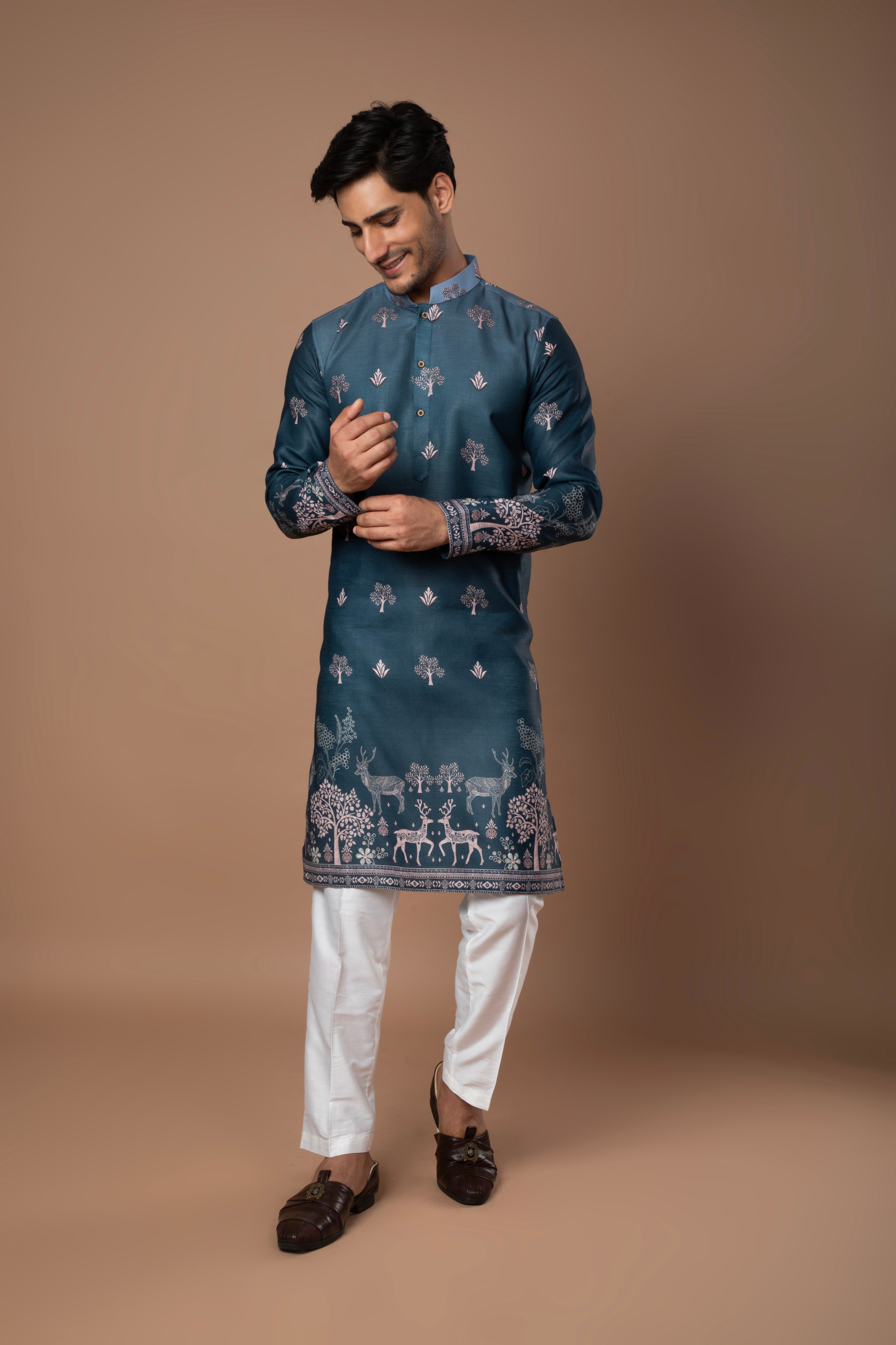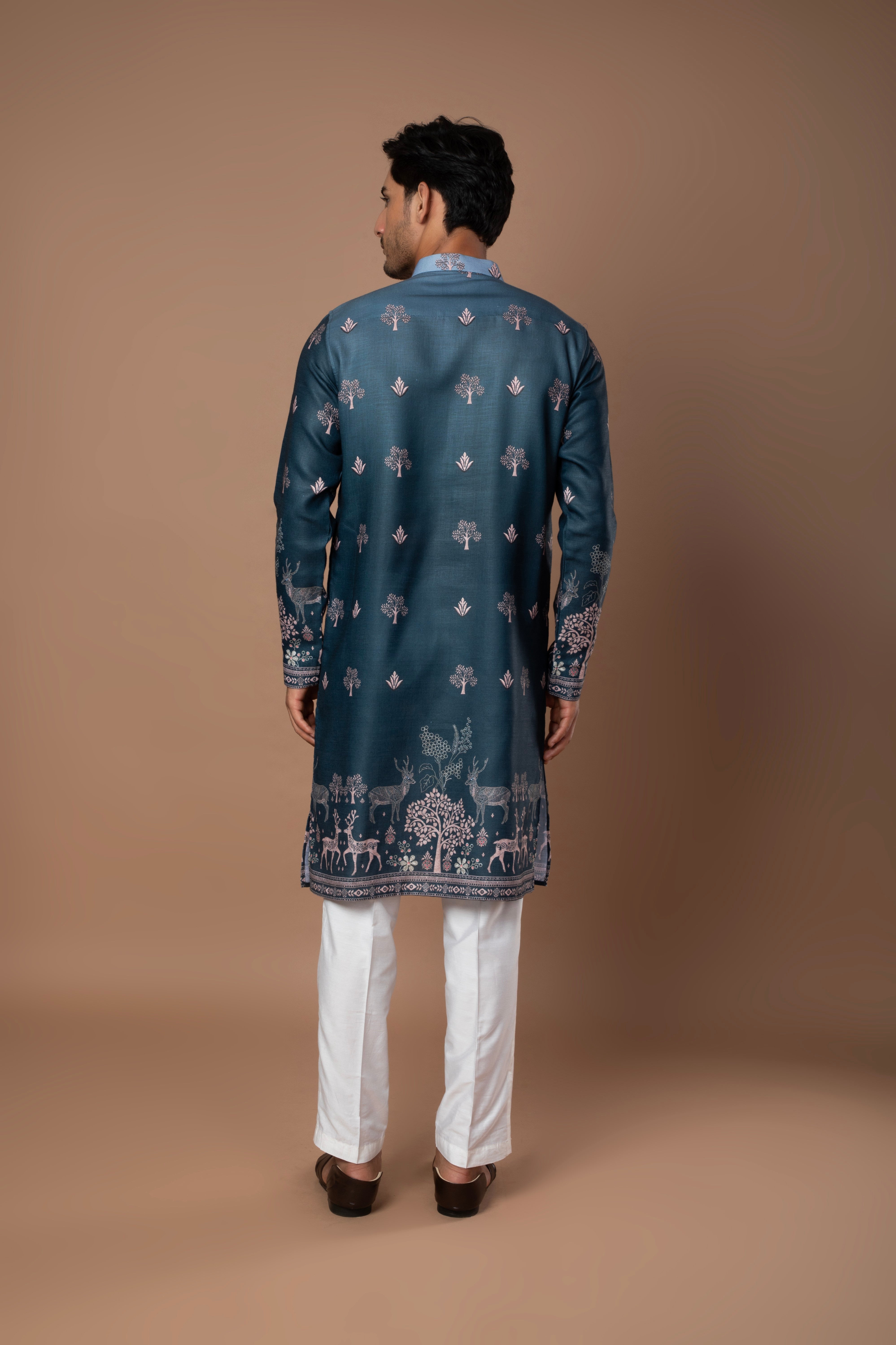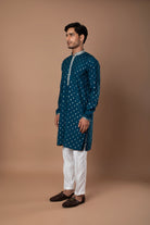 A graceful teal blue kurta featuring subtle printed motifs and refined border detailing along the hem and sleeves. The soft color and intricate design make it a perfect pick for festive and daytime occasions.