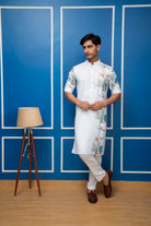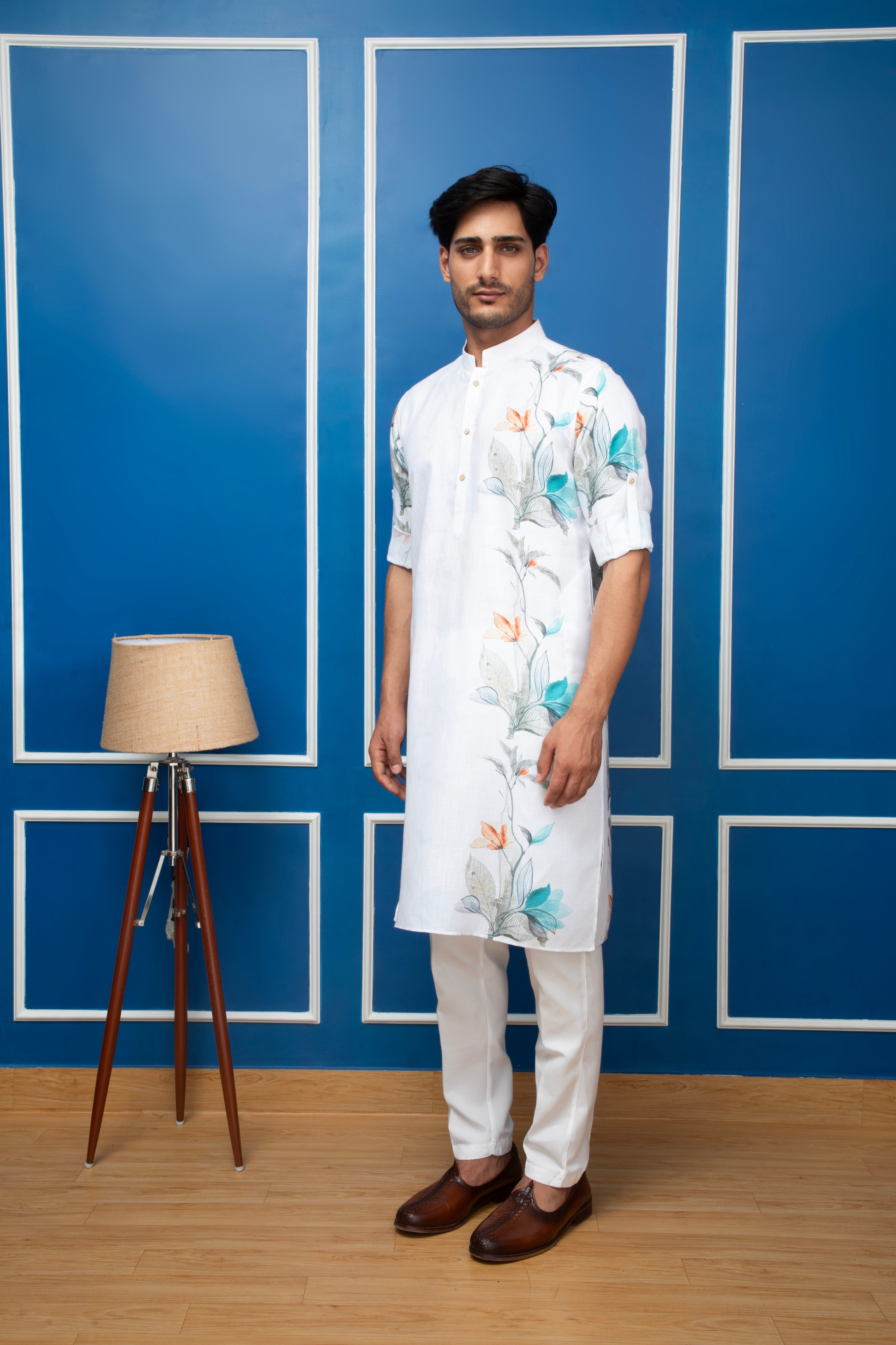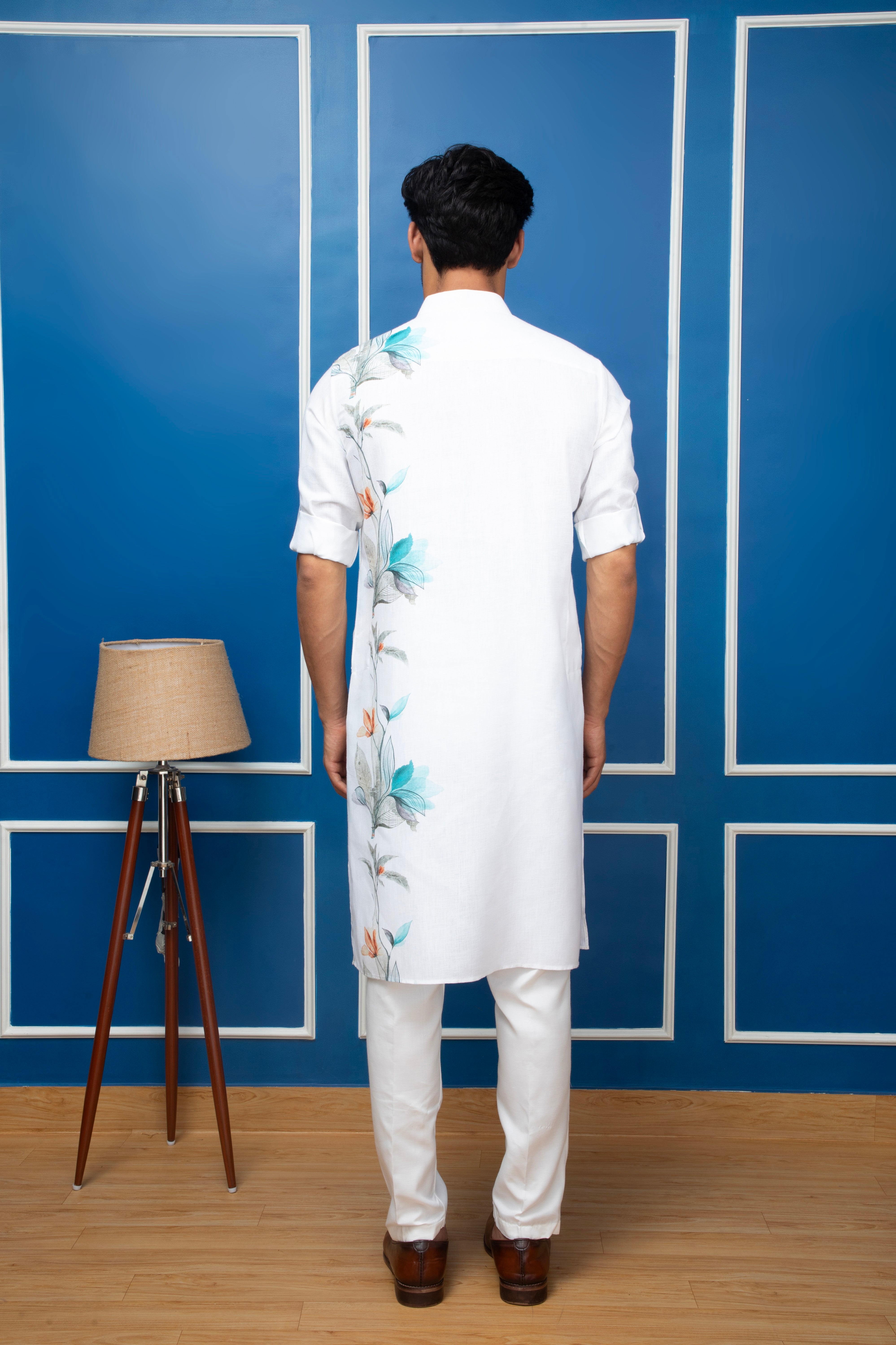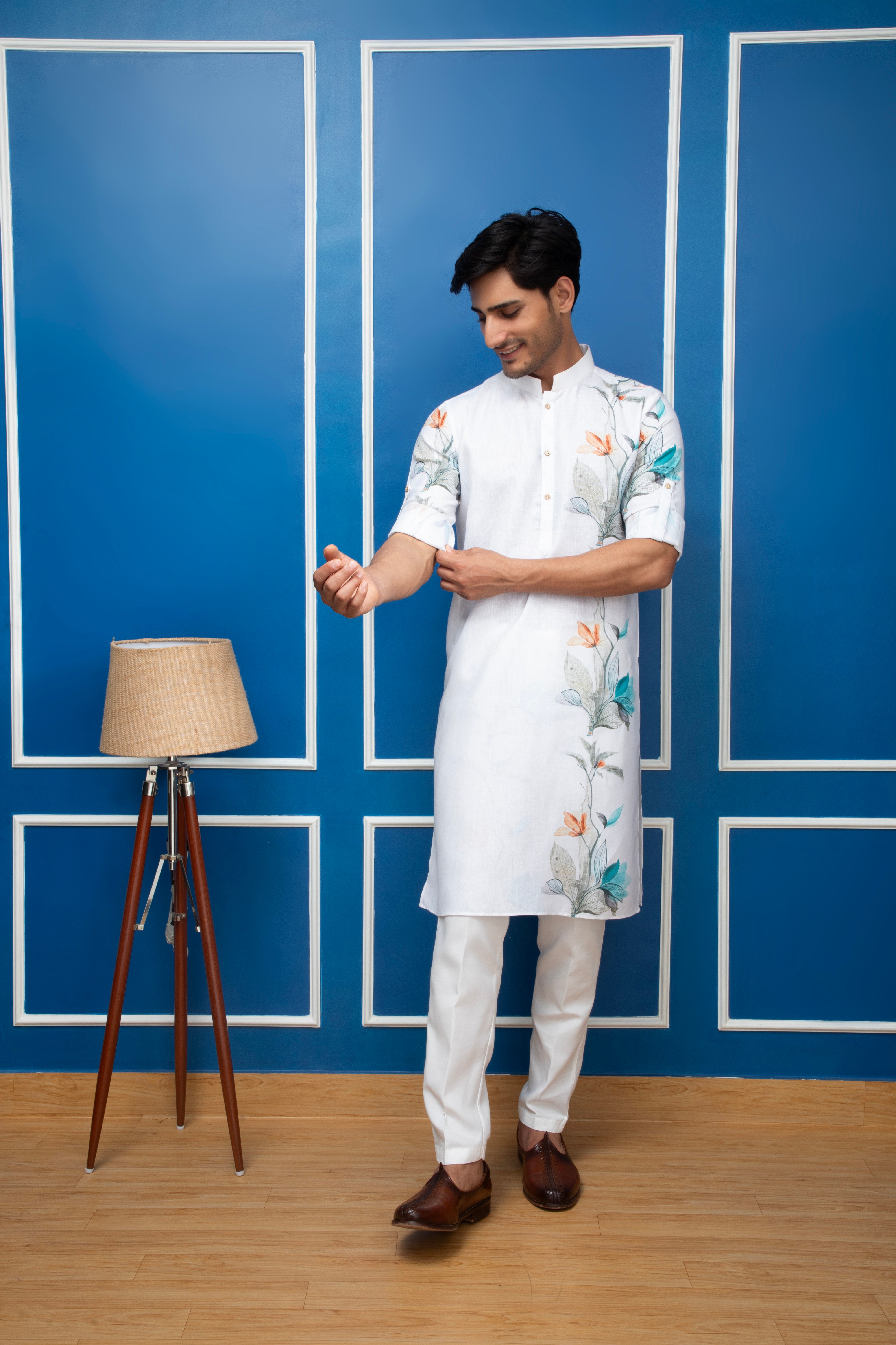 A refreshing white cotton kurta featuring a vibrant multi-color floral print cascading along one side, adding a modern artistic touch to a classic silhouette. Designed with a mandarin collar and roll-up sleeves, this kurta set blends comfort with contemporary style. Paired with white trousers, it’s the perfect choice for daytime festivities, summer celebrations, and cultural gatherings.