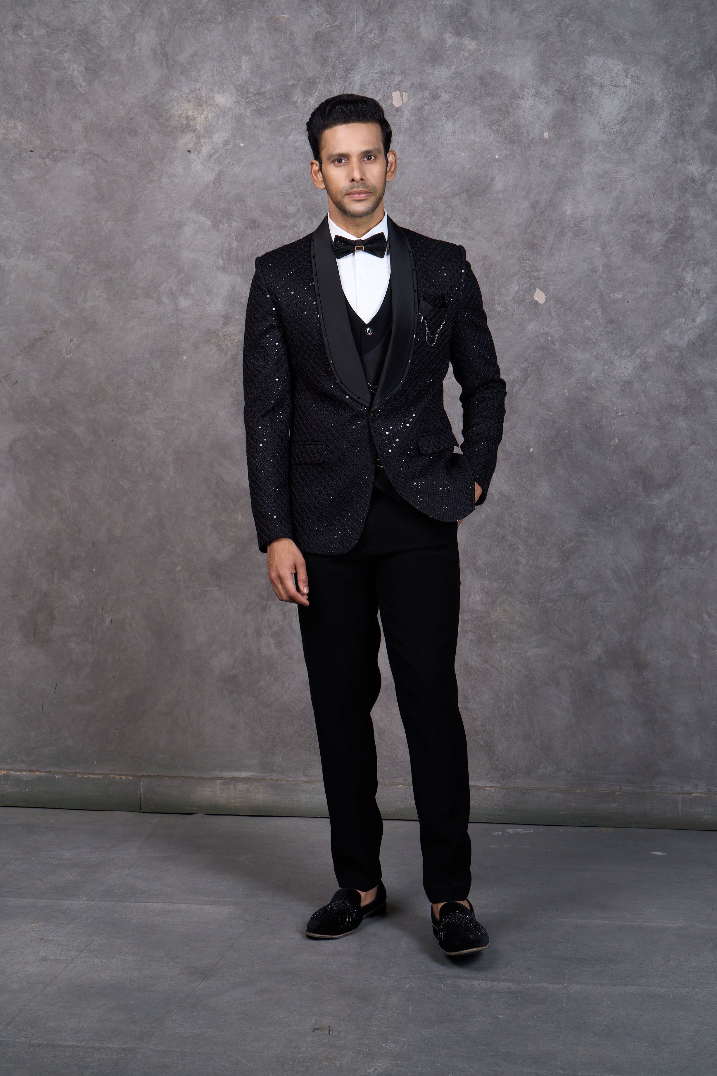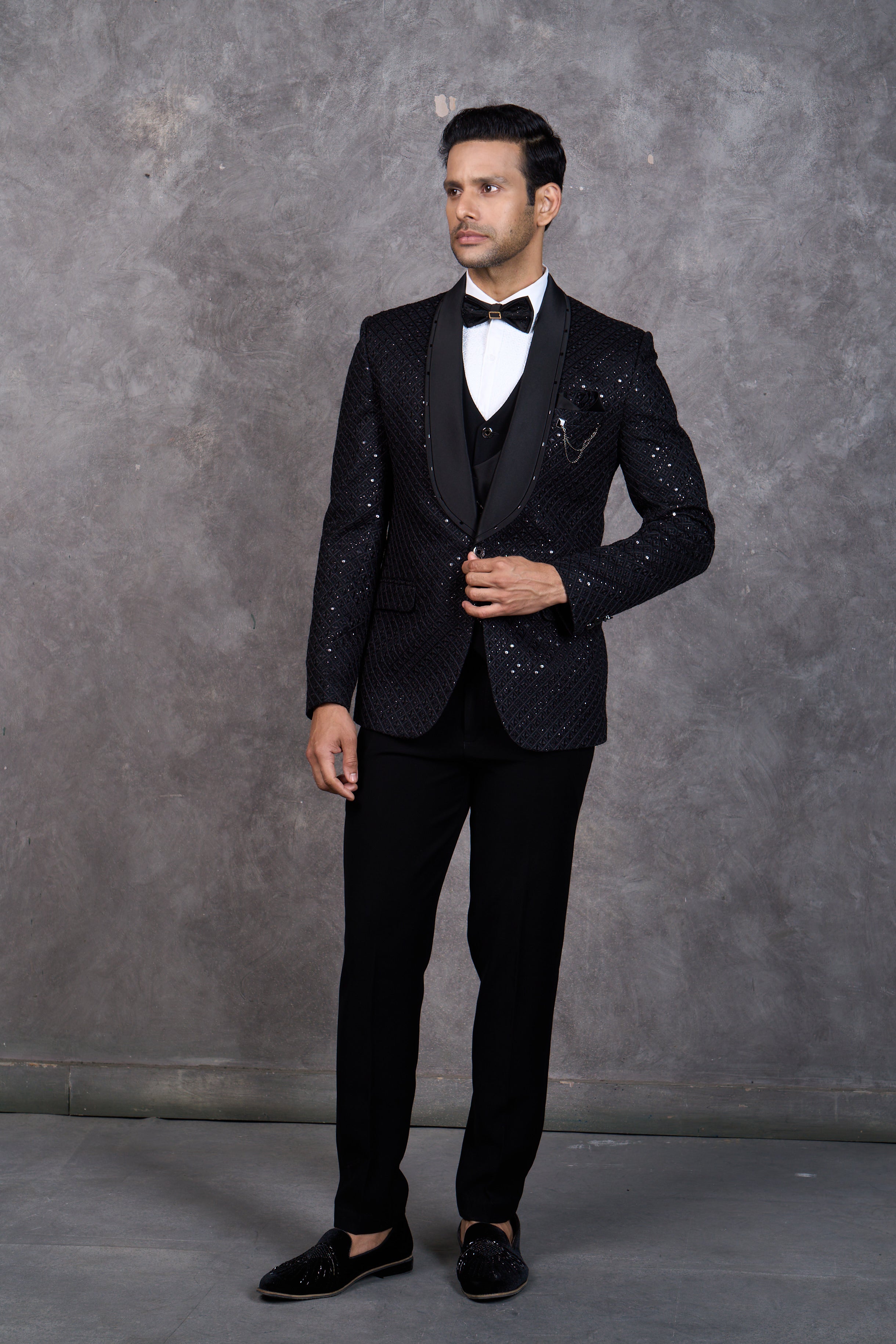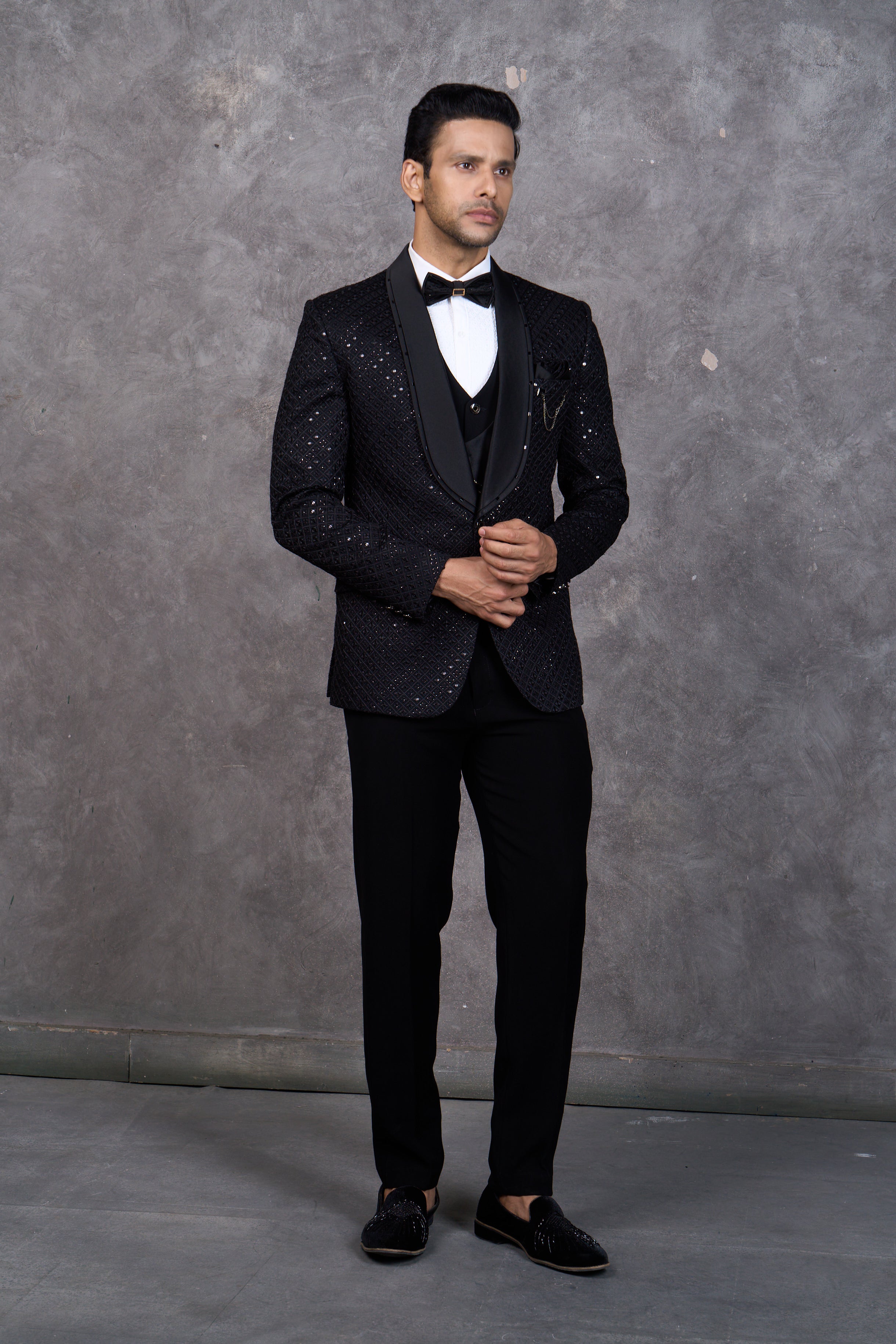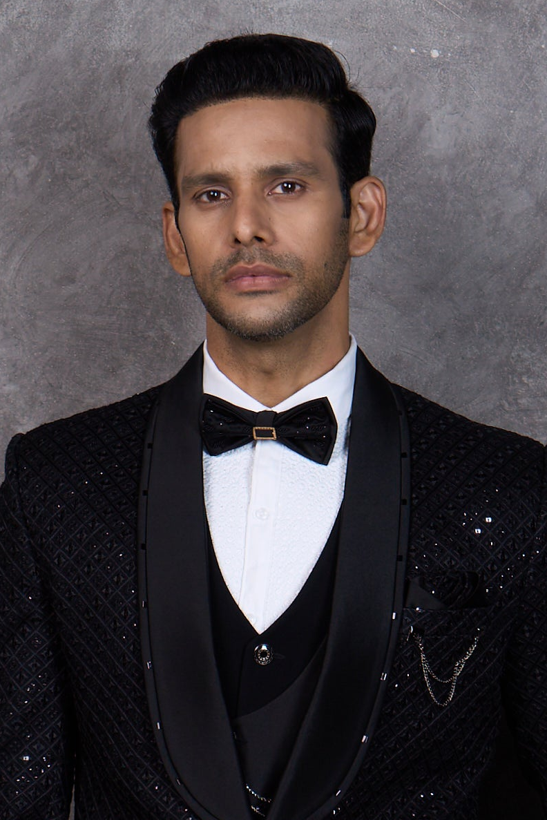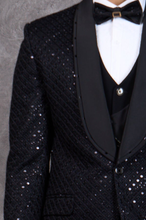 Glamorous Black Textured Tuxedo with all over Sequins Embroidery