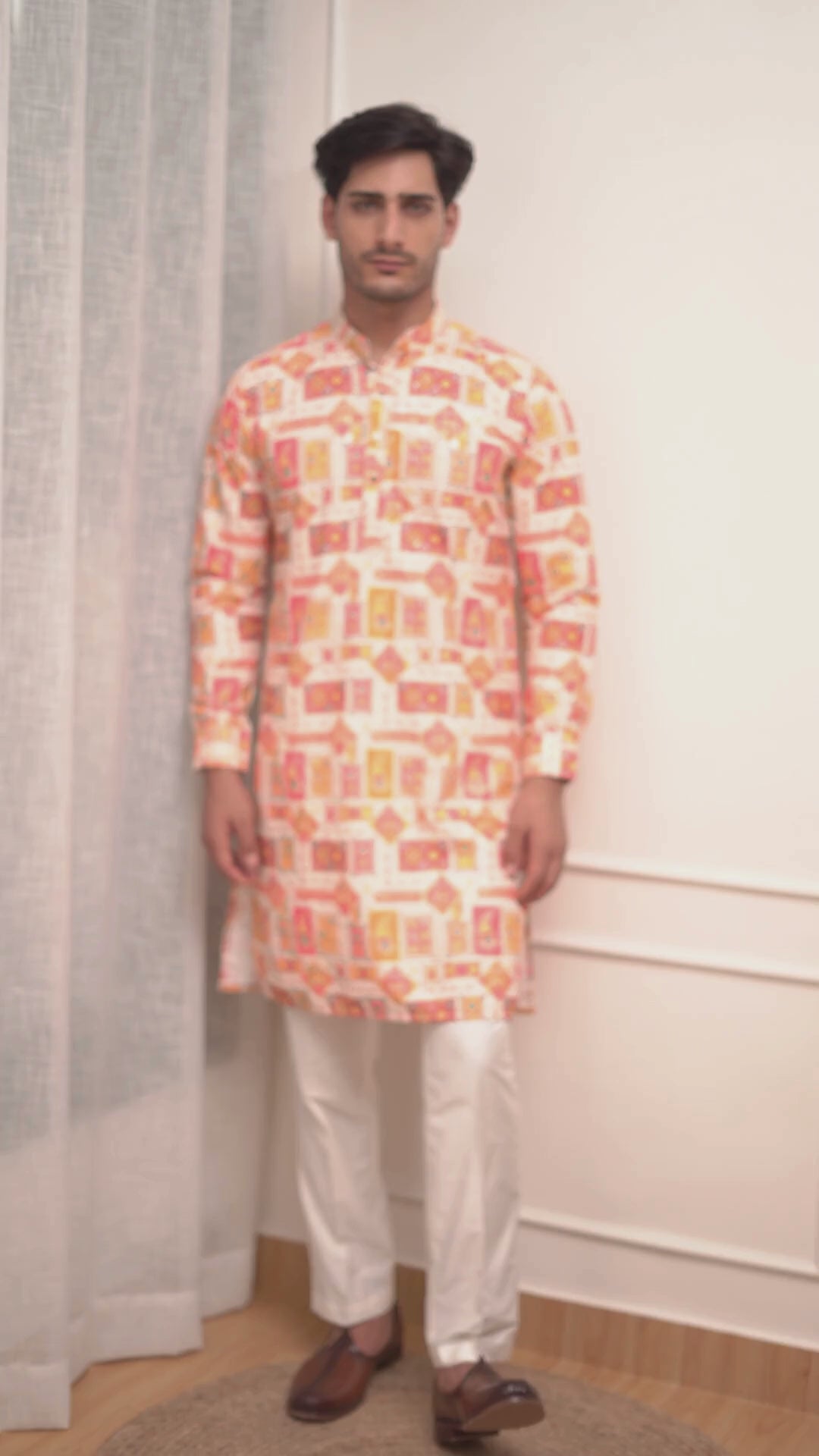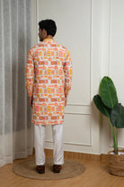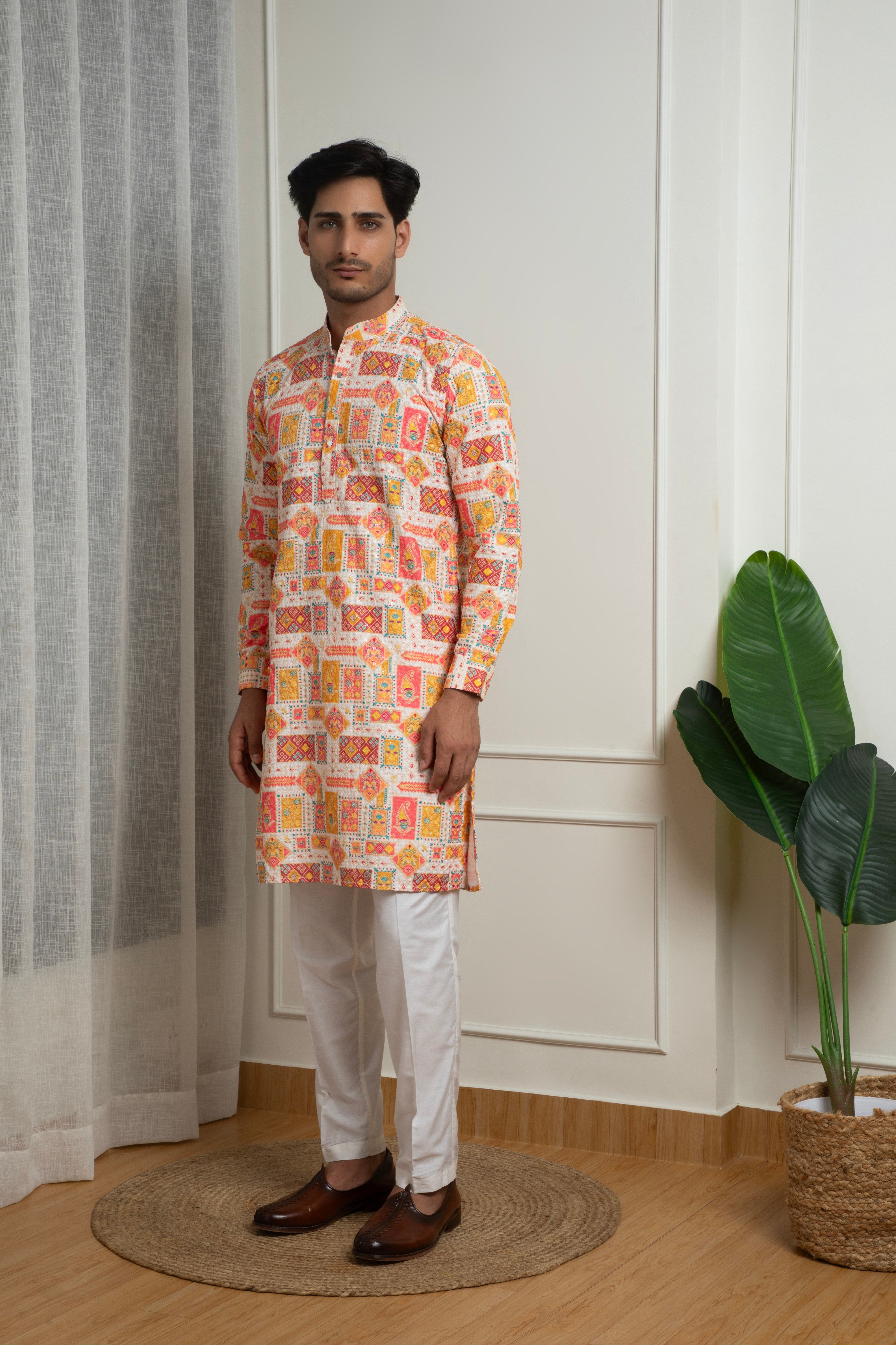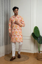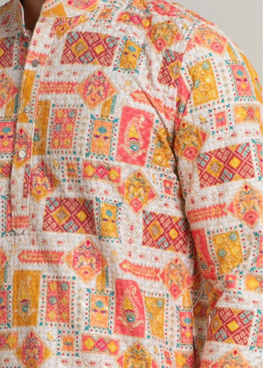 A vibrant and festive kurta set crafted in a comfortable cotton blend, featuring an all-over multi-color printed pattern inspired by traditional motifs. The lively color palette paired with a classic mandarin collar and straight-fit silhouette makes it ideal for haldi ceremonies, festive gatherings, cultural events, and daytime celebrations. Finished with white trousers, this look is bright, youthful, and celebration-ready.