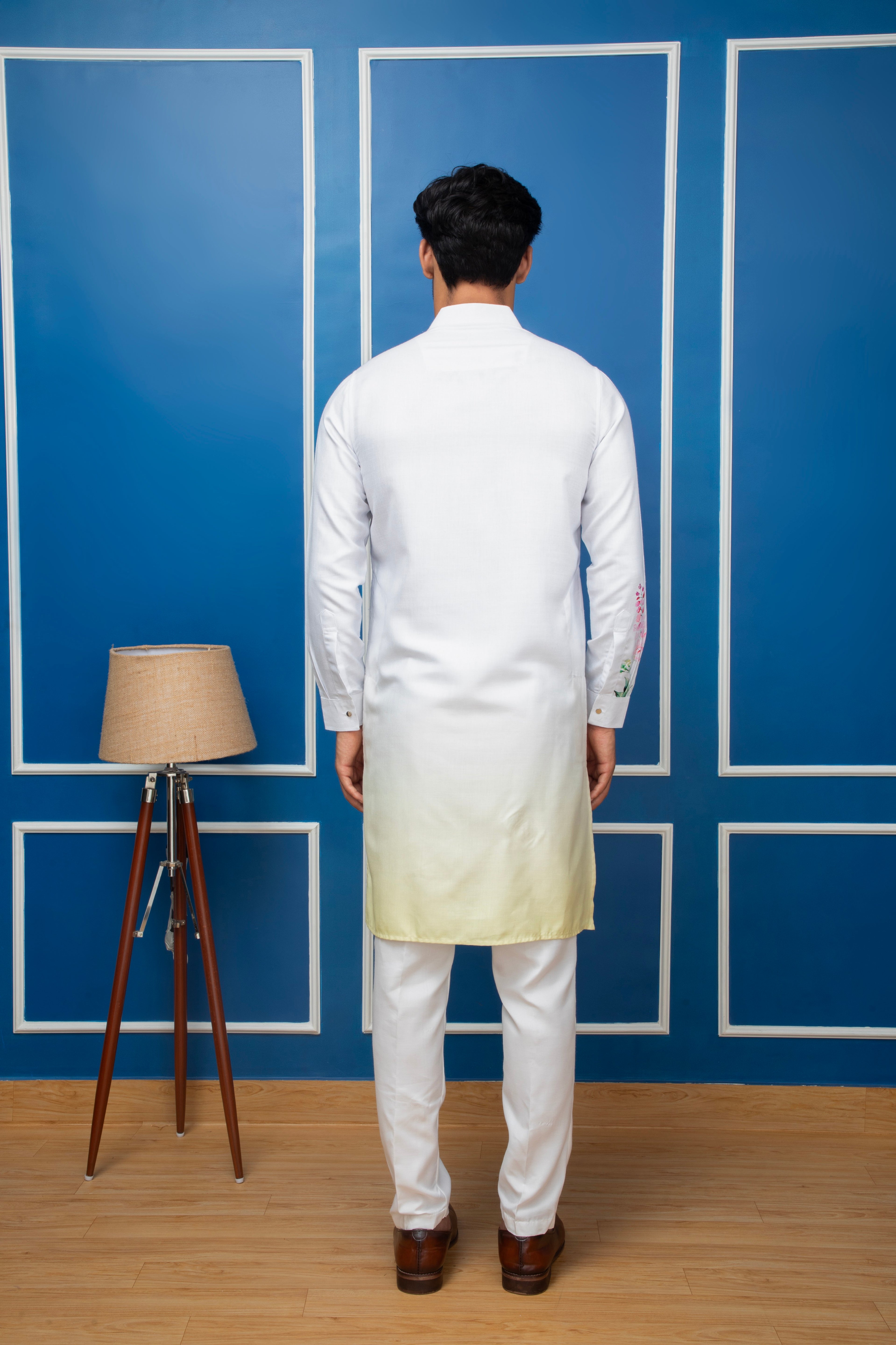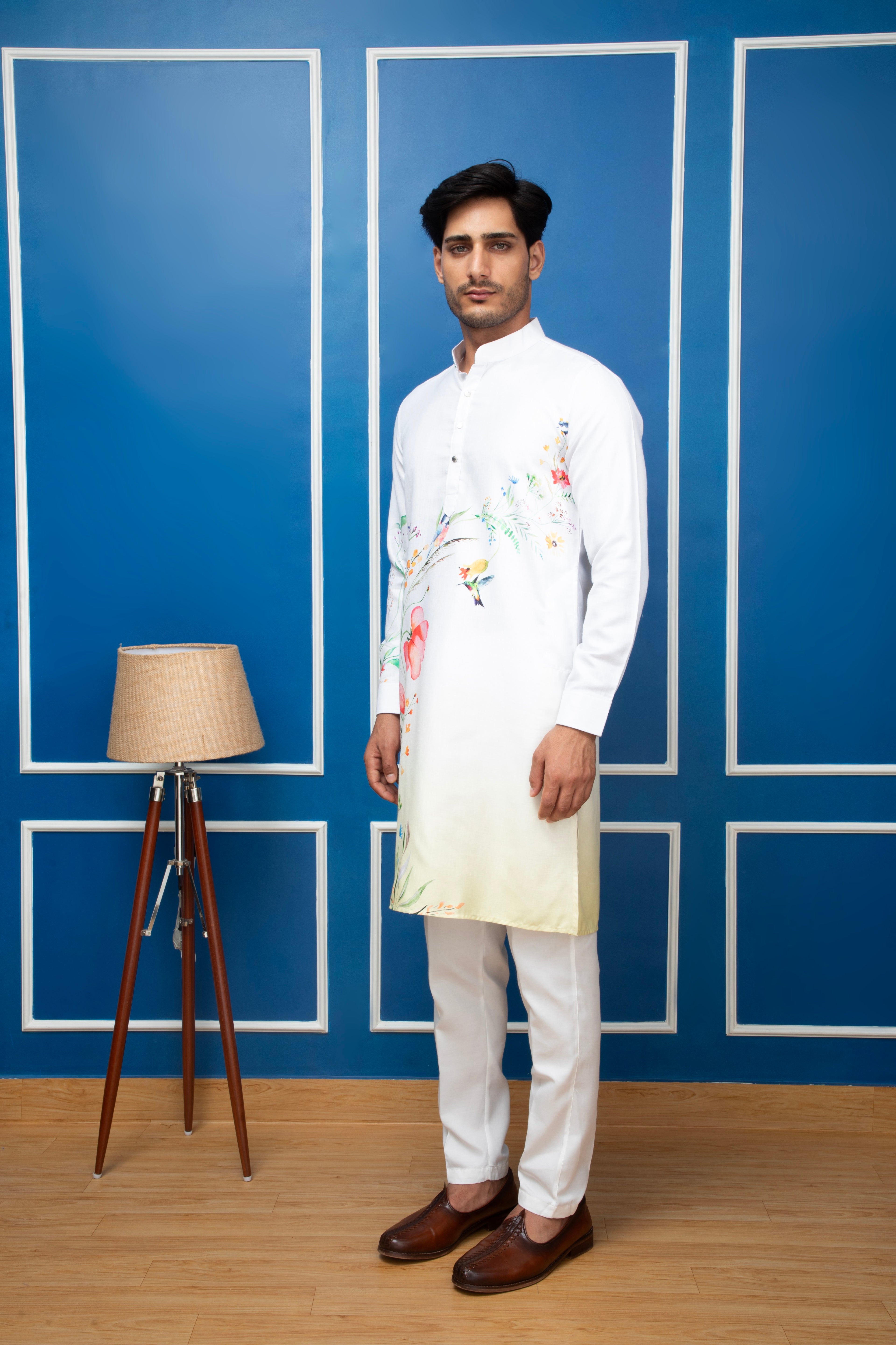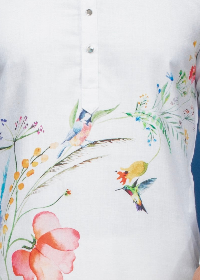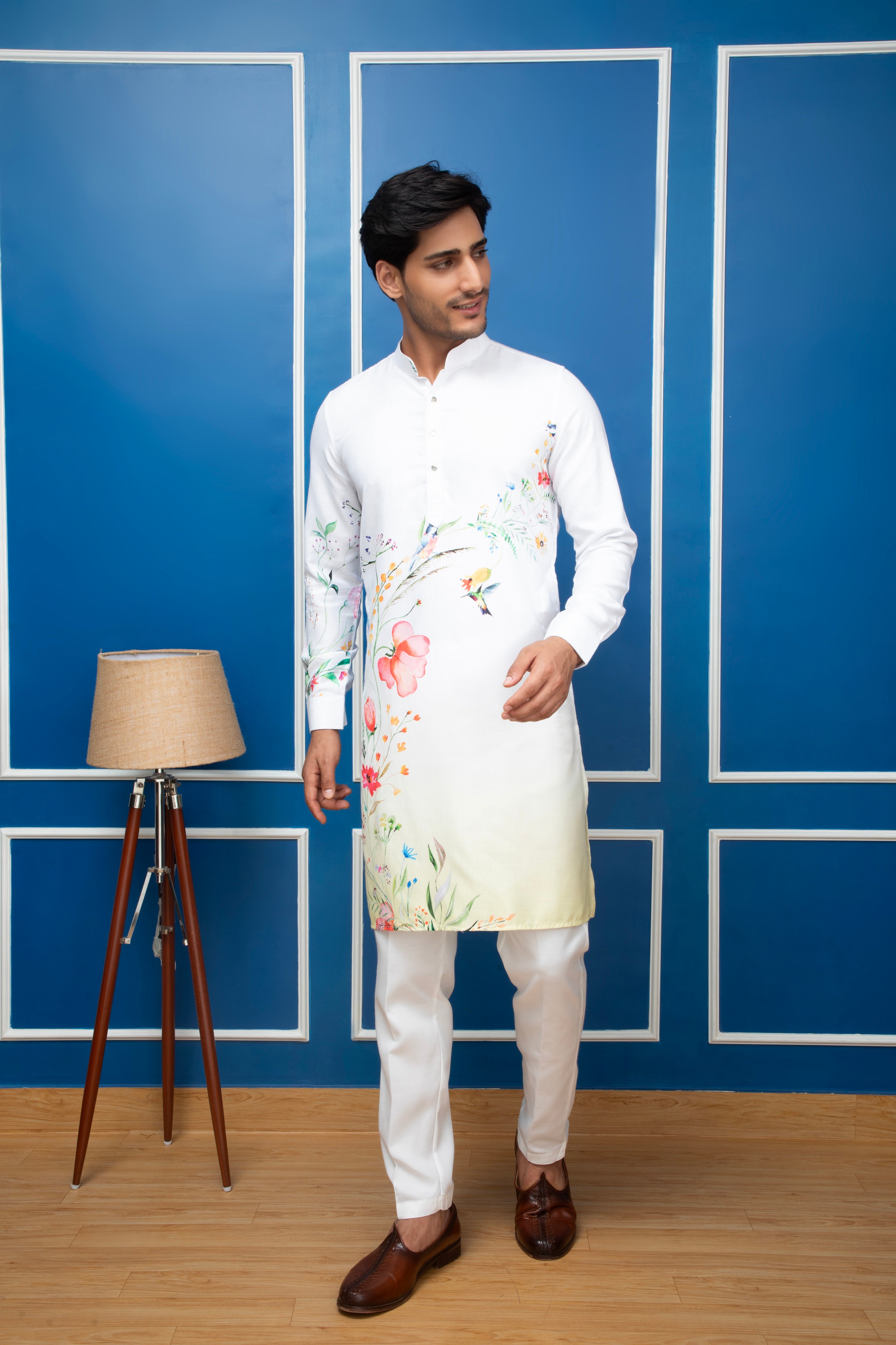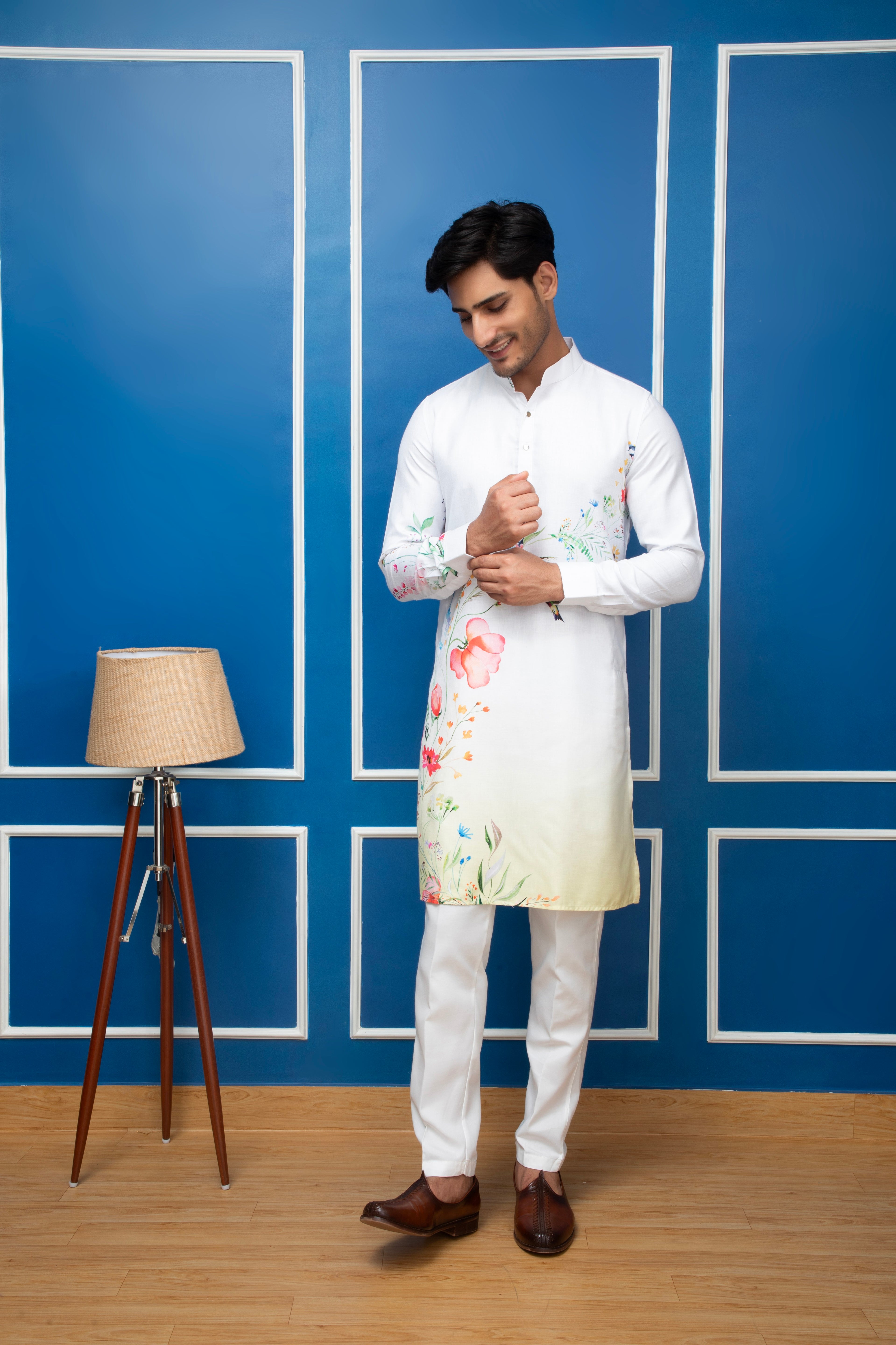 A refreshing off-white cotton kurta featuring an elegant multi-color floral print with a soft gradient effect at the hem. The artistic placement of the florals adds a modern, vibrant touch to a classic silhouette. Designed with a mandarin collar and straight fit, this kurta set is perfect for festive day events, pujas, summer celebrations, and cultural gatherings. Paired with white trousers, it creates a bright and effortless ethnic look.