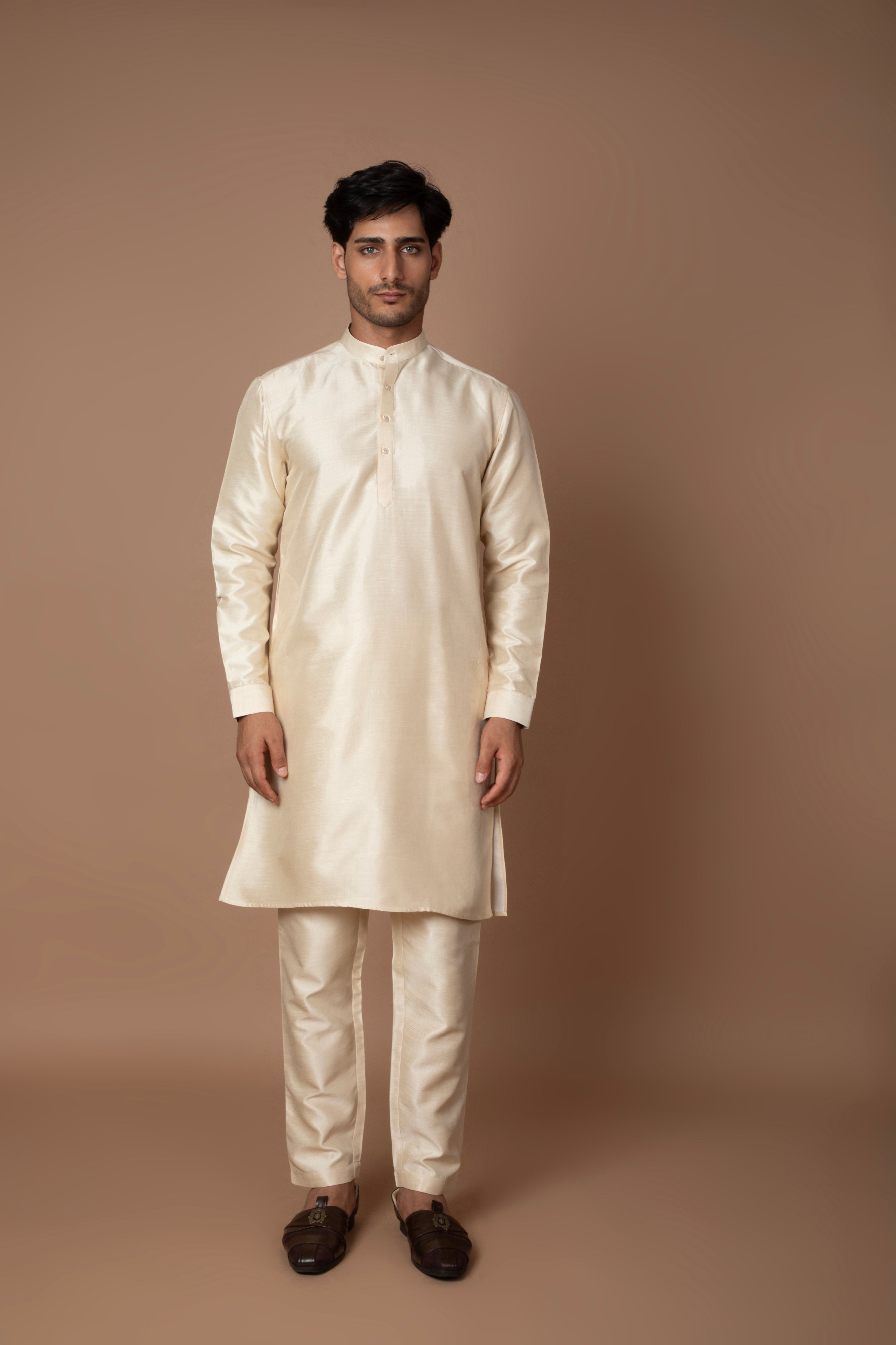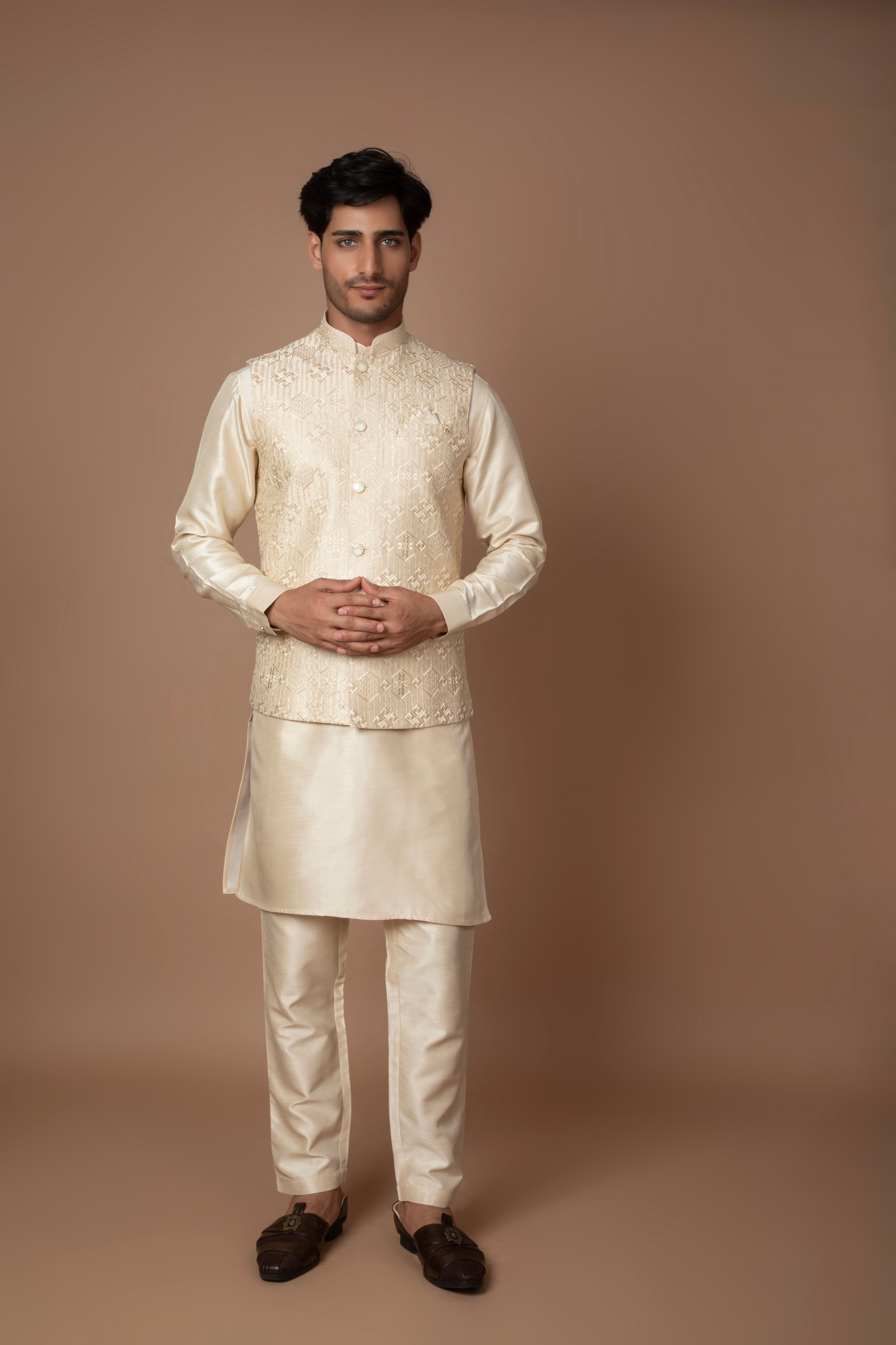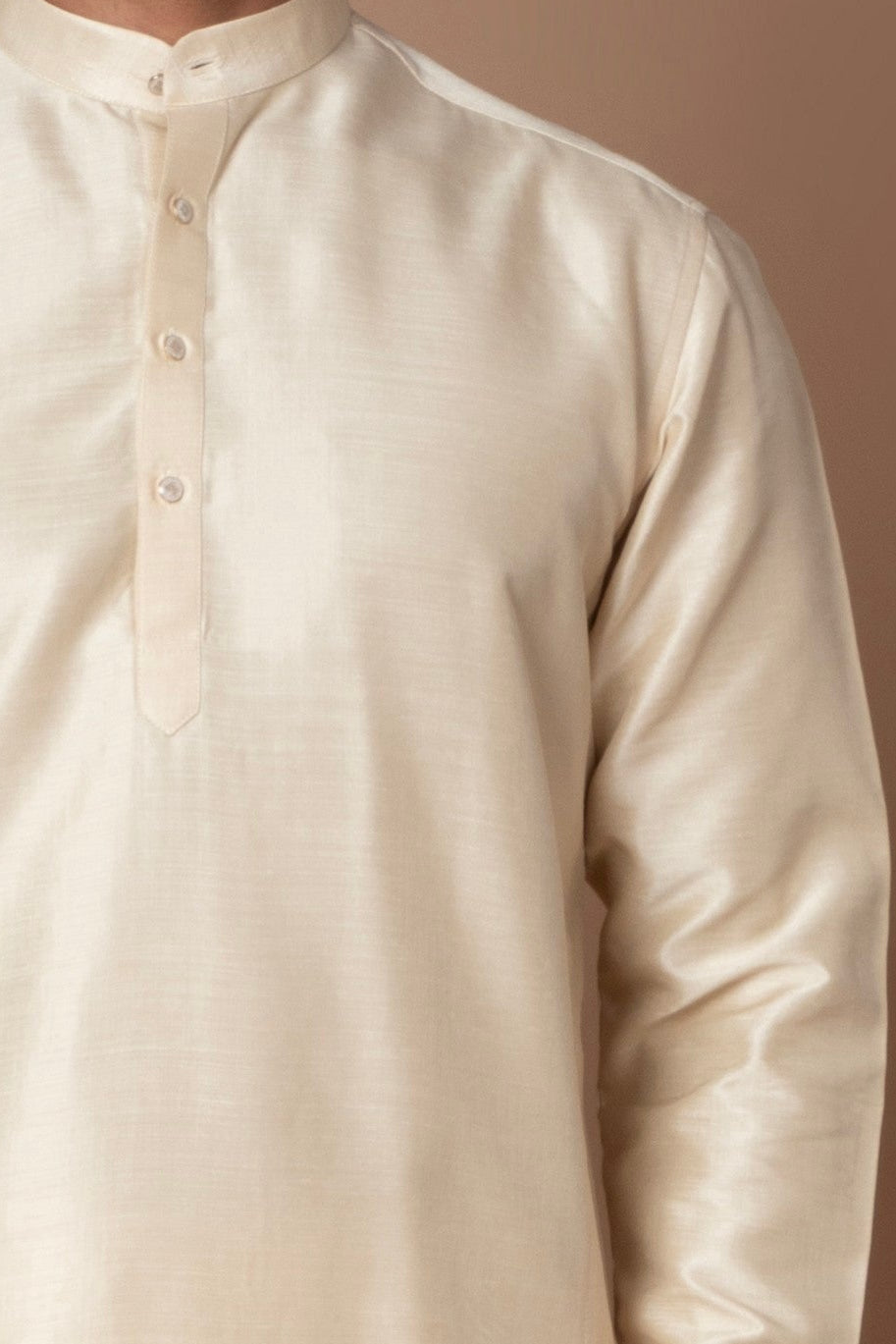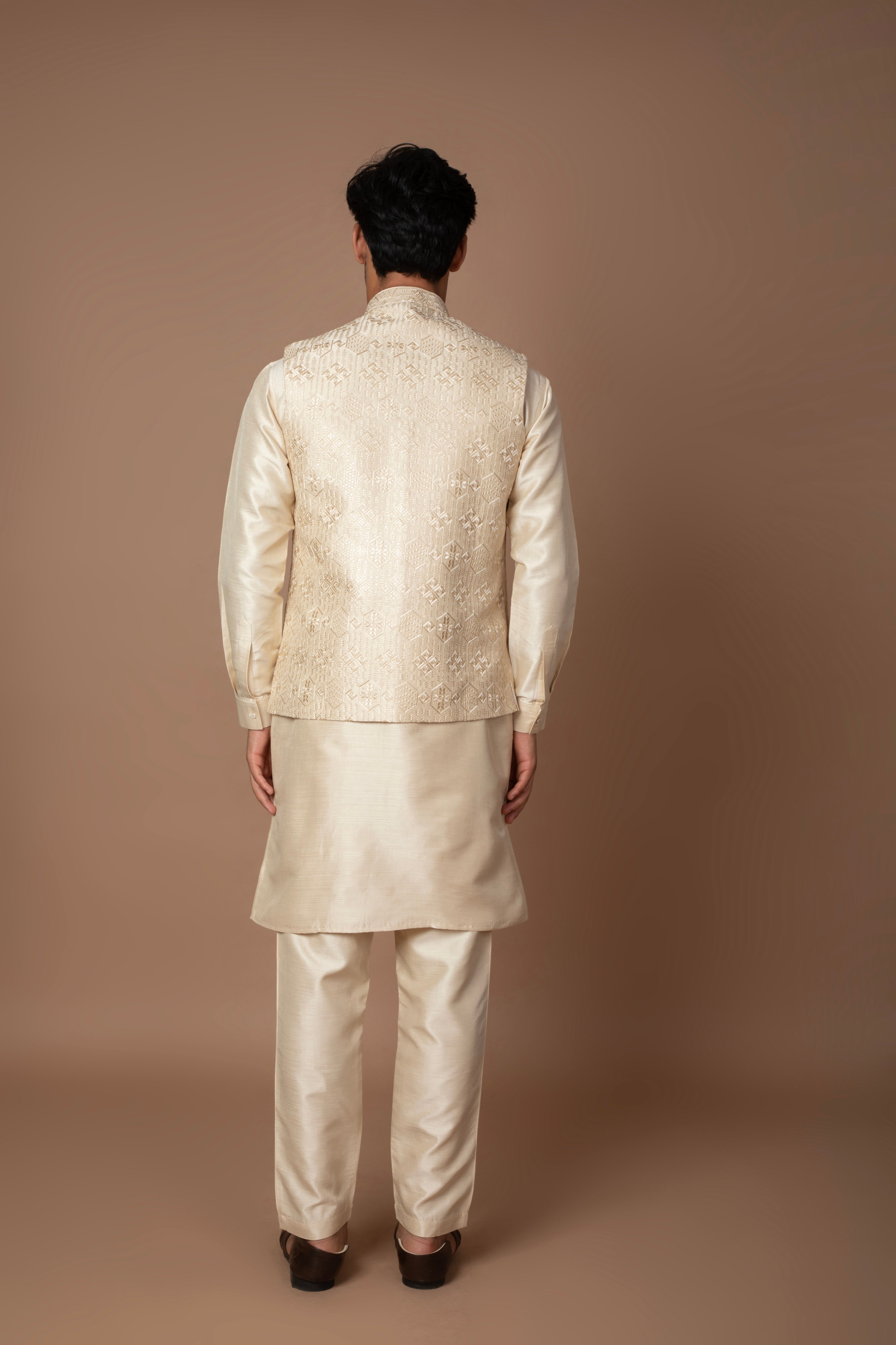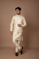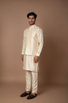 A classic champagne-gold kurta set paired with a matching embroidered Nehru jacket. The subtle golden hue and lustrous finish makes it perfect for festive and wedding occasions.
