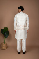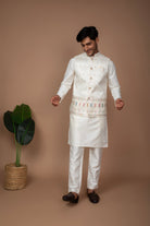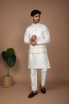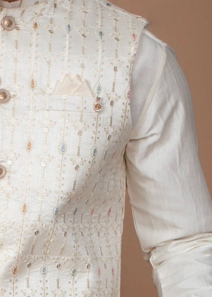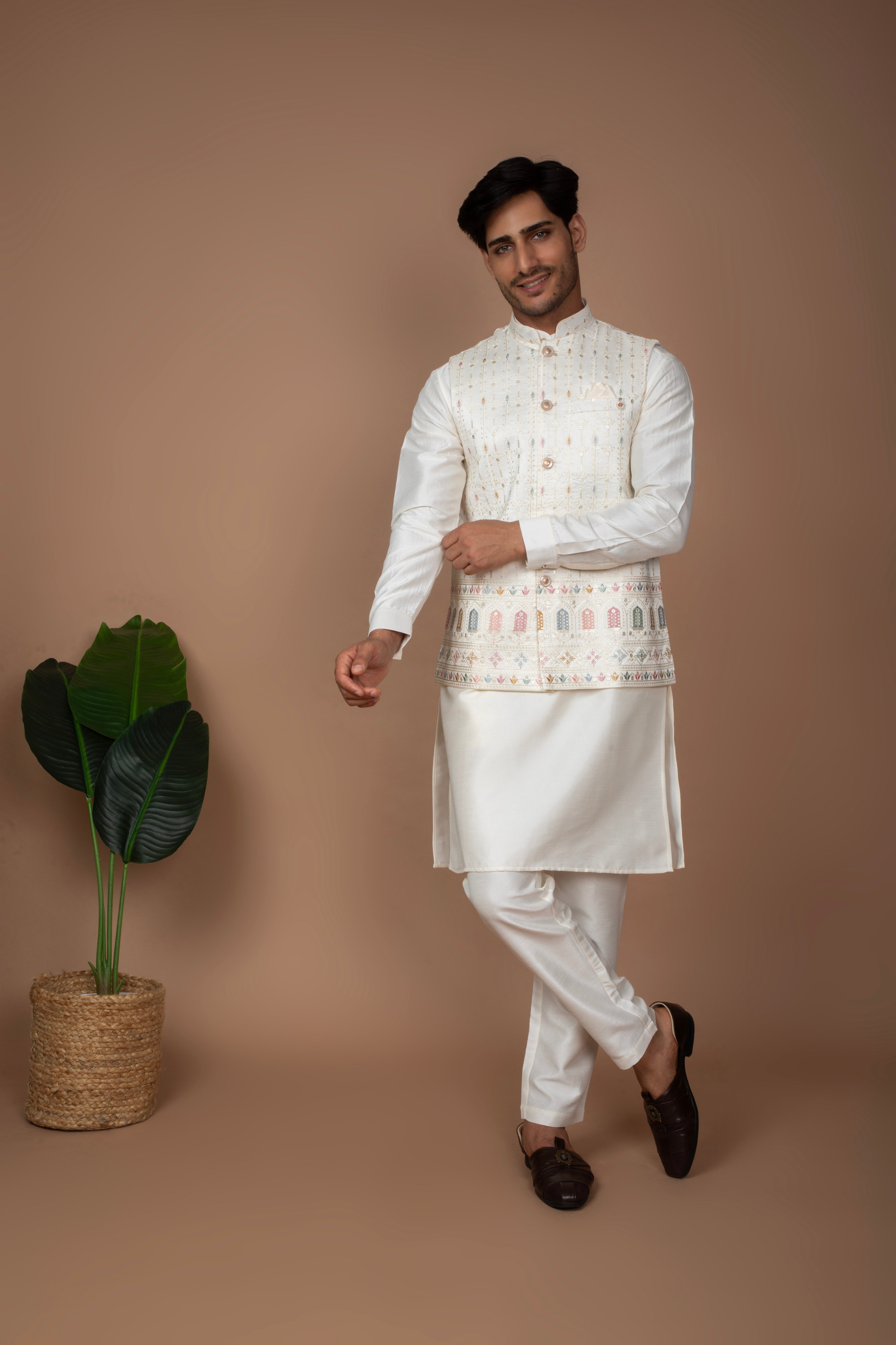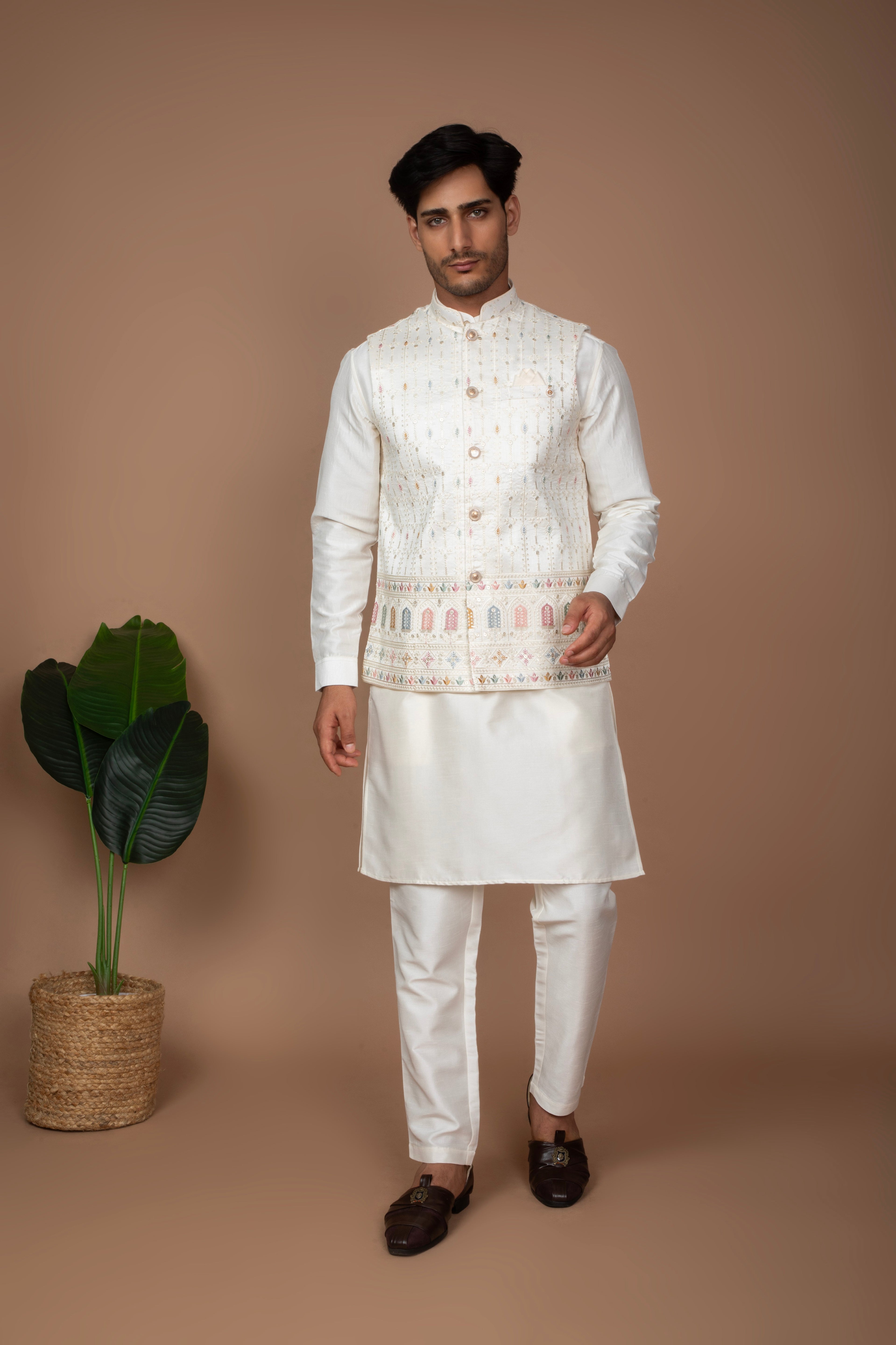 This premium kurta jacket set features a rich cream silk kurta paired with a beautifully embroidered Nehru jacket. The jacket showcases intricate multi-color thread embroidery, highlighted with detailed motifs near the front panel and hem, adding festive elegance without overwhelming the look. The luxurious silk base combined with the vibrant yet refined embroidery makes this outfit ideal for weddings, receptions, festive celebrations, and cultural occasions where sophistication is key.