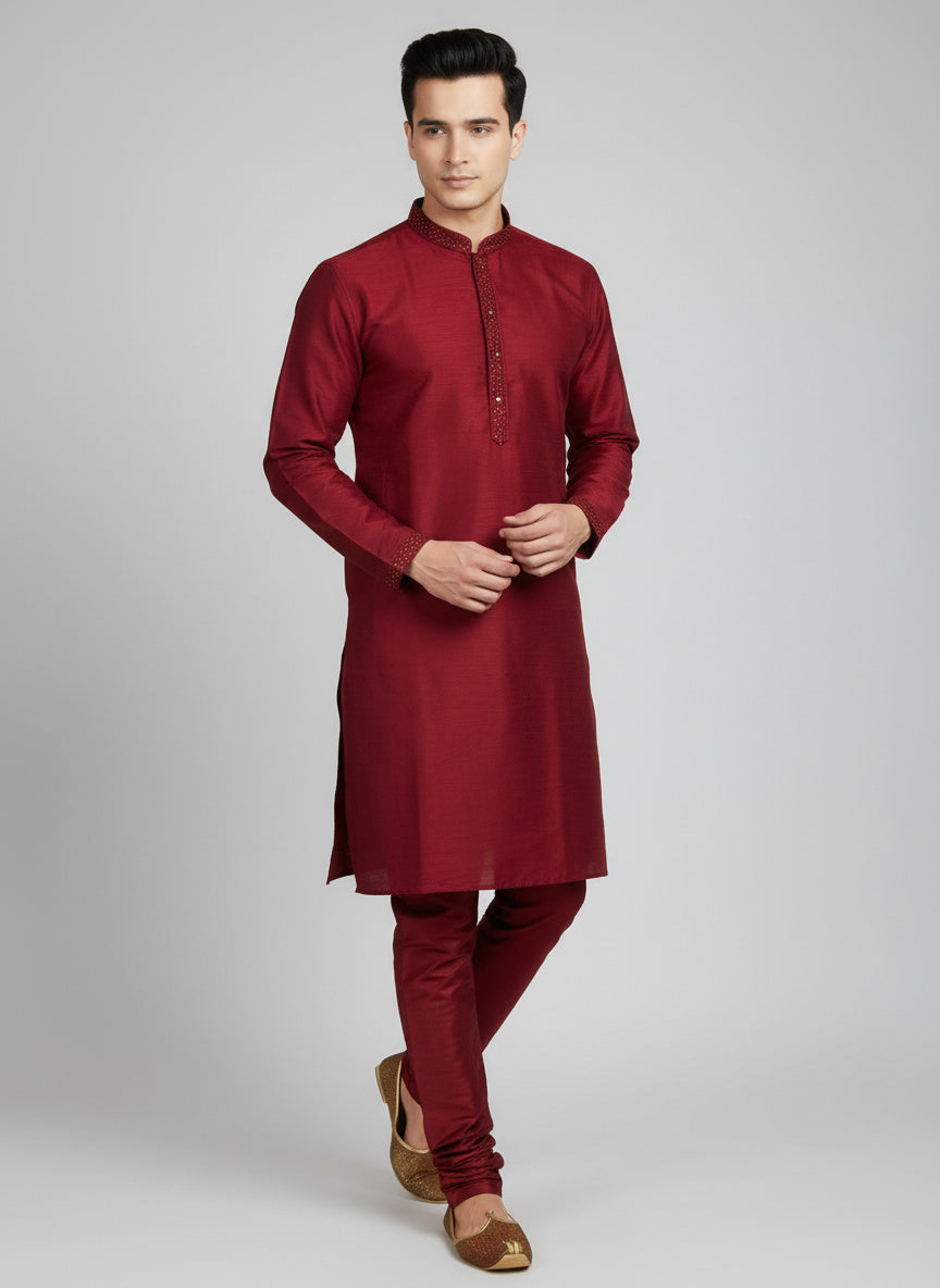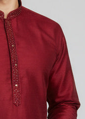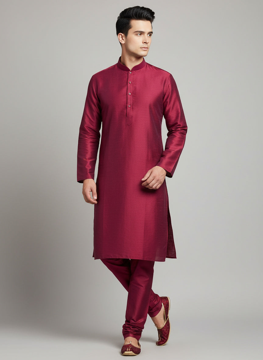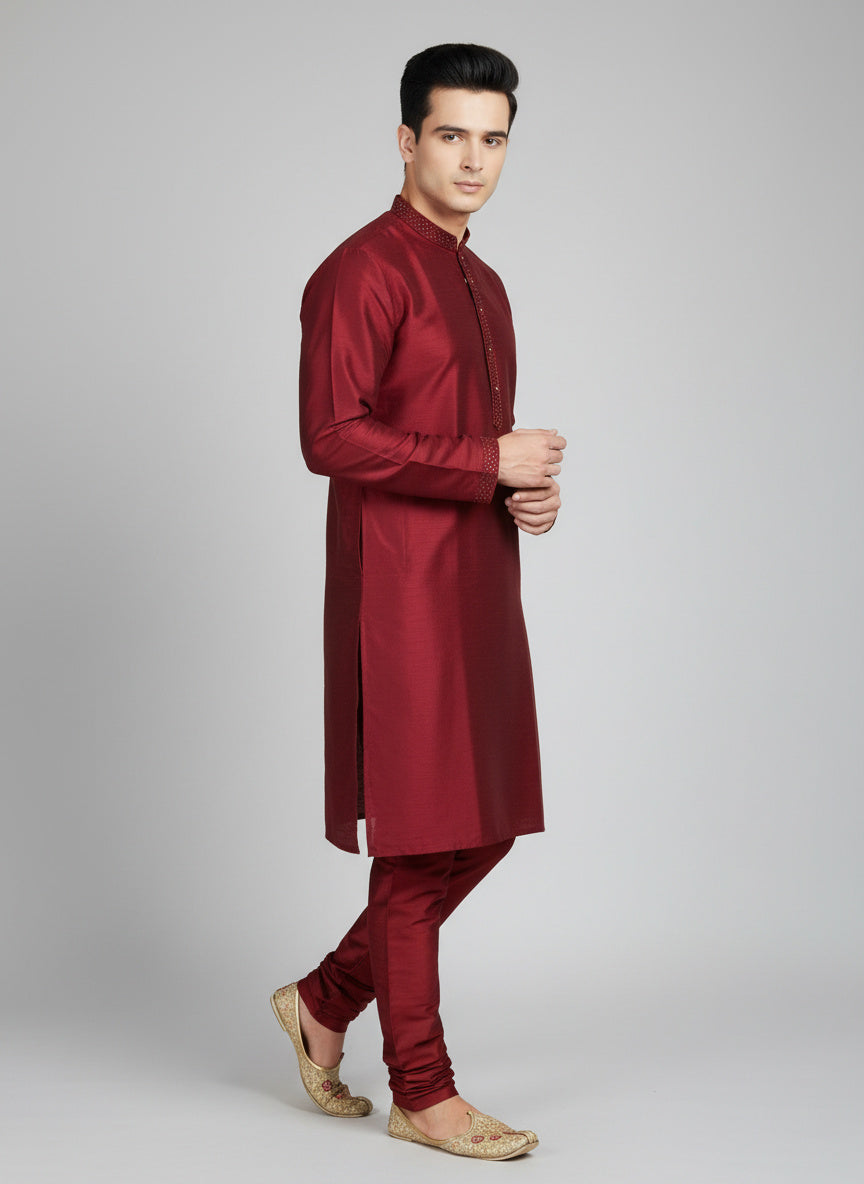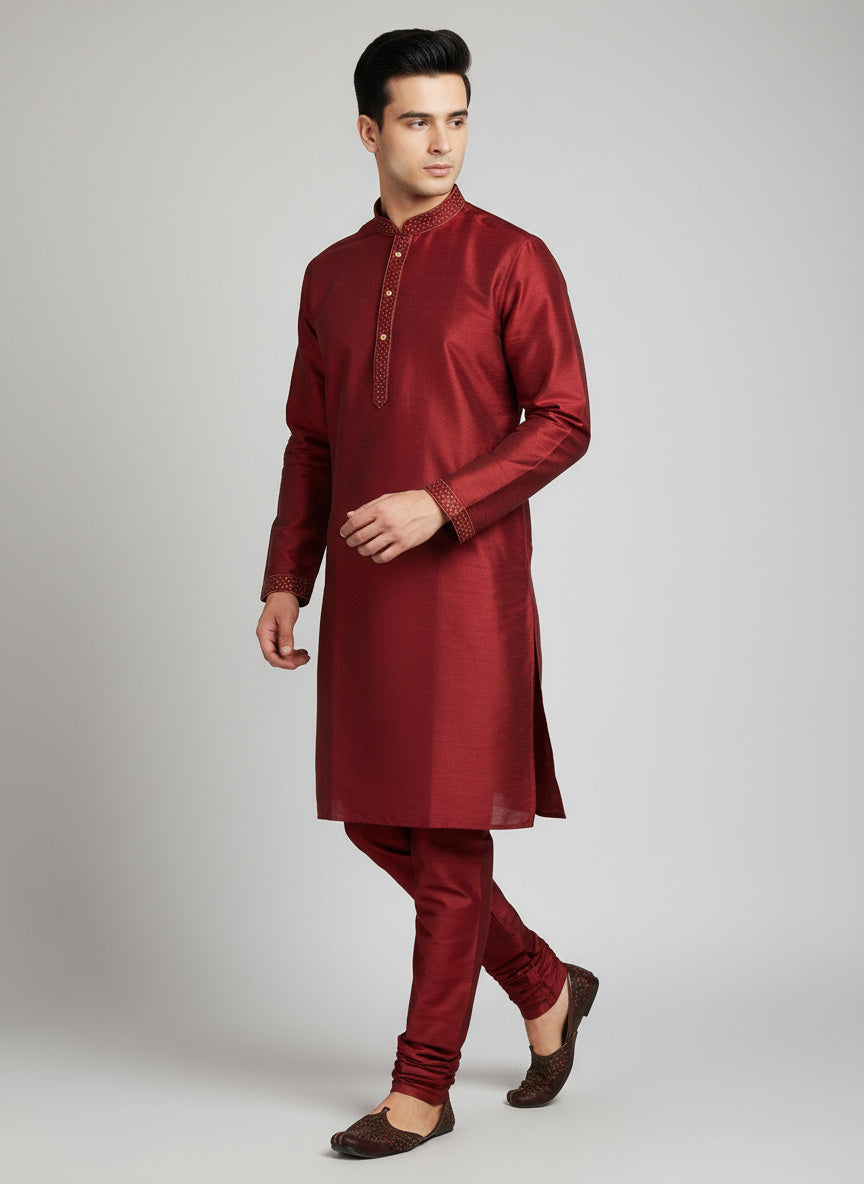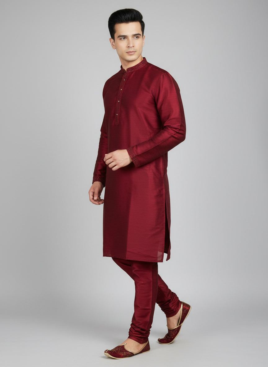 Maroon Cotton-Silk Kurta Set with Matching Color Pyjama Pant