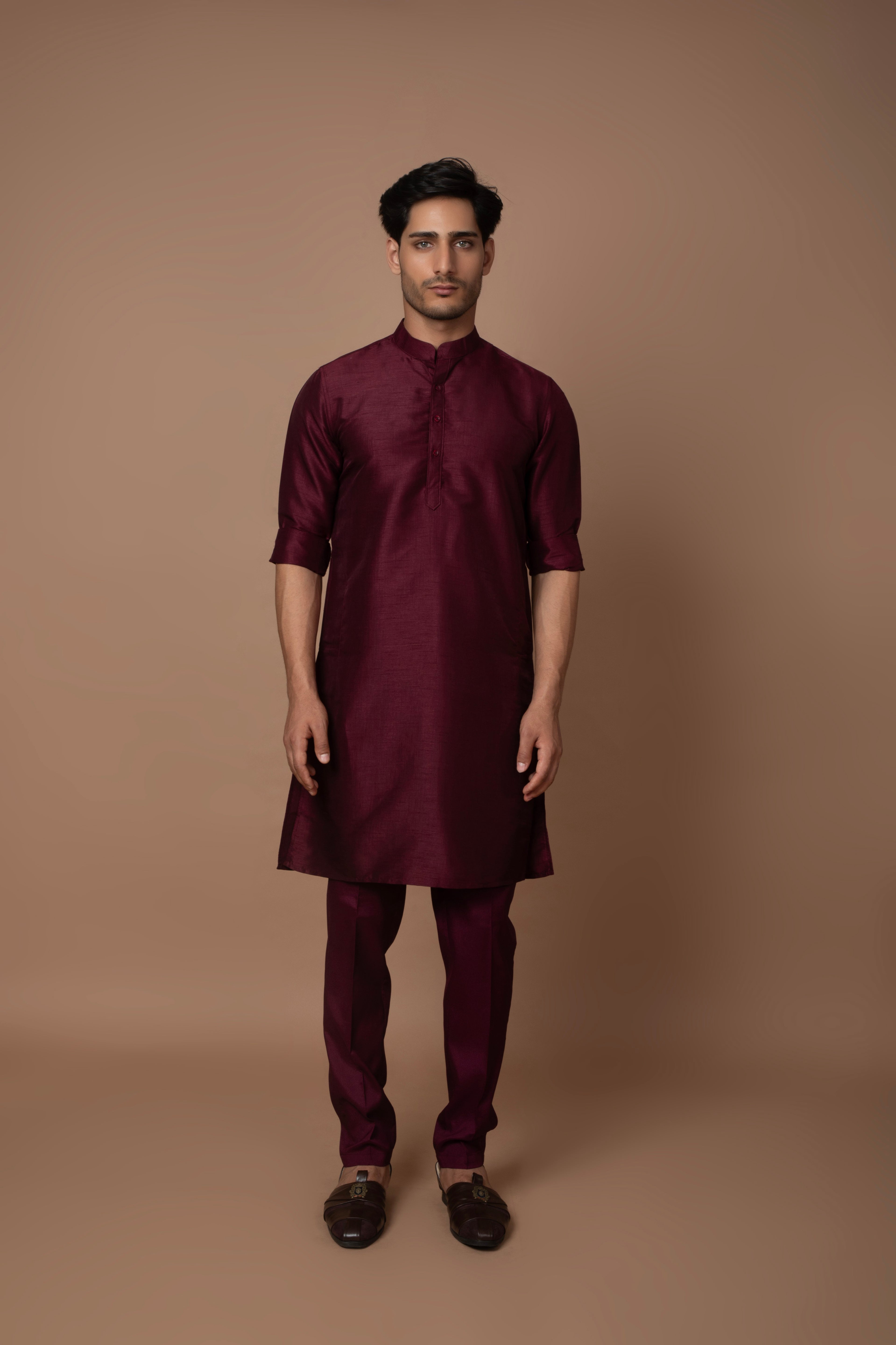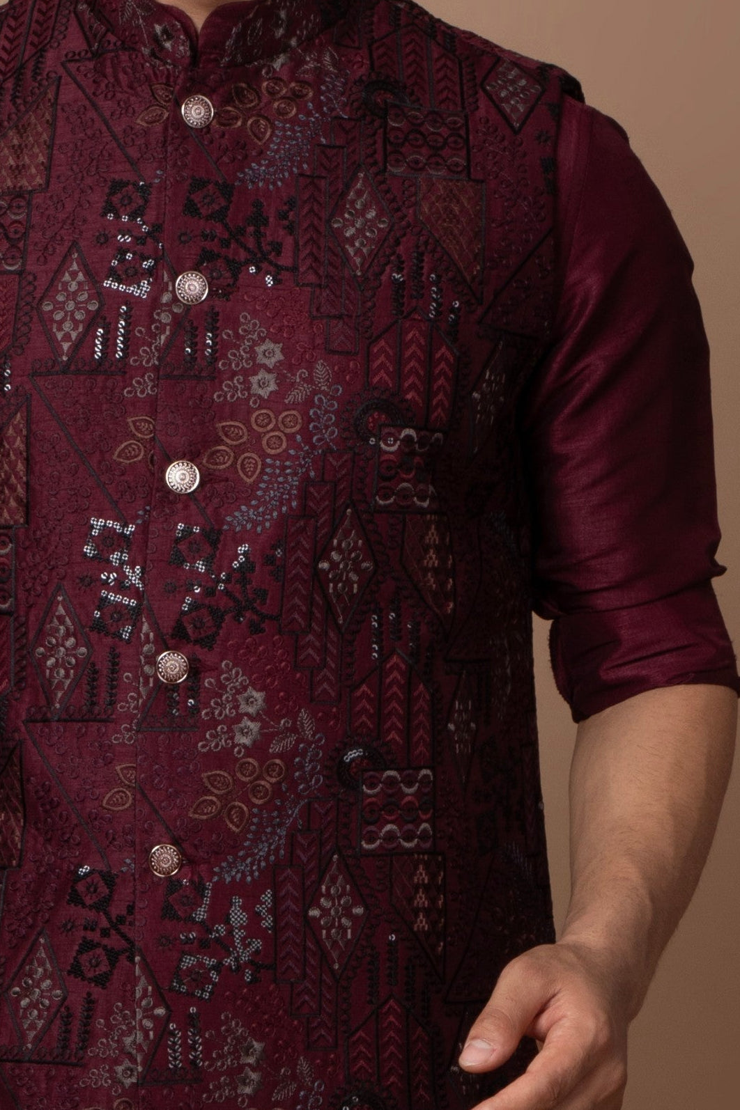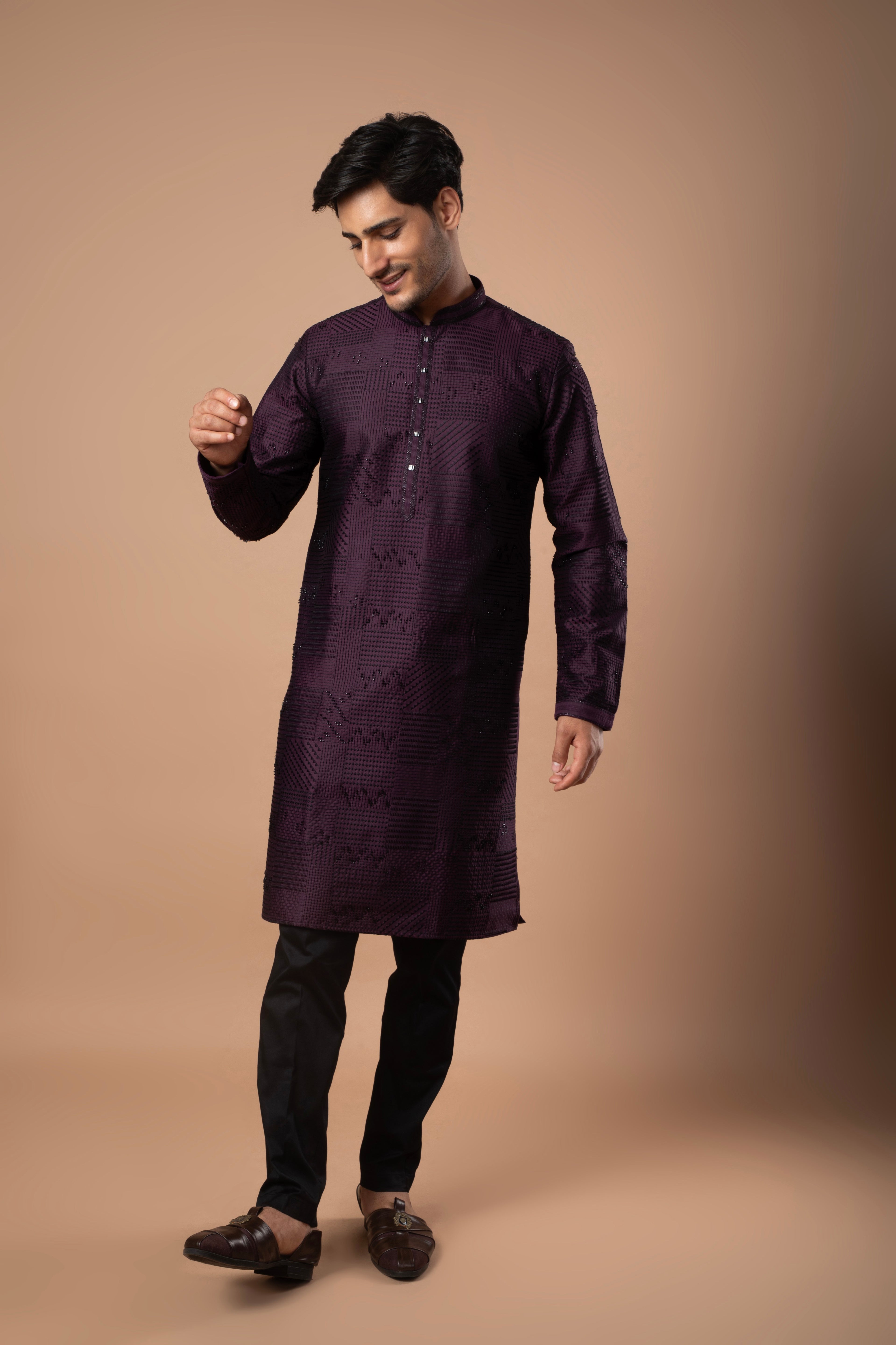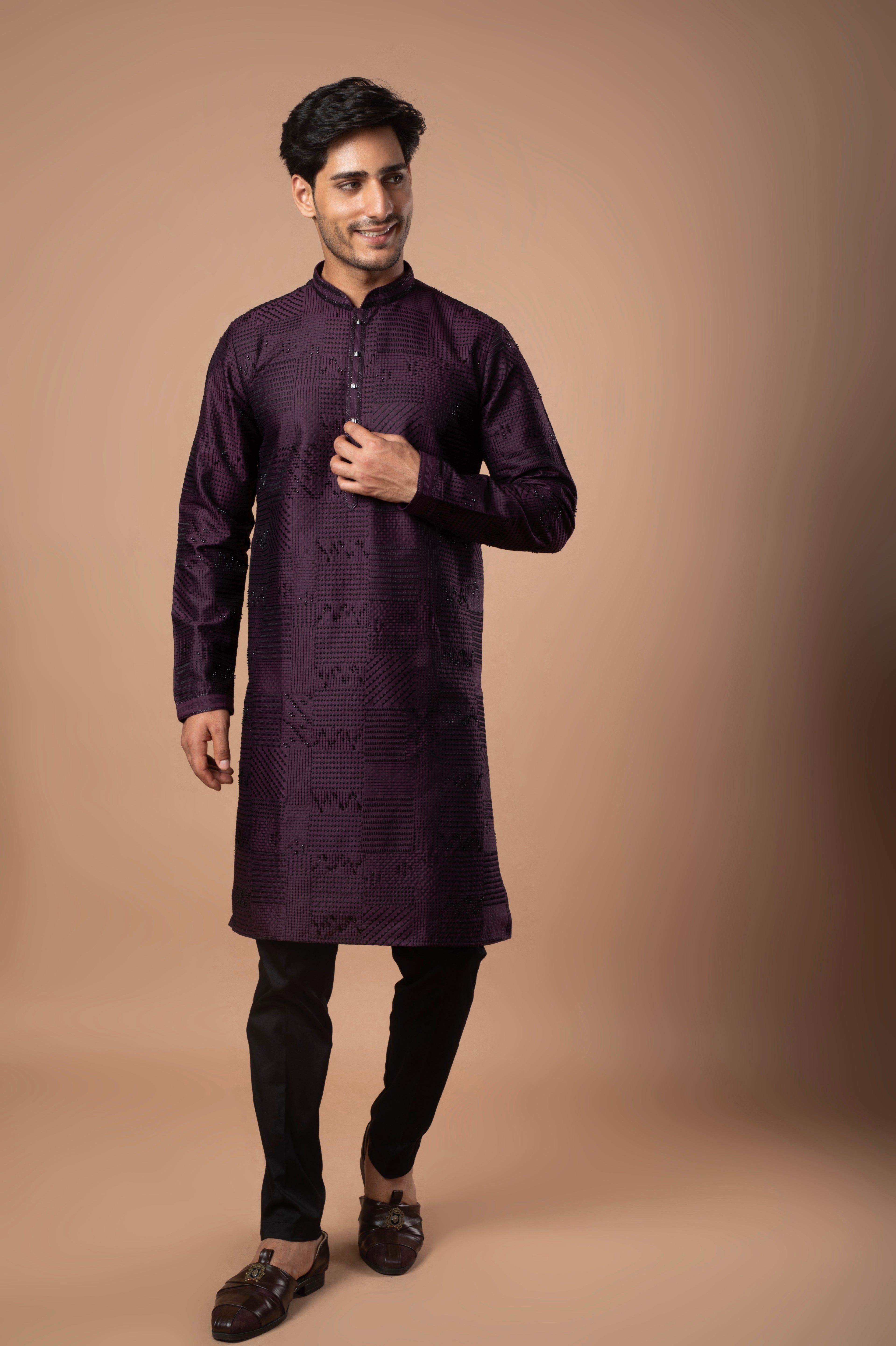 Wine Beaded & Threaded Embroidered Silk Kurta