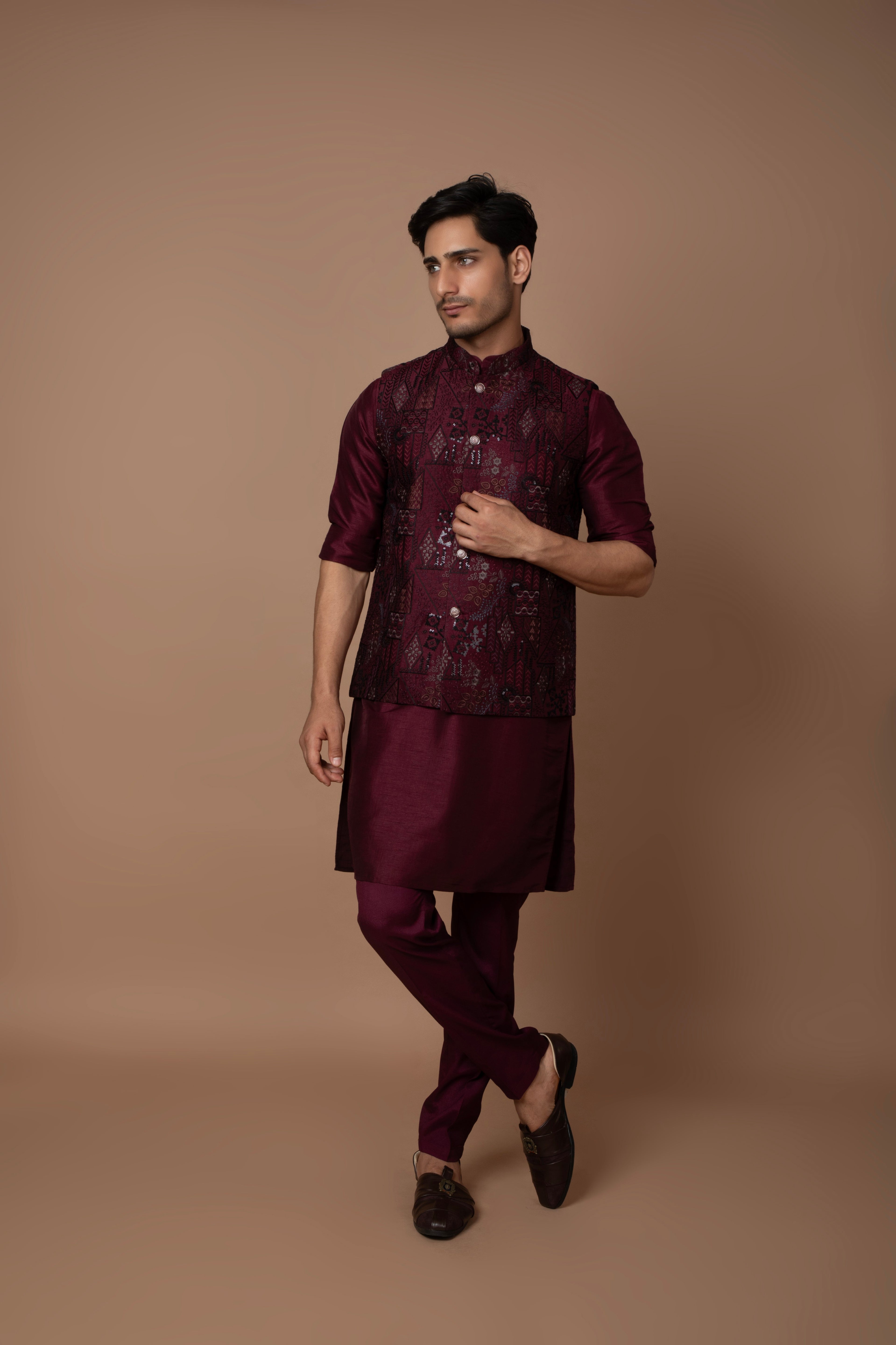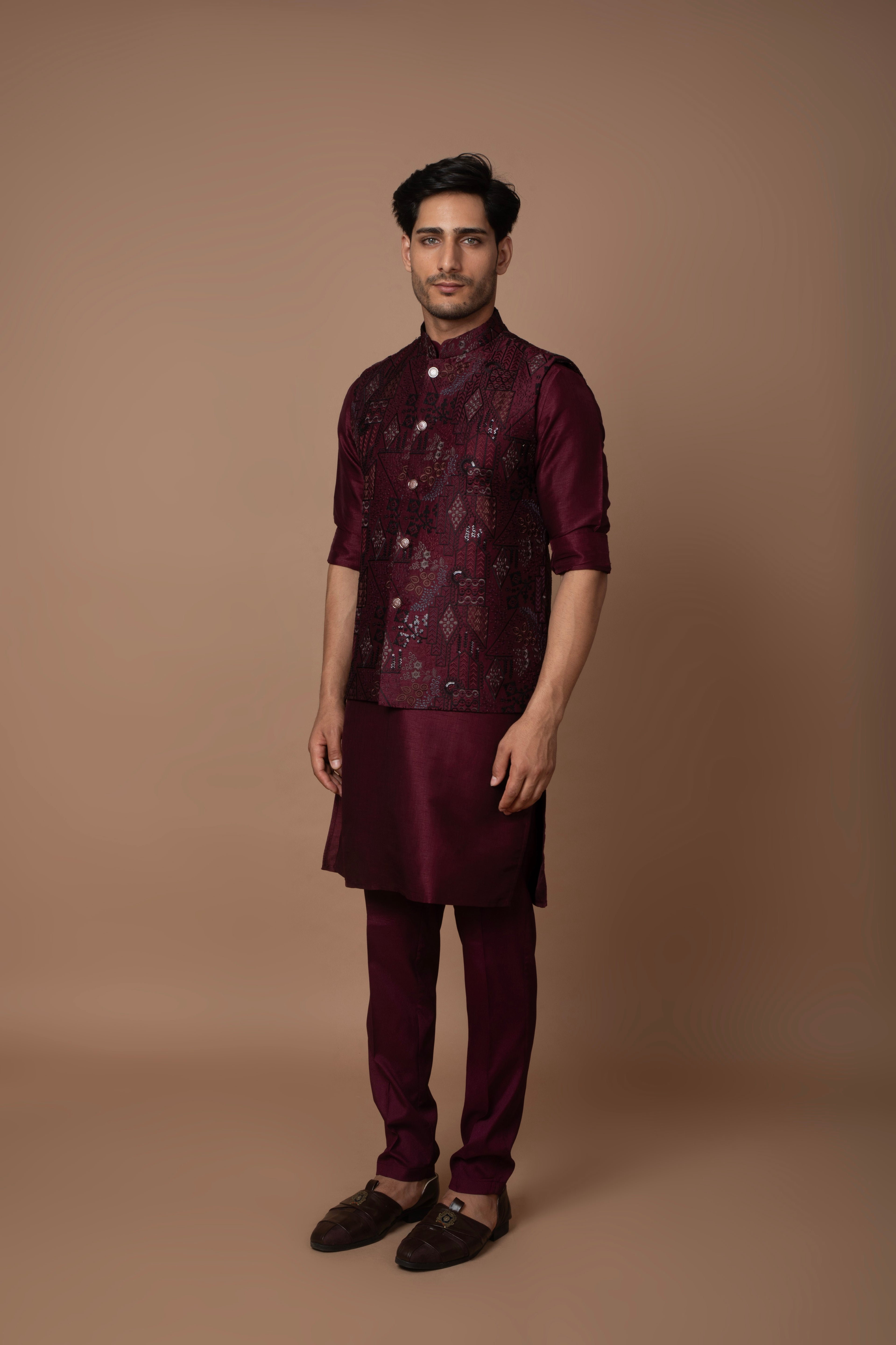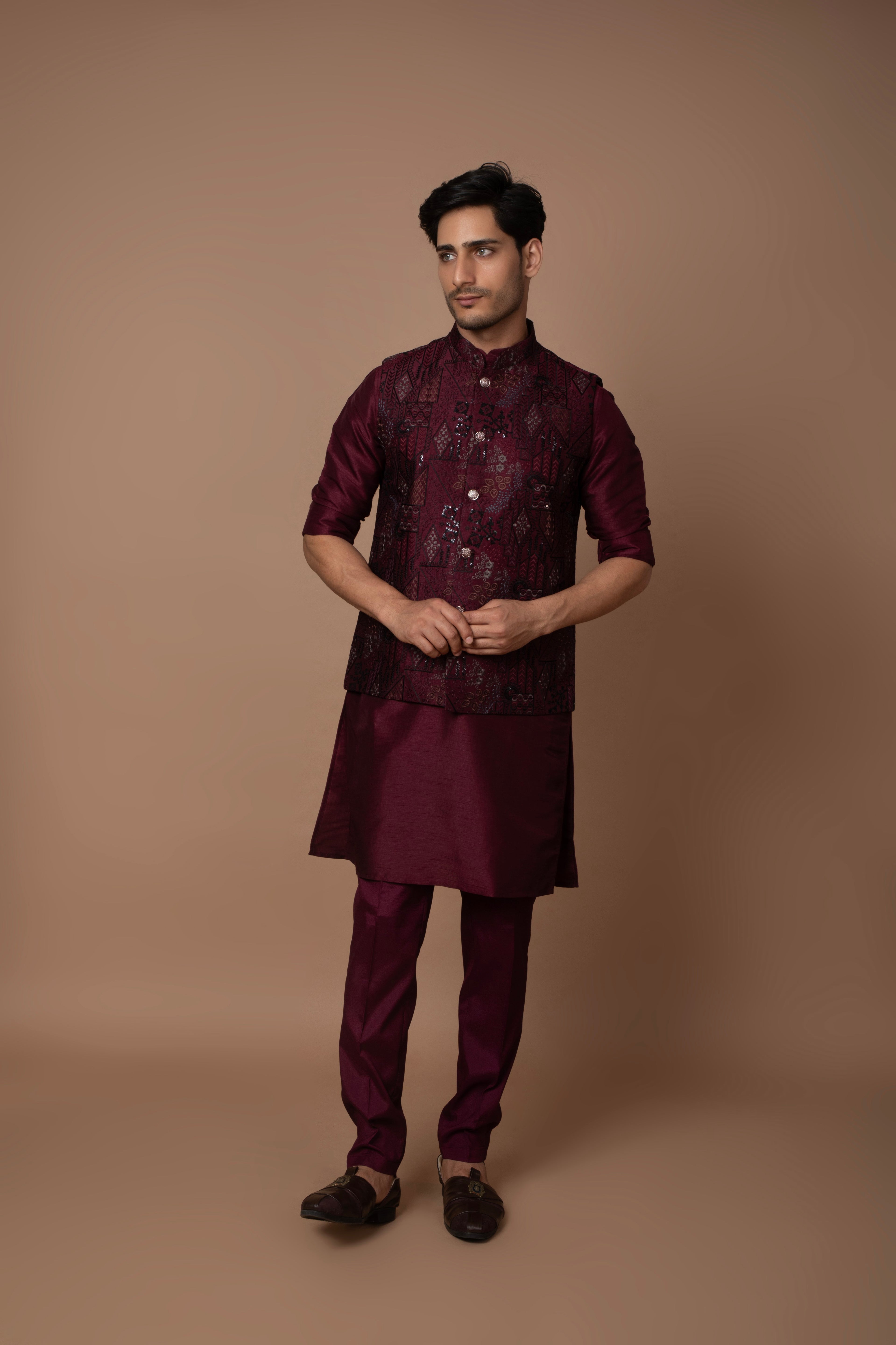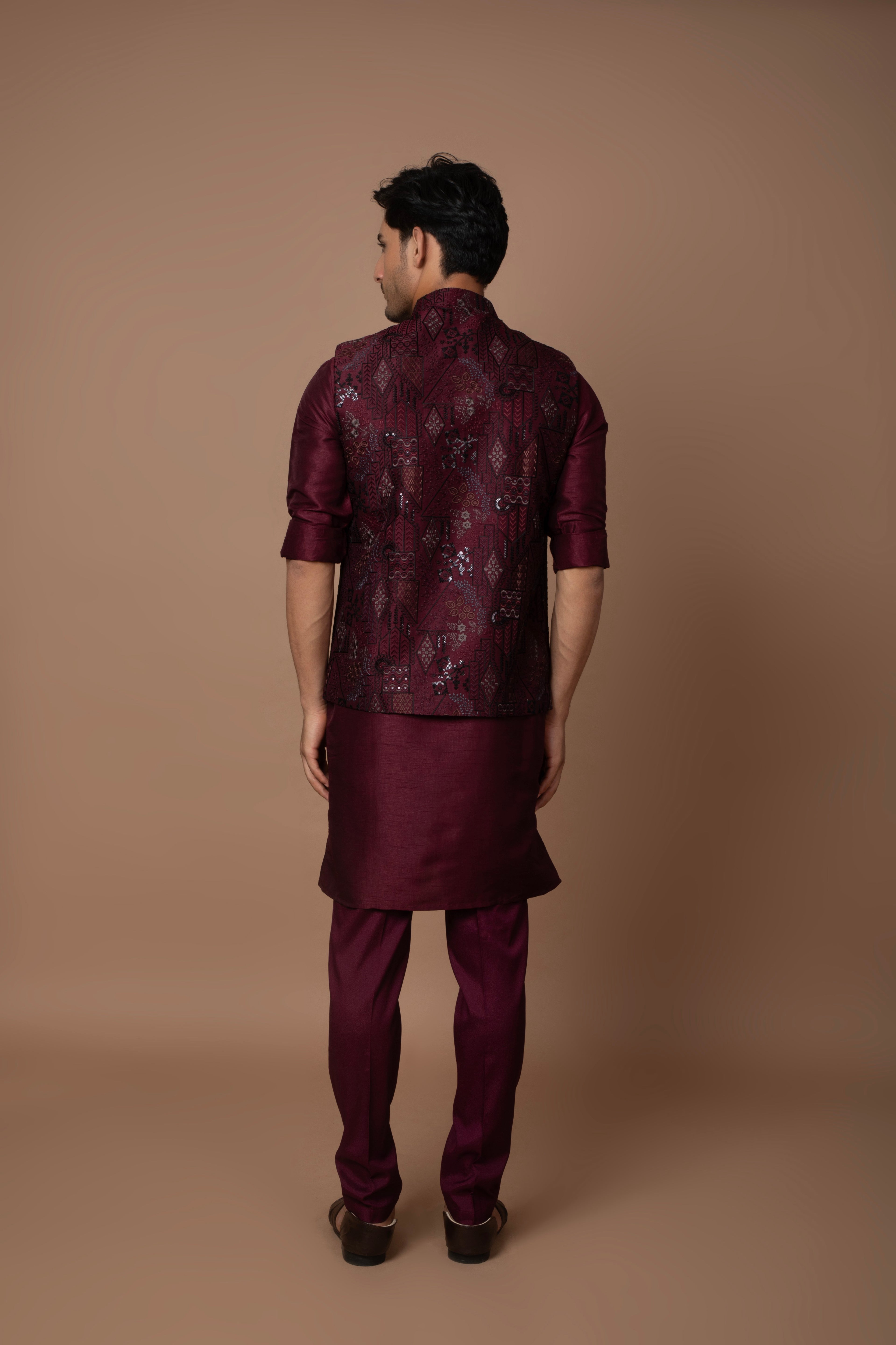 Wine Beaded & Threaded Embroidered Silk Kurta