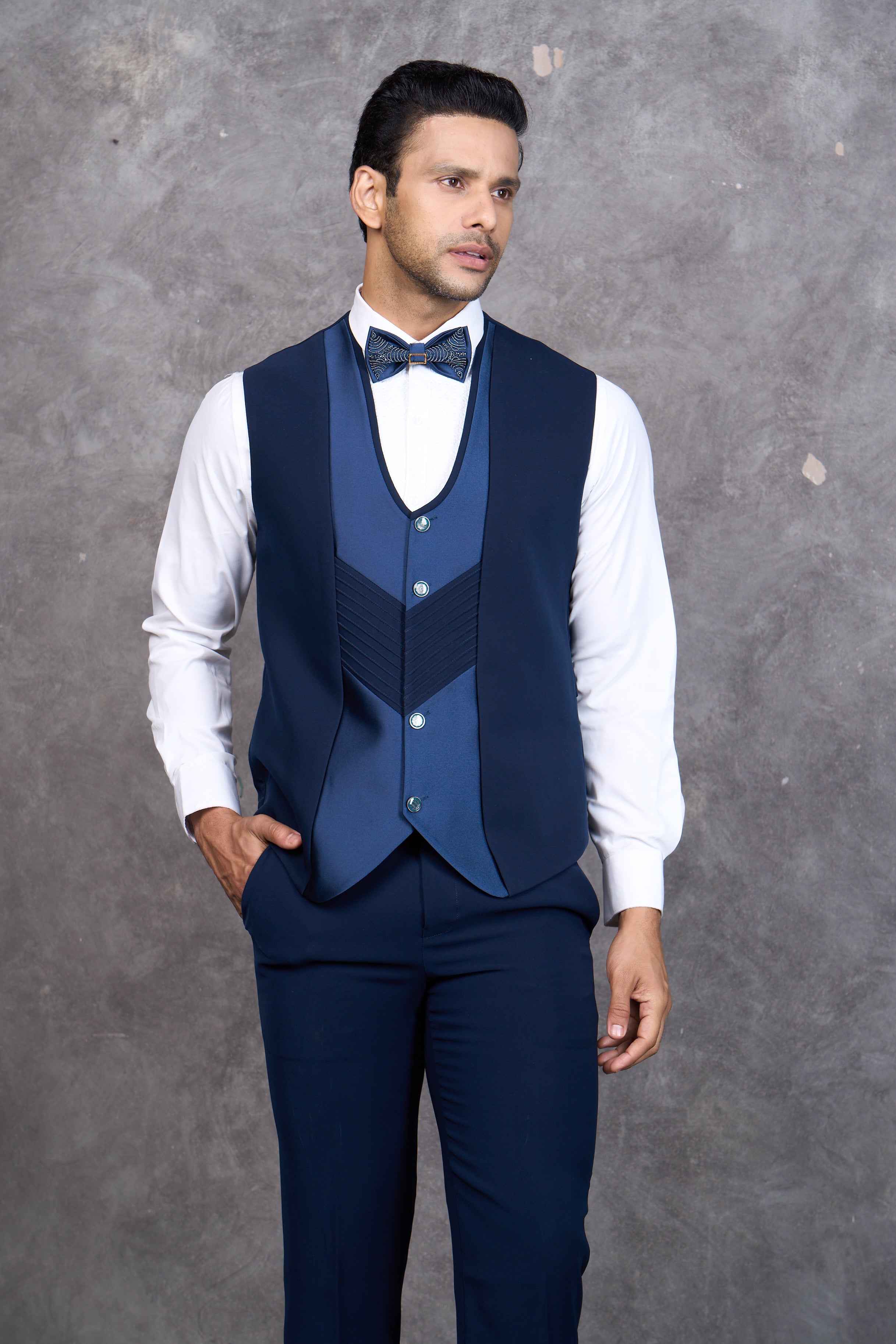 This Royal Blue Tuxedo is designed for grooms and formal occasions where refined style matters. The rich royal blue fabric features intricate floral embroidery that works beautifully for weddings, celebrations, and upscale events. The tailored fit provides comfort and a sharp silhouette throughout the day, while the detailed embellishments showcase traditional craftsmanship with a contemporary edge. Premium construction ensures durability for repeated wear, making it a versatile choice for anyone seeking sophisticated formal attire that blends cultural elegance with modern aesthetics.