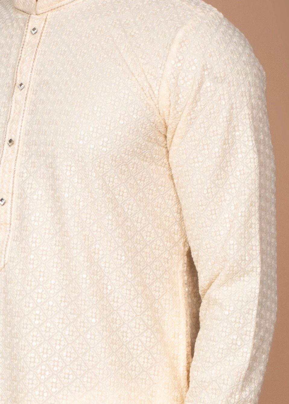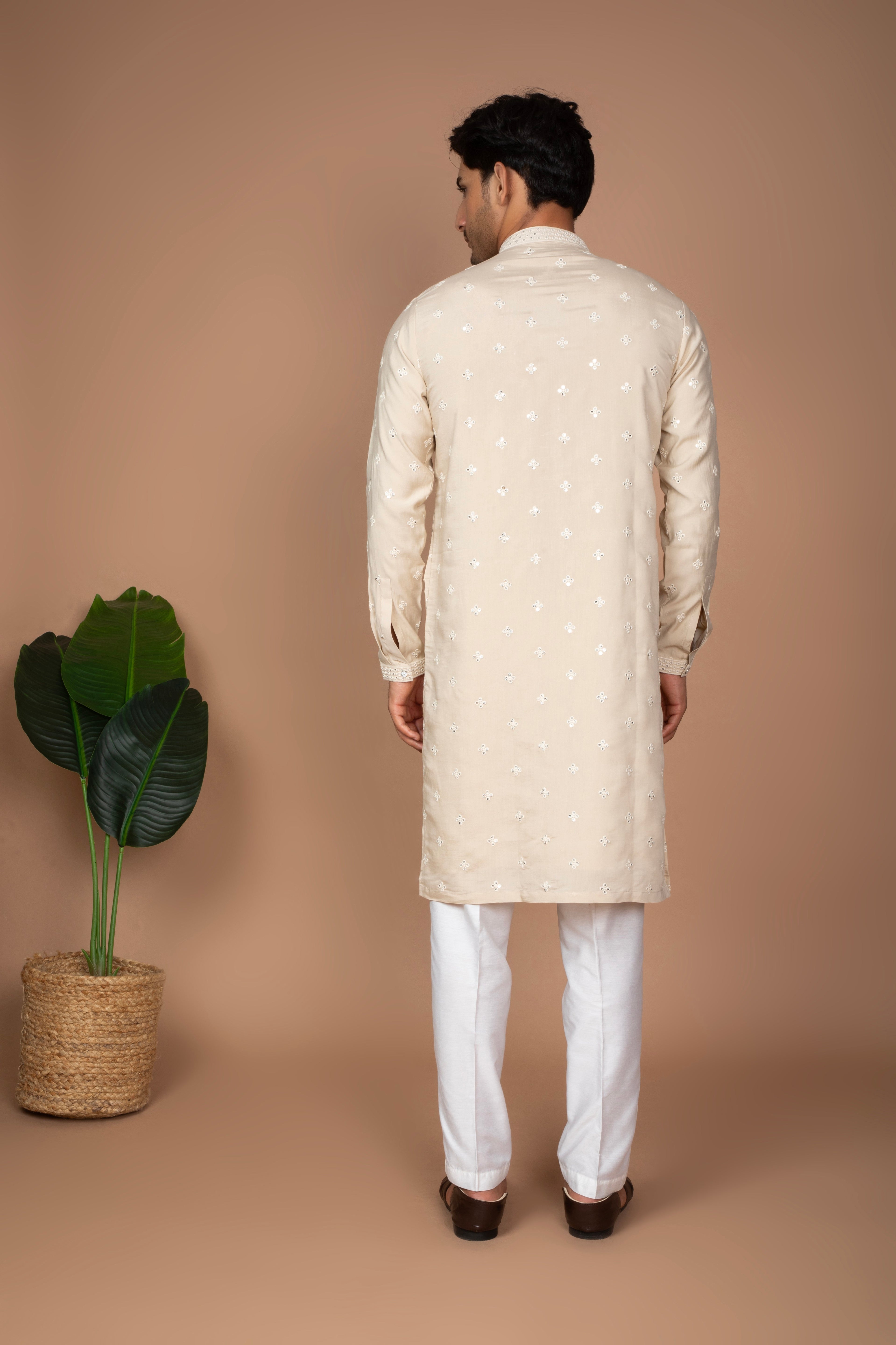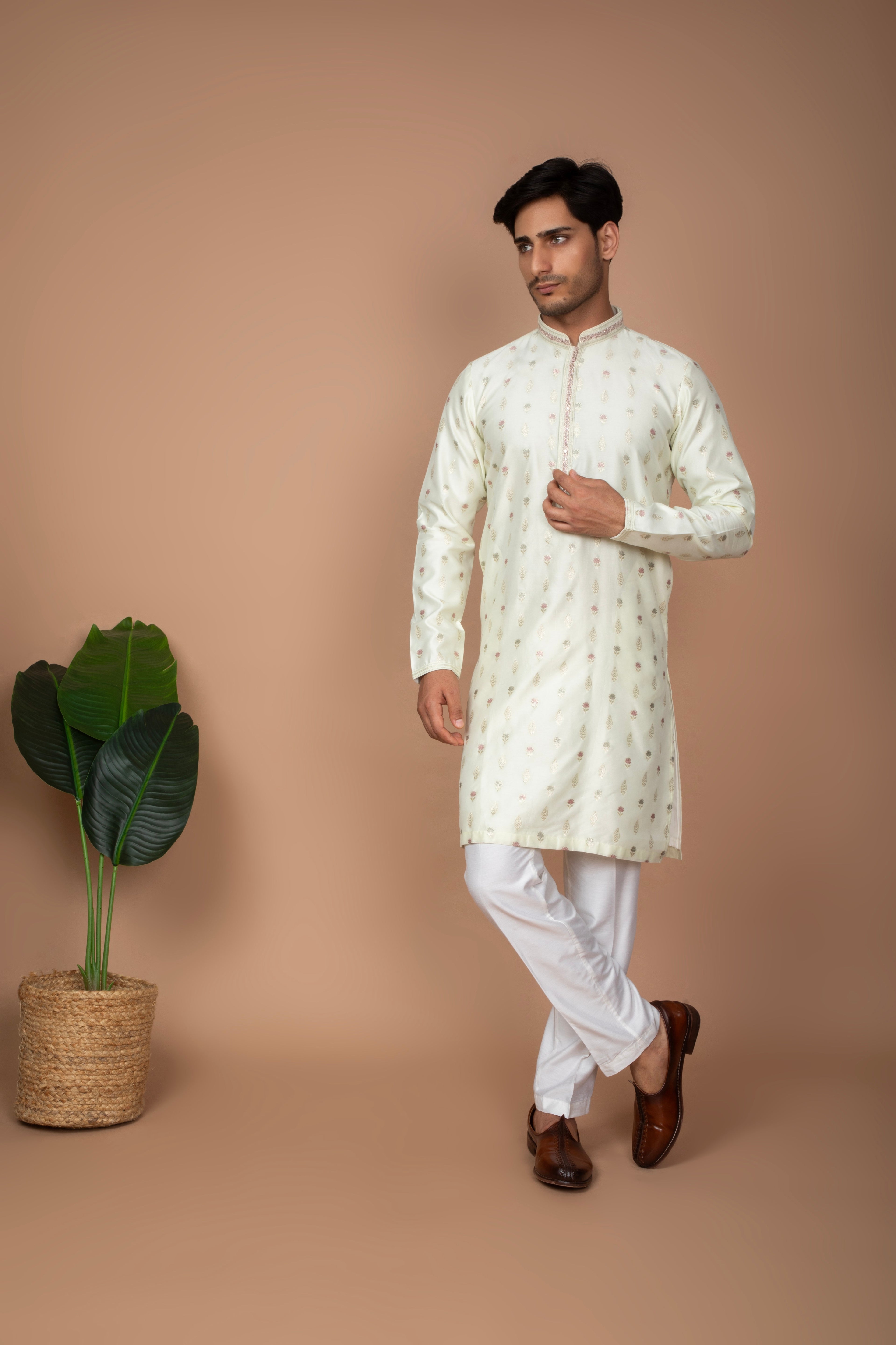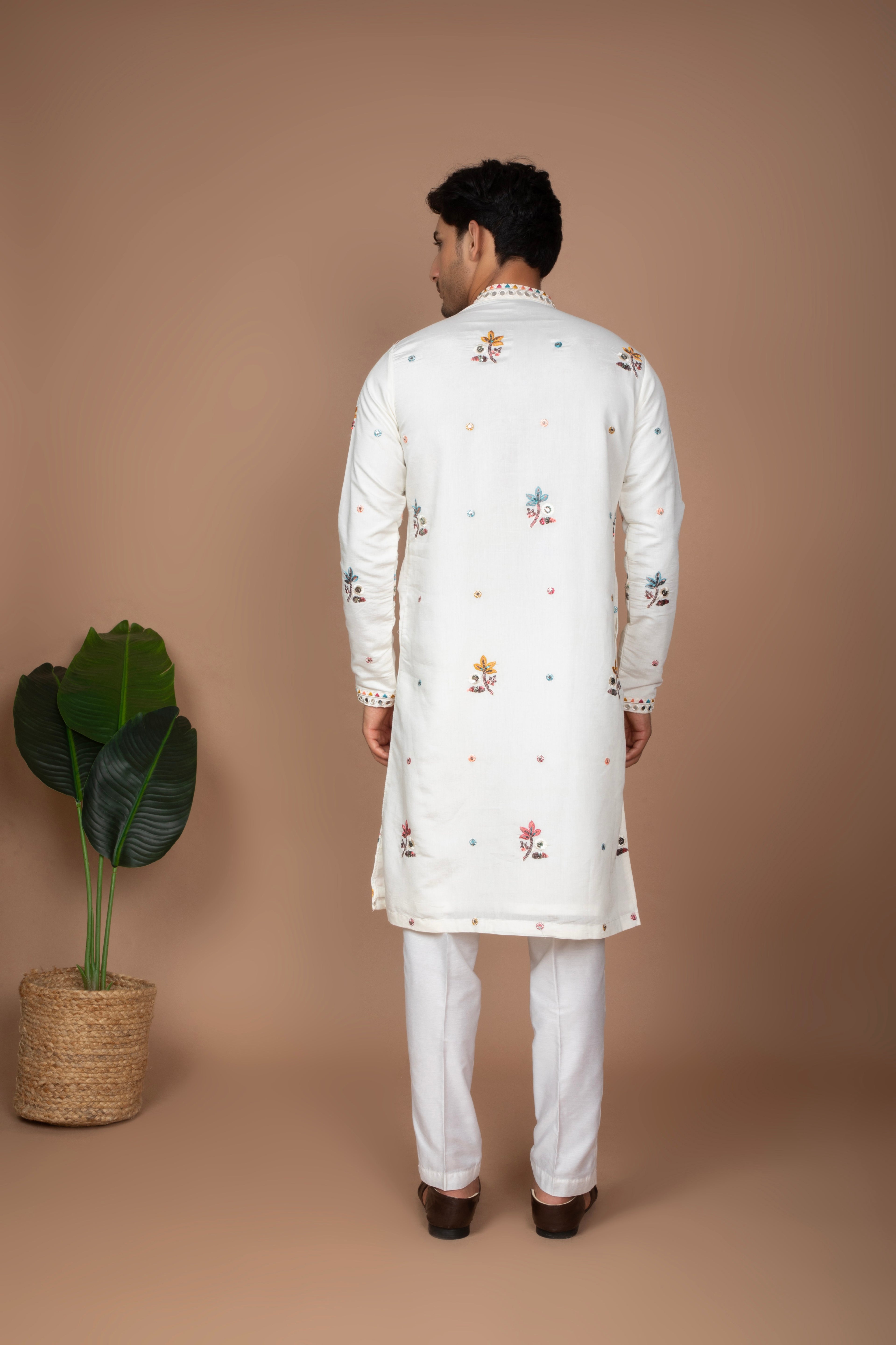 Off-White Silk Kurta with Lotus Butti Embroidery