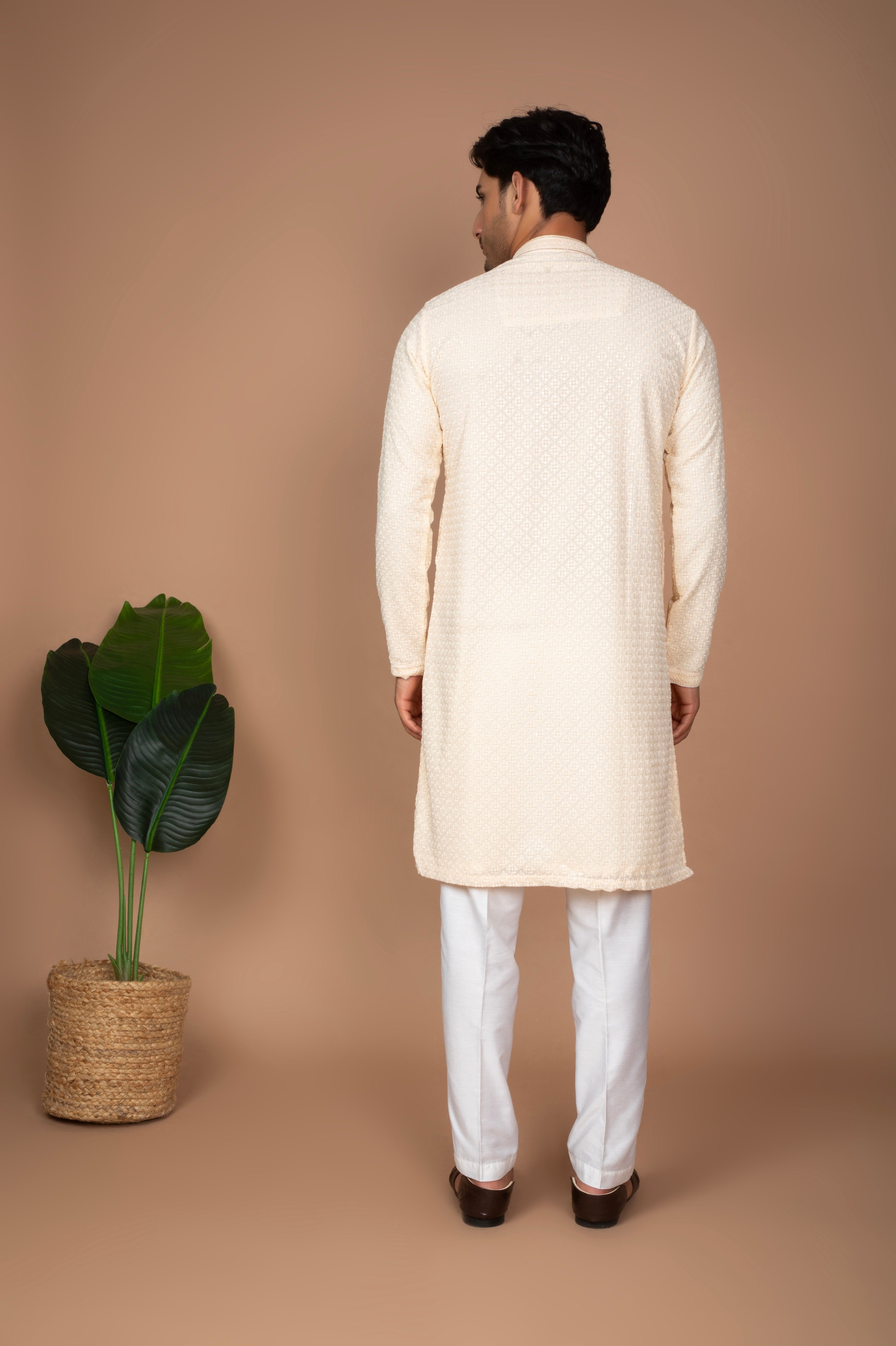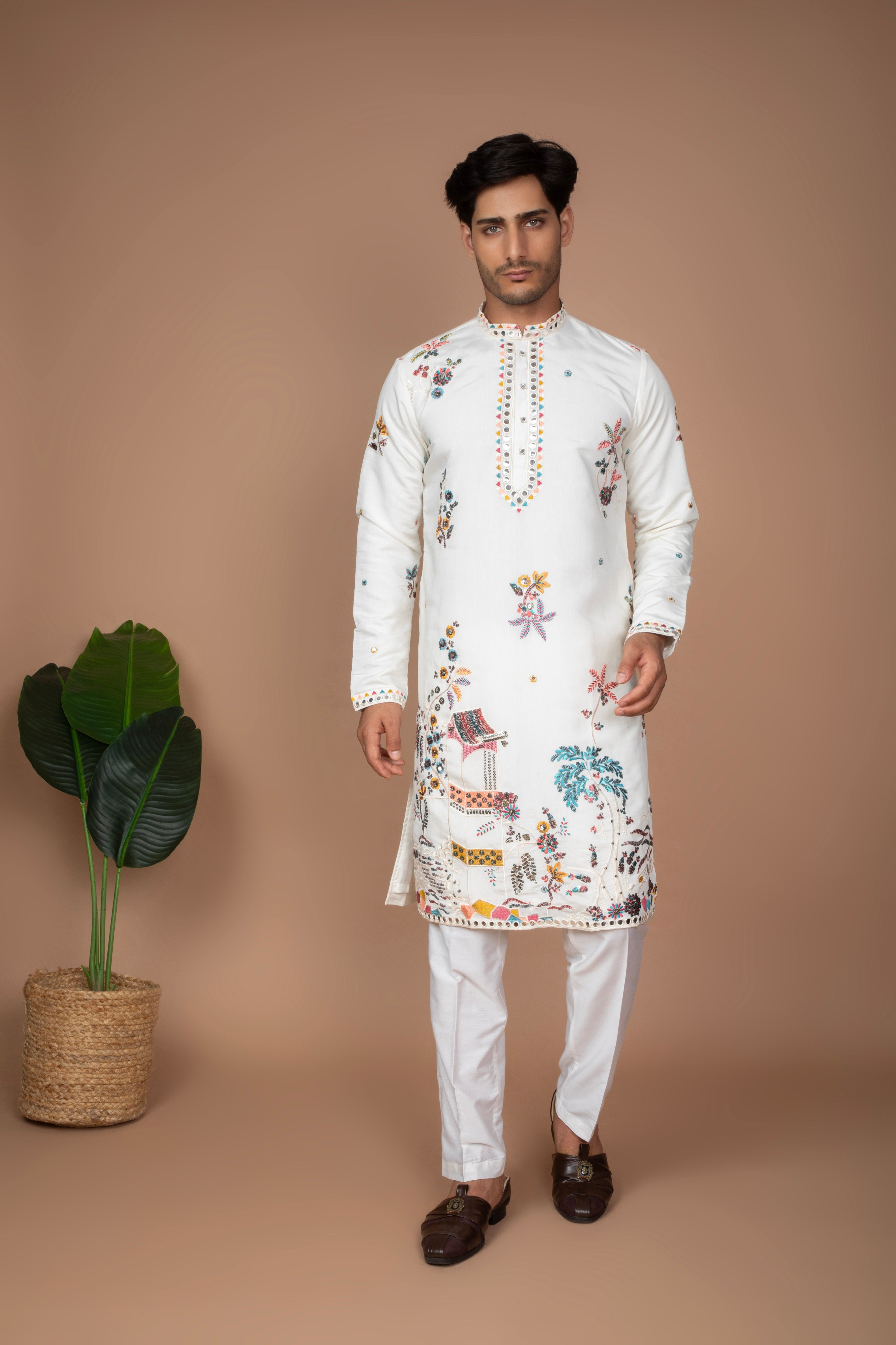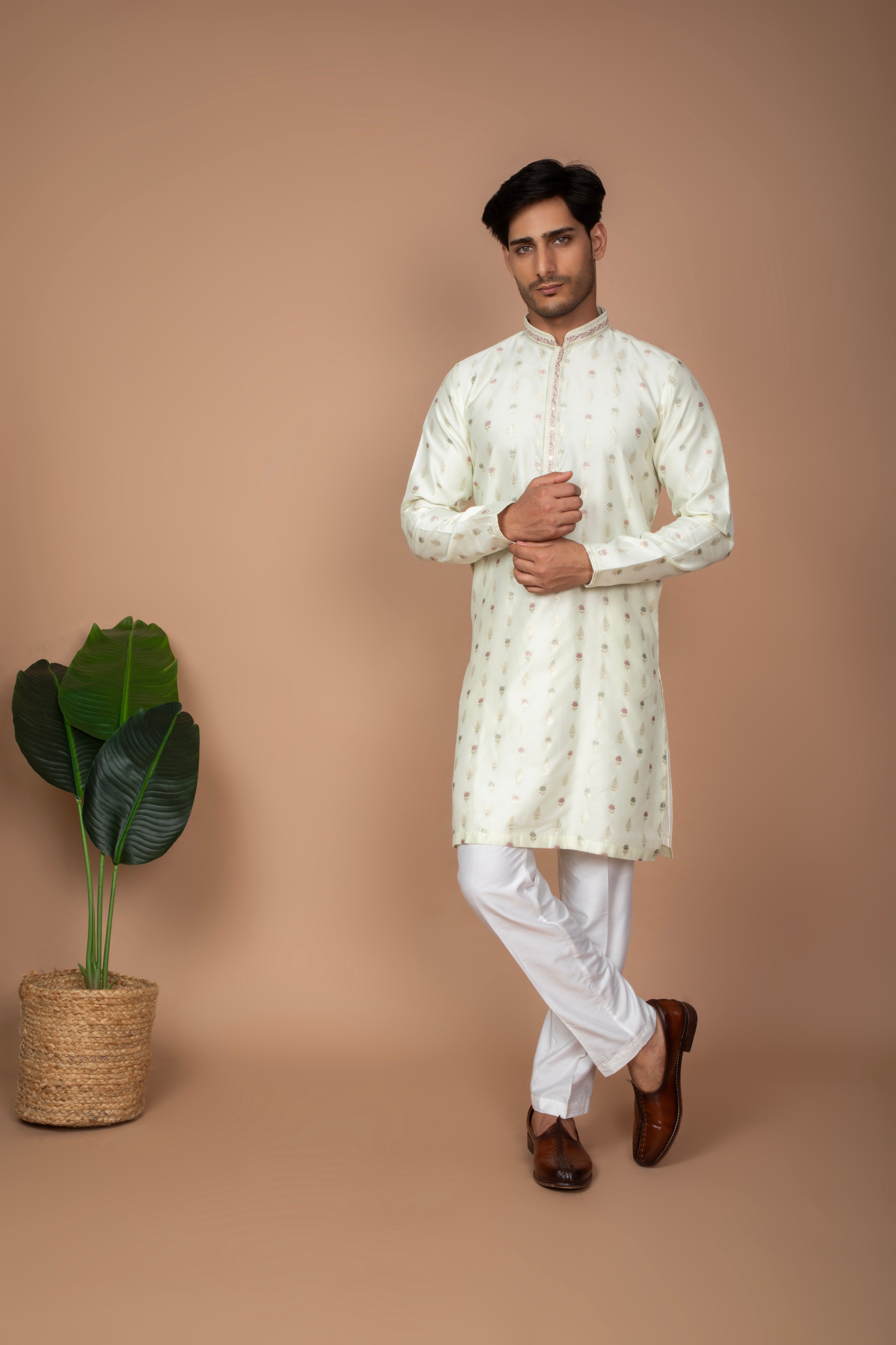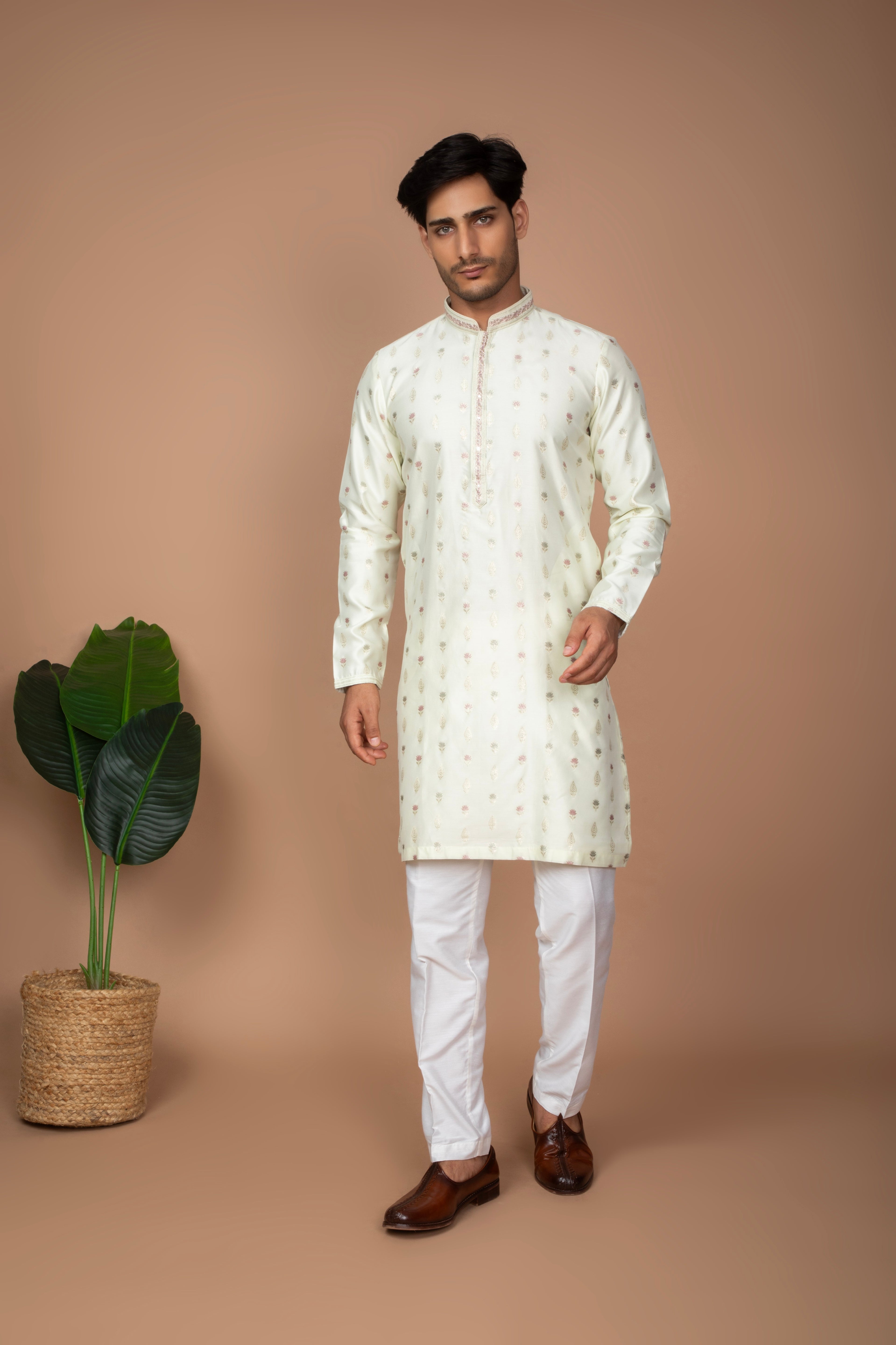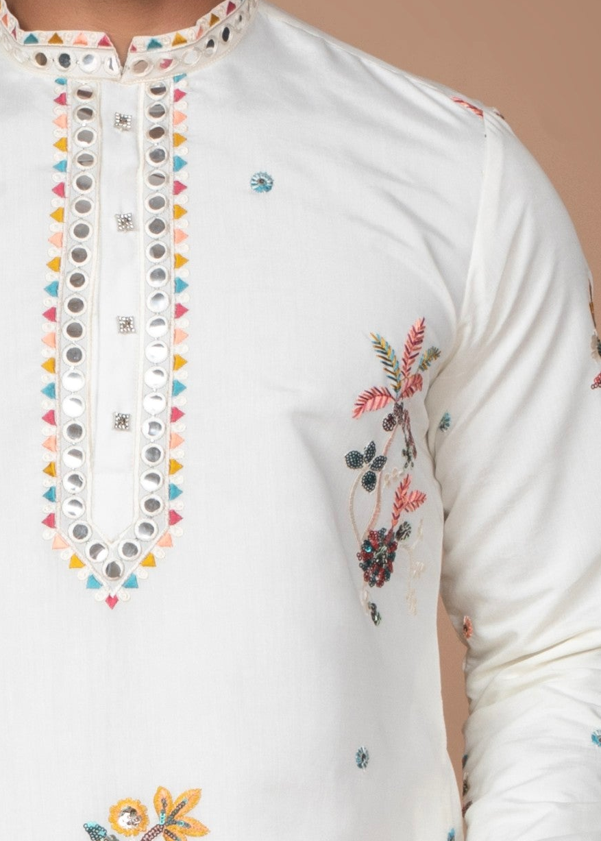 Off-White Silk Kurta with Lotus Butti Embroidery