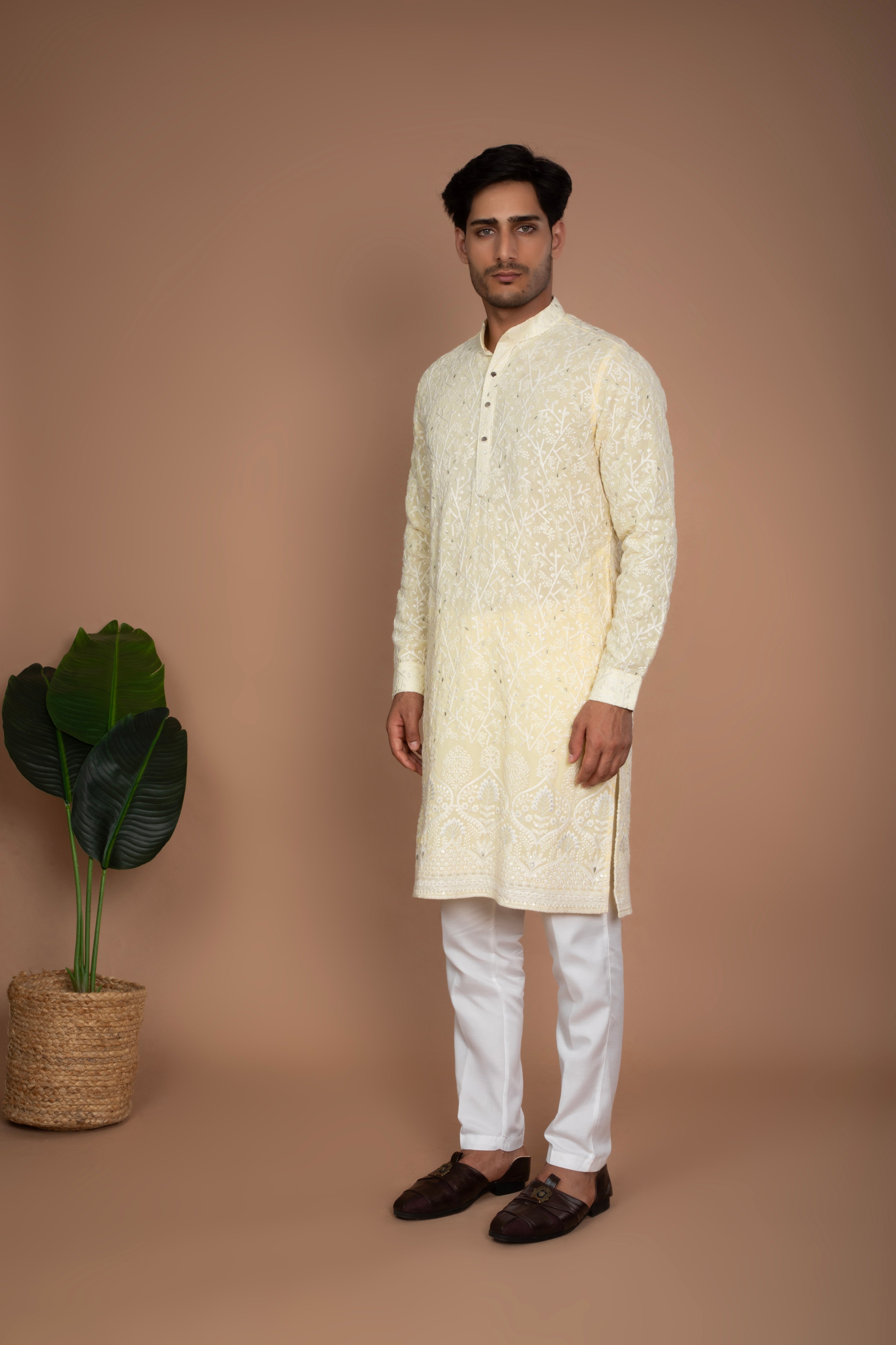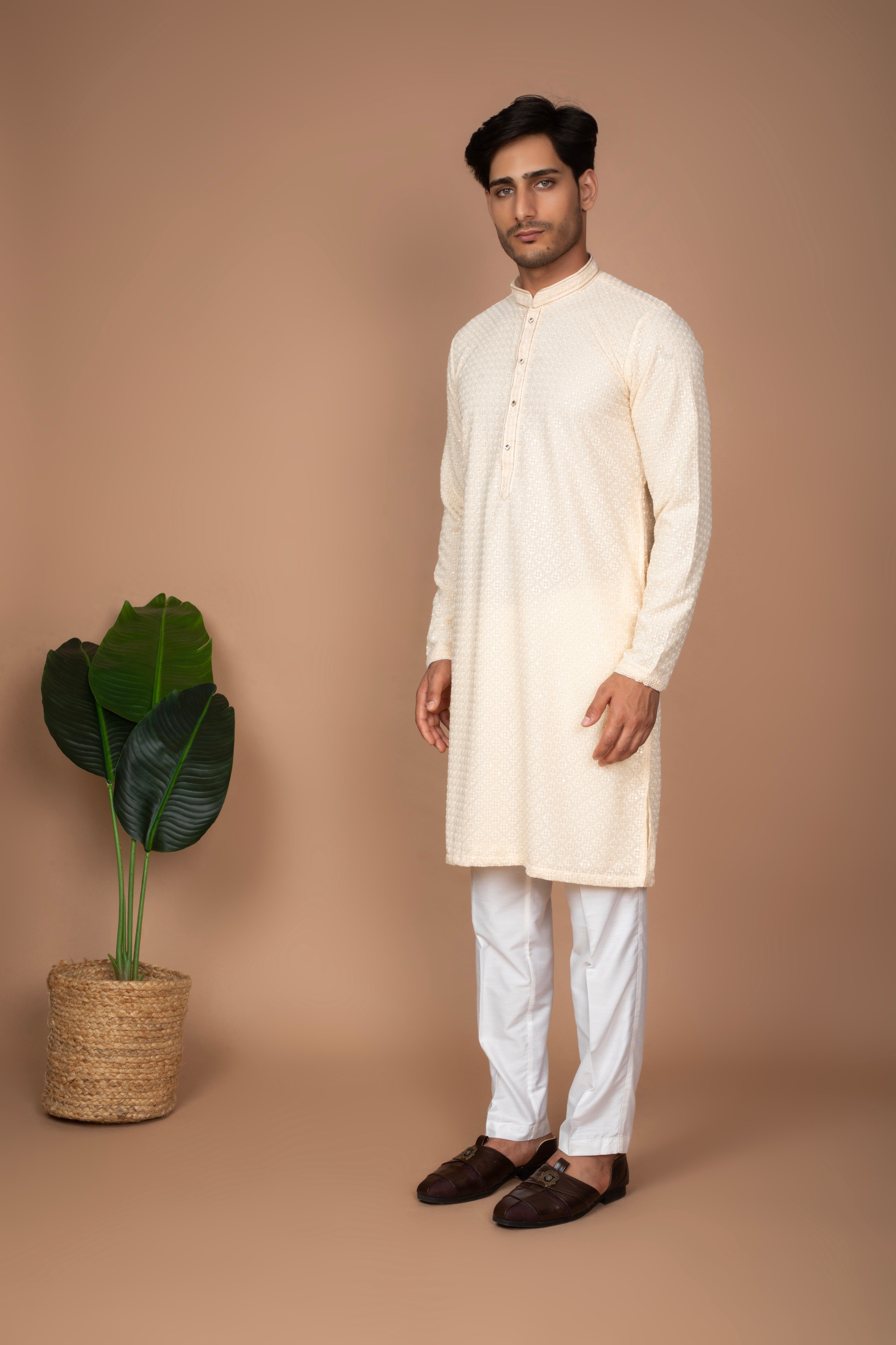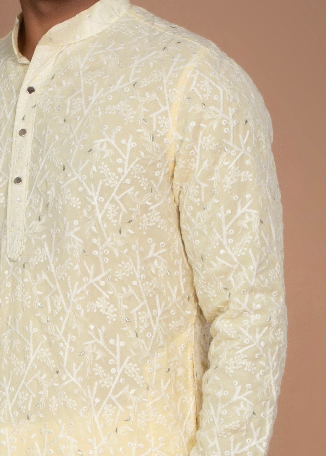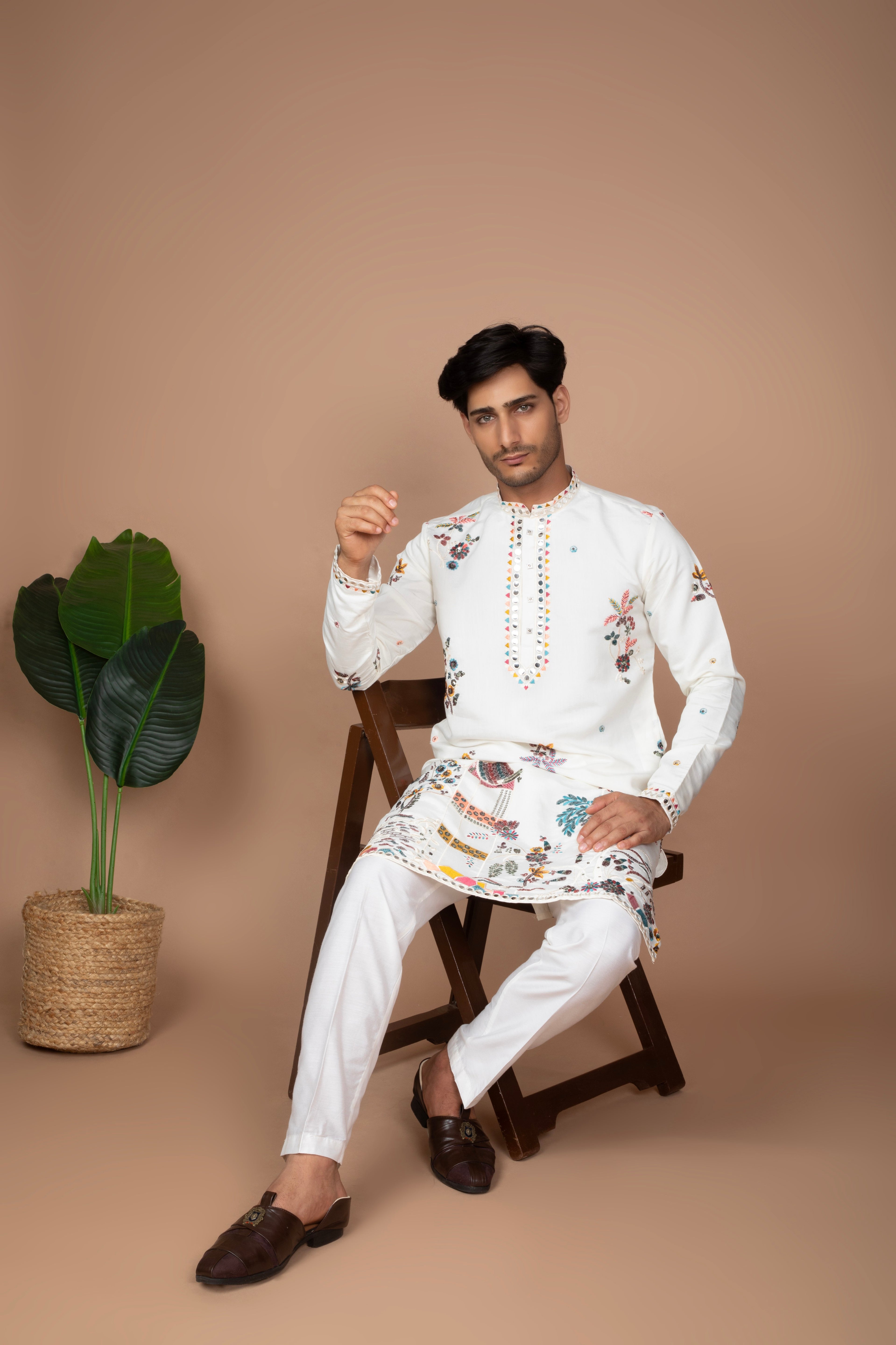 Off-White Silk Kurta with Lotus Butti Embroidery