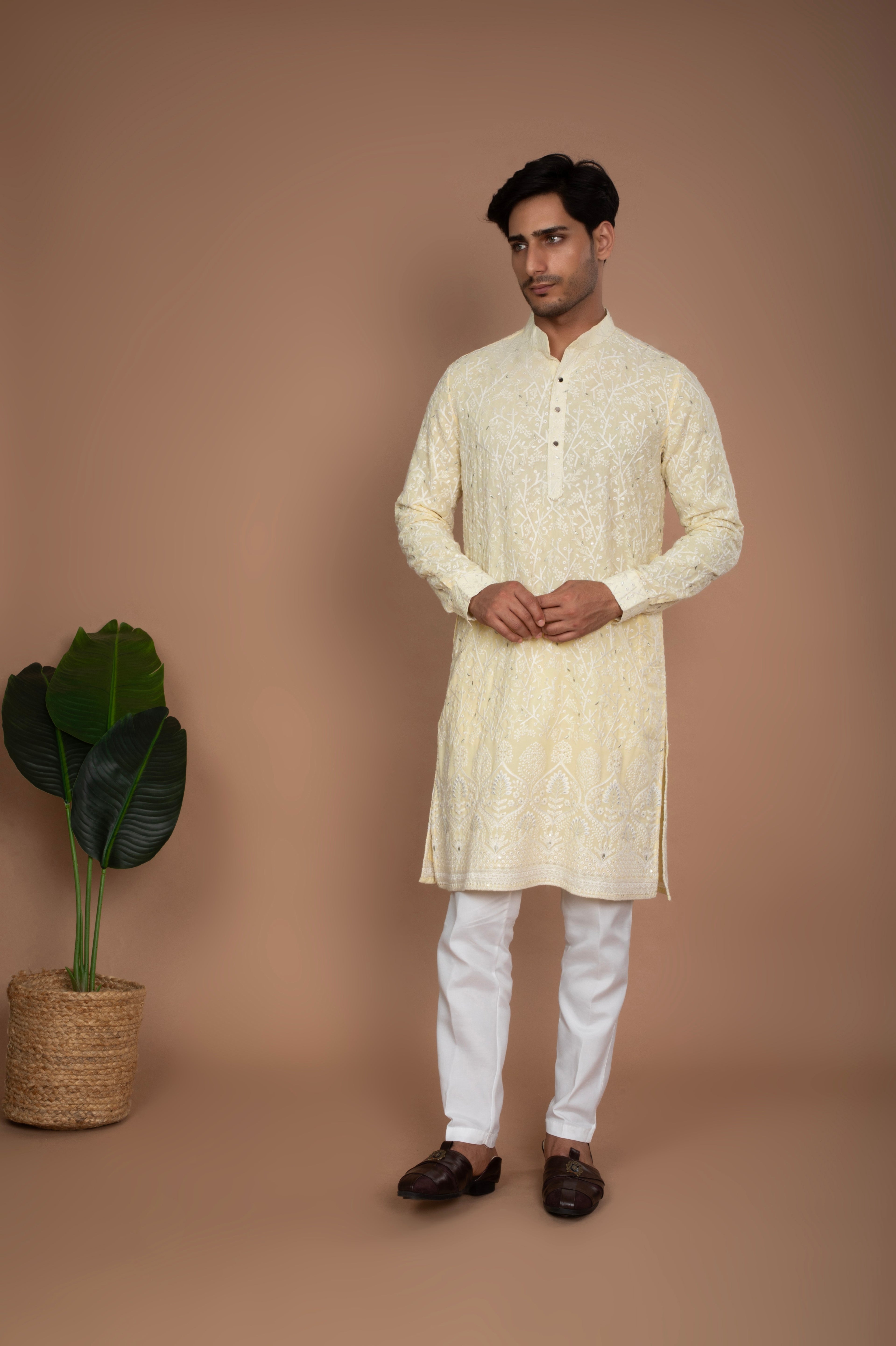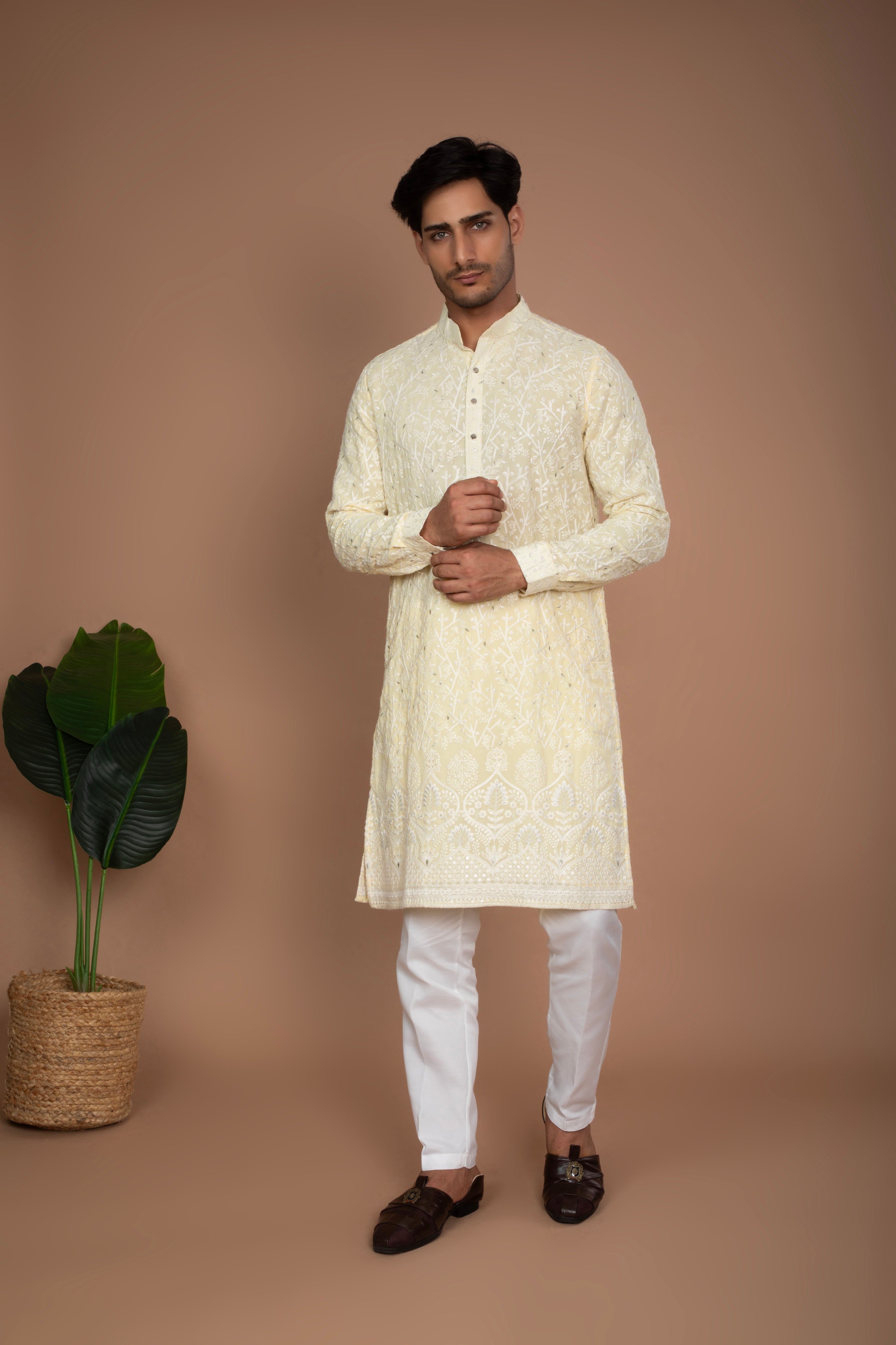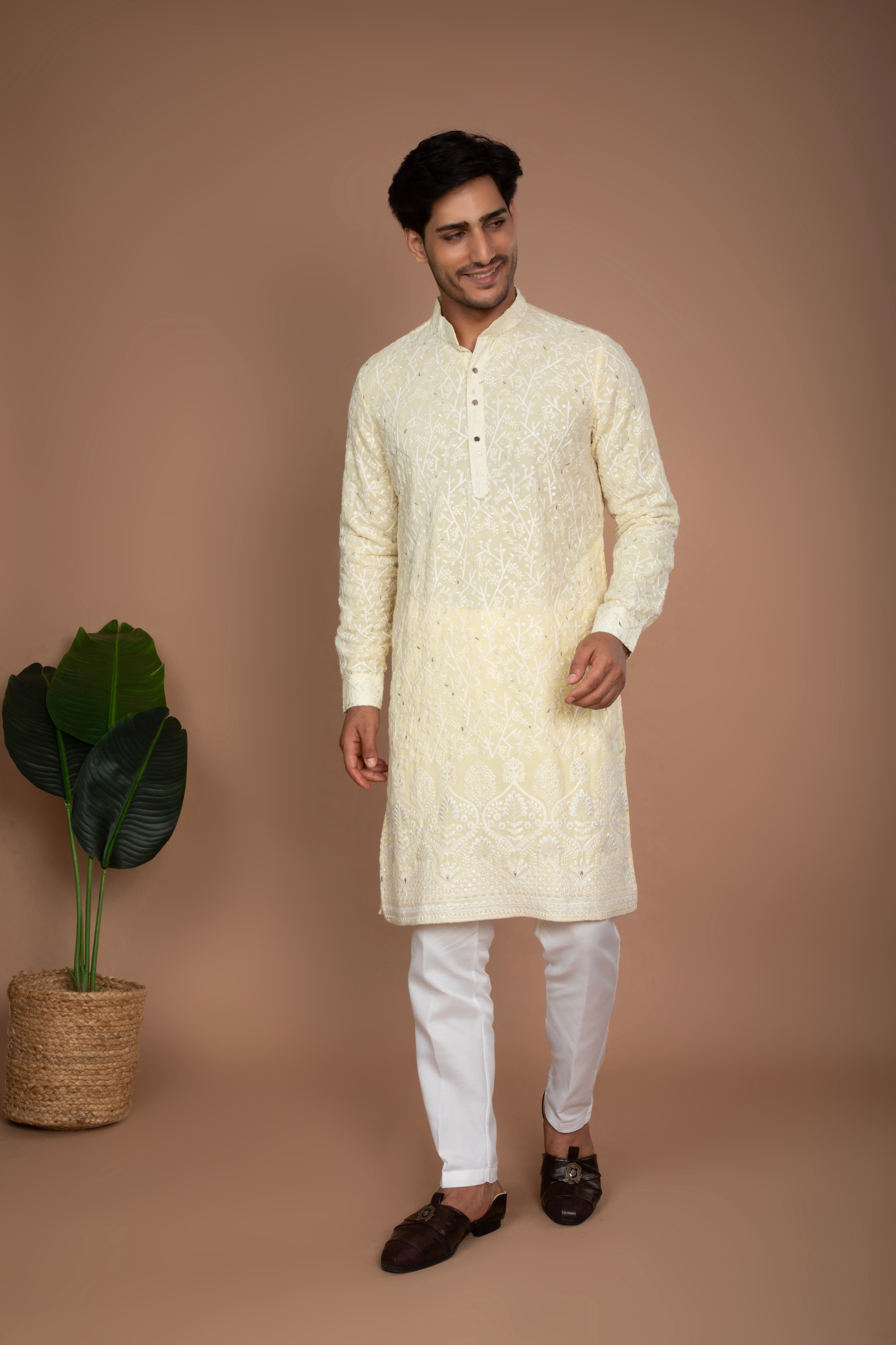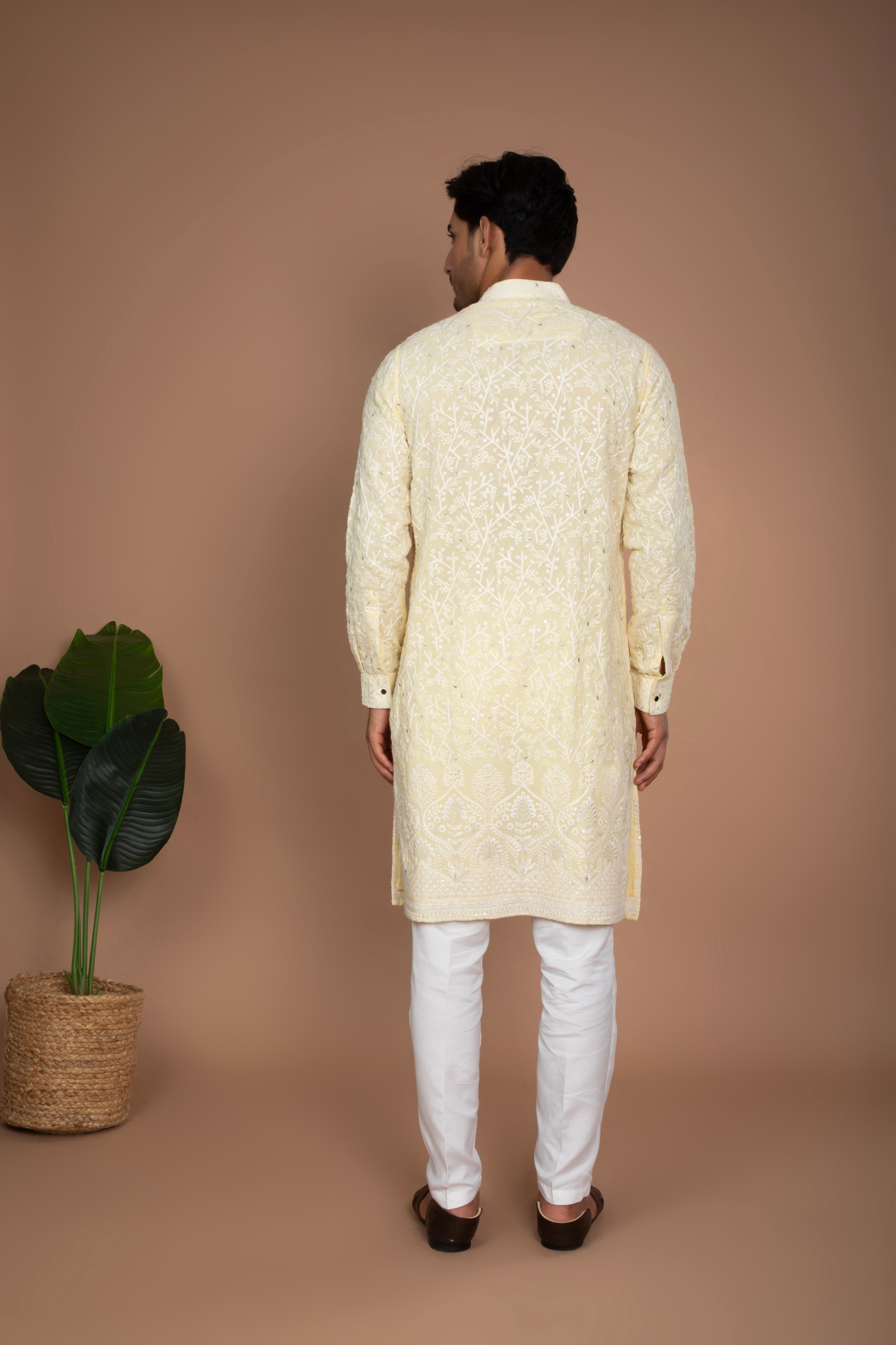 Off-White Silk Kurta with Lotus Butti Embroidery