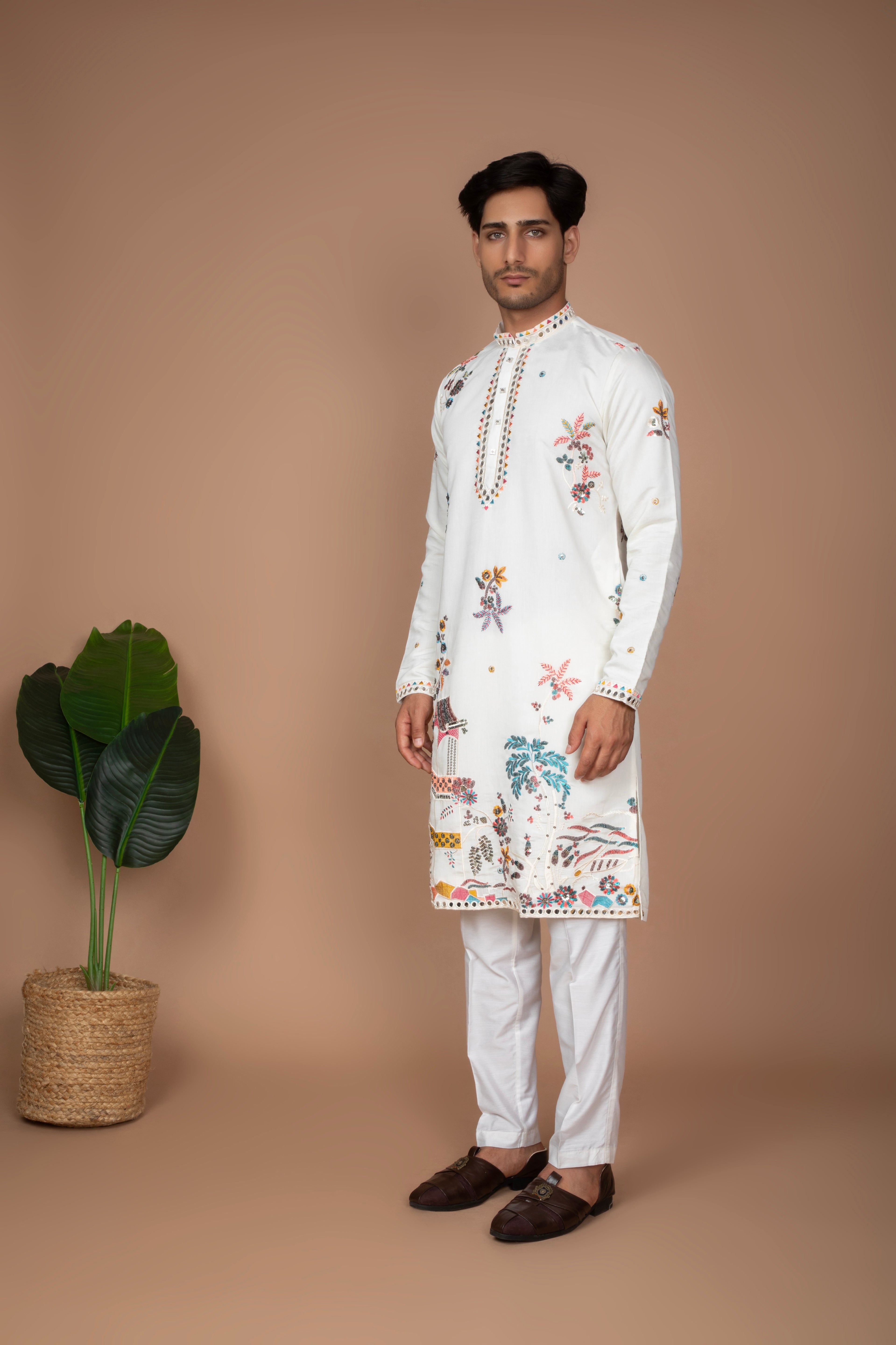 Off-White Cotton Kurta with Multi-Color Mirror Work Embroidery Nature Motifs