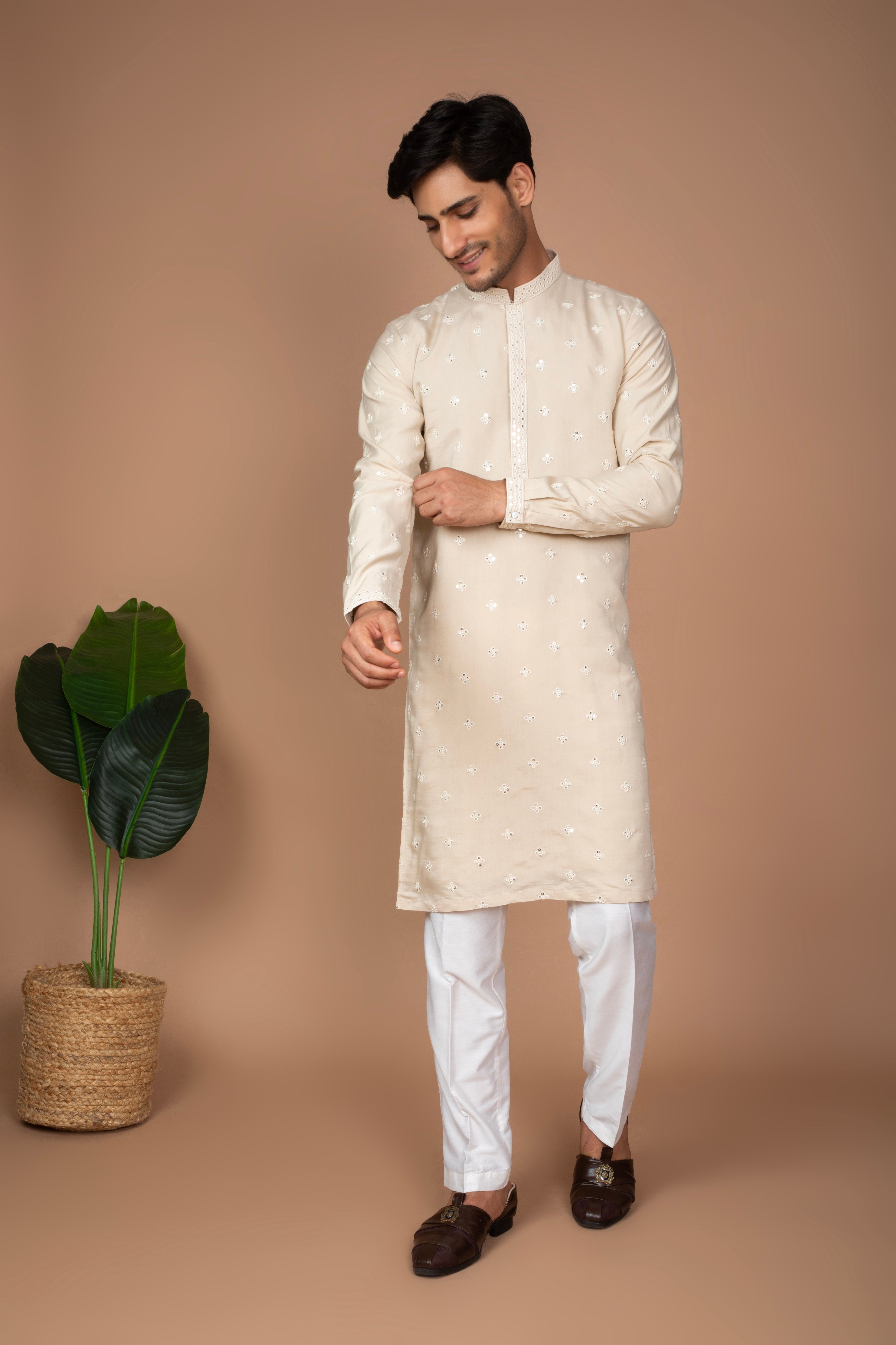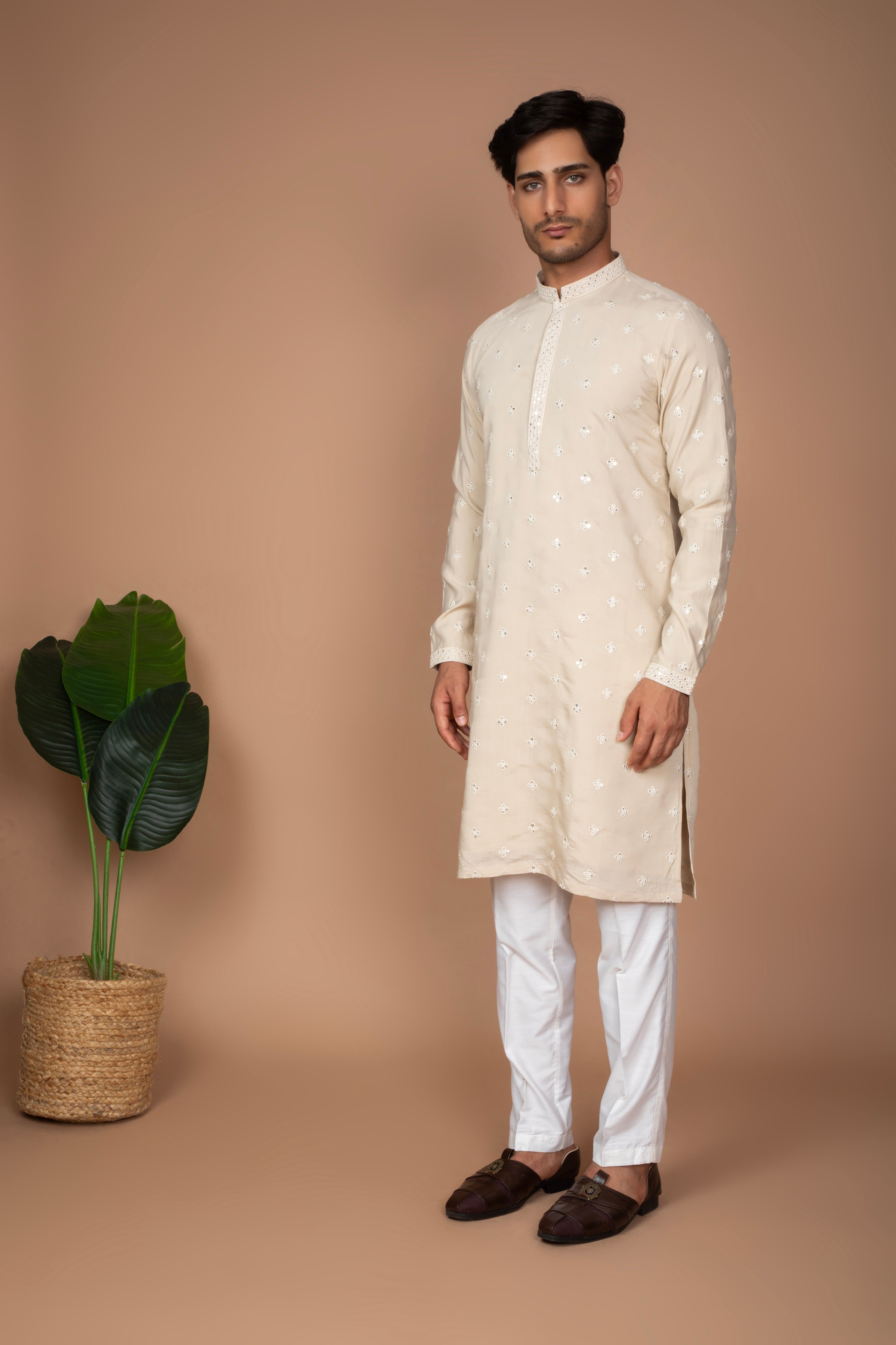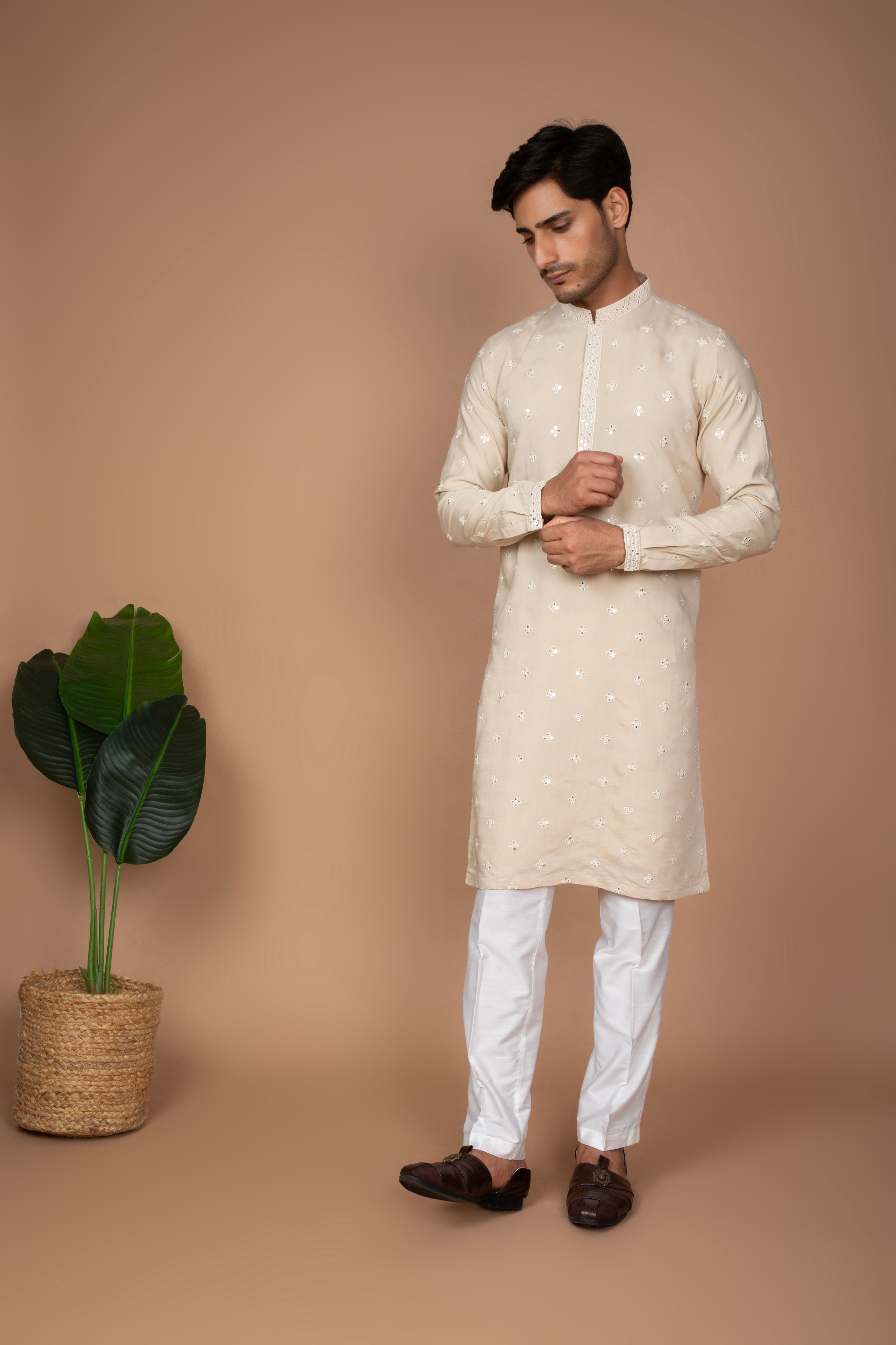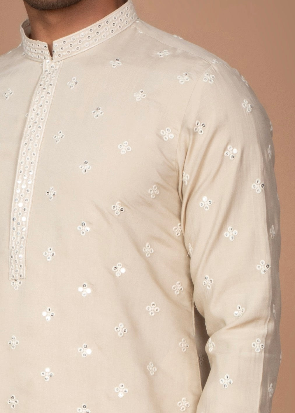 Beige Cotton Kurta with Embroidered Sequined Buttis
