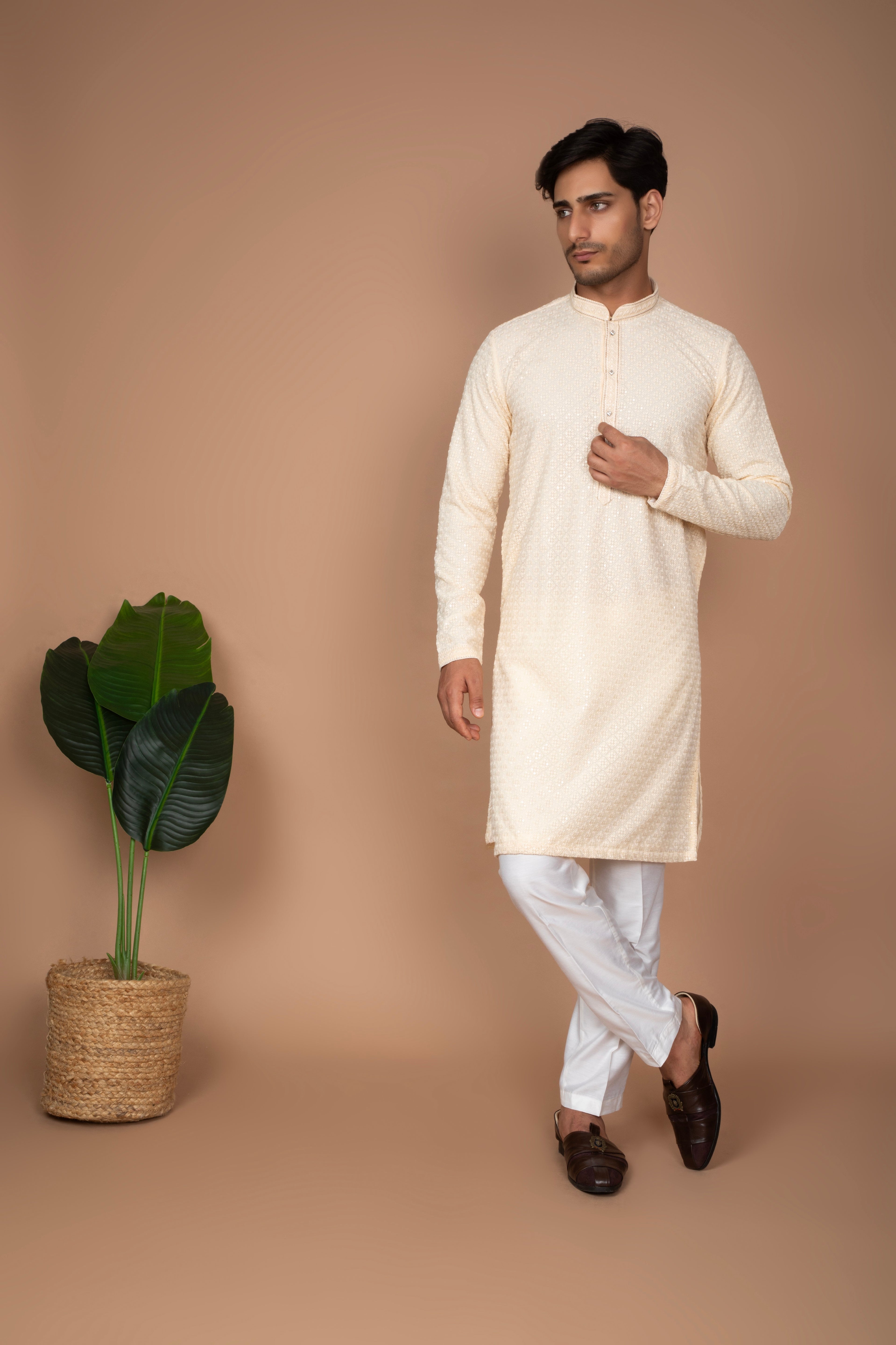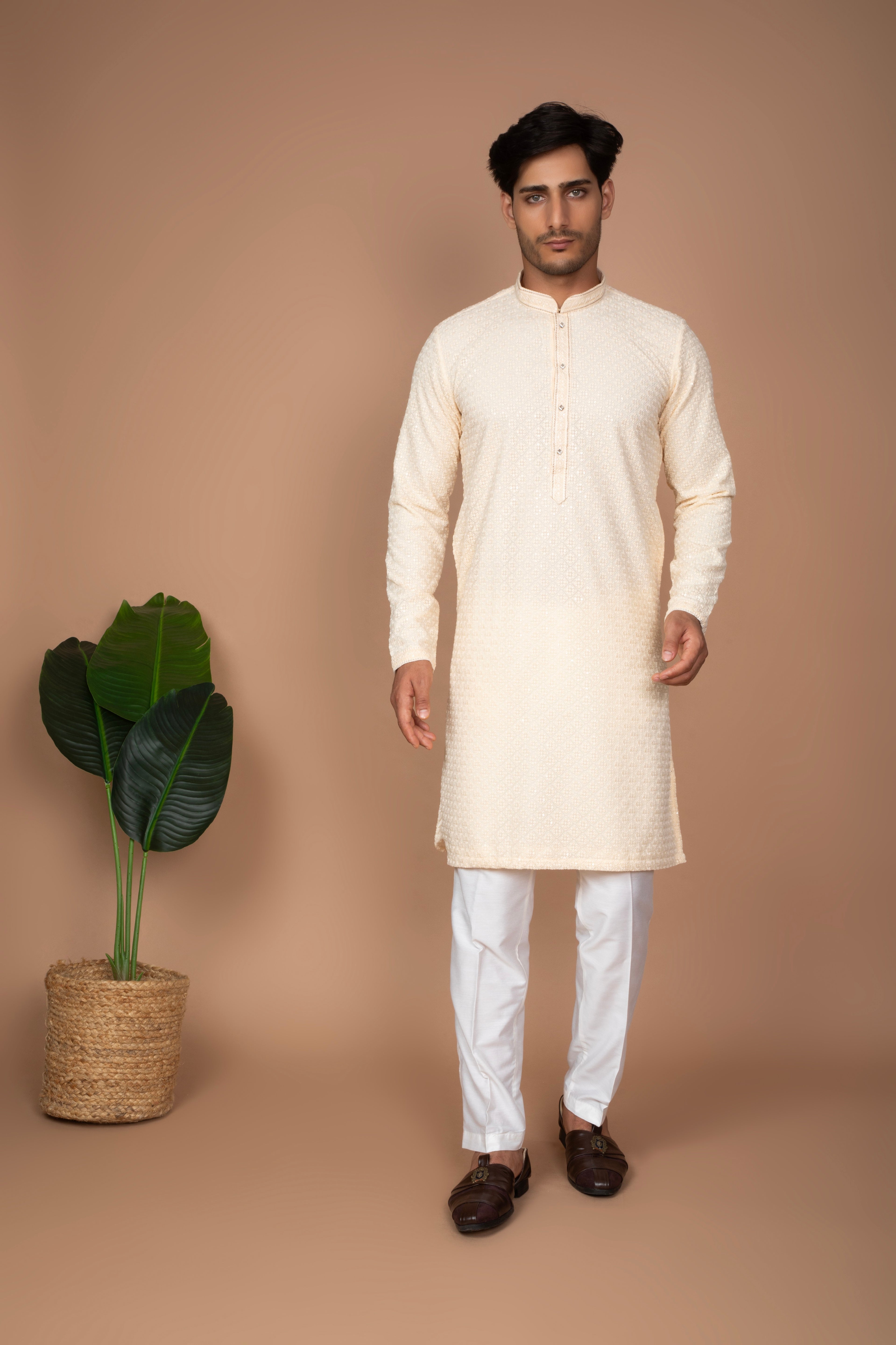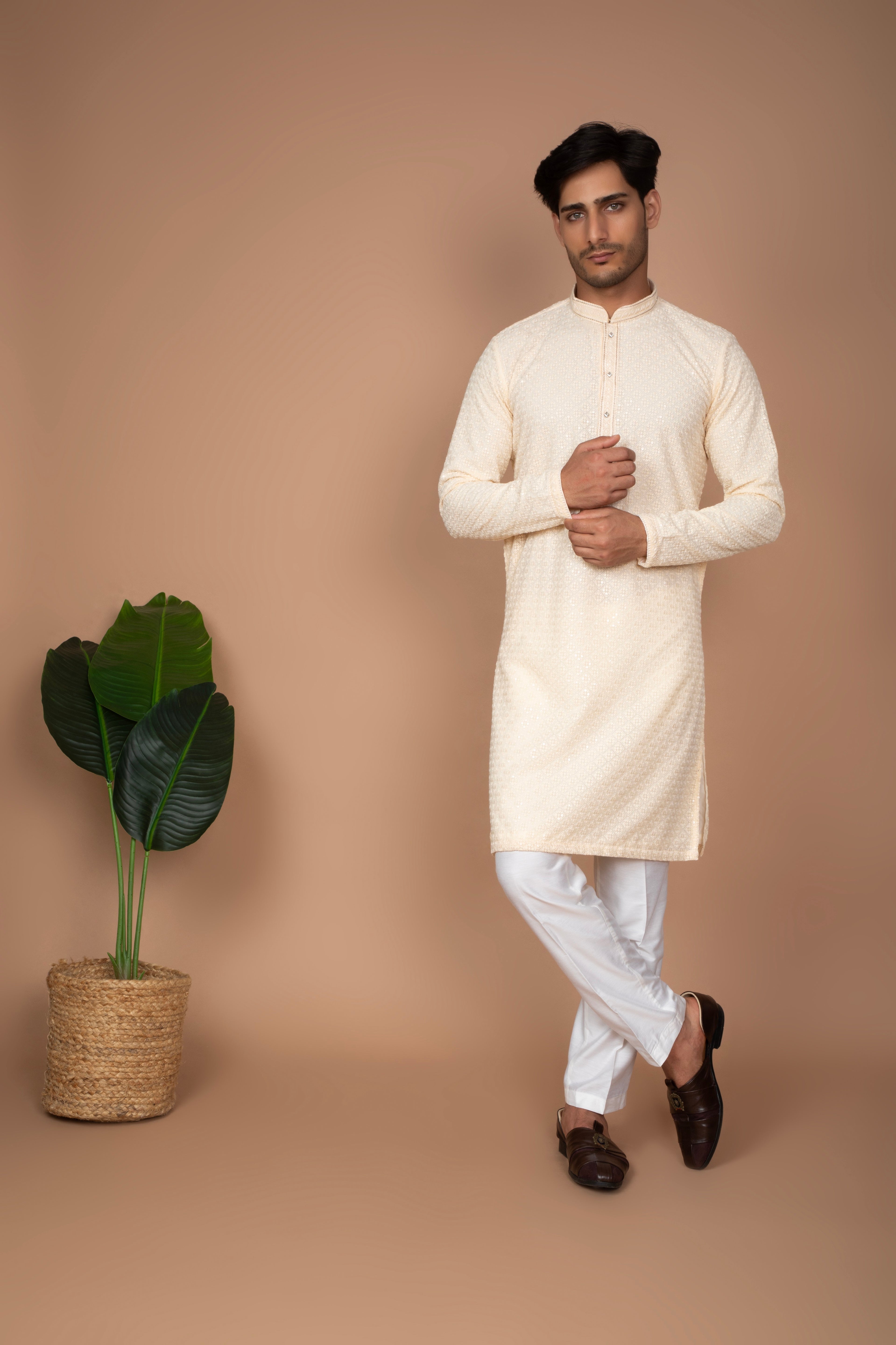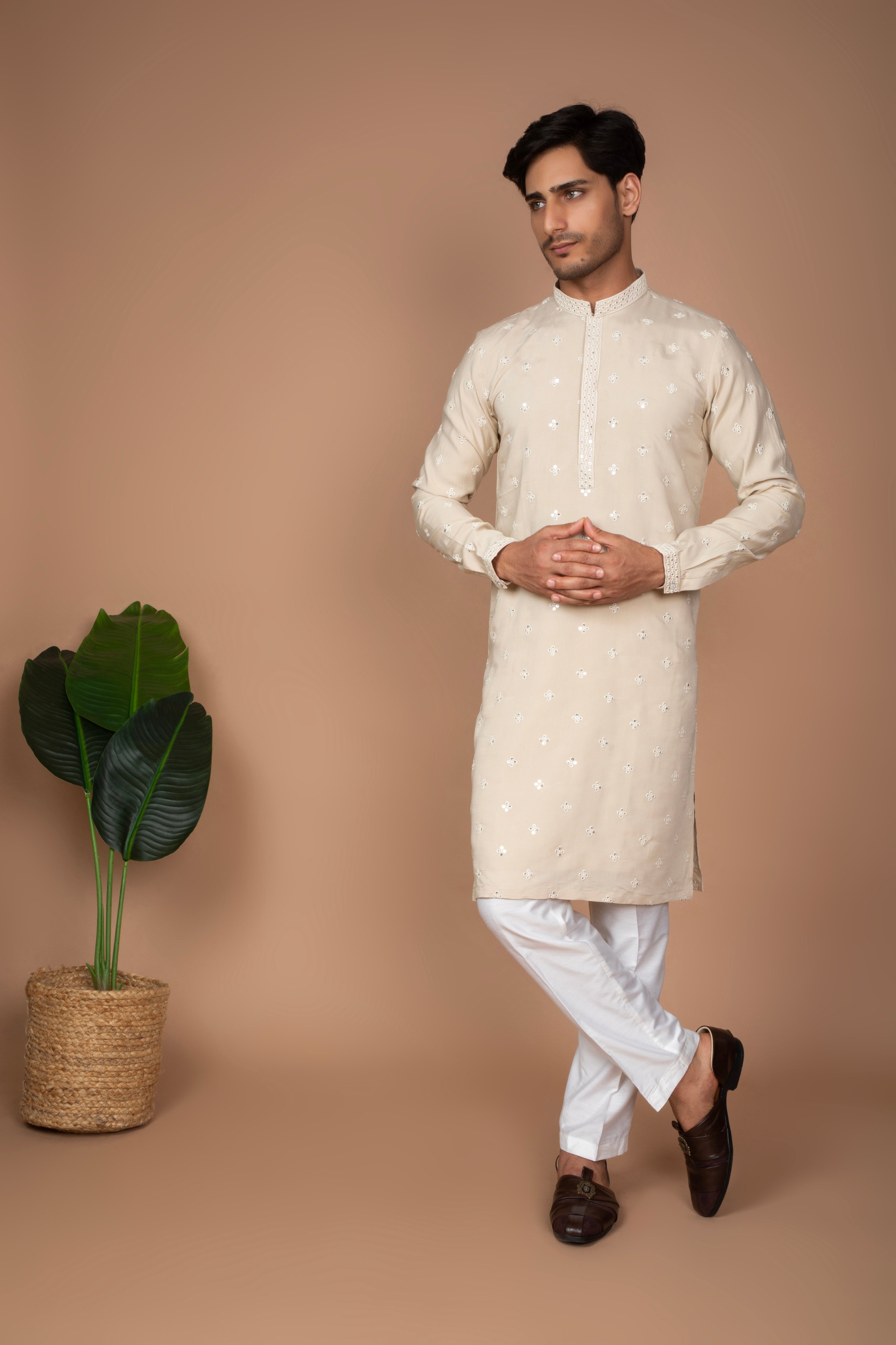 Beige Cotton Kurta with Embroidered Sequined Buttis