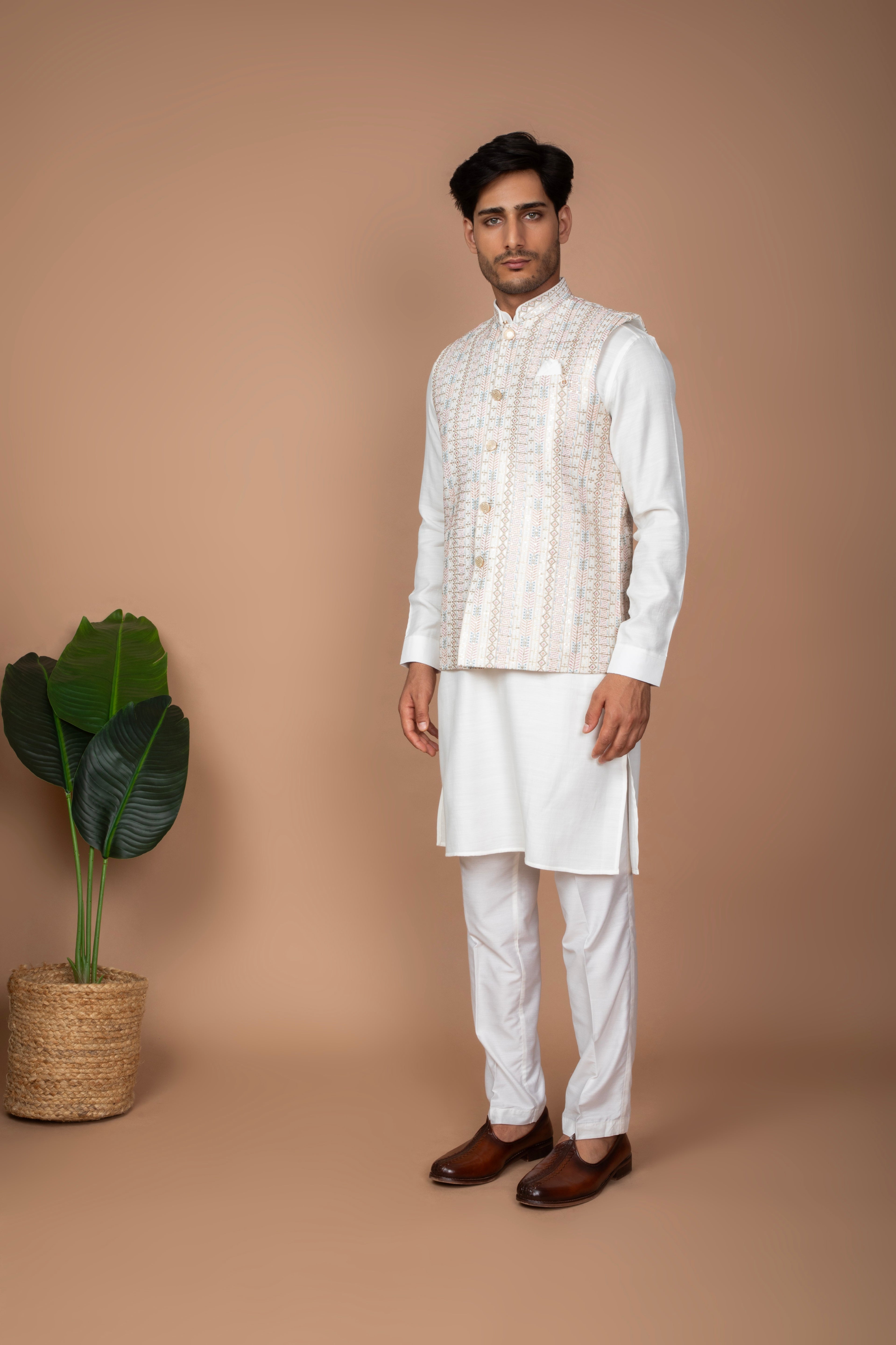 White Cotton-Silk Kurta Jacket Set with Multi-Color Vertical Thread Embroidery