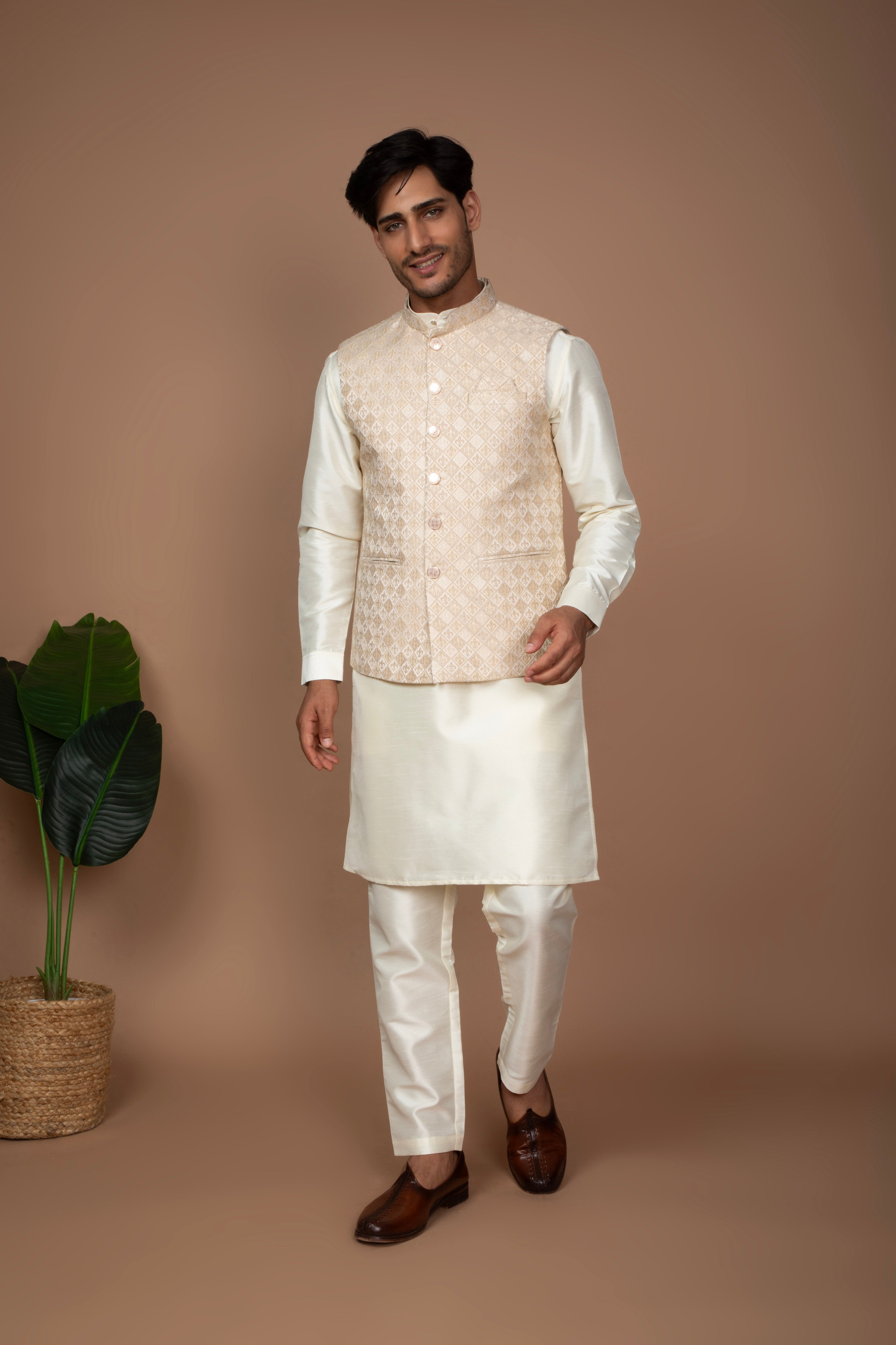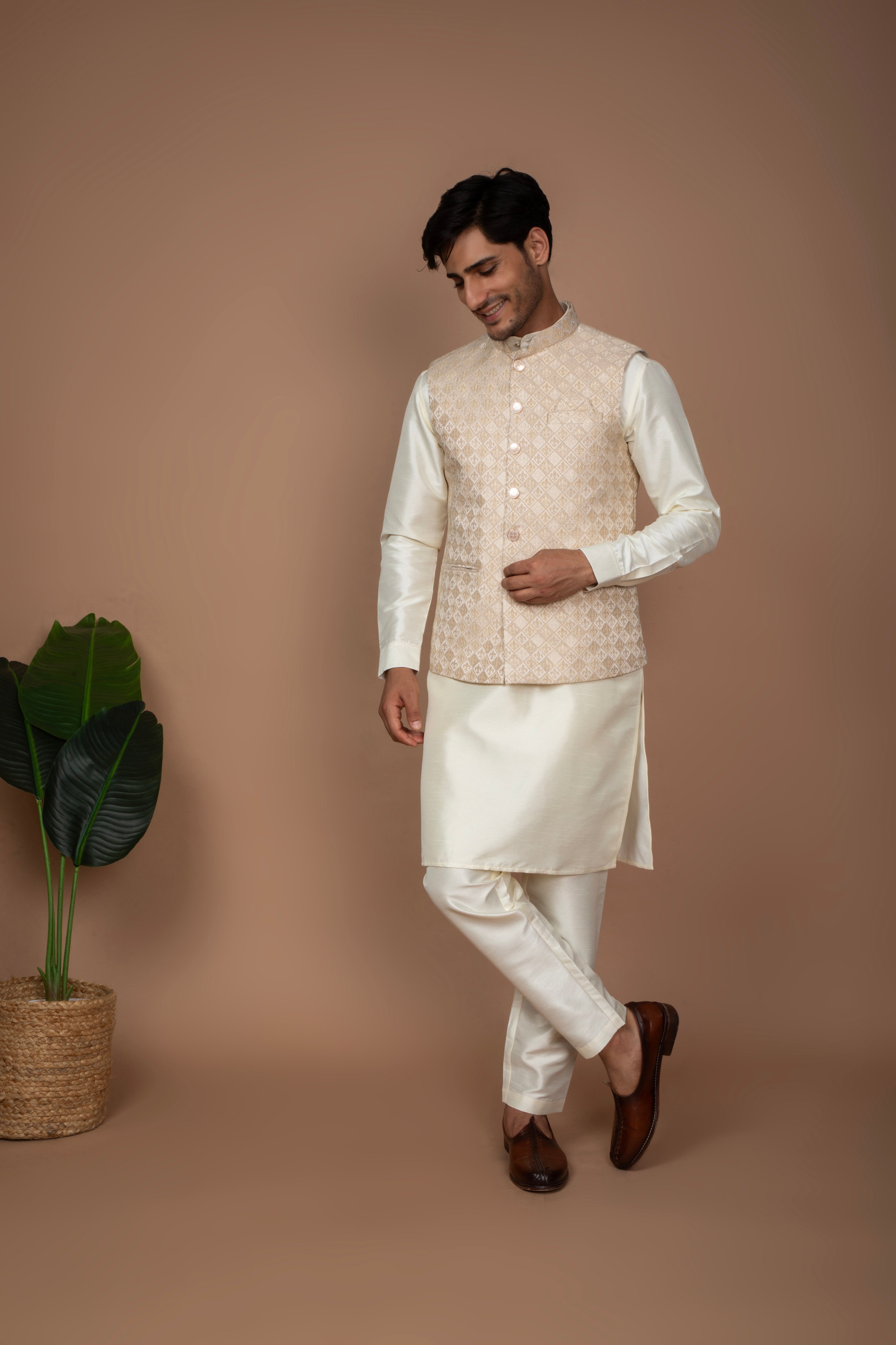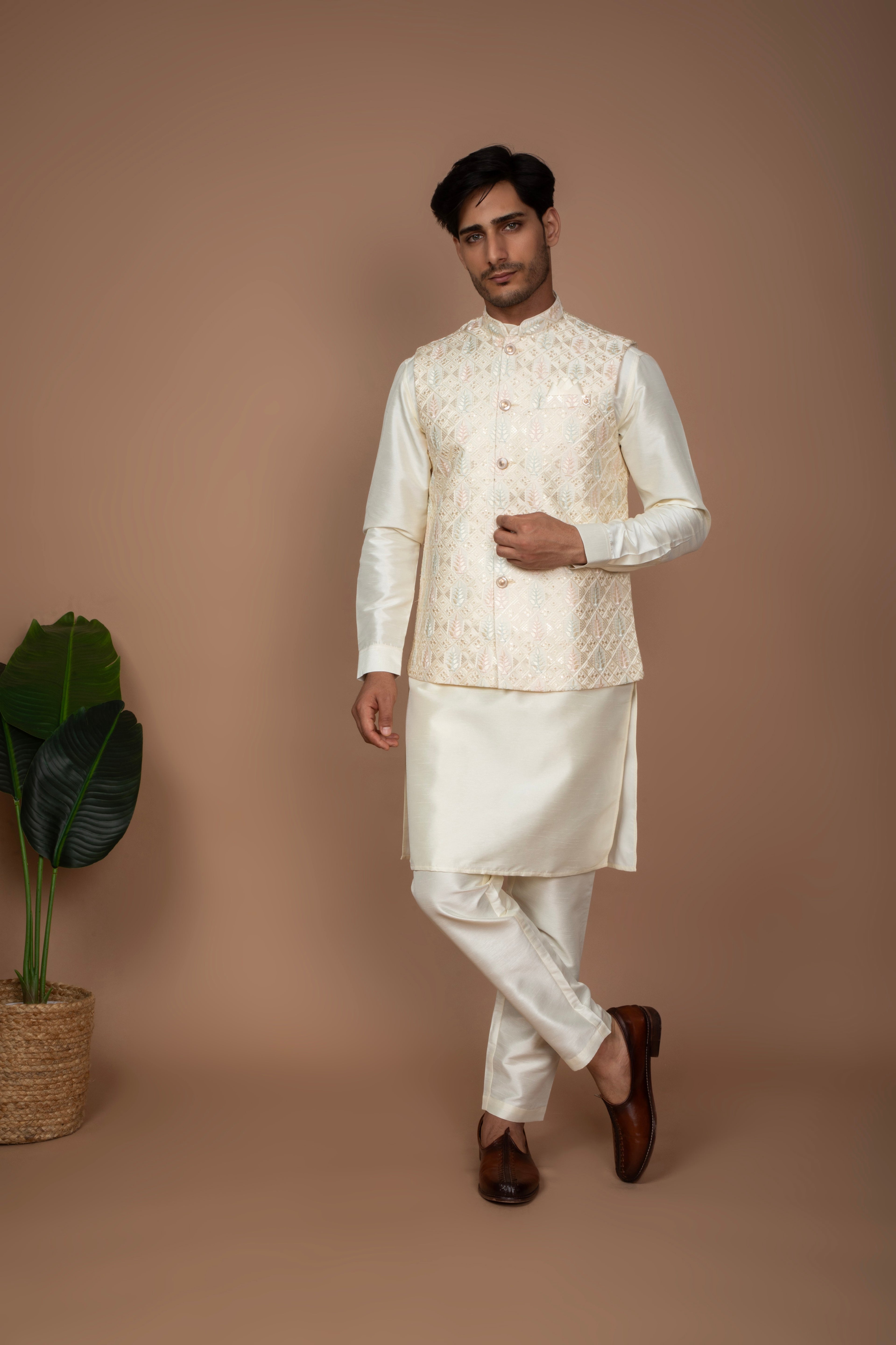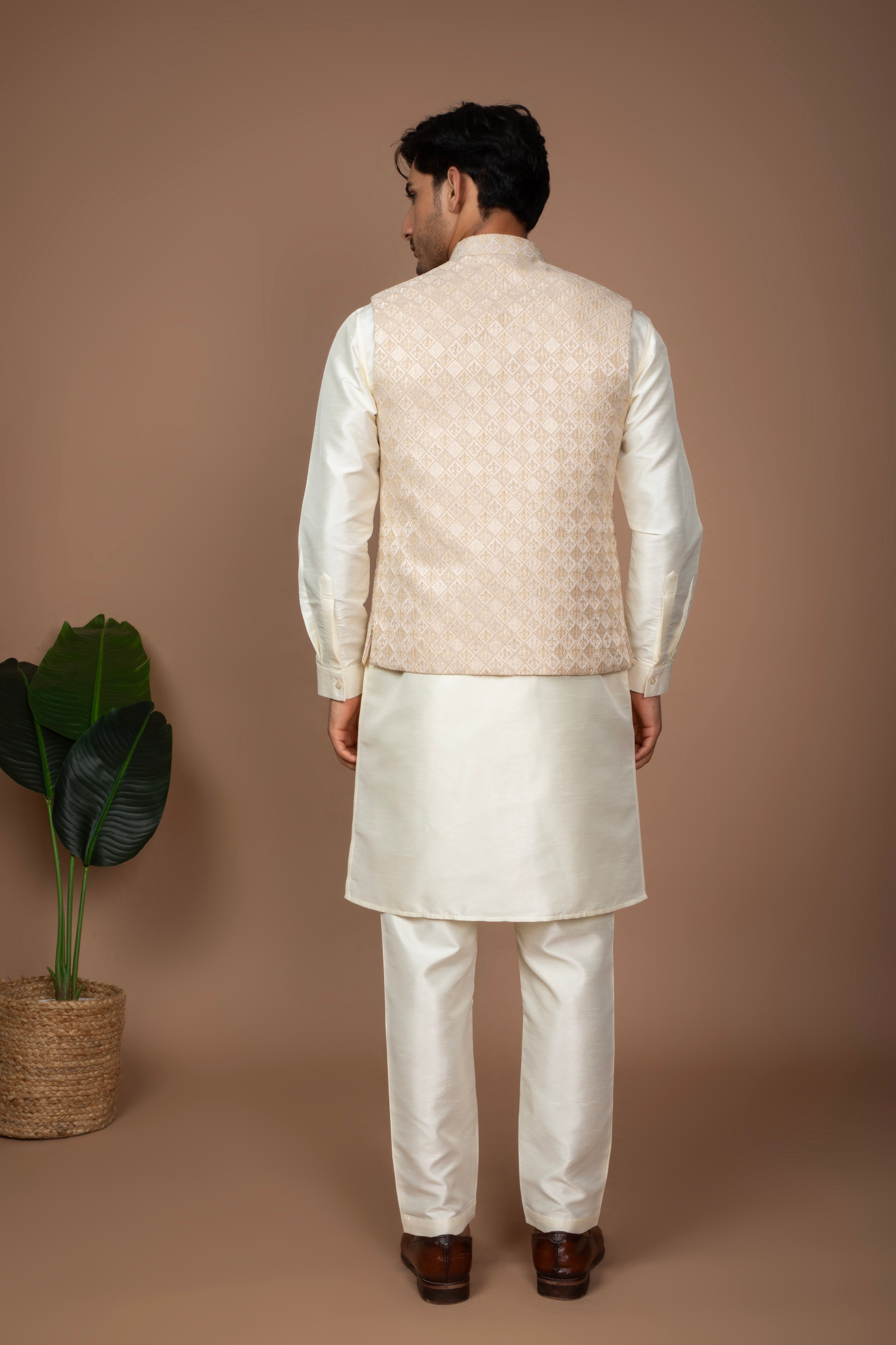Cream Silk Kurta Jacket Set with Intricate Thread Work