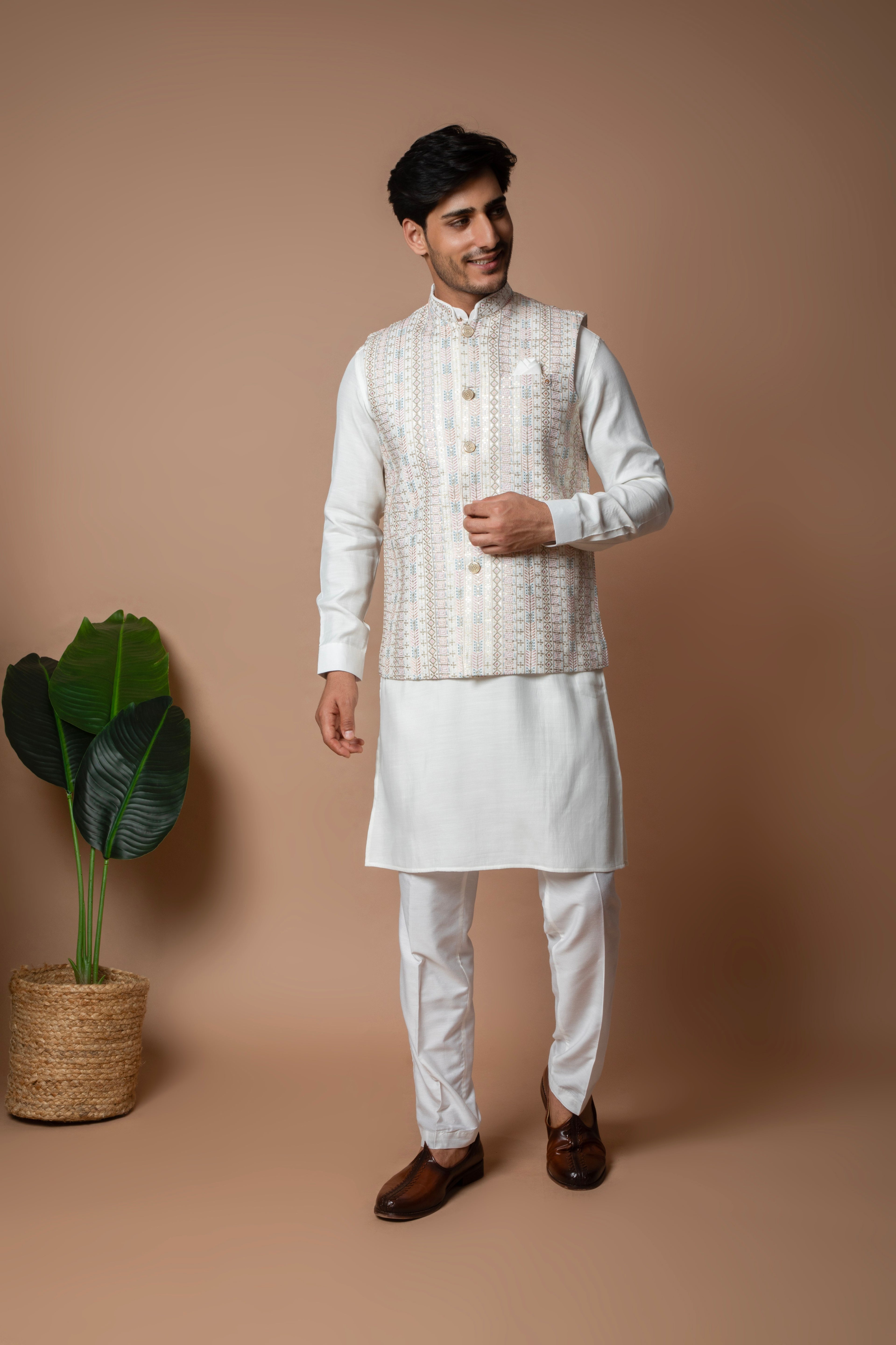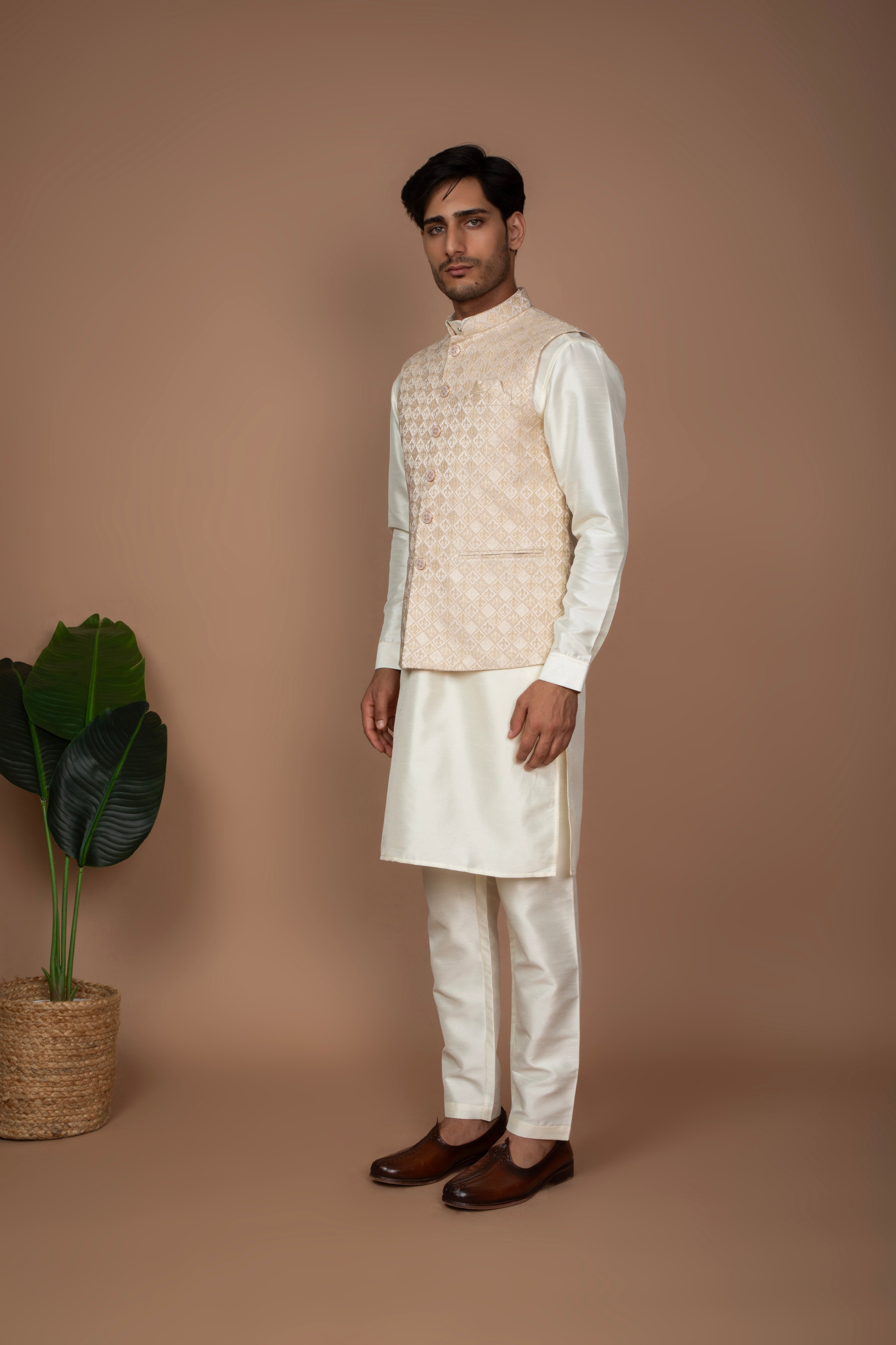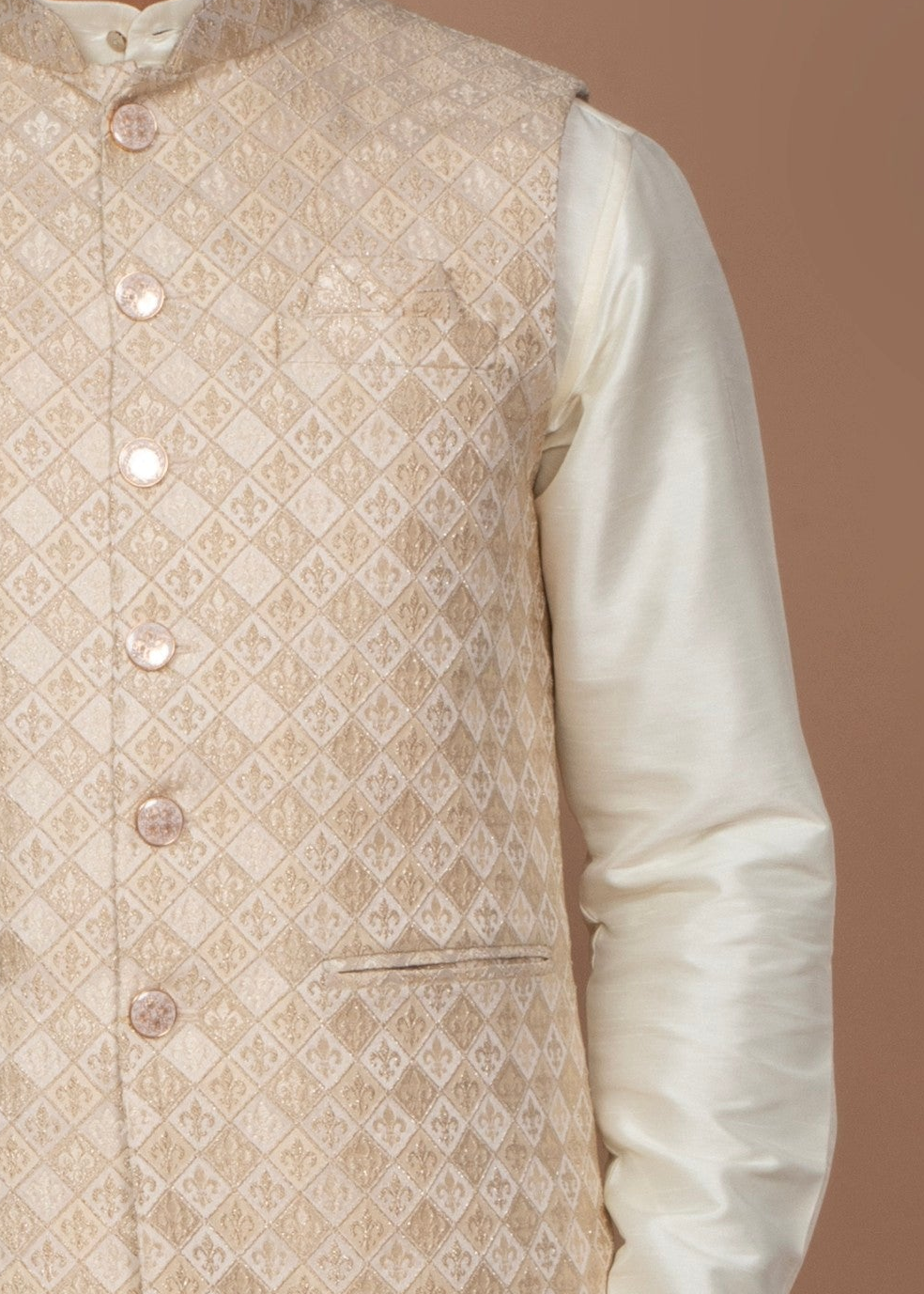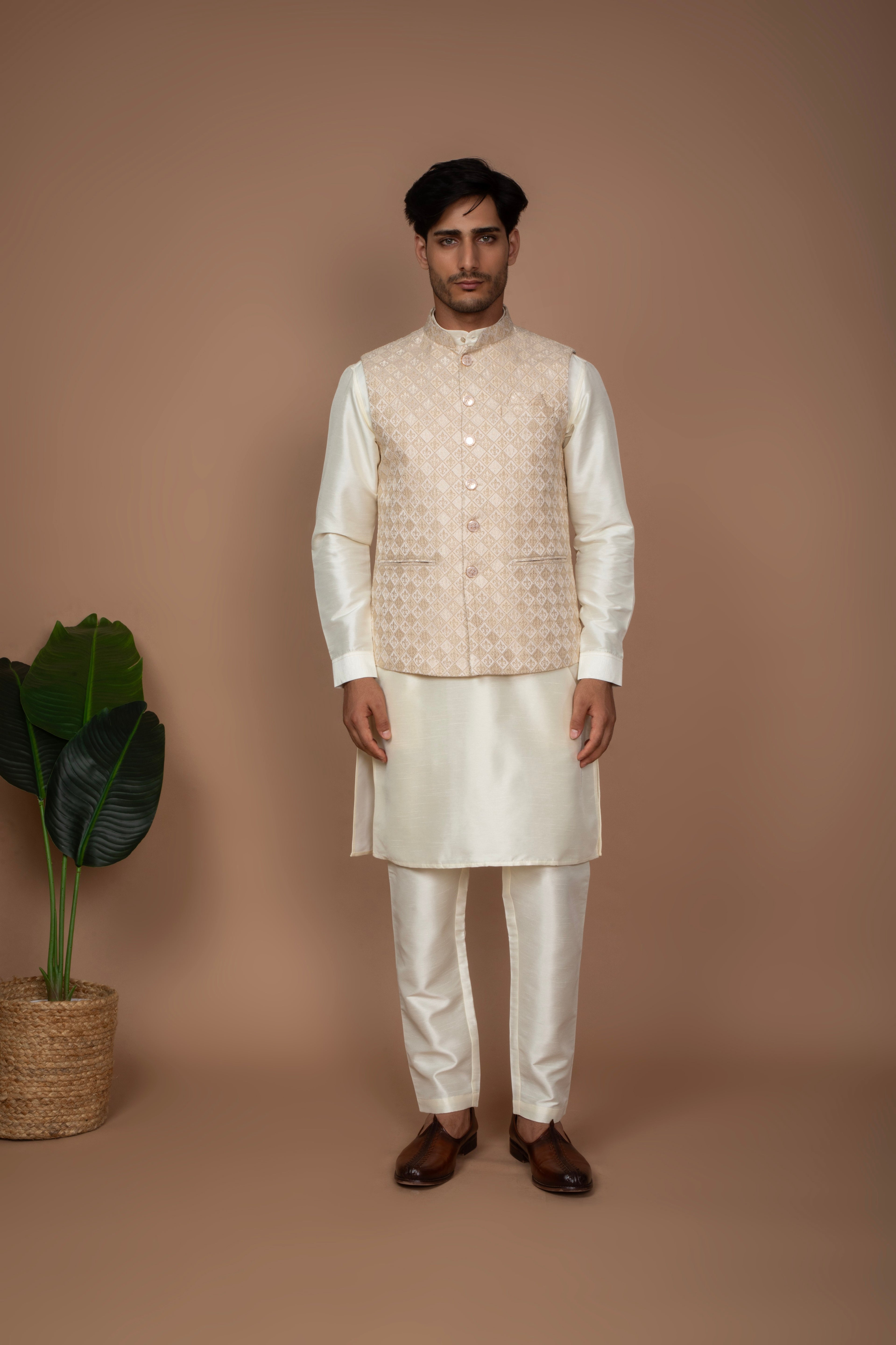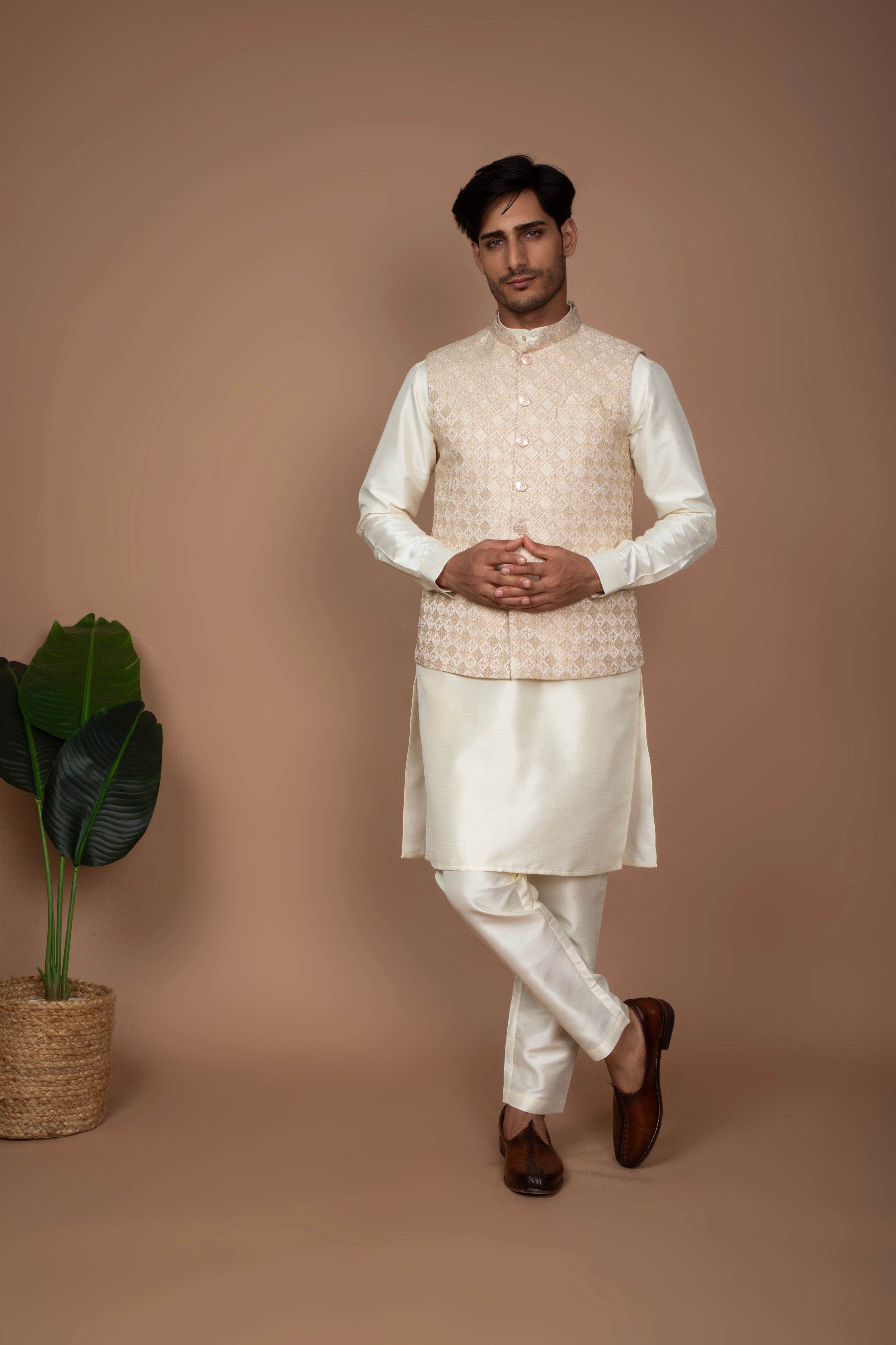 Cream Silk Kurta Jacket Set with Intricate Thread Work