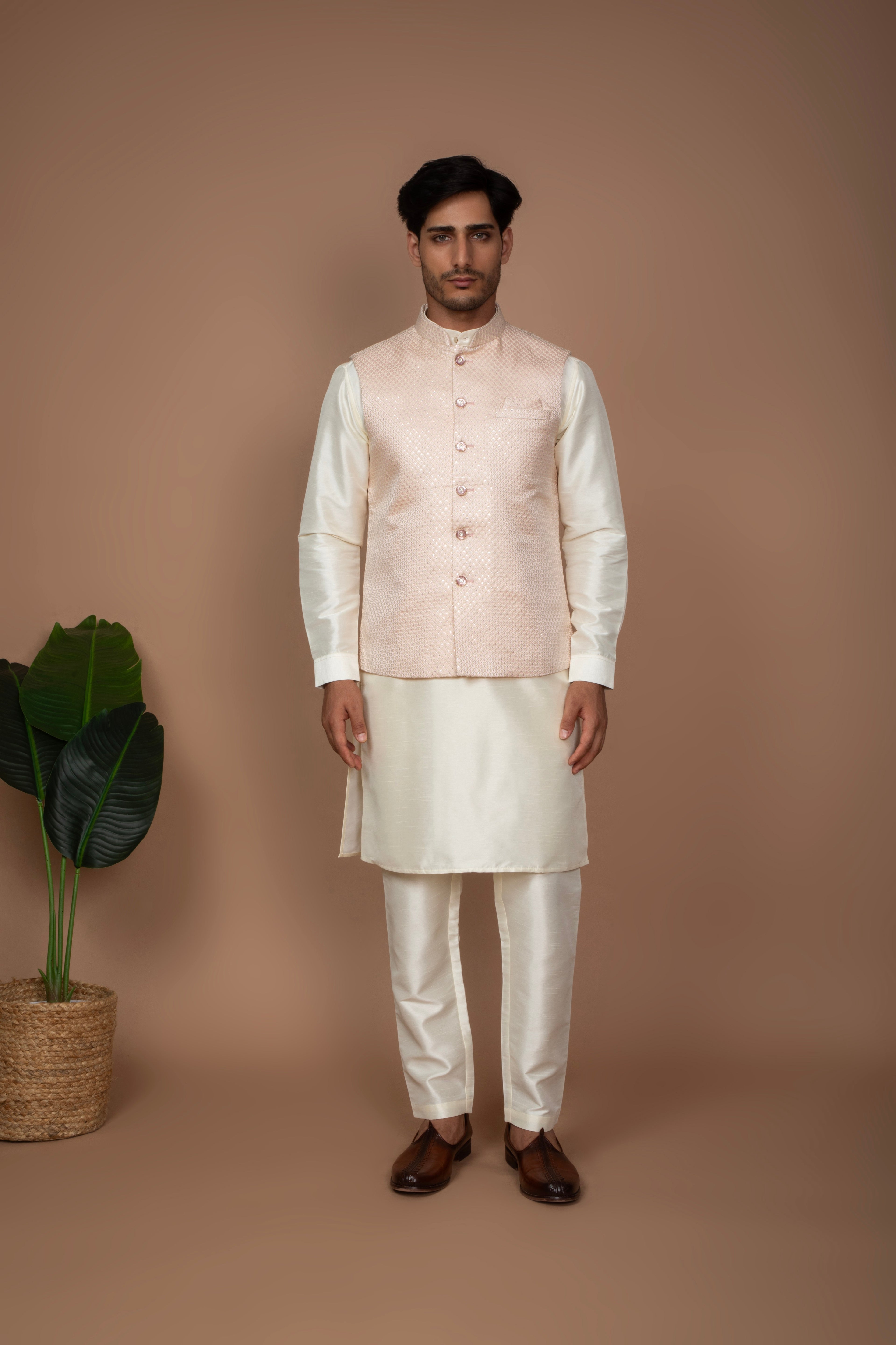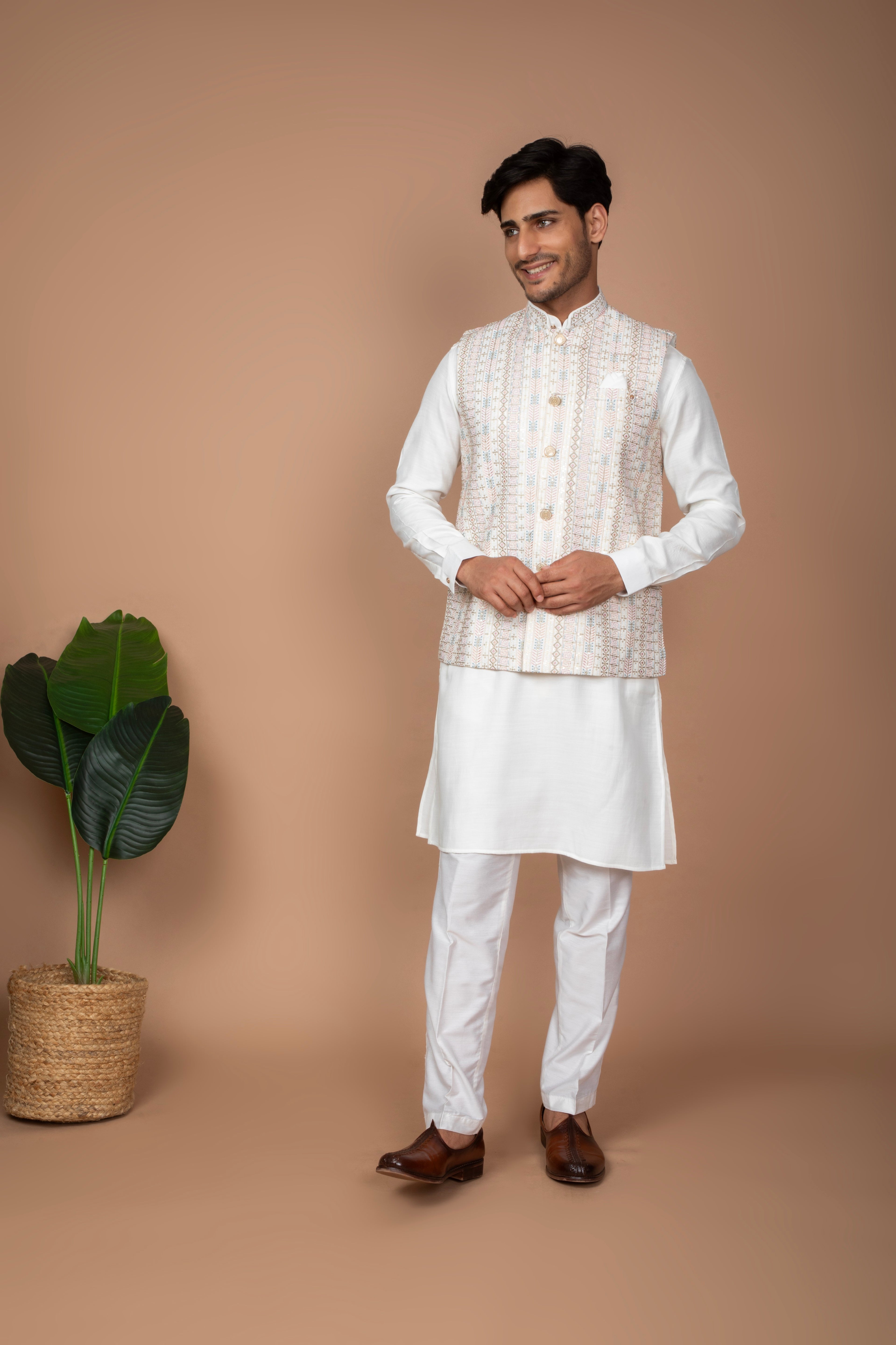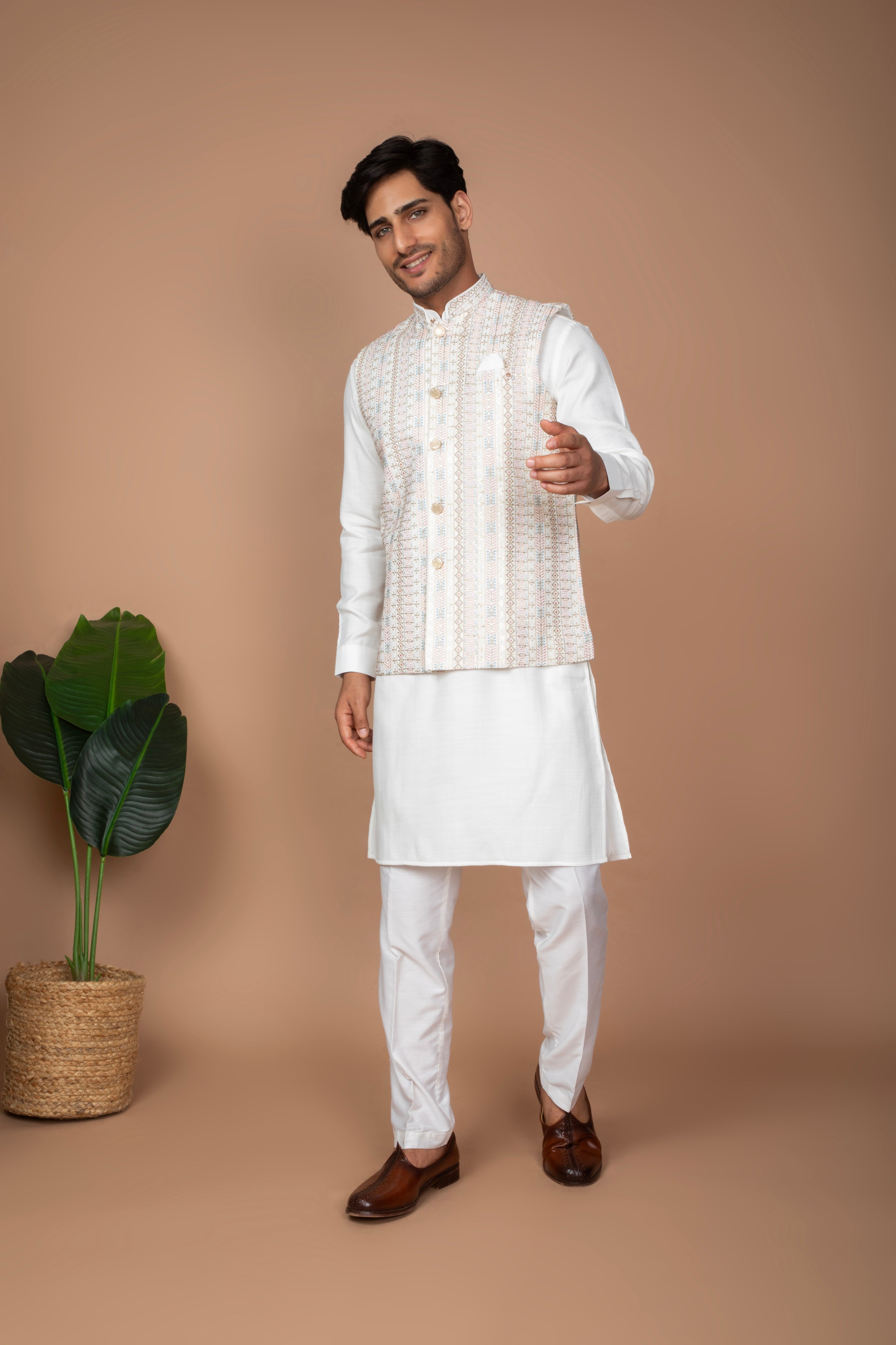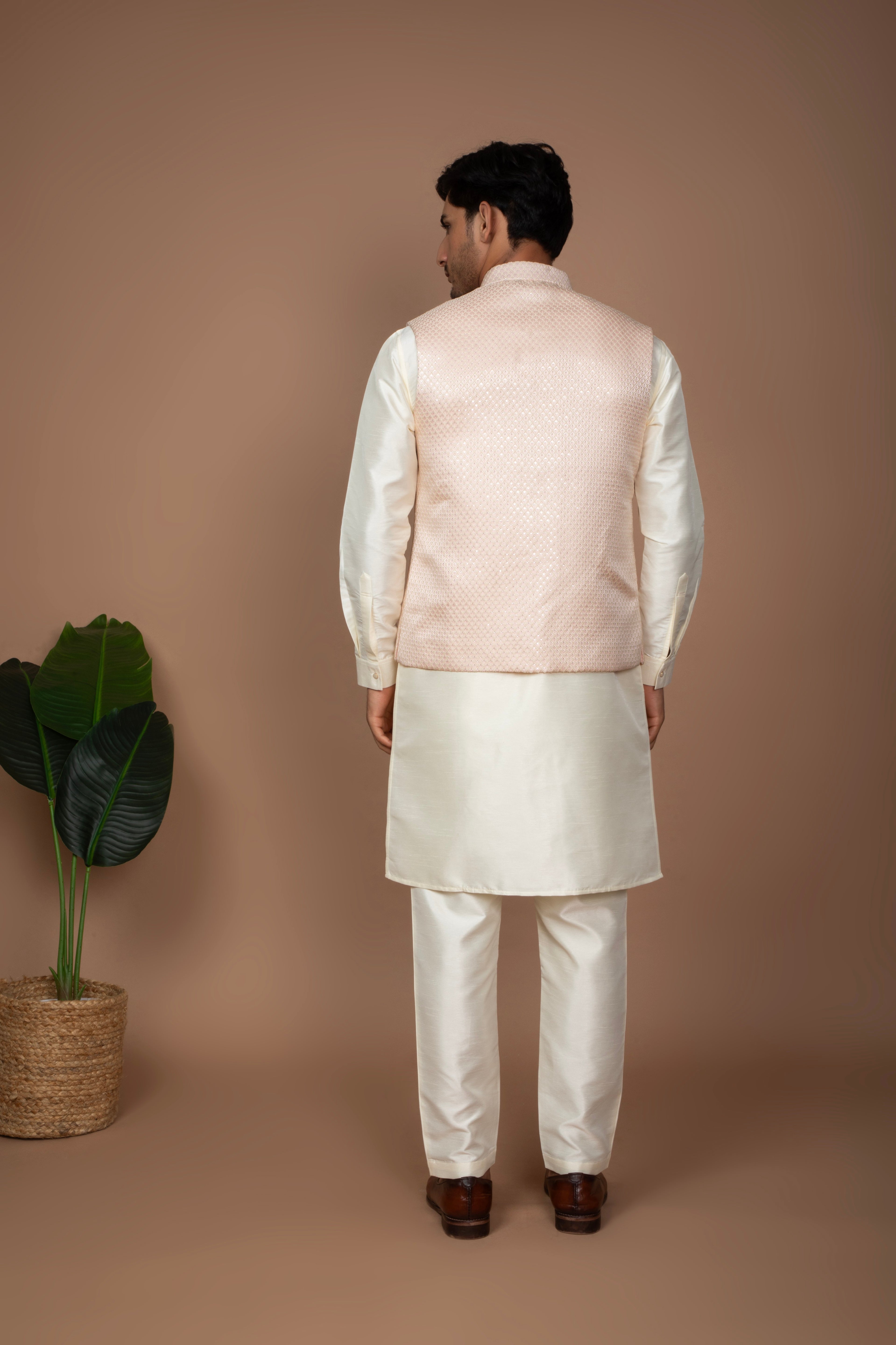 Cream Silk Kurta Jacket Set with Intricate Thread Work