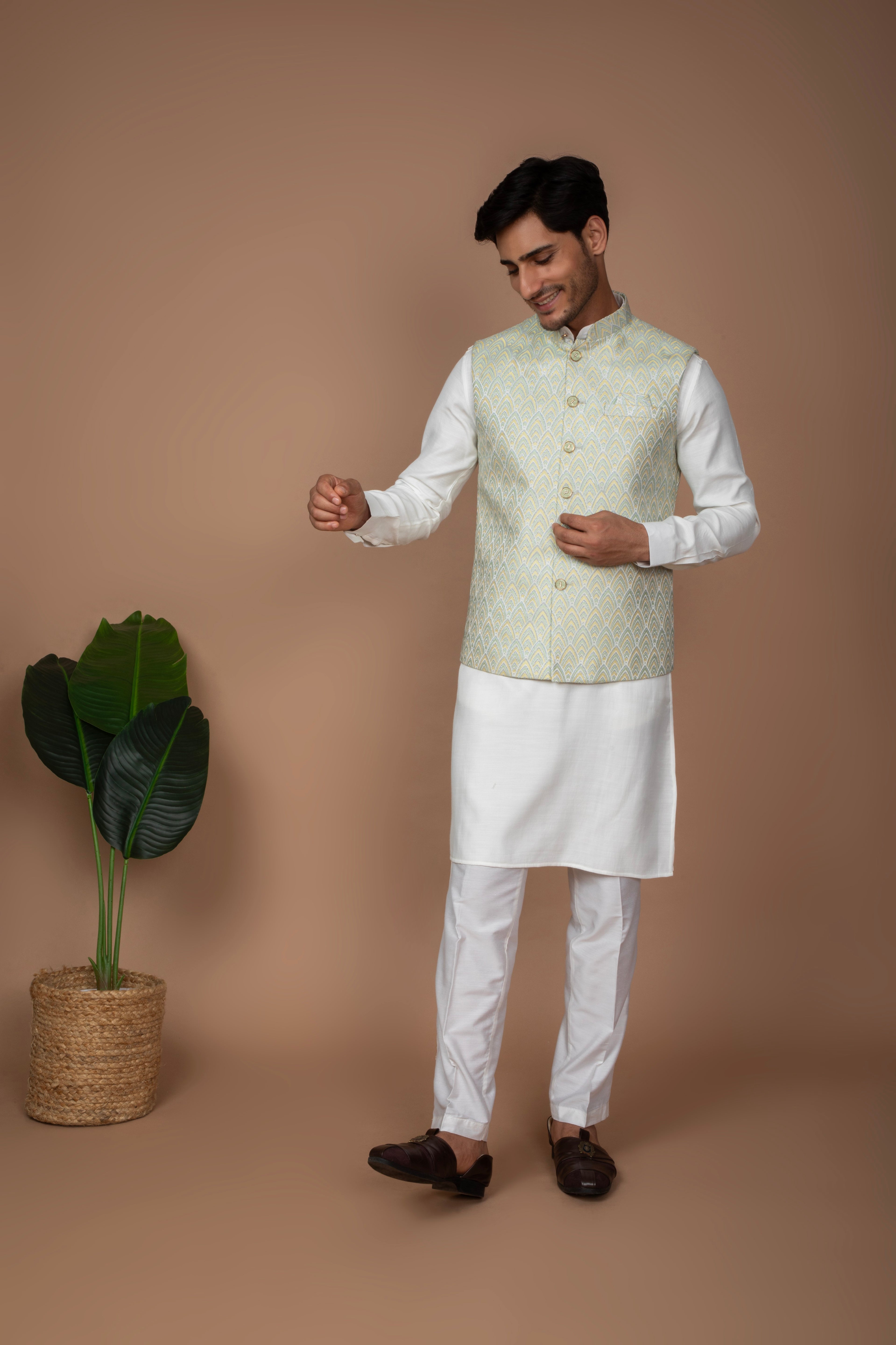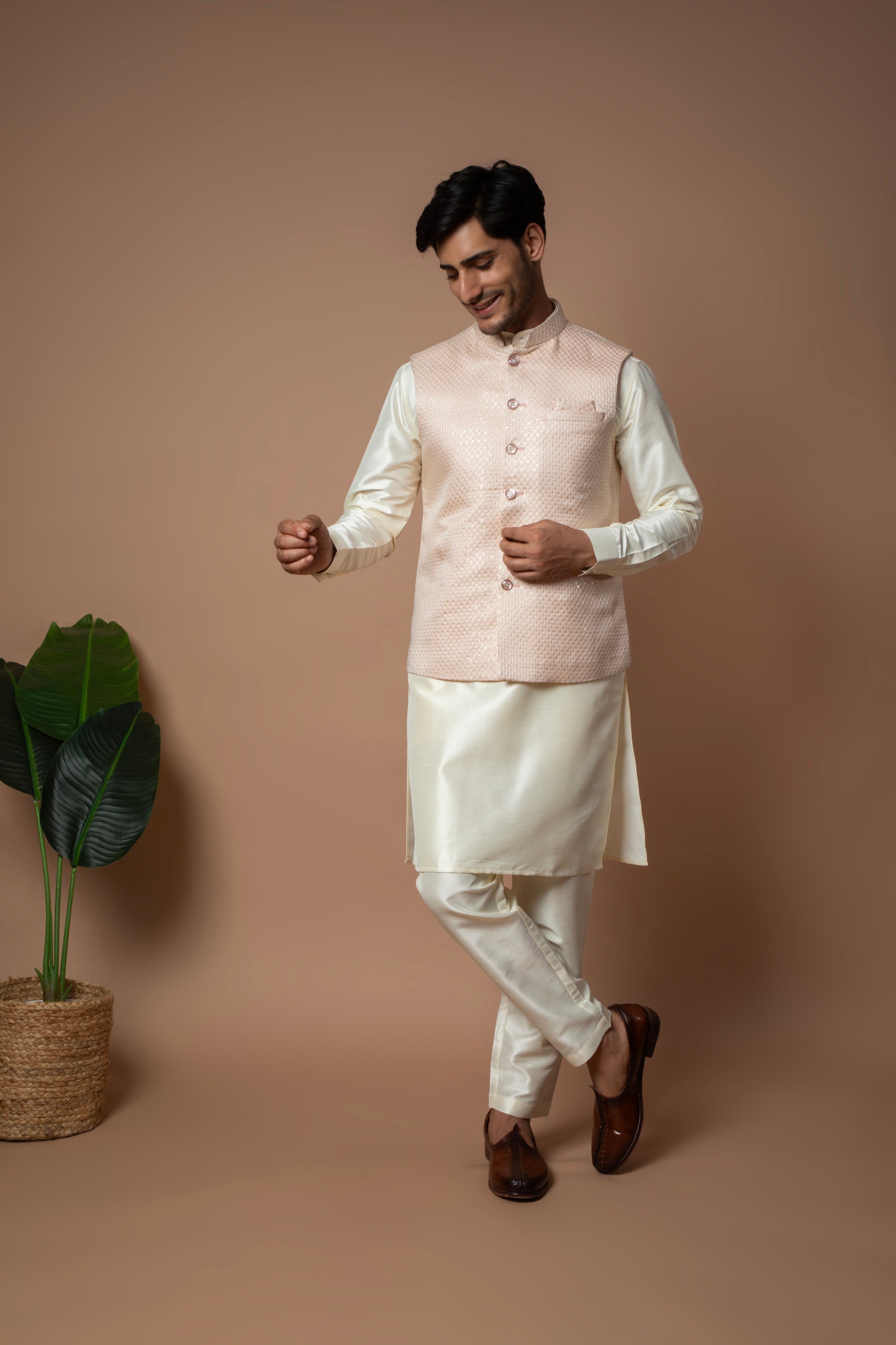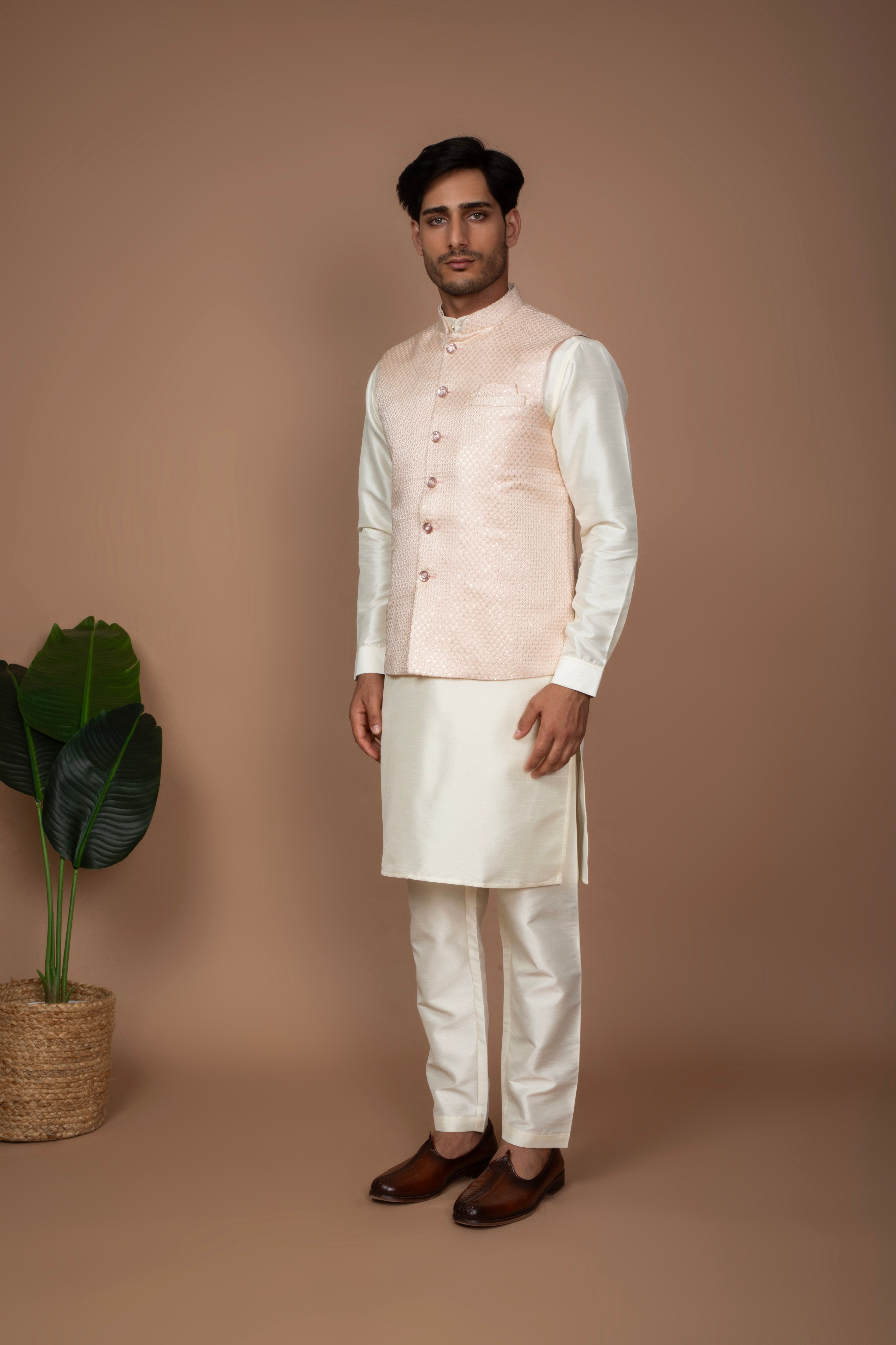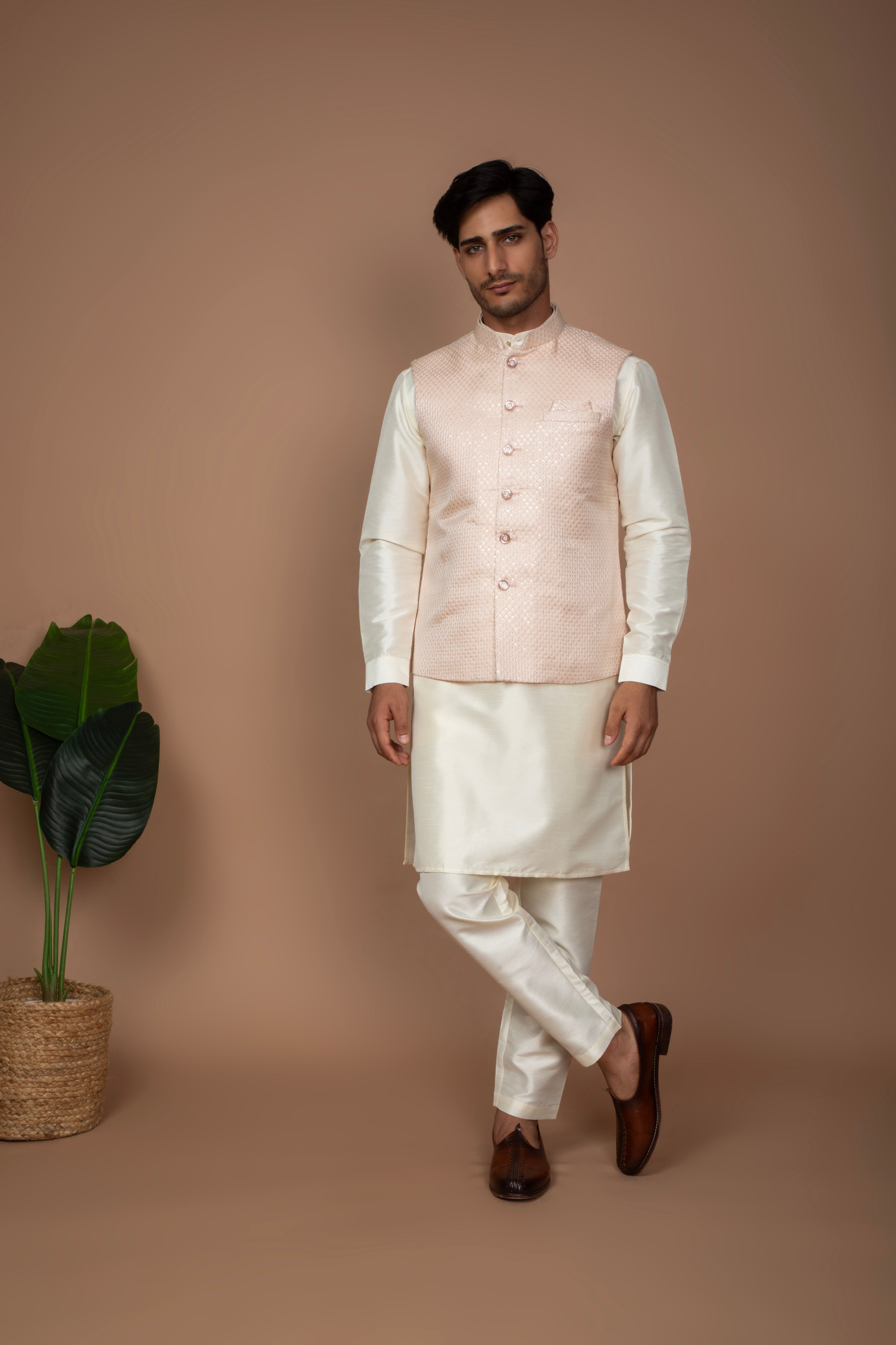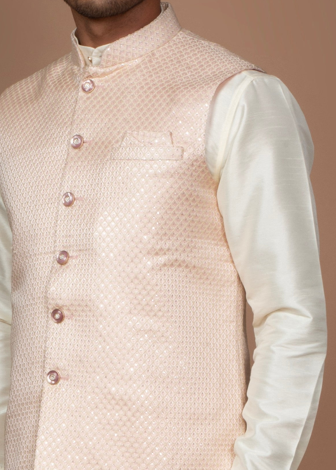 Cream Silk Kurta Jacket Set with Intricate Thread Work