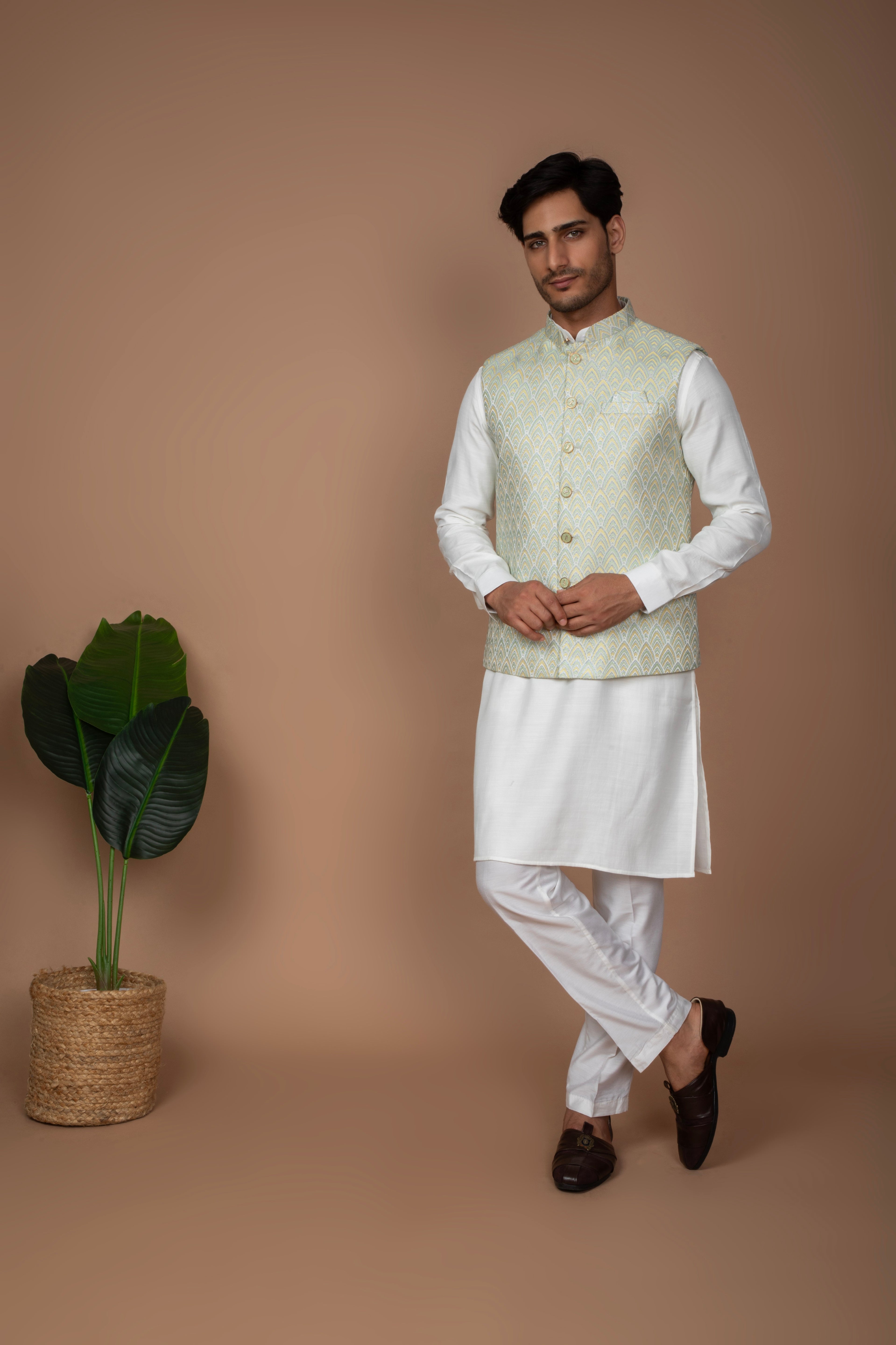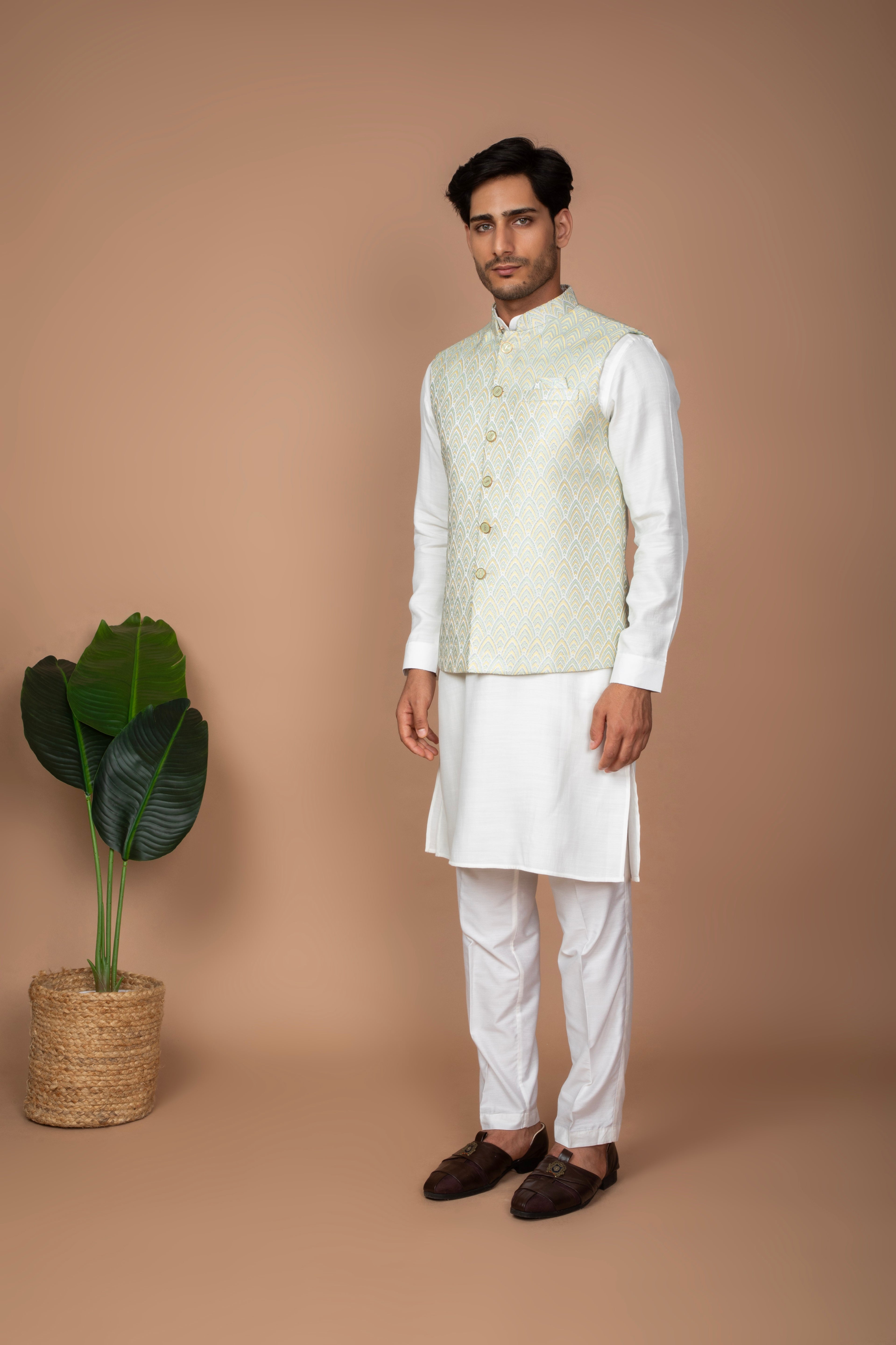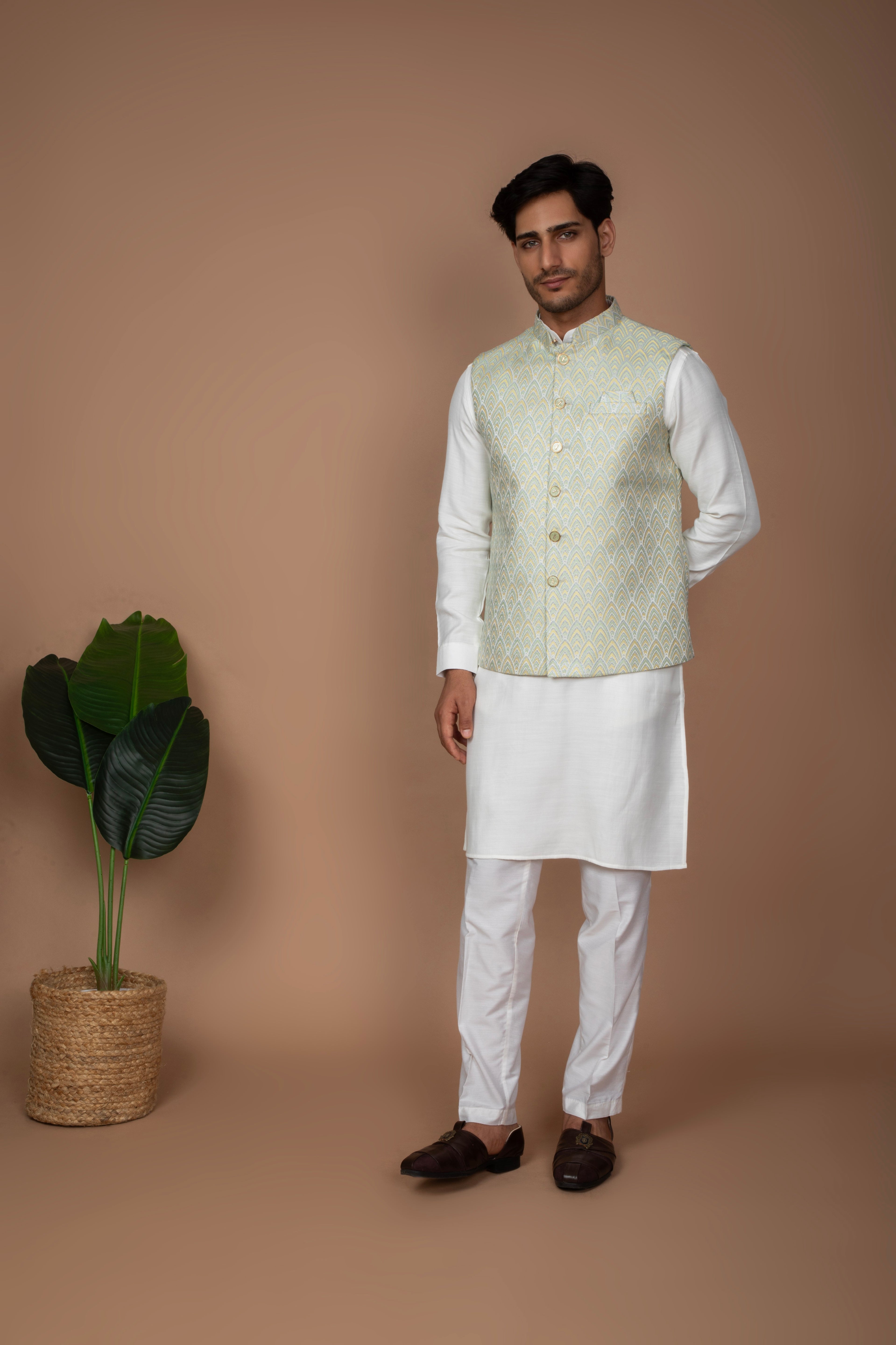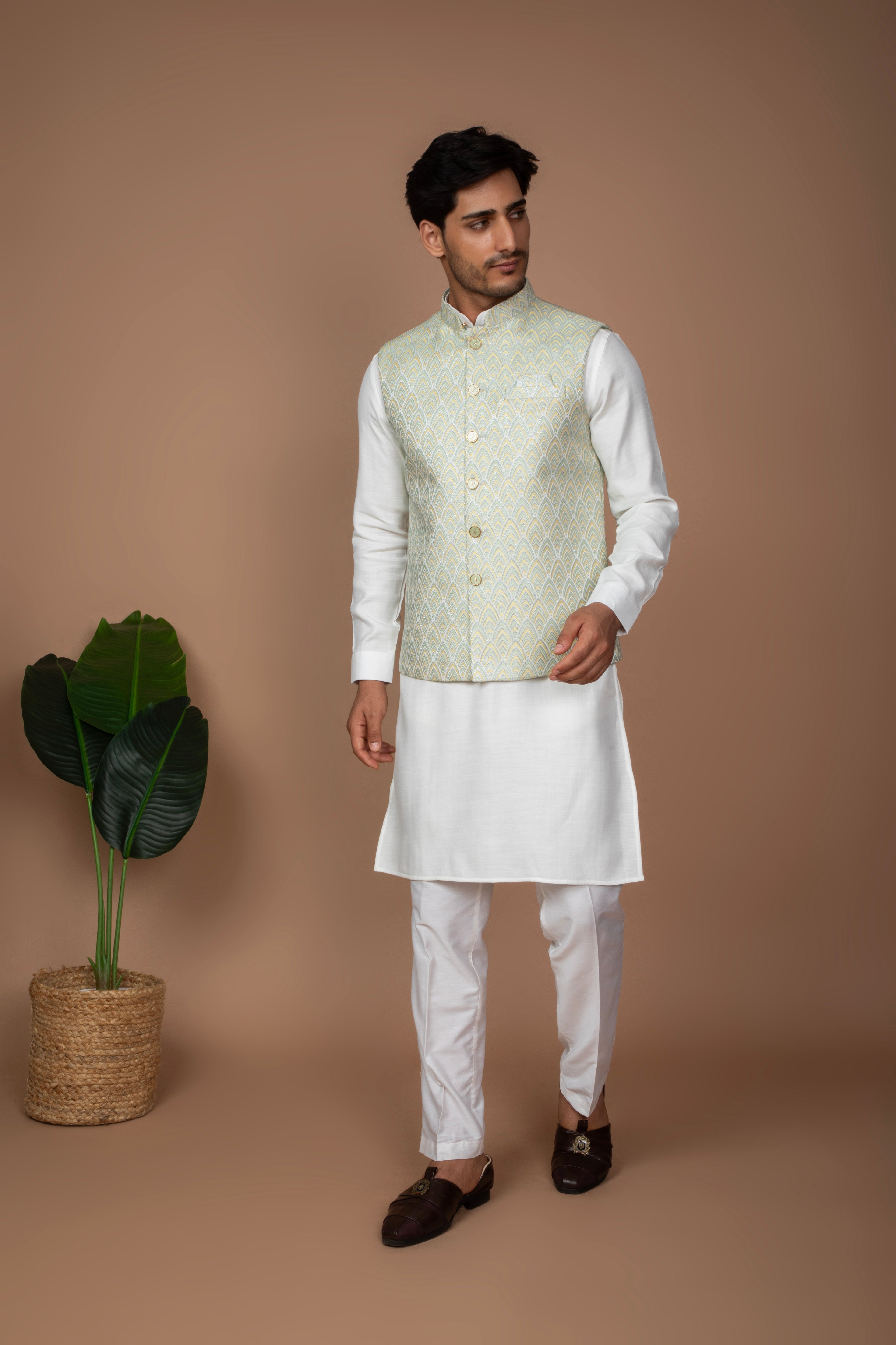 Cream Silk Kurta Jacket Set with Intricate Thread Work