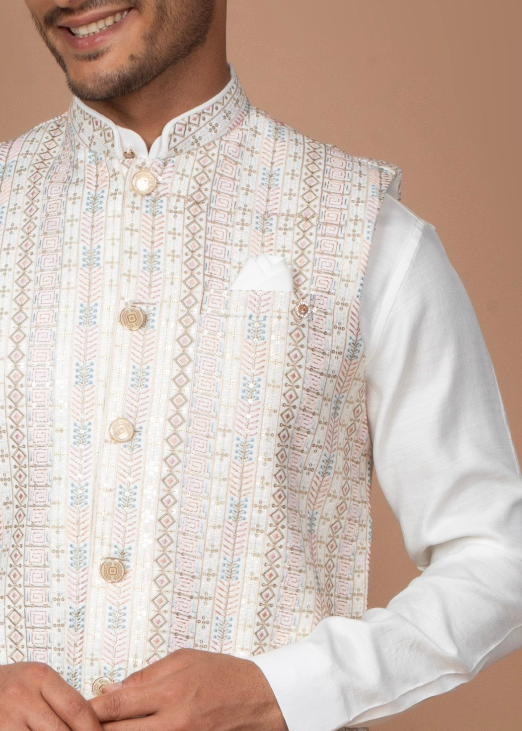 Cream Silk Kurta Jacket Set with Multi-Color Thread Embroidery