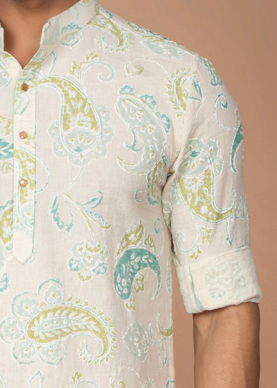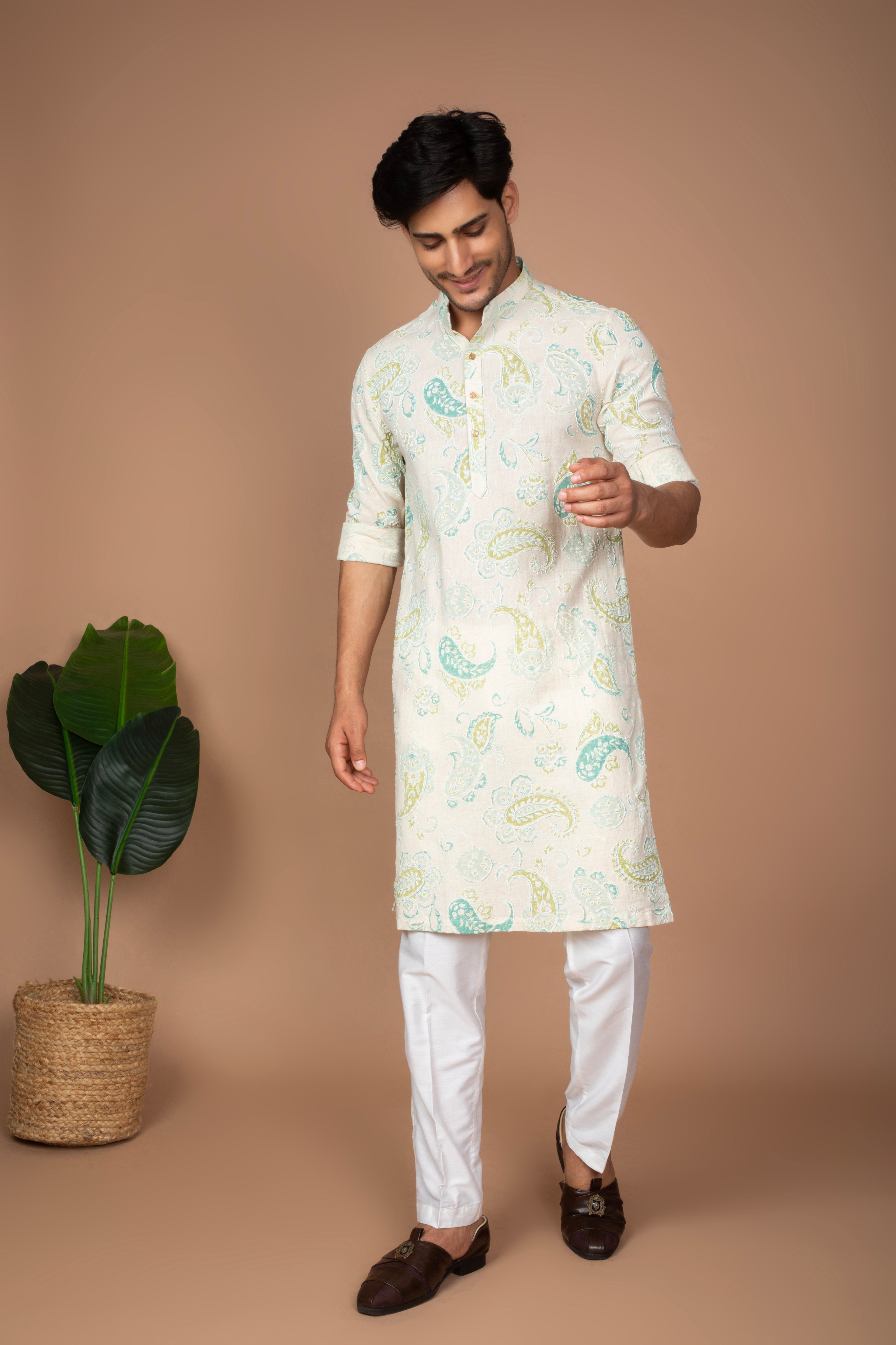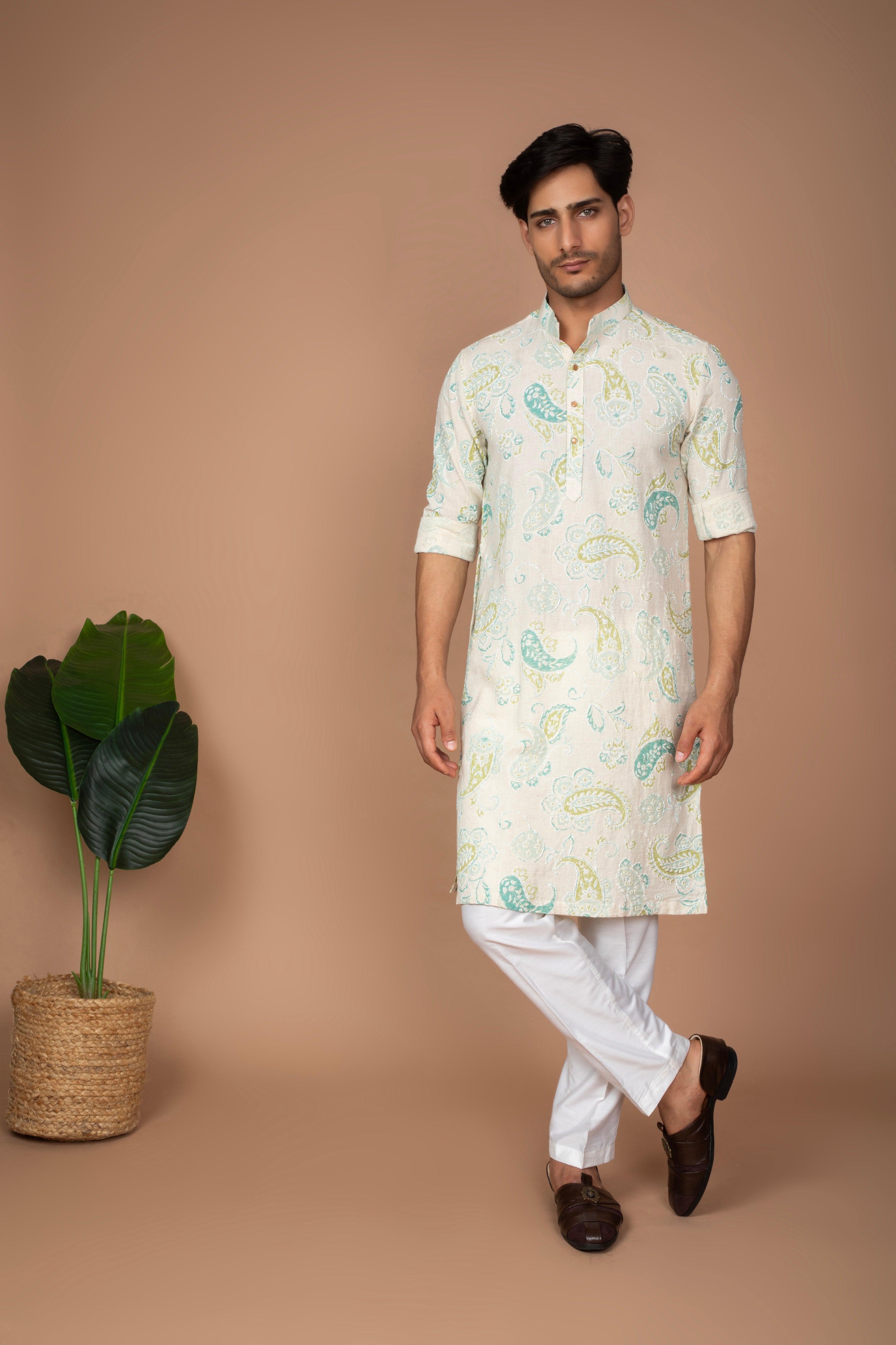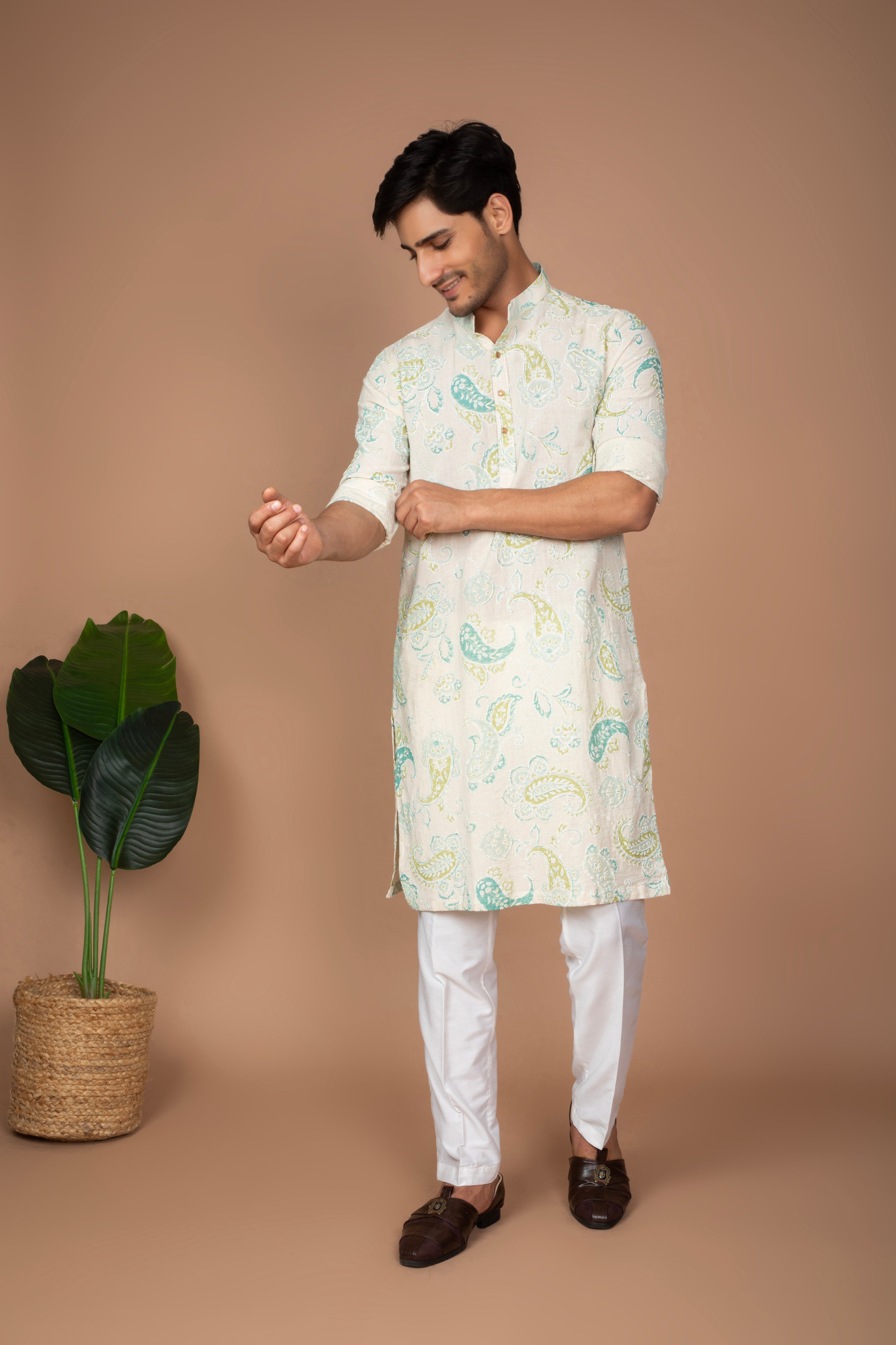 A stylish multi-color printed kurta crafted in a soft cotton blend, featuring an elegant all-over paisley-inspired design. Paired with comfortable trousers, this set is perfect for festive celebrations and casual ethnic wear.