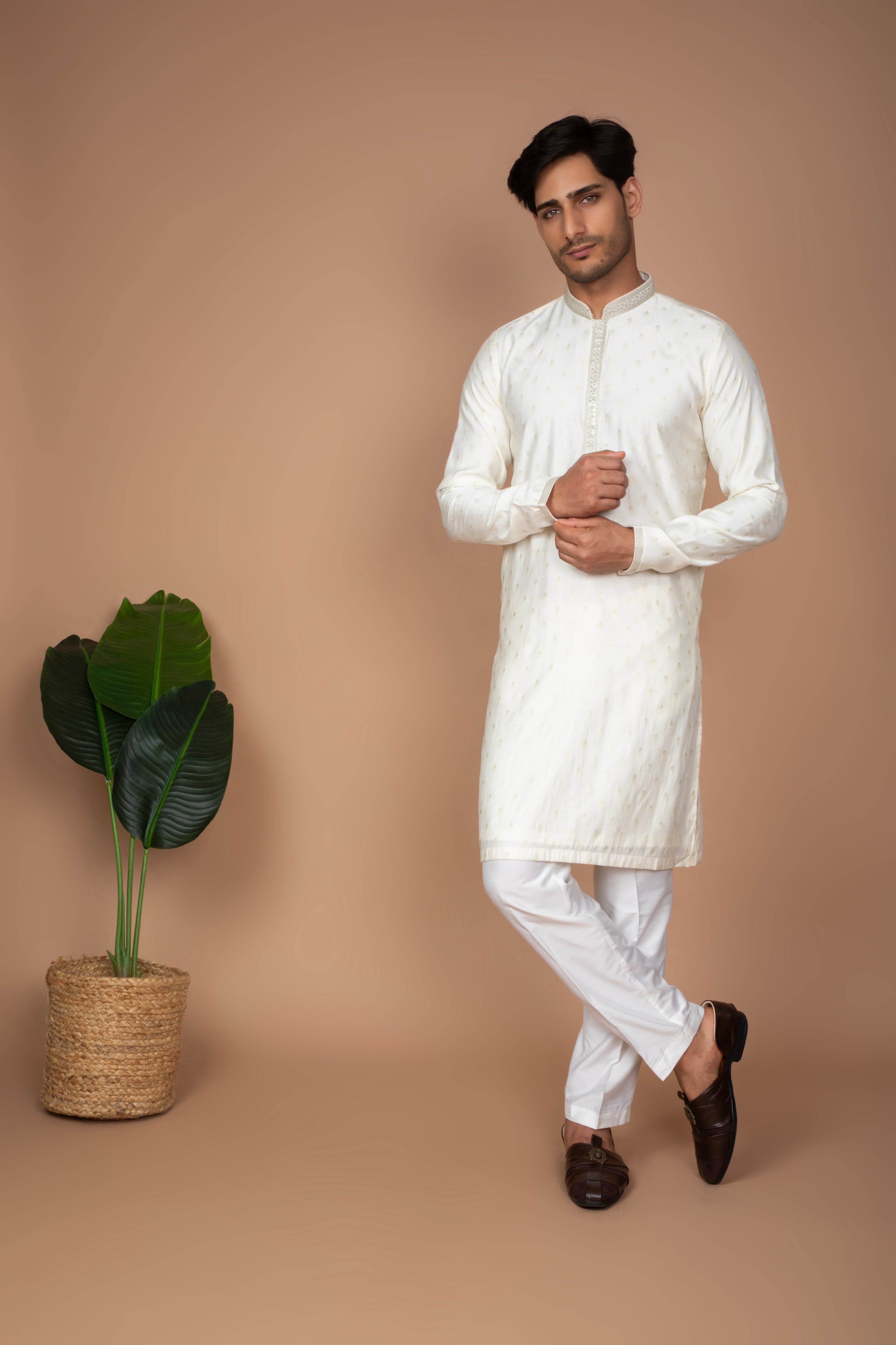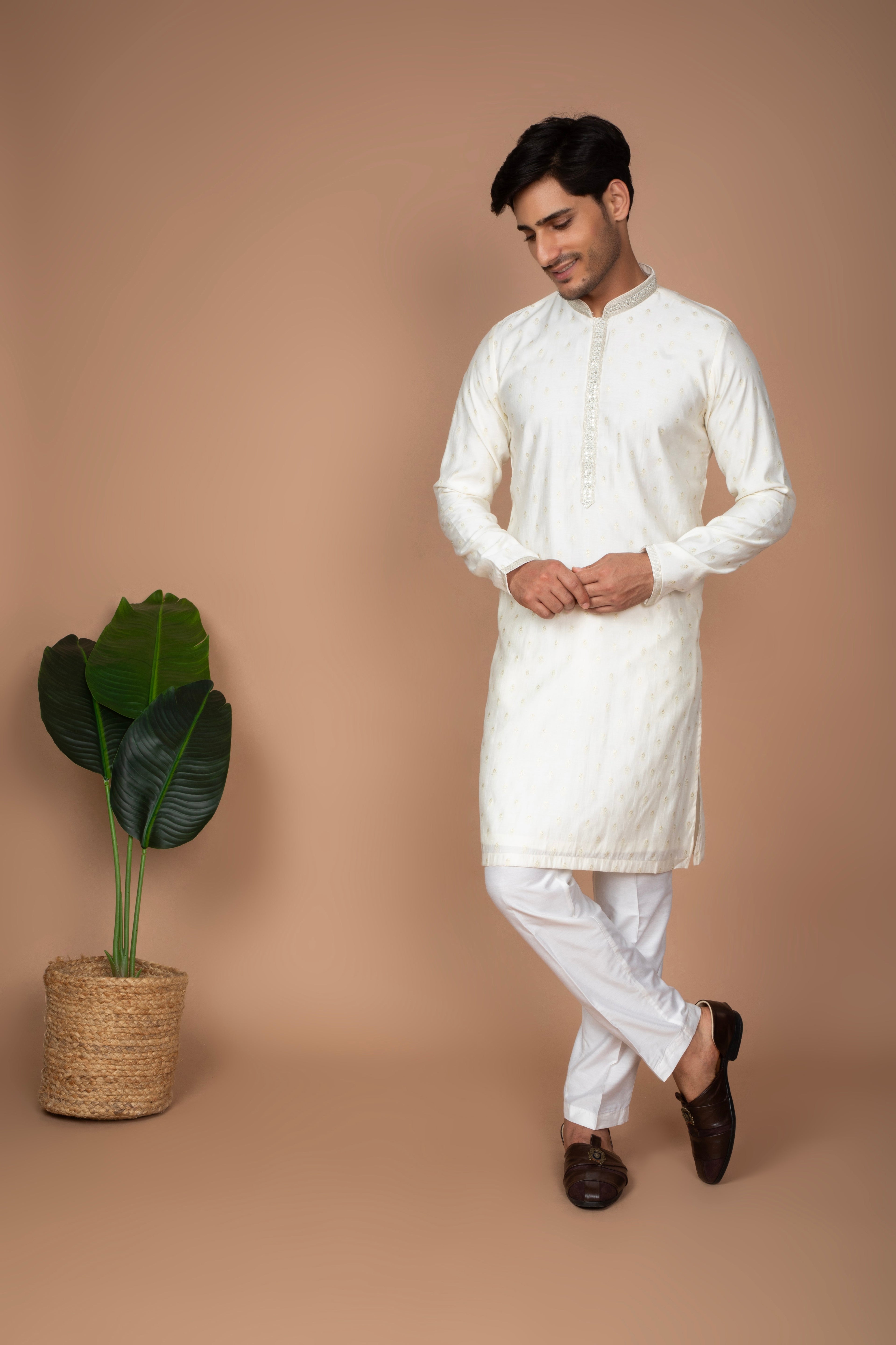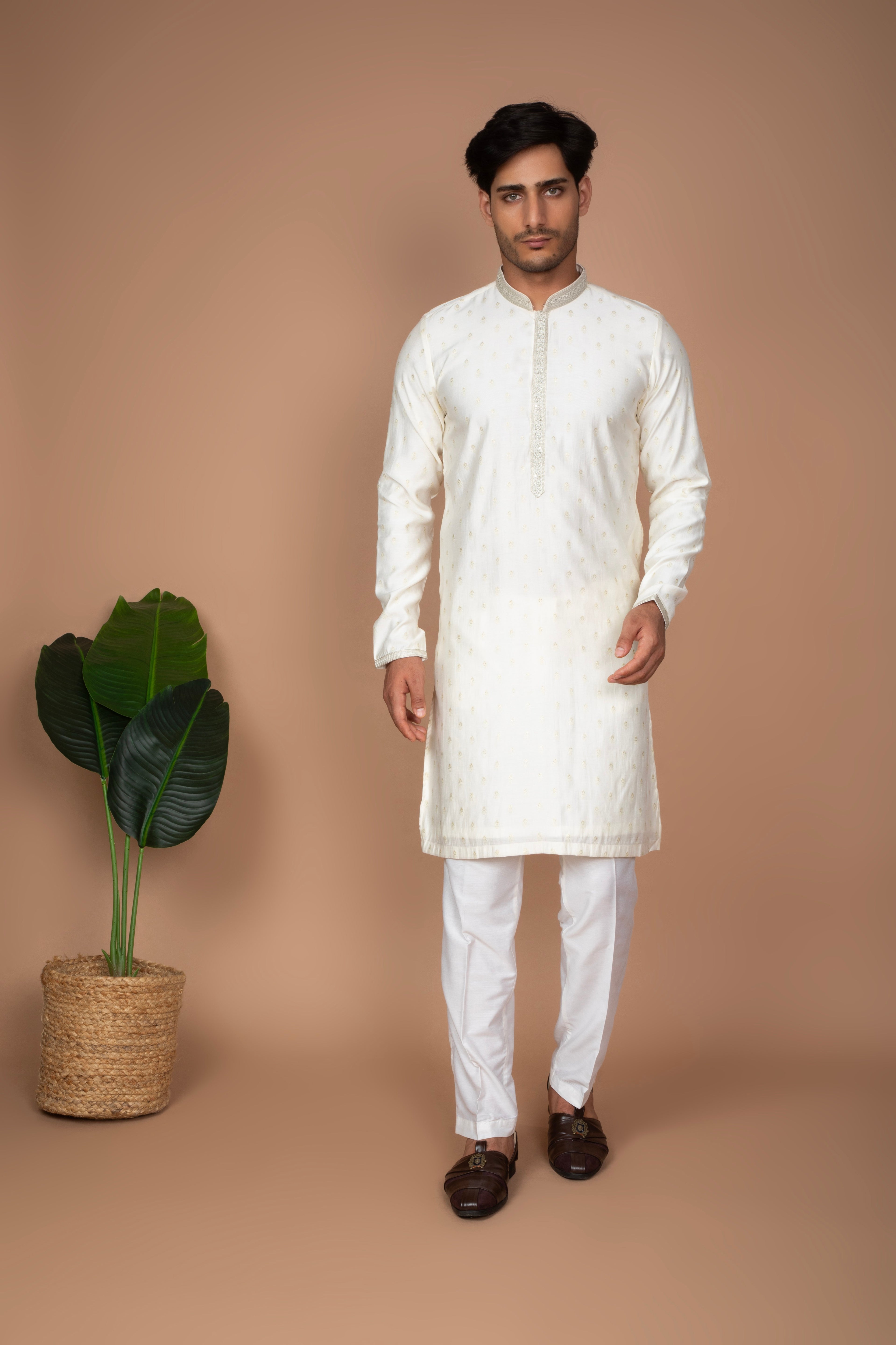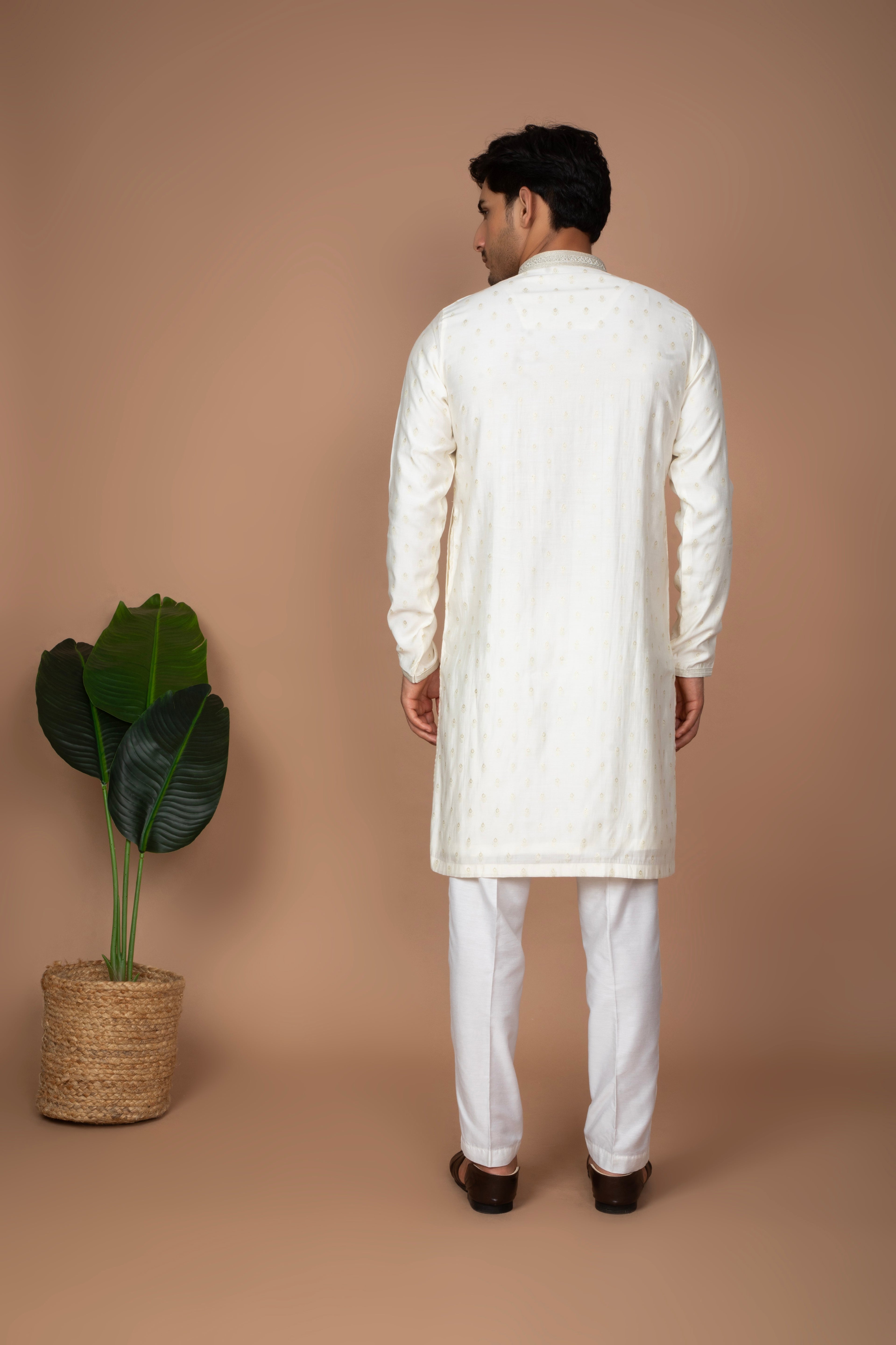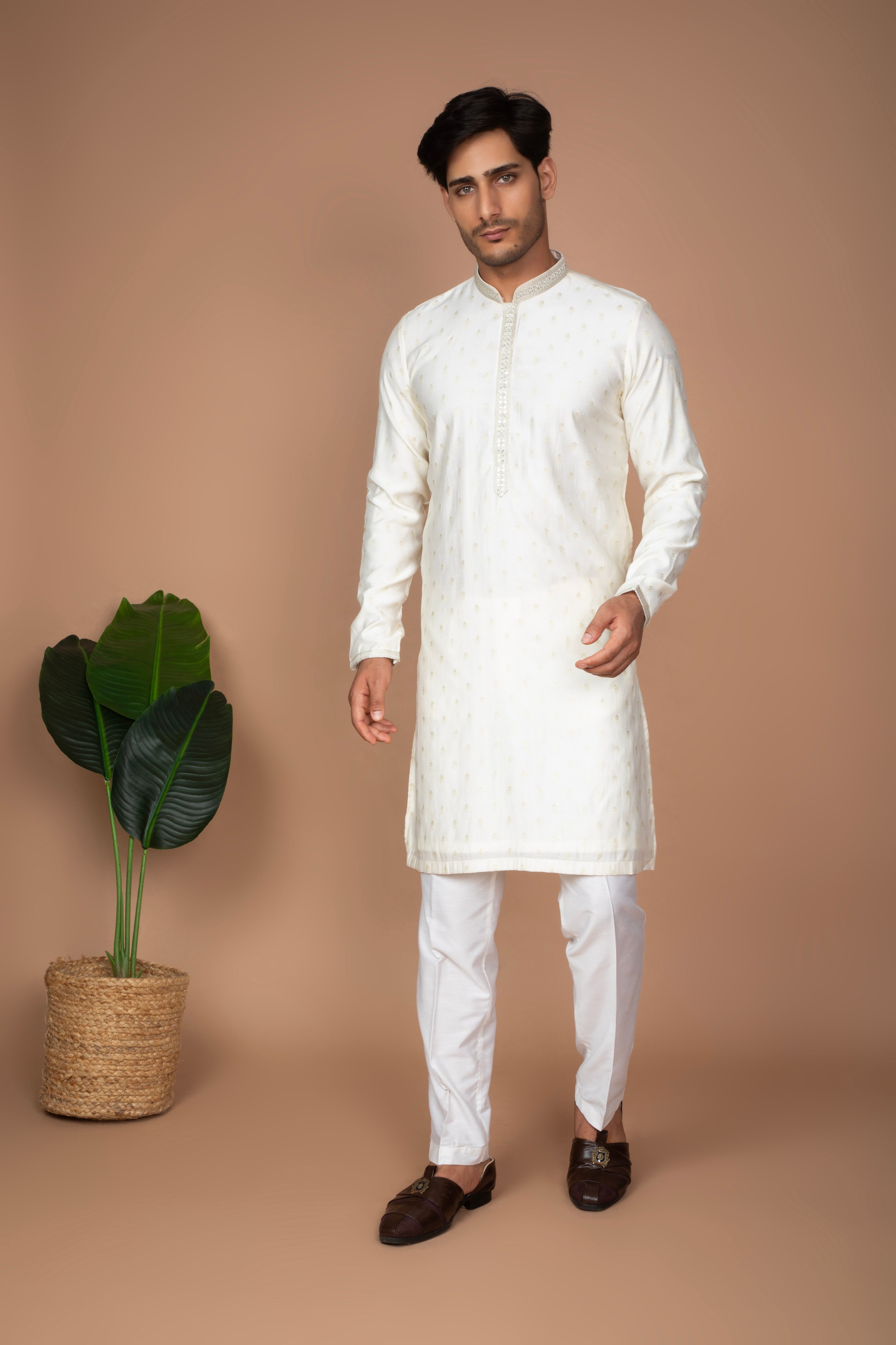 This classic kurta delicate thread embroidery buttis scattered across the front panel and sleeves. The understated embroidery adds a refined touch while maintaining a clean and elegant look. Paired with white trousers, this set offers a timeless and sophisticated appearance, perfect for festive celebrations, pujas, cultural events, and traditional gatherings.
