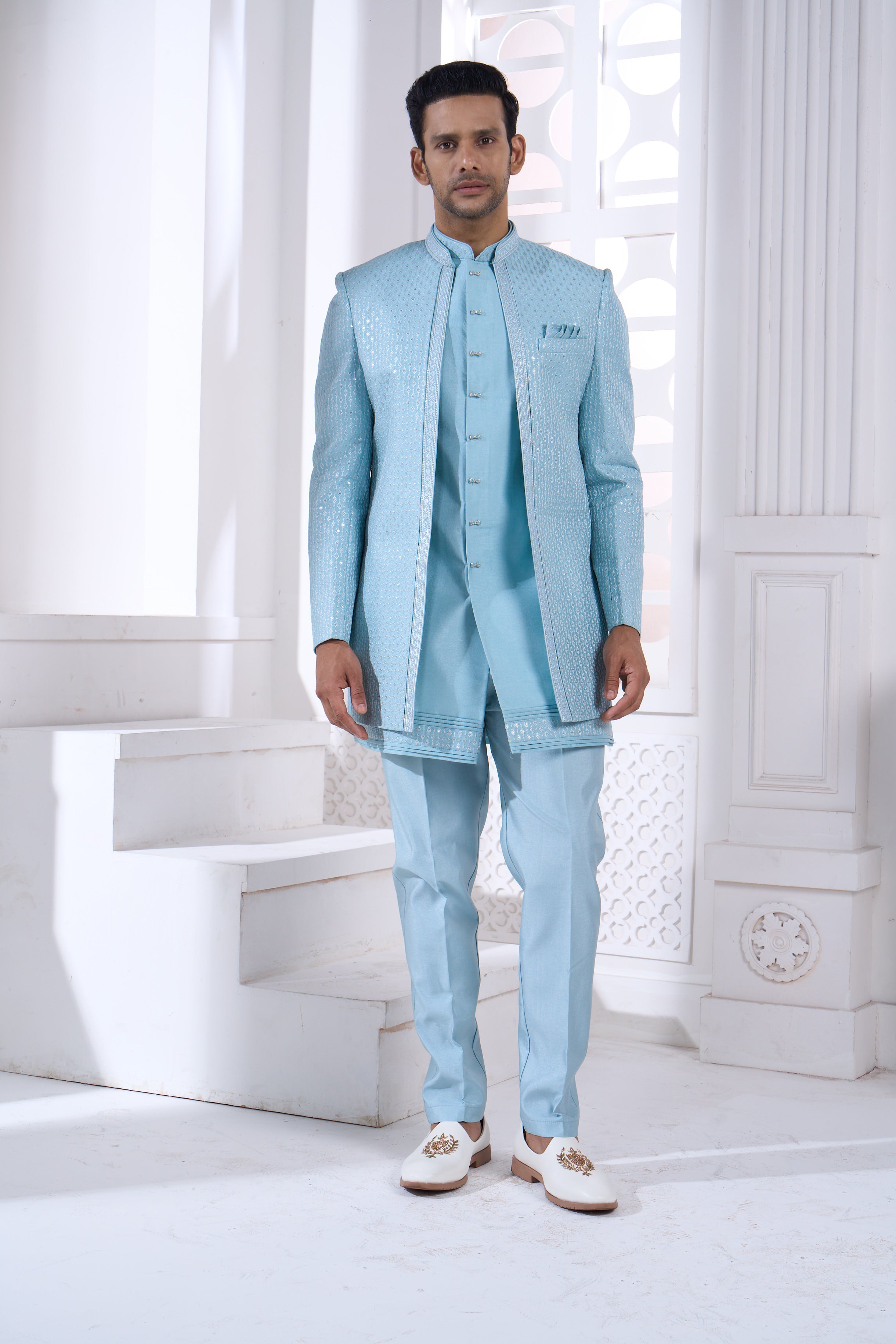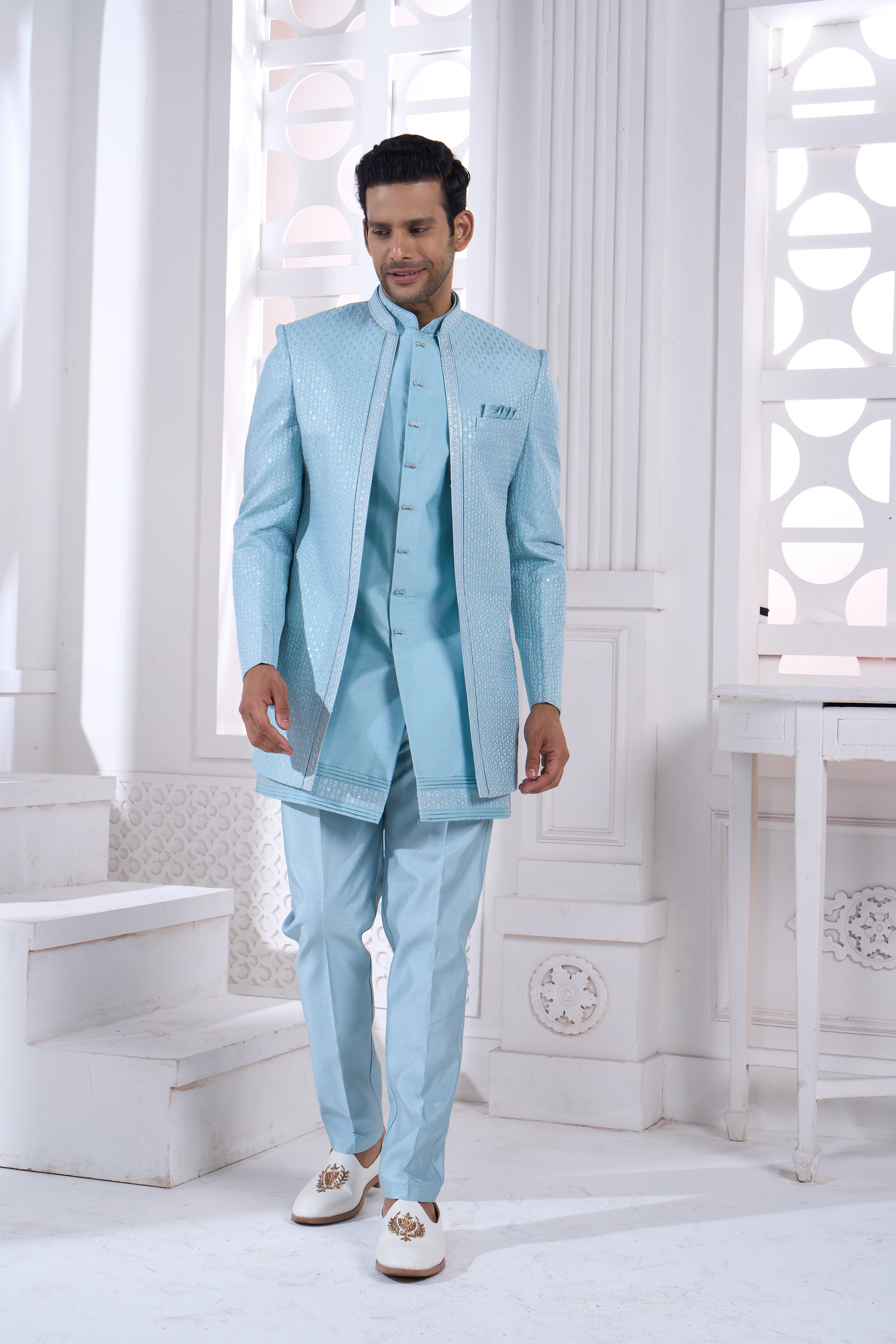 Discover timeless elegance with this Powder Blue Indo-Western Set, where traditional artistry meets modern design. The exquisite line-texture pattern combined with embellished embroidery creates a sophisticated look perfect for weddings and celebrations. The flattering powder blue shade works beautifully with all complexions, while premium craftsmanship ensures both comfort and style. Ideal for making a graceful impression at festive occasions and special events.