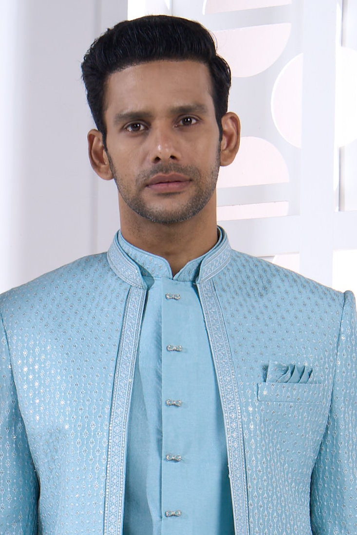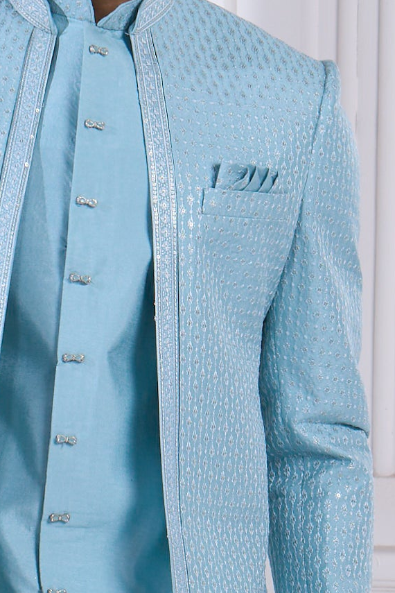 Powder Blue Indo-Western Set with Line-Texture Pattern and Embellished Embroidery