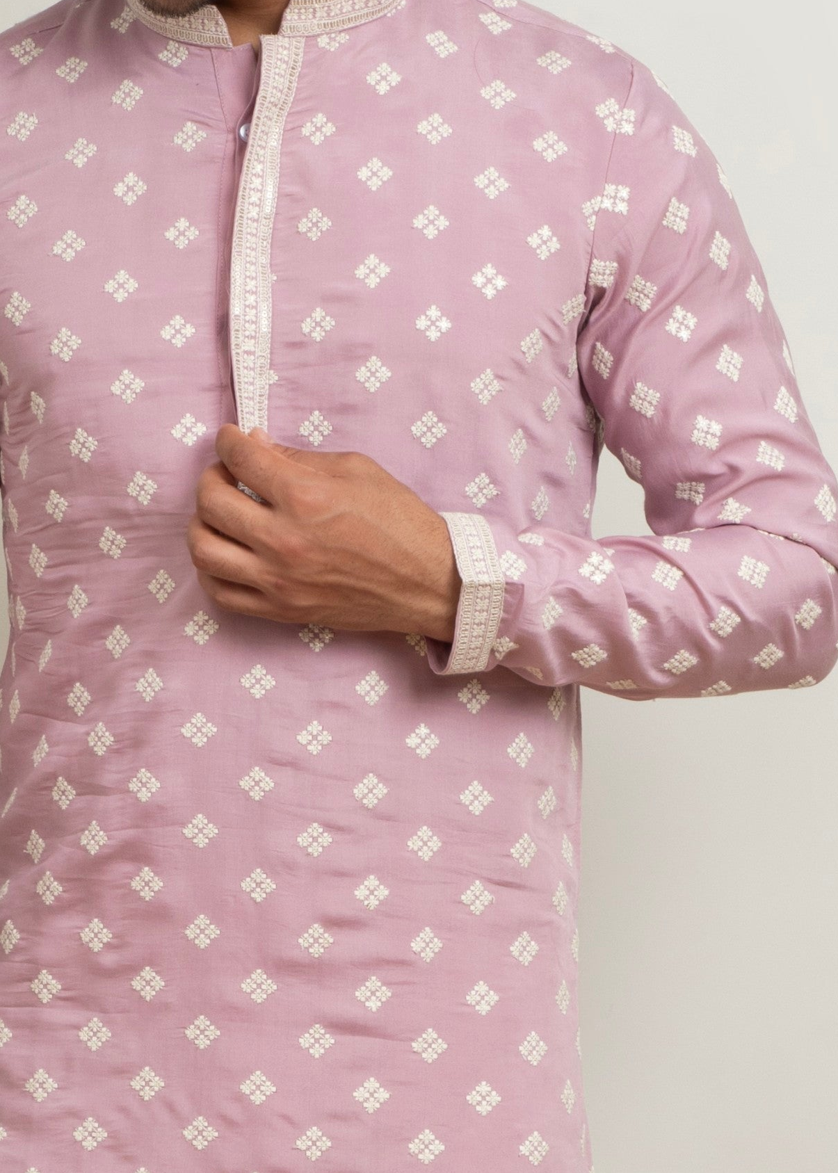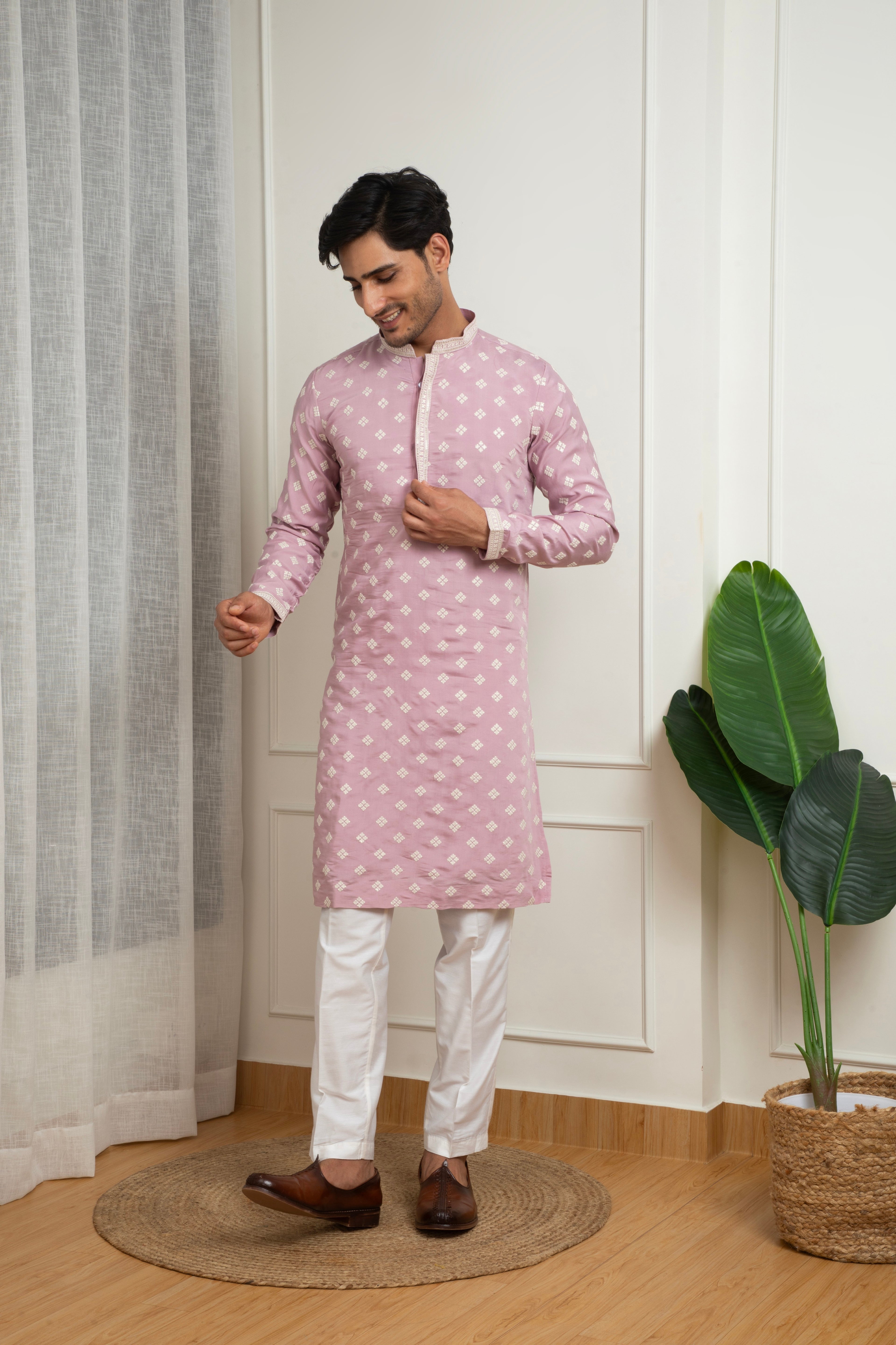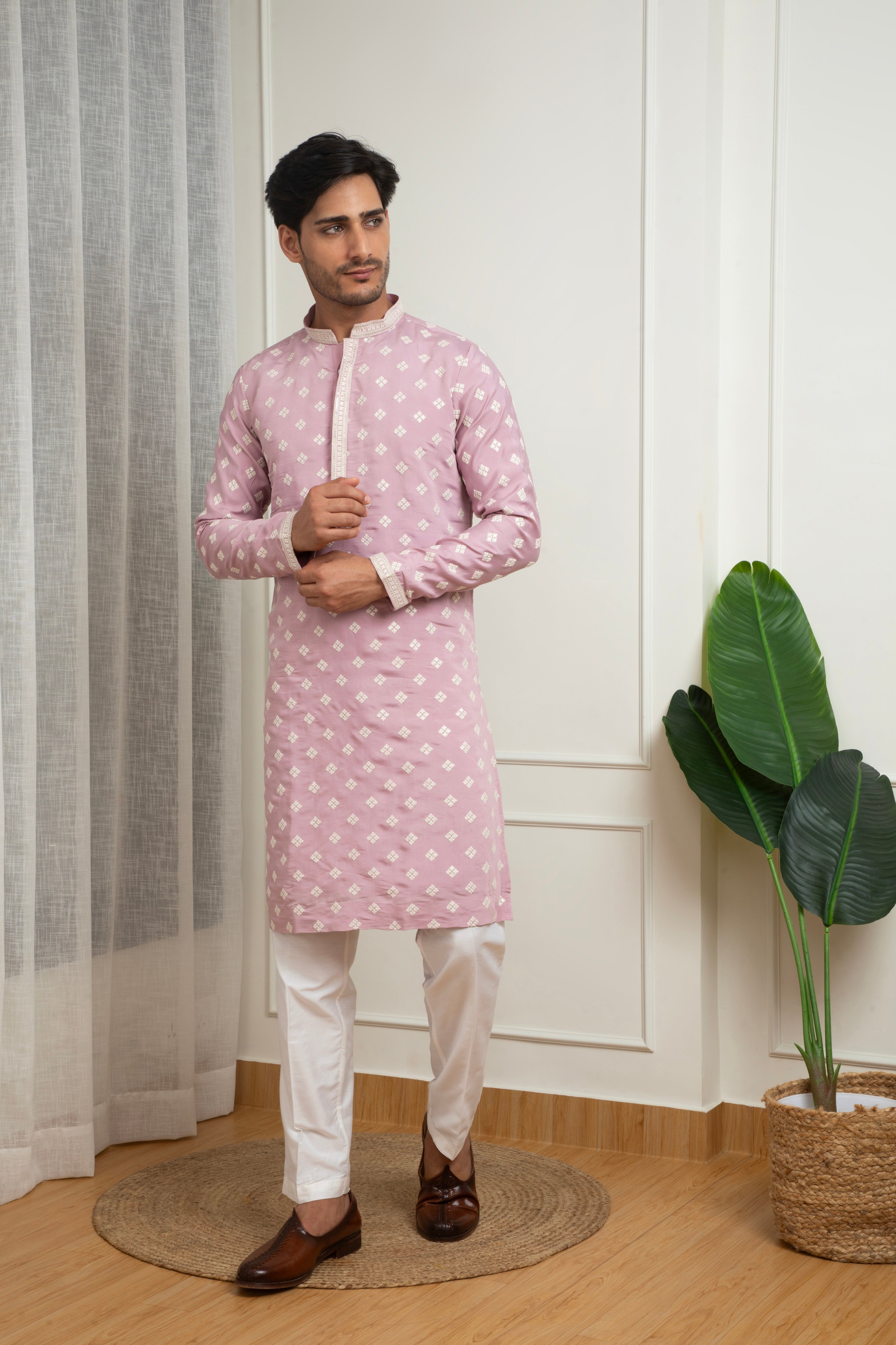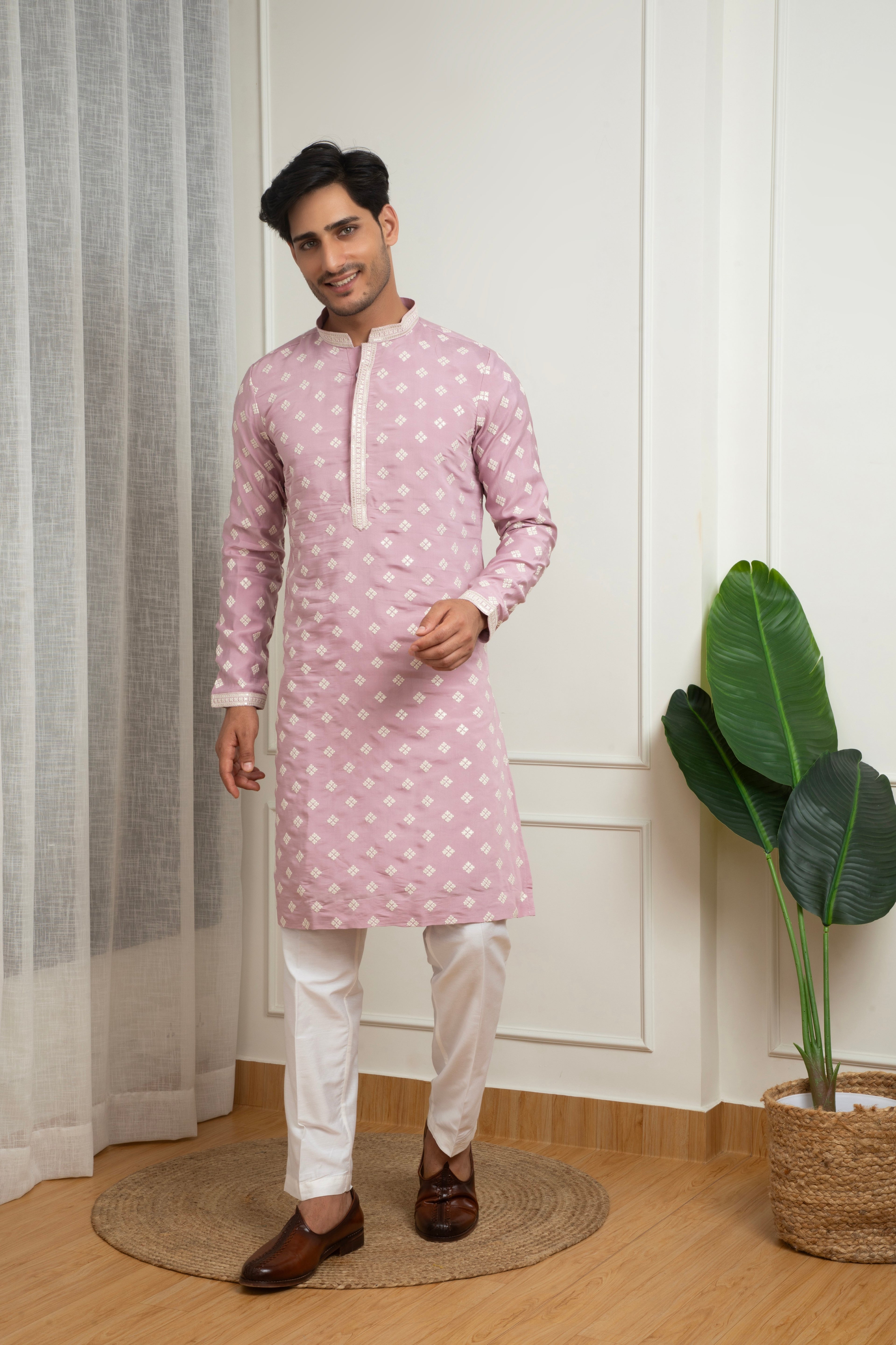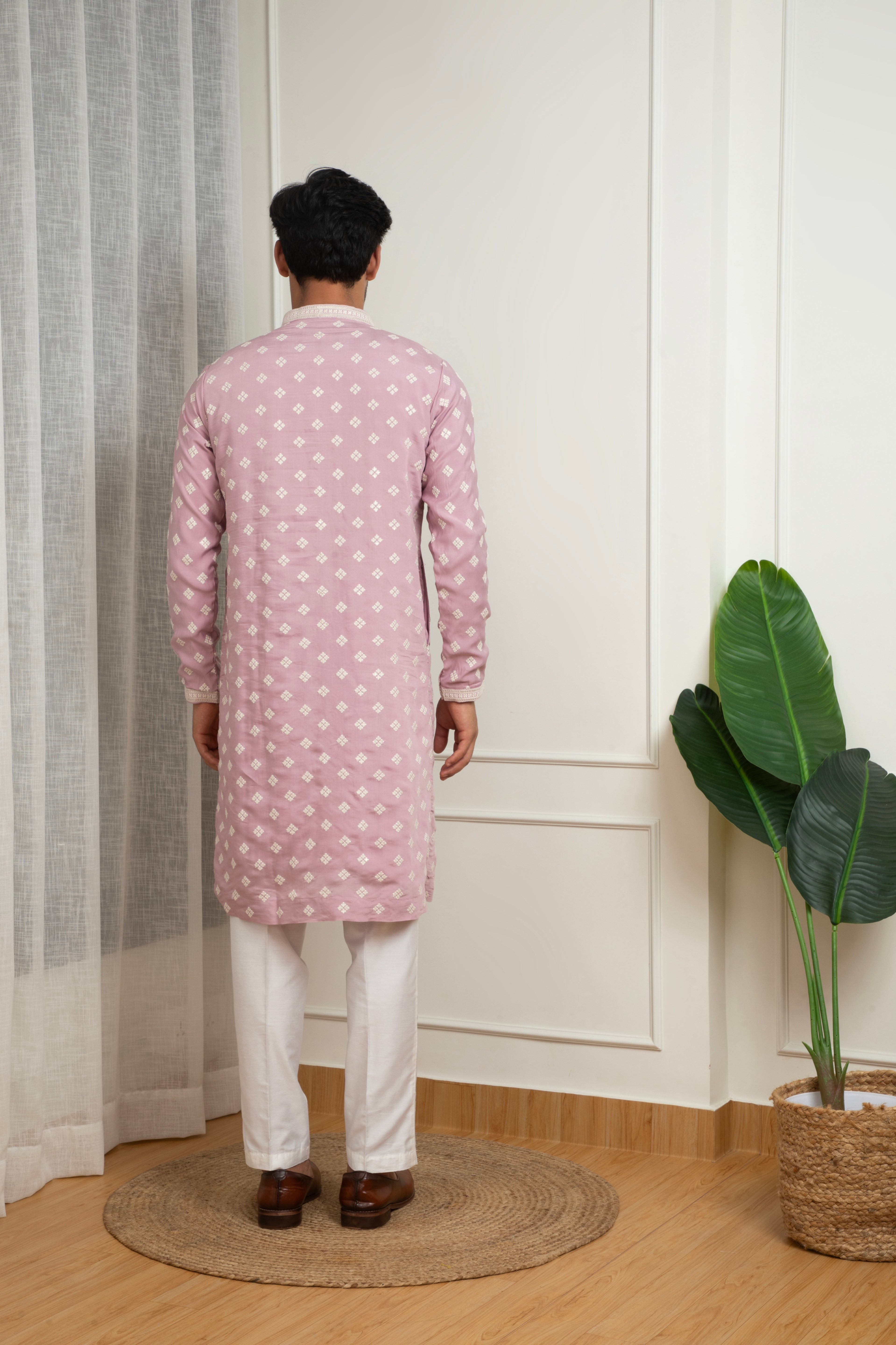 A graceful soft pink kurta set crafted in a comfortable cotton blend, featuring delicate thread butti motifs arranged in a uniform pattern. The subtle embroidered detailing paired with a clean straight-fit silhouette makes this outfit ideal for festive gatherings, daytime events, and cultural celebrations. Paired with white trousers, it offers a refined and elegant traditional look.