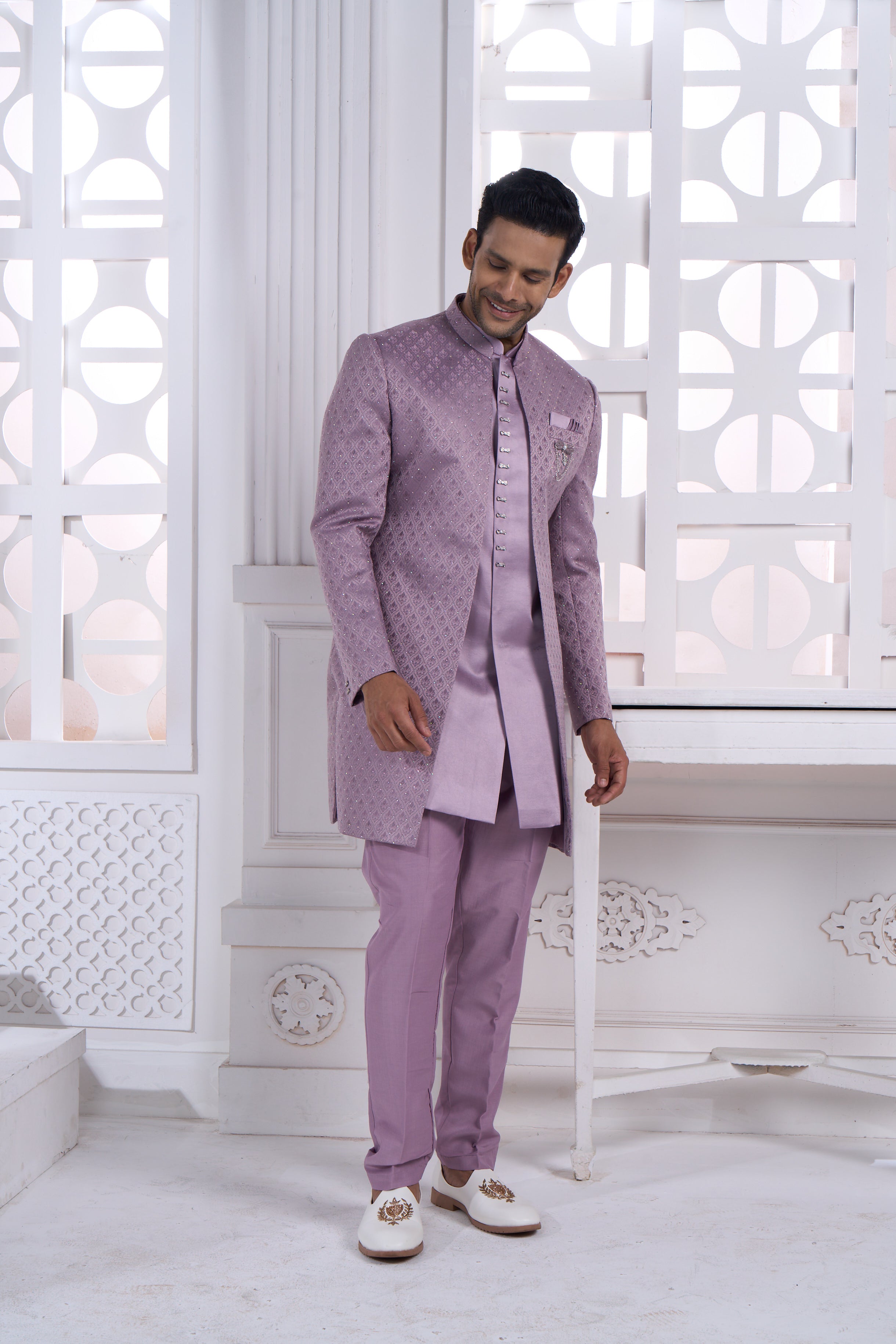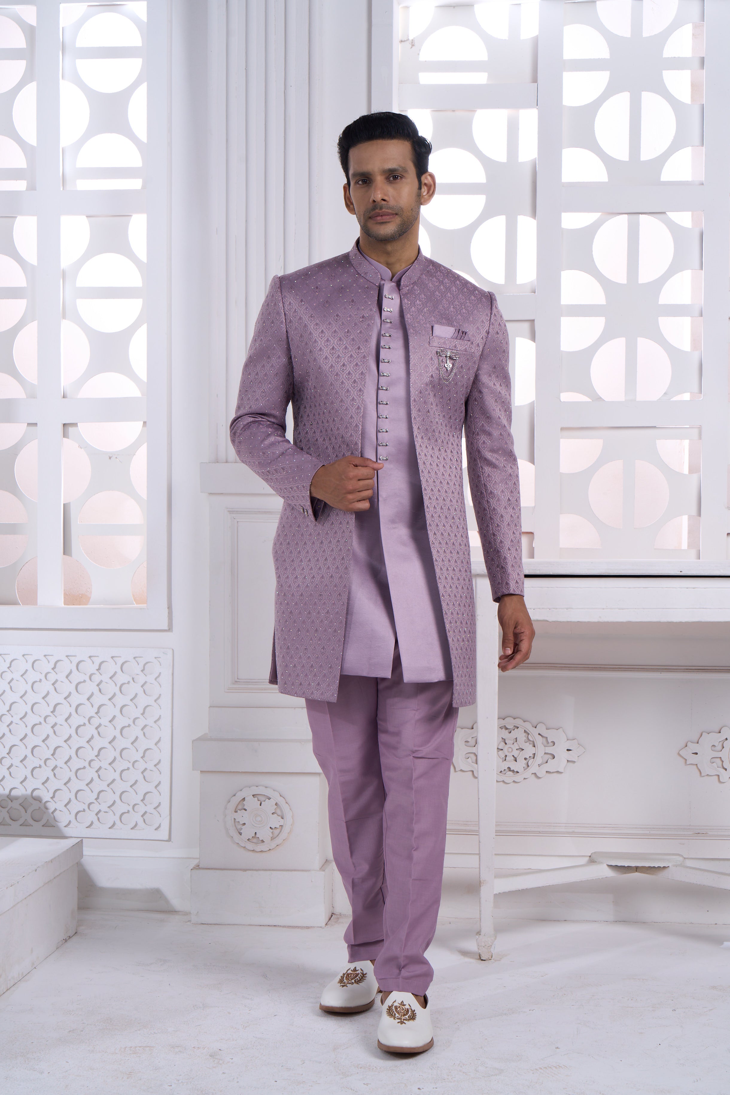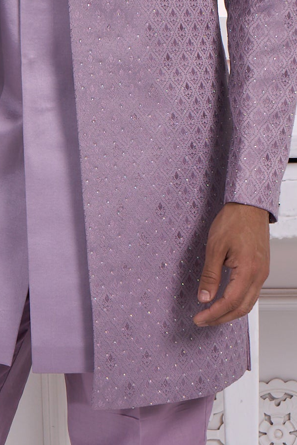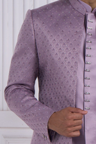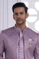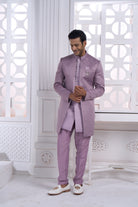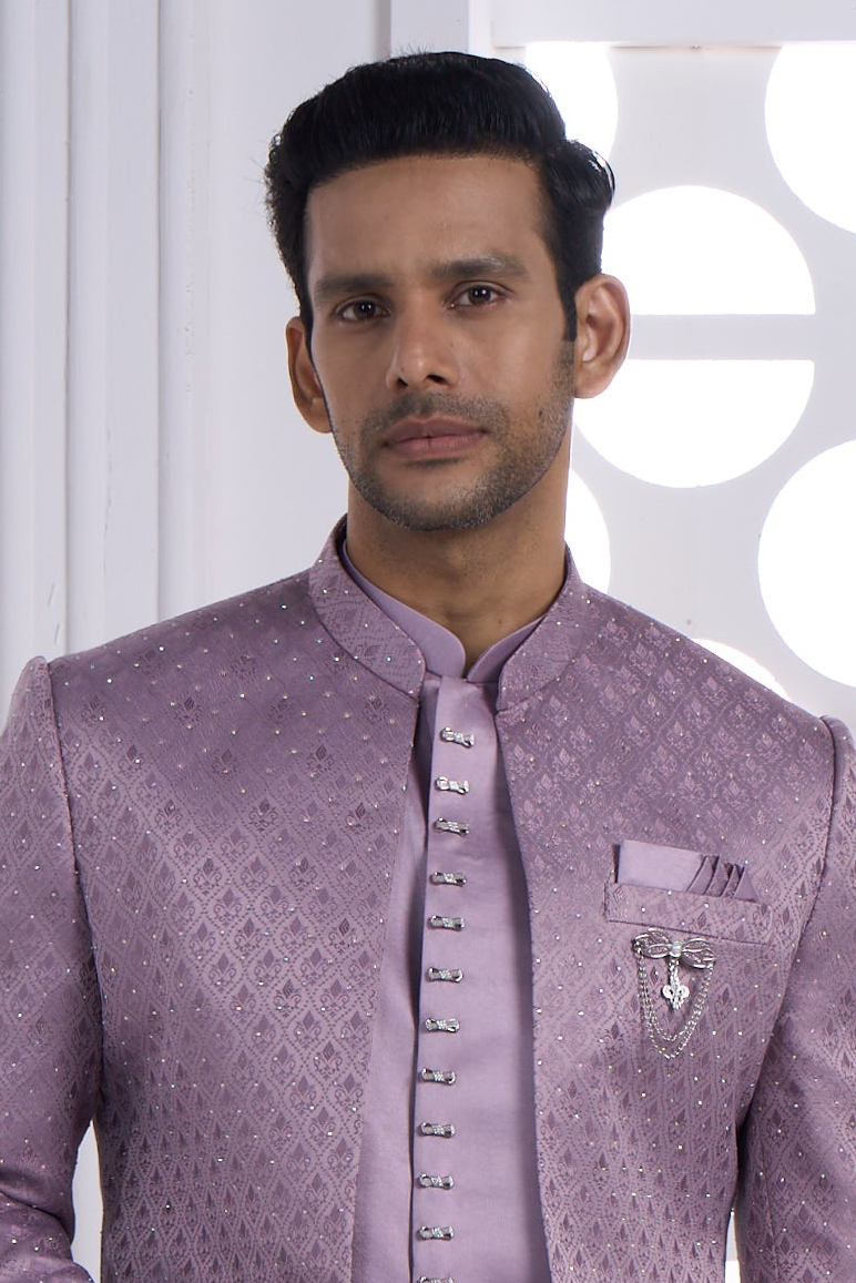 Elevate your wedding festivities with this exquisite Lilac Indo-Western Set, where traditional artistry meets contemporary elegance. The richly textured and embellished pattern showcases masterful craftsmanship, while the sophisticated lilac shade radiates understated luxury. Complemented by a striking statement brooch, this ensemble is designed for the modern groom seeking refined style. Perfect for roka ceremonies, engagements, and wedding celebrations, it seamlessly blends cultural heritage with modern sensibilities. Experience the perfect balance of comfort and confidence for your most memorable occasions.
