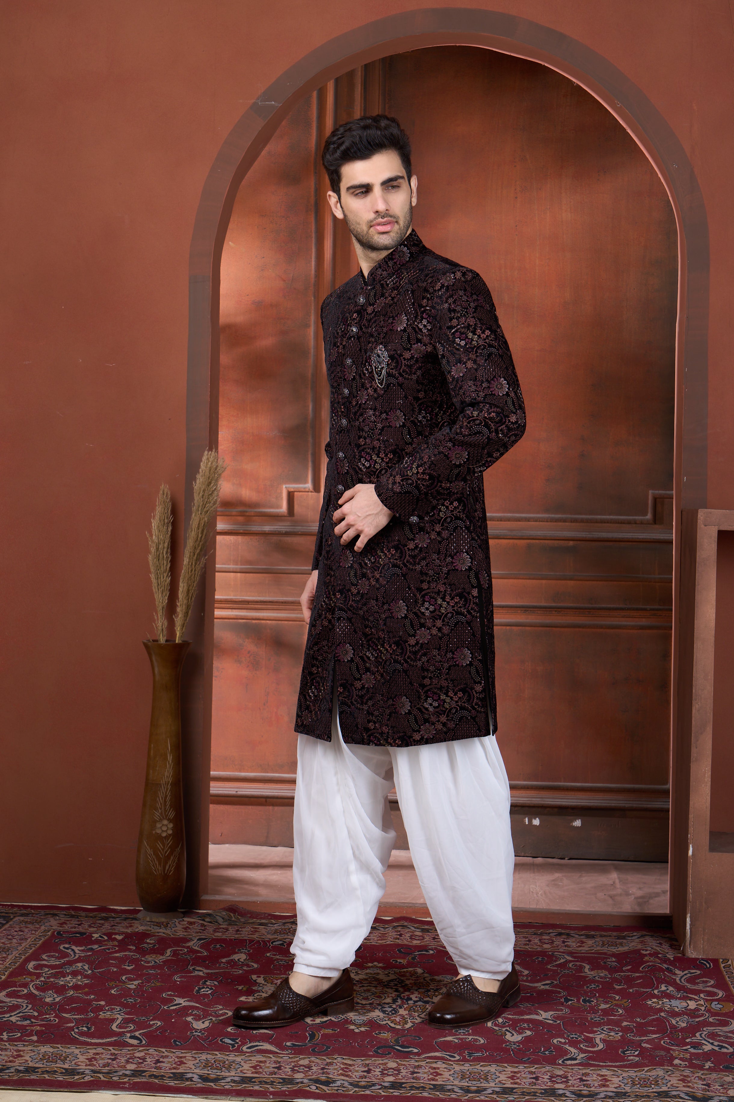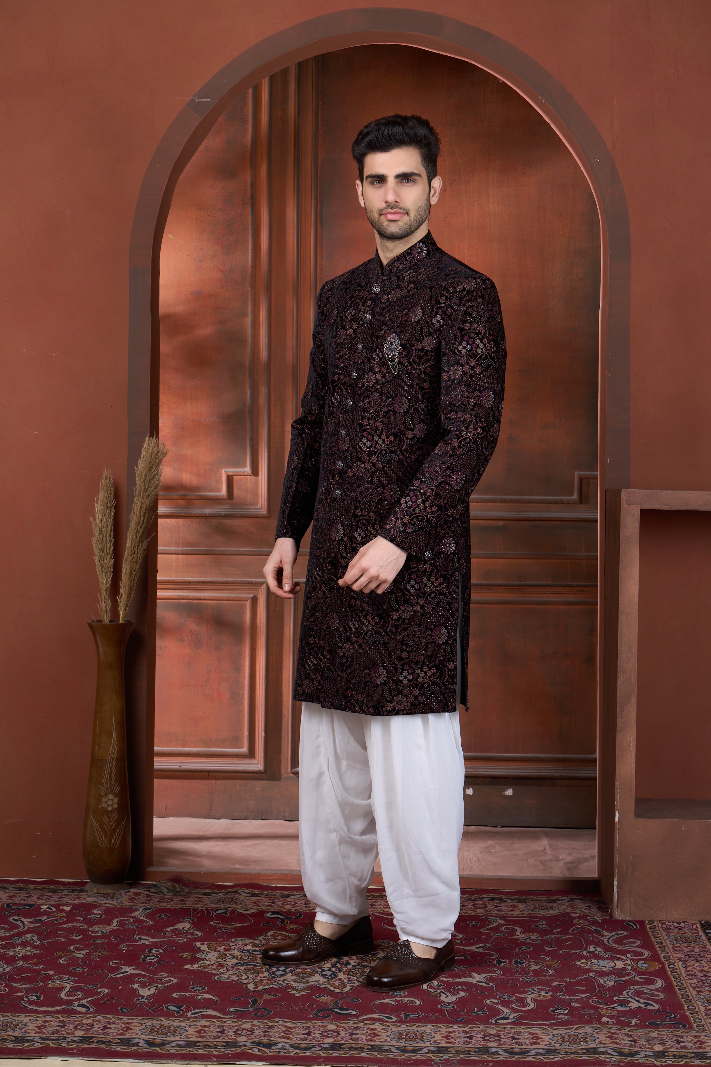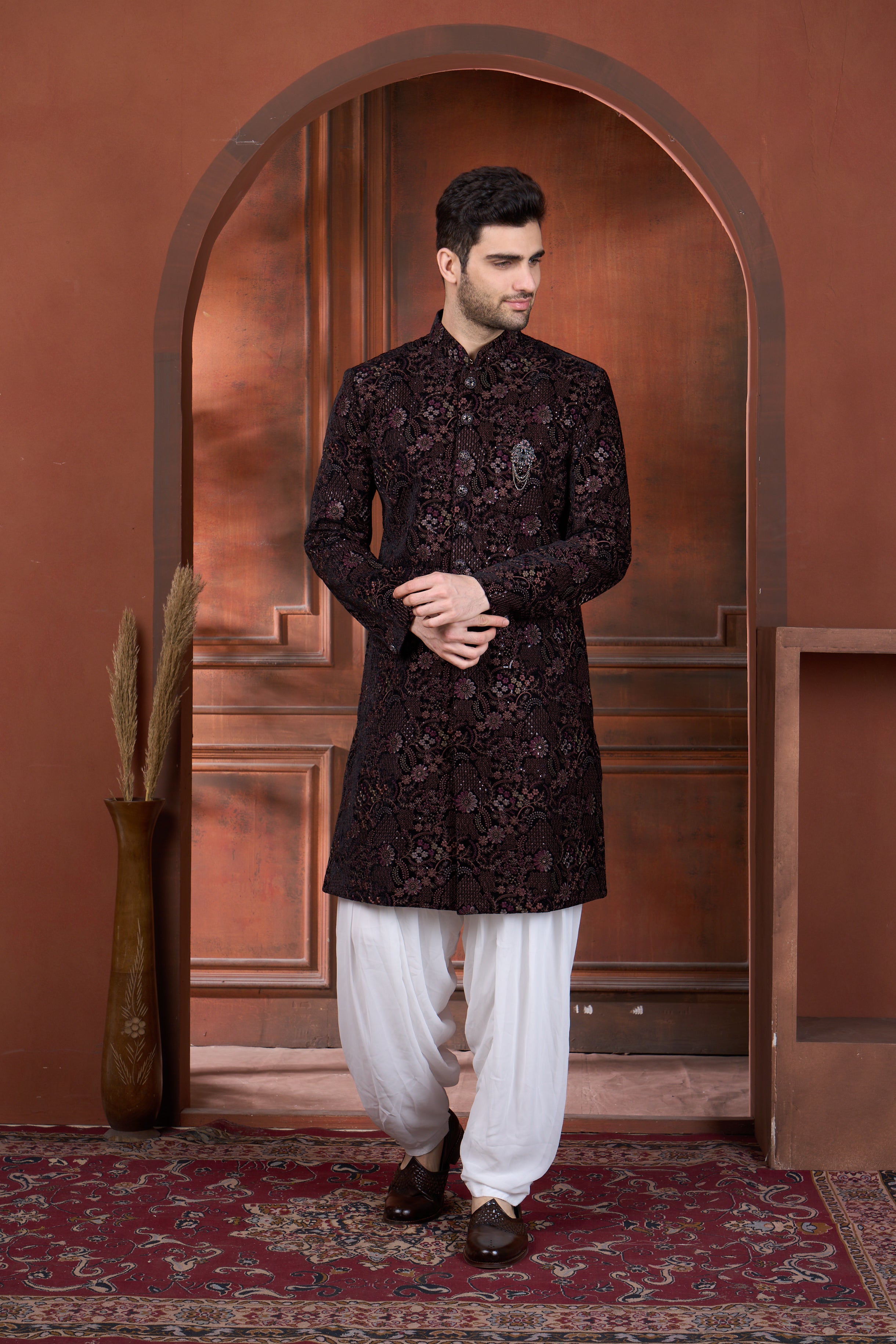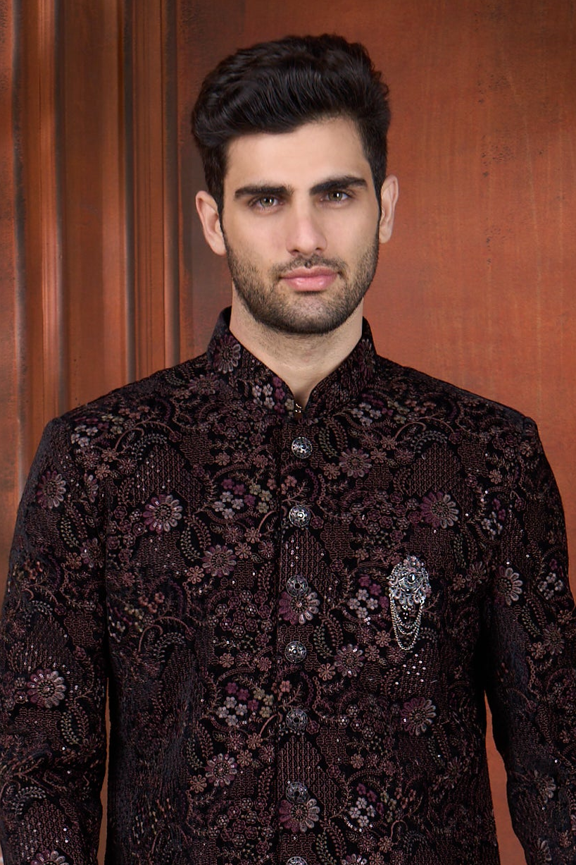 Make a statement at every celebration with this striking Black Semi Indo-Western ensemble, featuring exquisite maroon-shaded floral embroidery that captures attention without overwhelming. The sophisticated color palette complements all skin tones, while the refined embroidery work adds depth and elegance. Designed for groomsmen, friends, and family members, this versatile piece is perfect for sangeet nights, wedding ceremonies, receptions, and engagement parties. The semi-Western silhouette offers contemporary comfort with traditional artistry, allowing you to honor cultural heritage while embracing modern style. An essential addition to your festive wardrobe that transitions seamlessly across multiple celebrations.