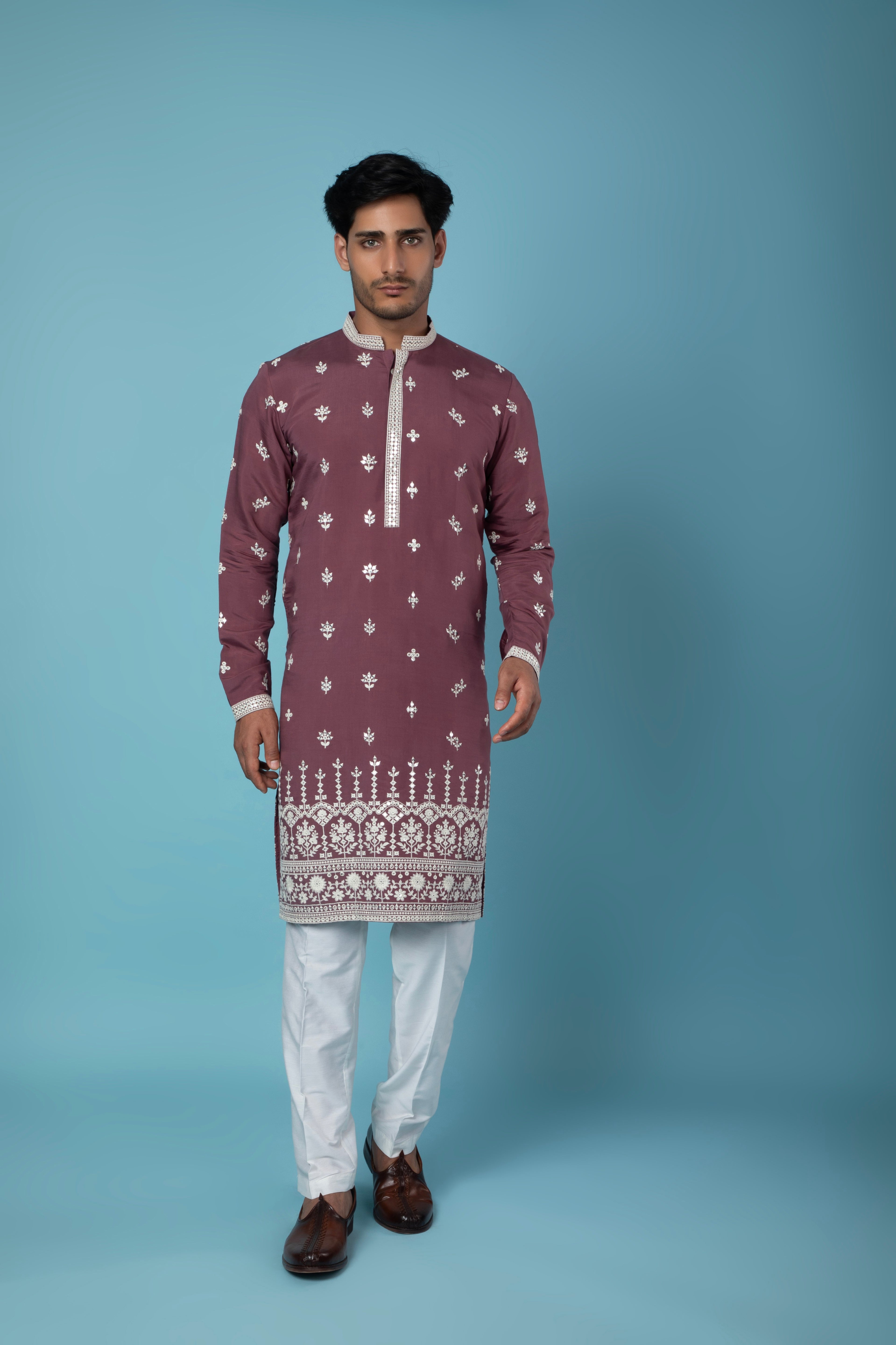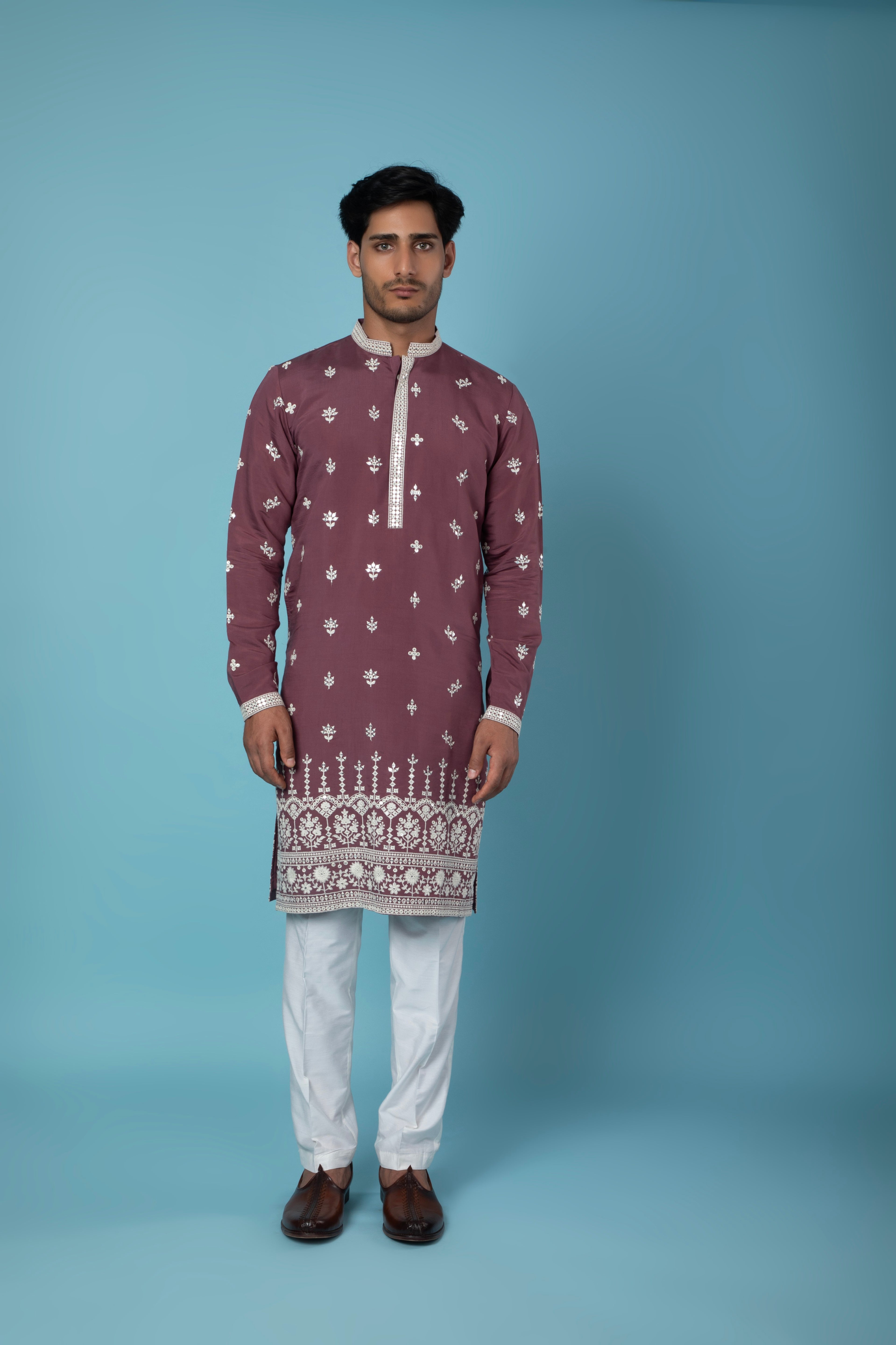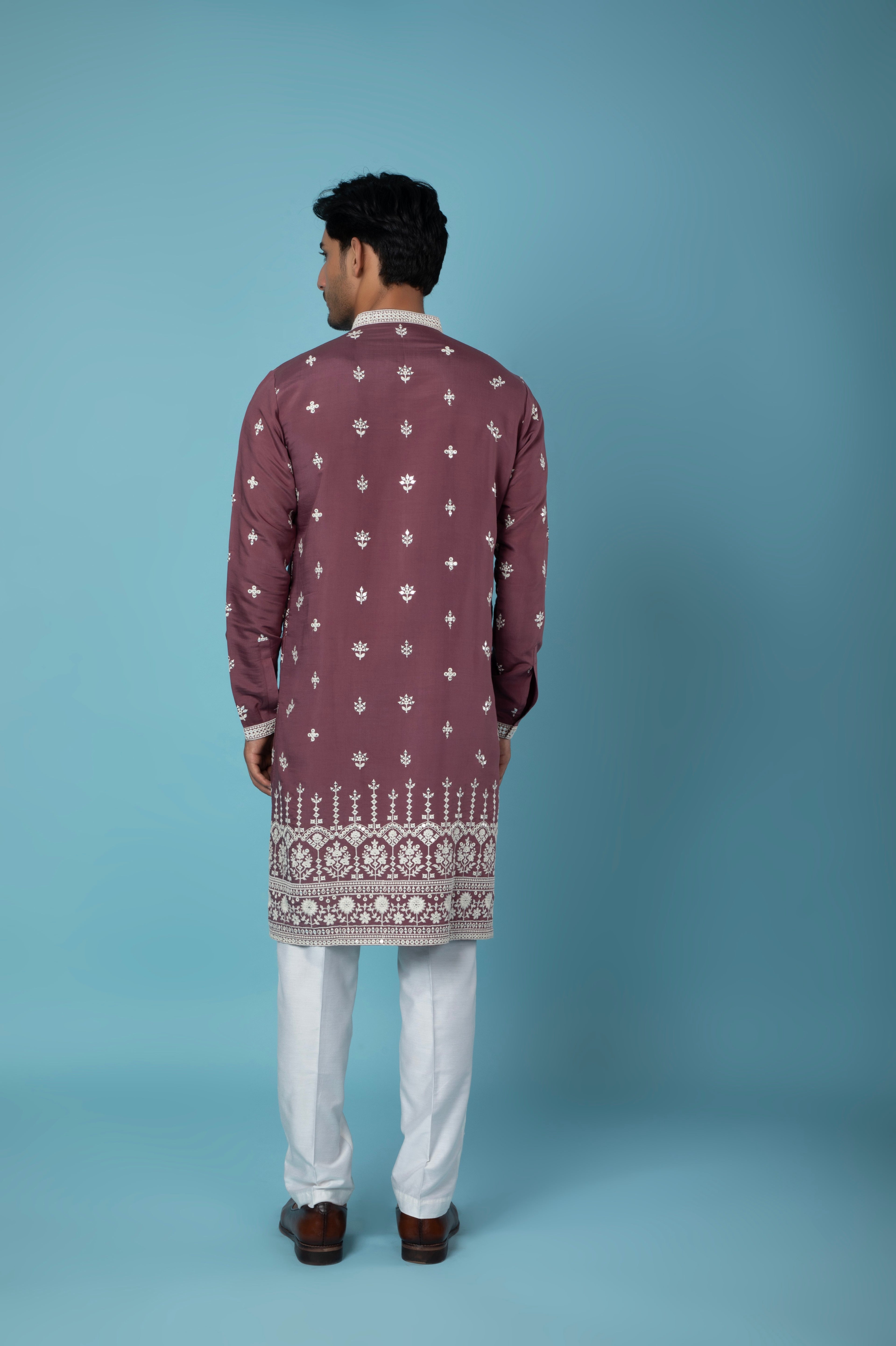 A refined mauve kurta highlighted with intricate white embroidery across the neckline, sleeves, and border. The soft contrast and elegant craftsmanship make it a standout choice for festive occasions.