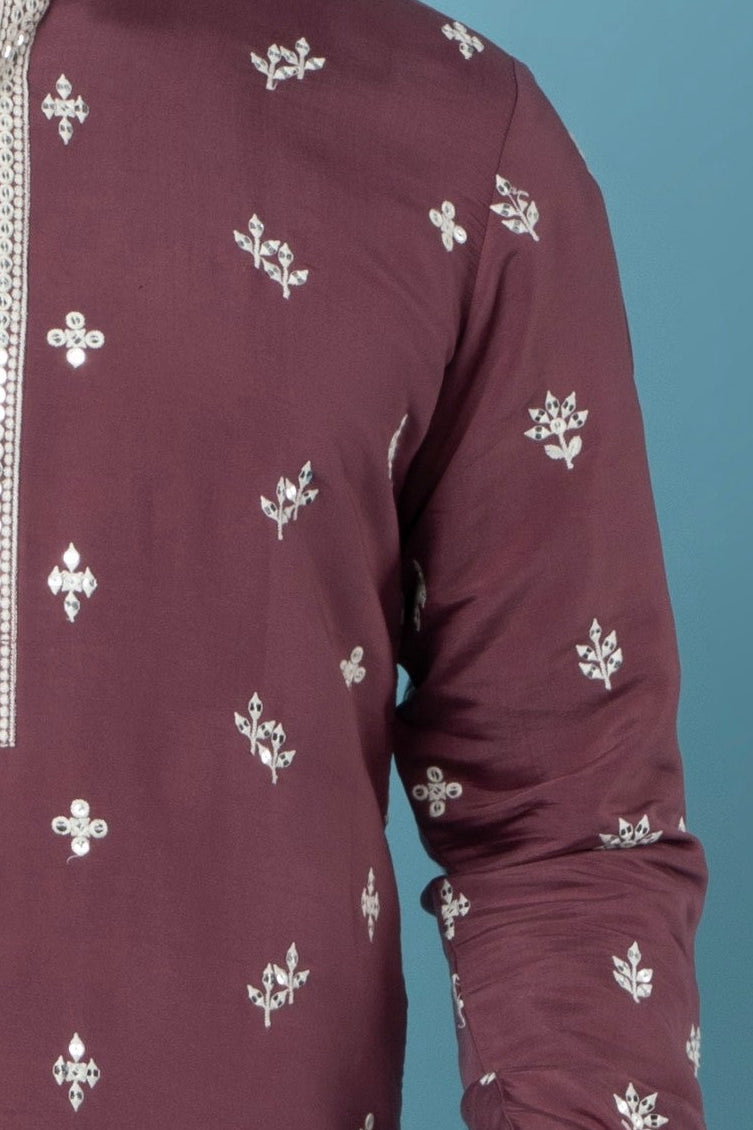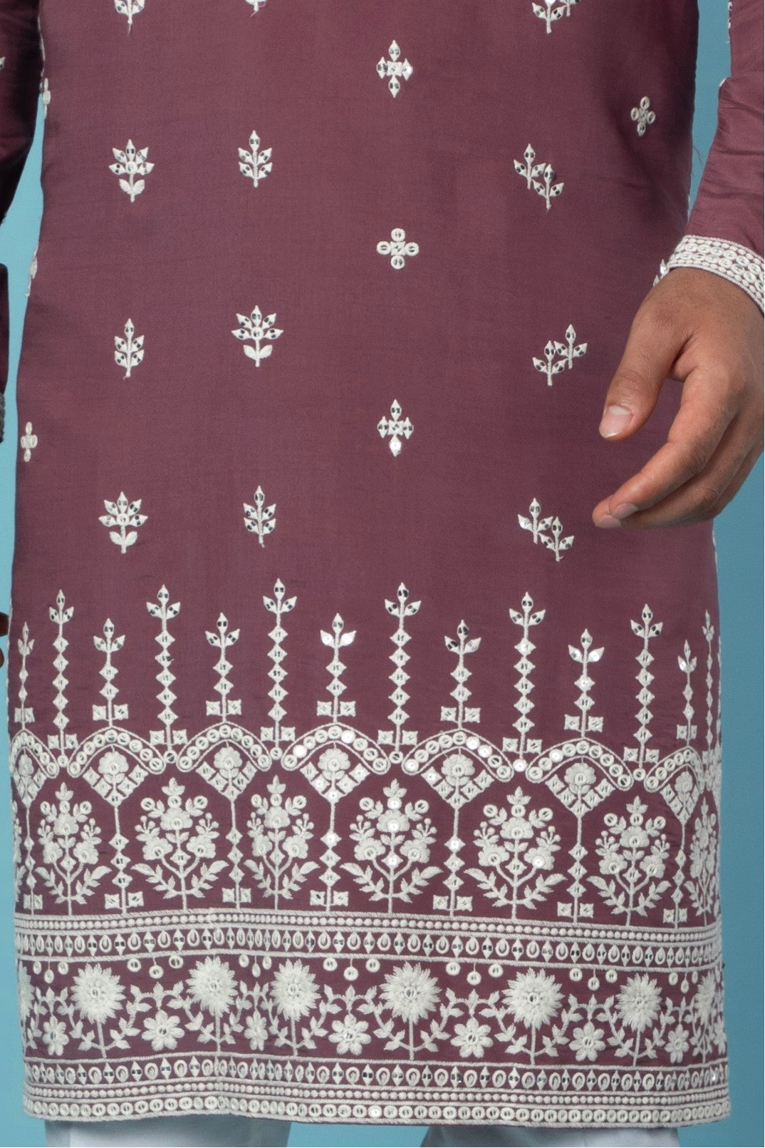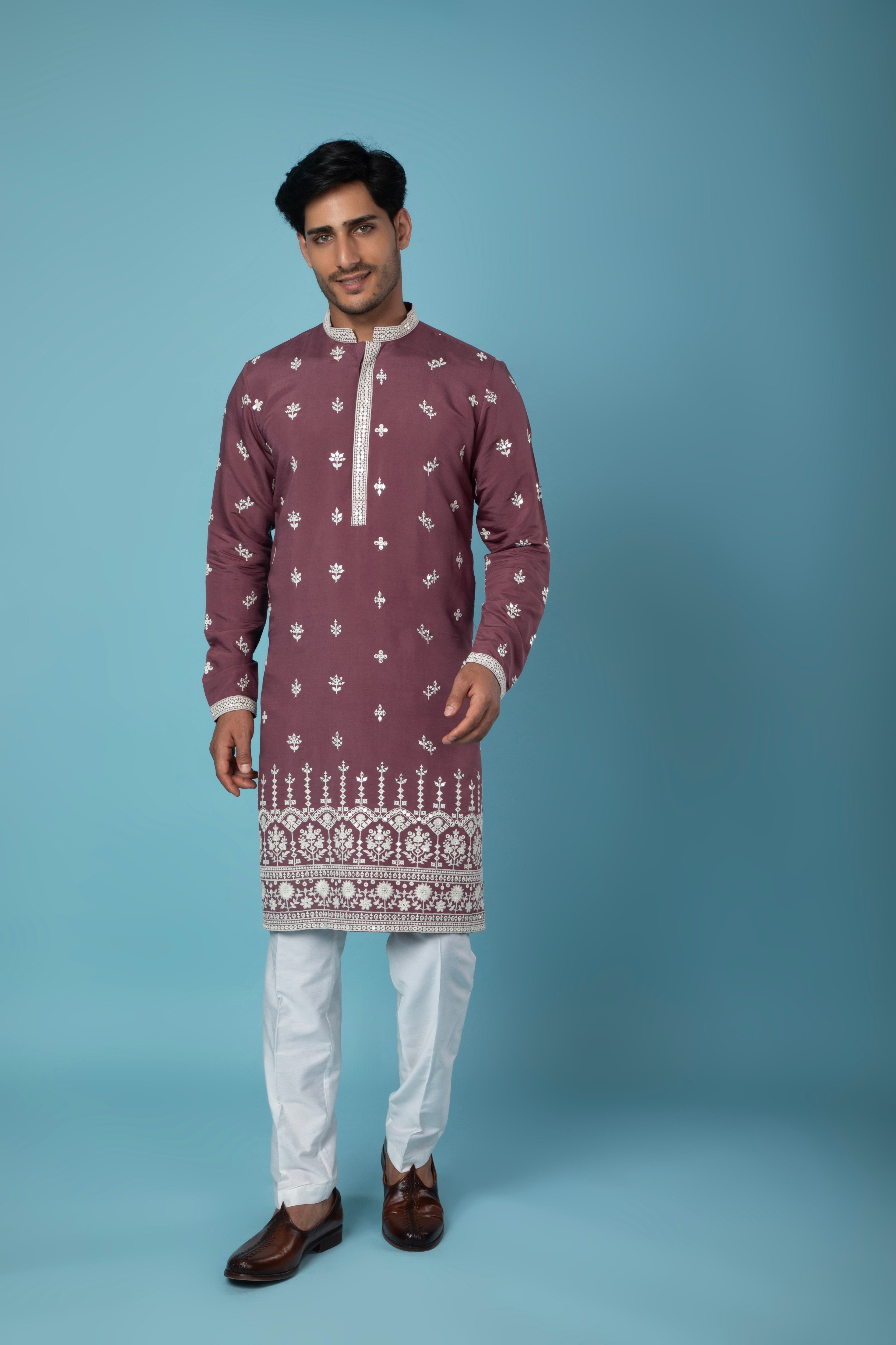 A refined mauve kurta highlighted with intricate white embroidery across the neckline, sleeves, and border. The soft contrast and elegant craftsmanship make it a standout choice for festive occasions.