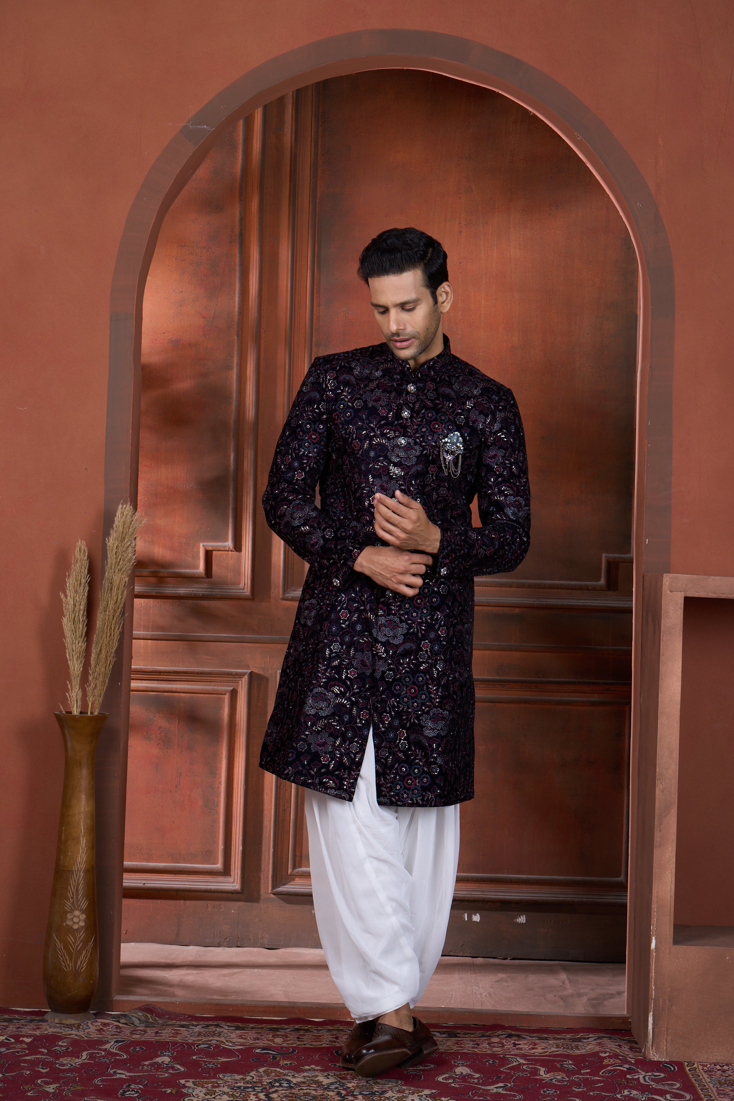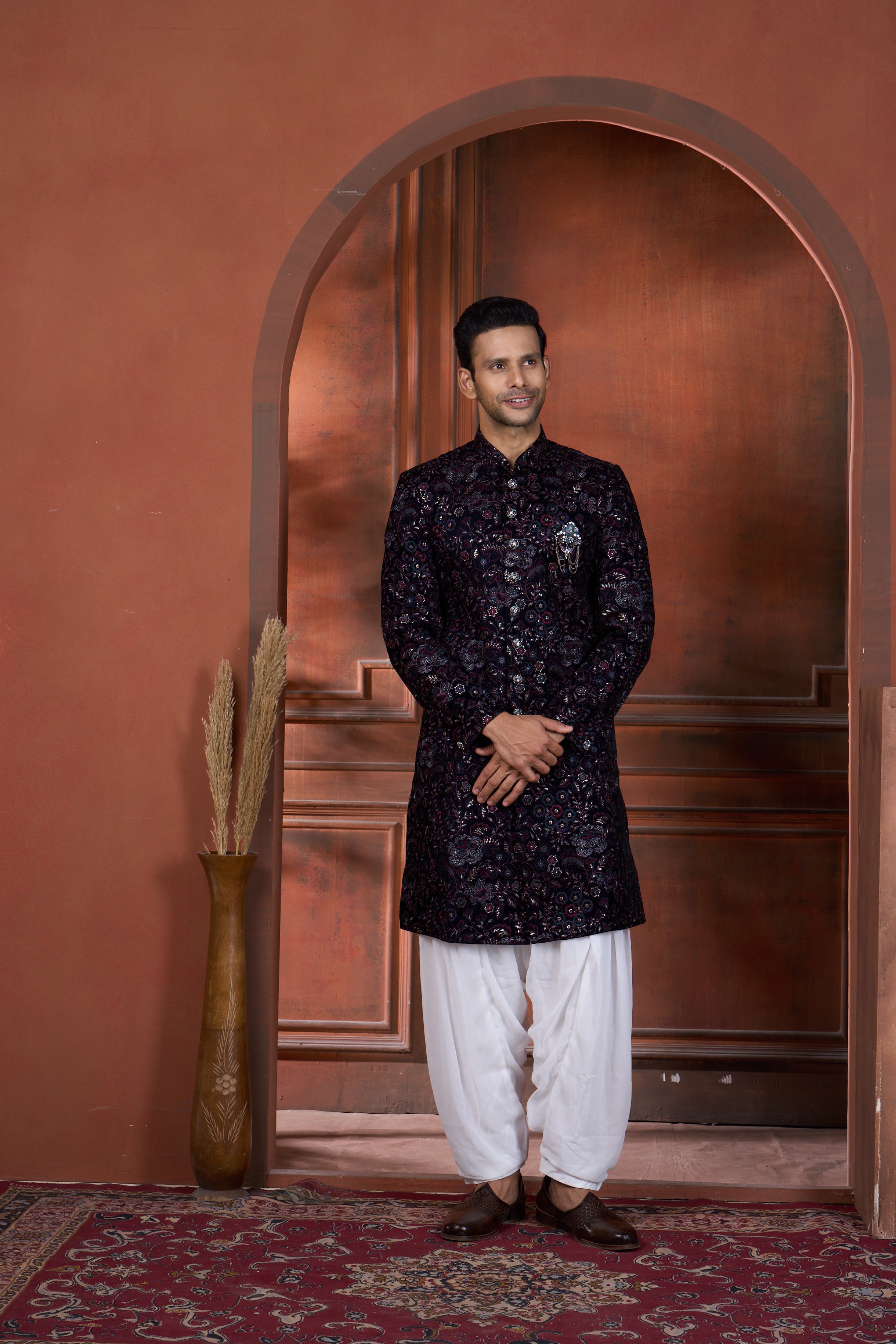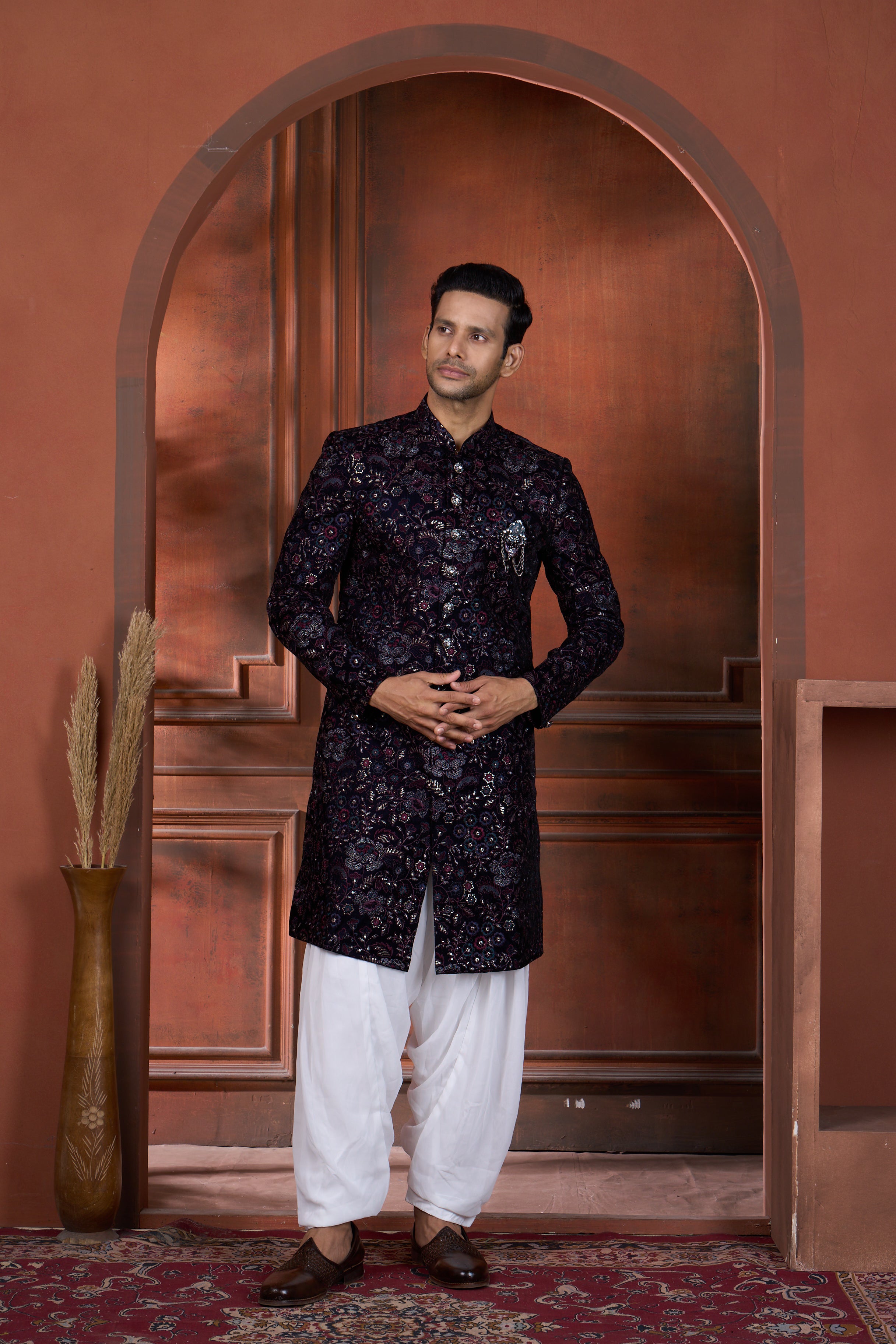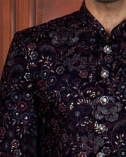 Elevate your festive wardrobe with this striking black semi Indo-Western ensemble. Featuring intricate blue, wine, and golden floral embroidery across the garment, this piece seamlessly blends traditional Indian artistry with contemporary design. Perfect for sangeets, weddings, receptions, and engagements, it offers versatile styling for groomsmen and family members. The rich jewel-toned florals create visual depth against the sophisticated black base, ensuring a polished, refined appearance that flatters all complexions. A modern take on classic celebration wear that transitions effortlessly through multiple wedding events.