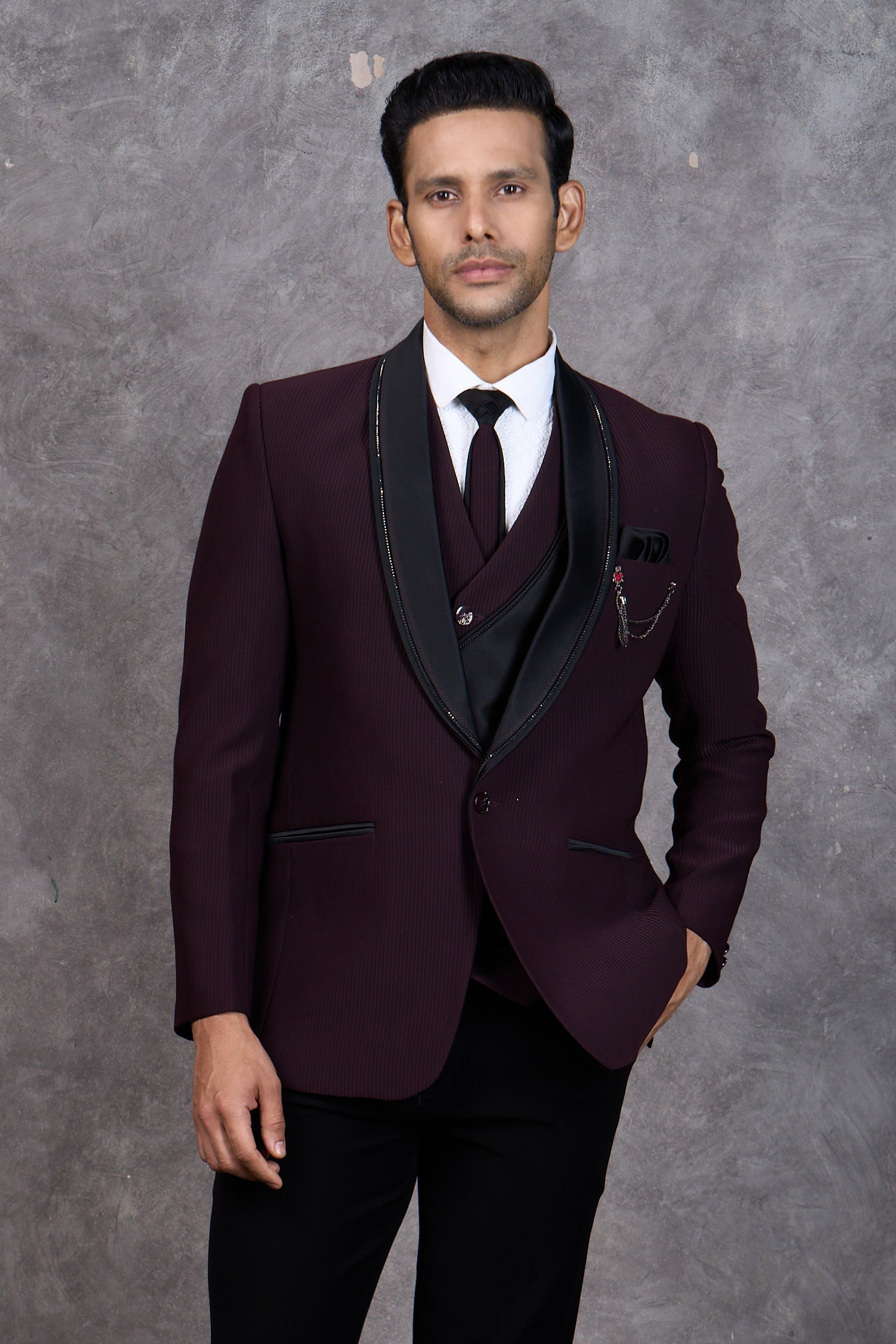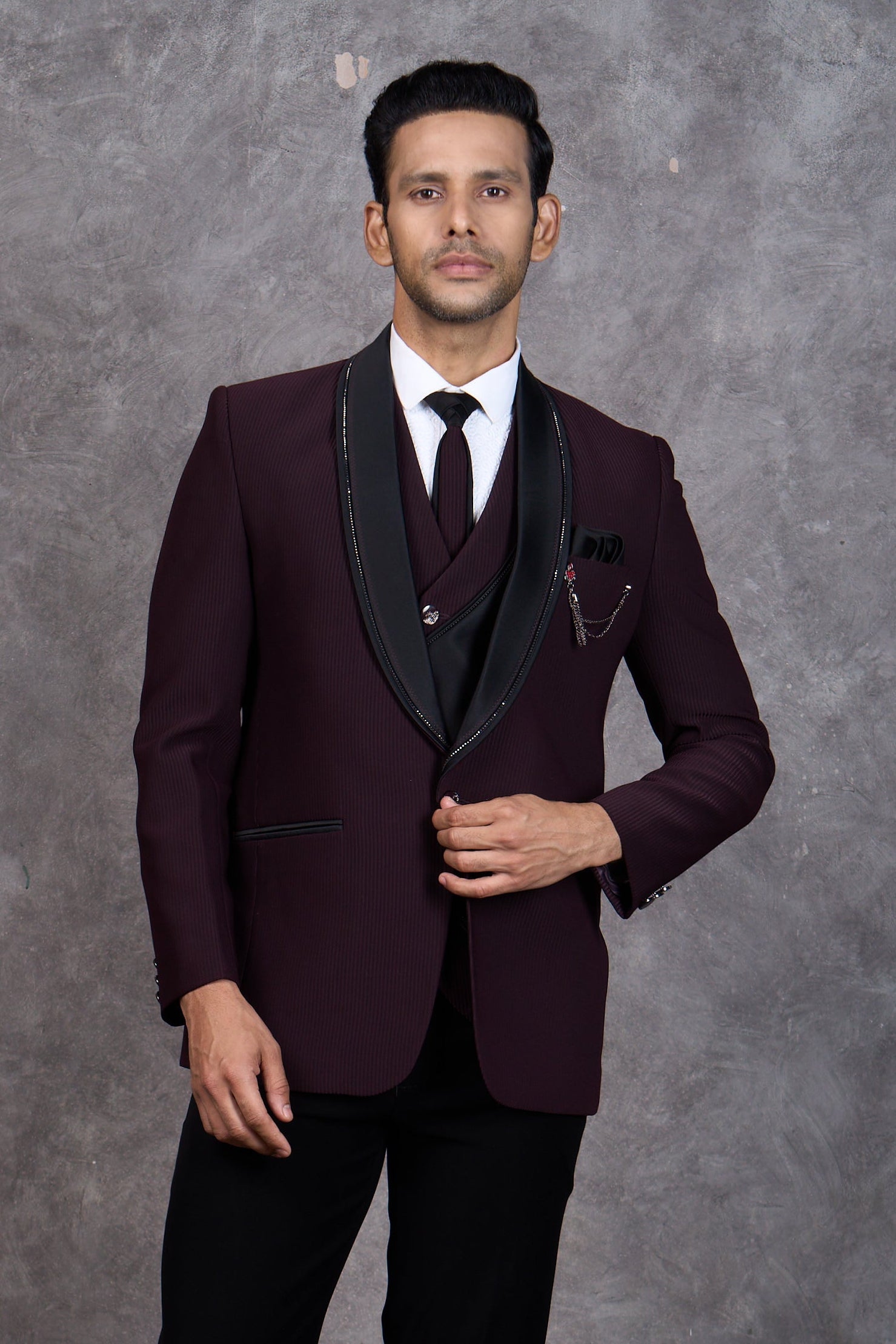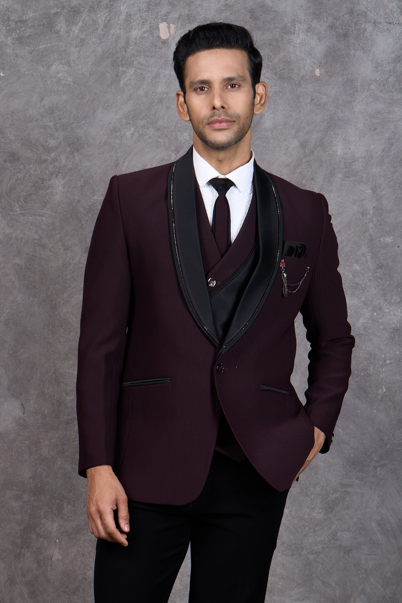 Make a statement at your next formal event with this striking wine tuxedo. The minimalist aesthetic and luxurious maroon shade offer understated elegance that commands attention. Featuring a sophisticated lapel and precision tailoring, this piece delivers a refined silhouette without unnecessary embellishment. The premium fabric ensures you stay comfortable and confident from ceremony to celebration. A versatile choice for grooms, groomsmen, and anyone seeking timeless formal wear with modern sensibility.
